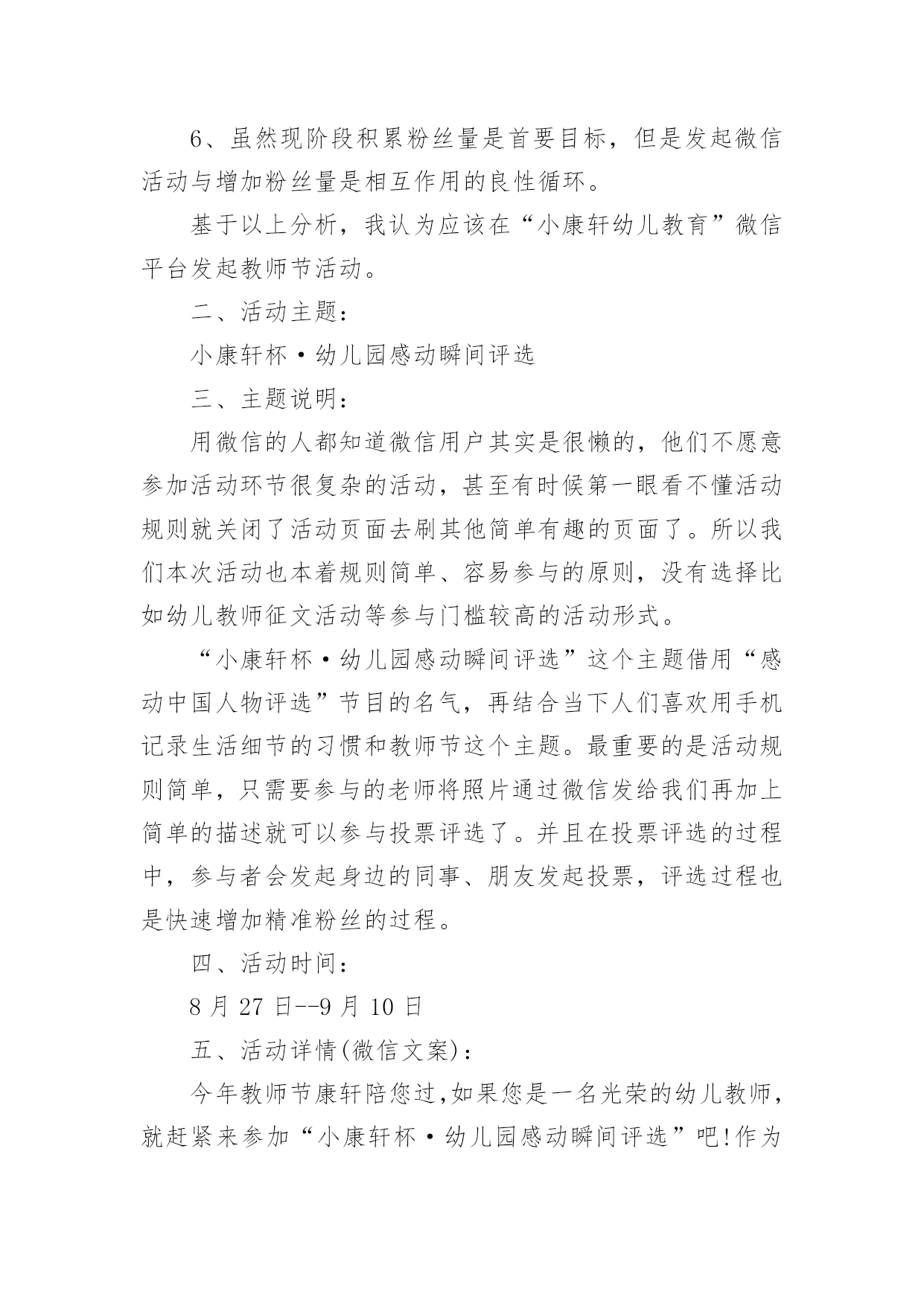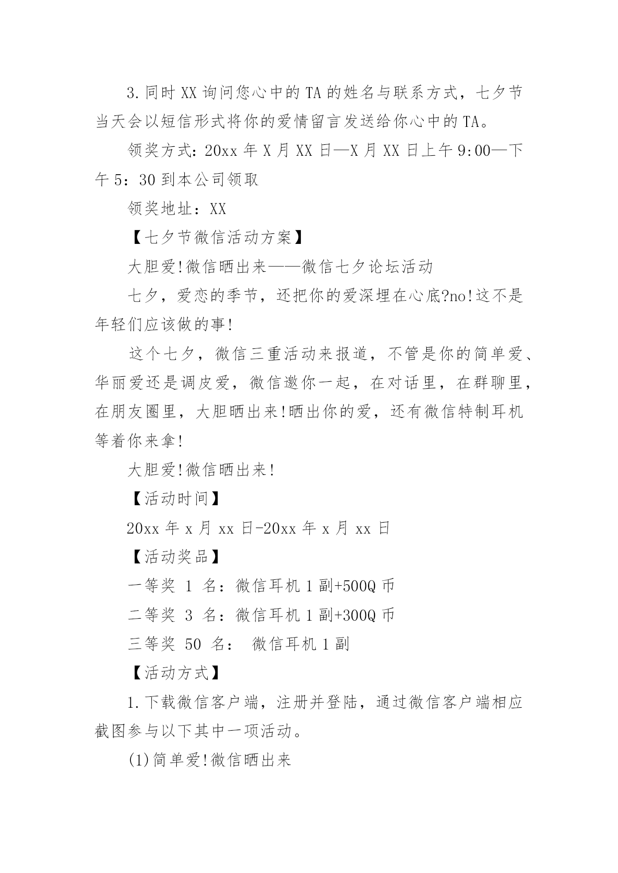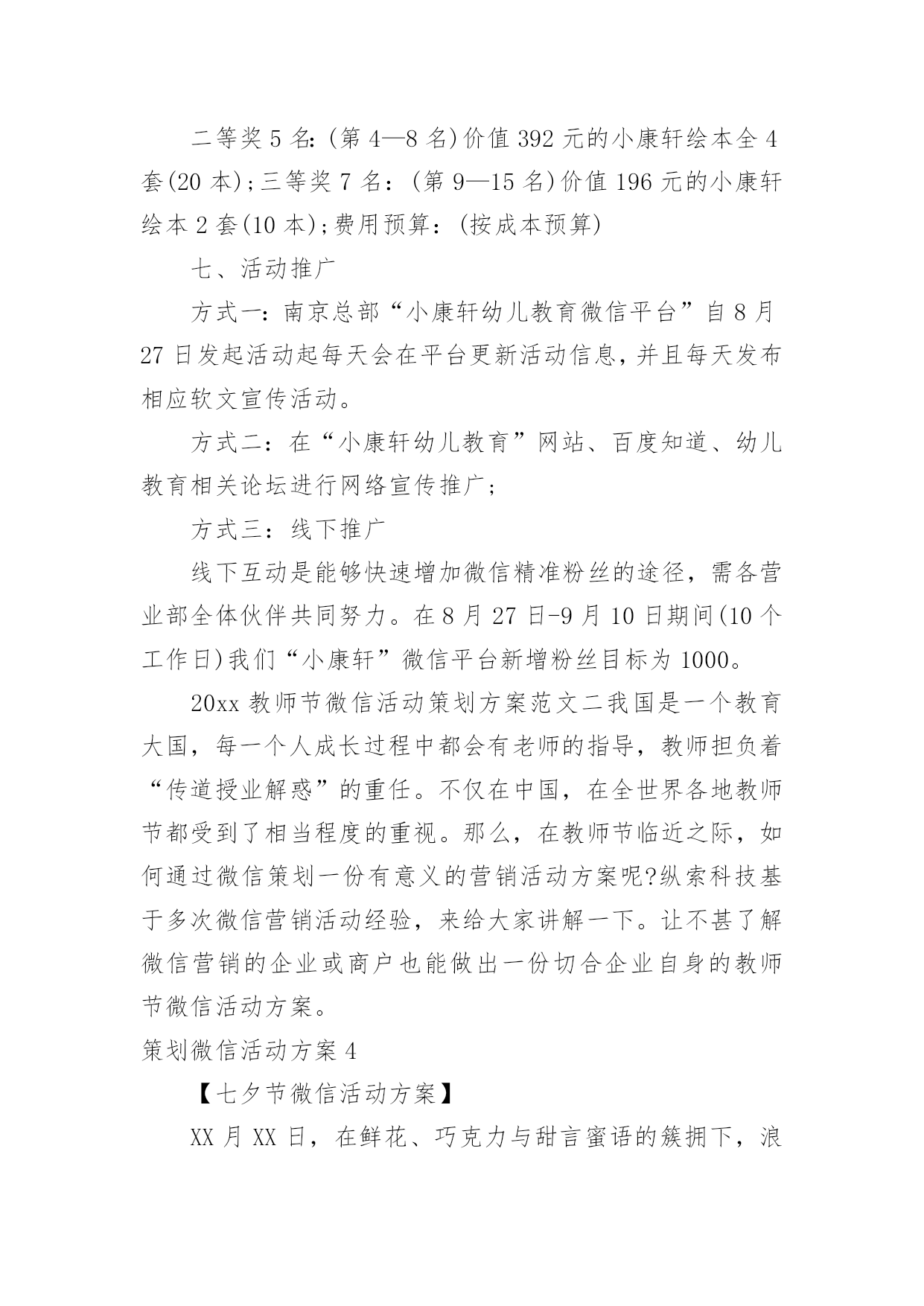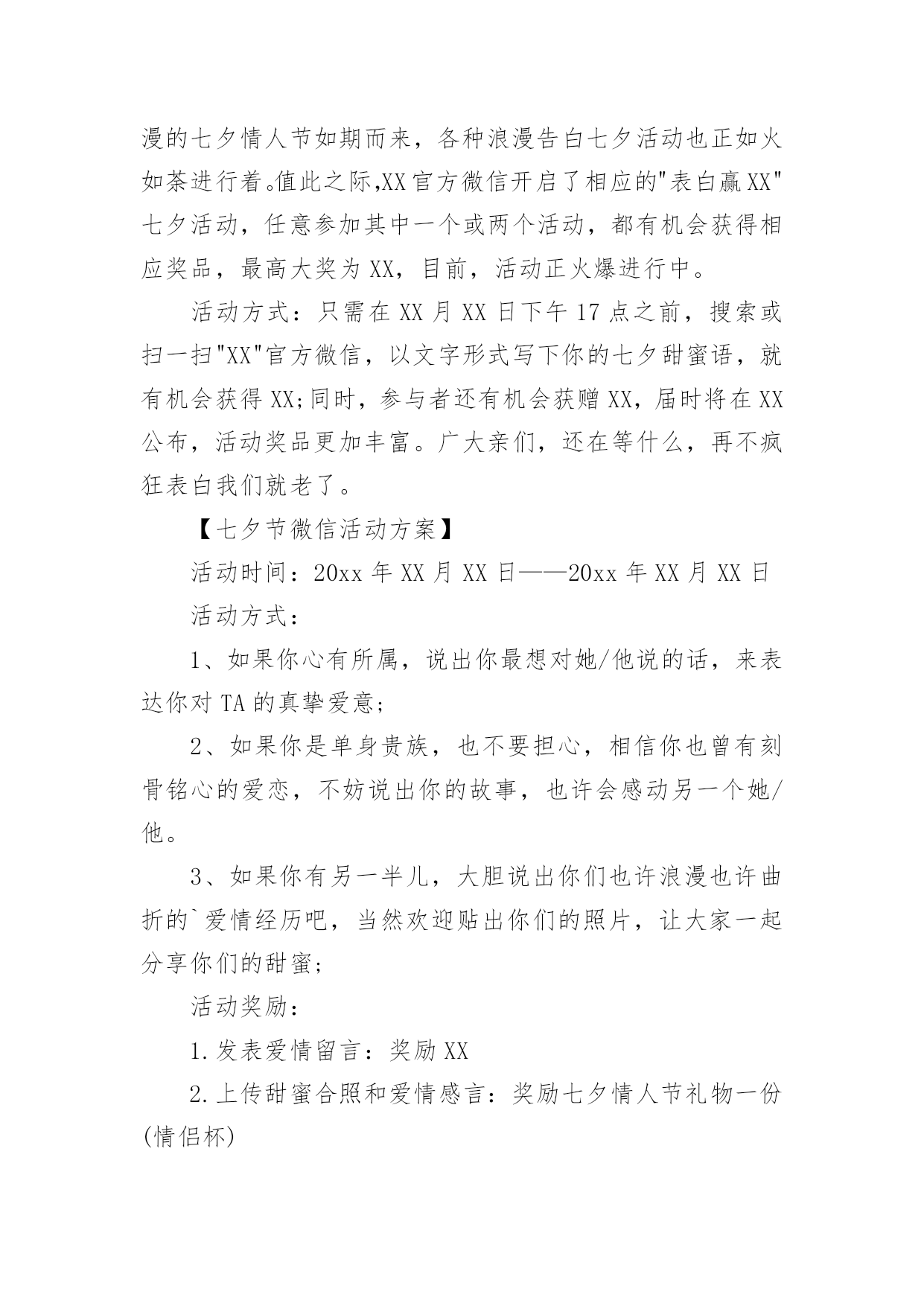 策划微信活动方案策划微信活动方案为了确定工作或事情顺利开展,预先制定方案是必不可少的,方案的内容和形式都要围绕着主题来展开,最终达到预期的效果和意义。那么我们该怎么去写方案呢?以下是小编精心整理的策划微信活动方案,欢迎阅读,希望大家能够喜欢。策划微信活动方案1一、微信营销目的与意义当下微信的用户数已经突破4亿,各行业企业纷纷开展微信营销,酒店行业亦不例外。在酒店行业,布丁酒店和华住酒店的微信营销做得最为出色,且取得了不错的经济效益。开展微信营销的好处如下:(1)开拓市场宣传新渠道,塑造企业品牌形象;(2)增强与关注客户群的互动,进一步发展潜在客户;(3)及时推送酒店的各种促销、优惠信息,吸引客户预定。因此,建议开通生活派酒店微信。二、实施方法开通微信公众账号调查:华住酒店是各个分店注册账号,向关注酒店的`粉丝发送电子优惠券。截至20xx年6月30日,华住拥有1216家酒店,客房总数达到132,557间,入住率为91.3%,会员超1100万。截止到20xx年2月15日,华住有52万微信粉丝,激活会员超过20万,平均每天有638间/夜预订,会员来源67%靠“附近的人”功能,门店扫码只占16.7%。微信会员占总会员数4.7%,微信预订占总预订量5.3‰。布丁酒店是微信系统嵌入酒店HTML5页面,并接入布丁酒店后台,客人直接可以进行订房。微信在线订房功能,需有一定投资,做二次开发方可实现。目前,布丁酒店在全国30多个城市拥有超过230家门店,600多万会员。截止到20xx年5月10日,微信粉丝已达到54万人,新用户占61%,日均订单264个。另值得一提的是,26%的新增会员使用微信订房成功入住次数达到2次以上,微信用户订房高峰时间段为14:00-16:00。每天有上千条会员咨询。布丁只在周三和周五推送1条信息,以活动类与游戏类为主。因此,第一阶段学习华住酒店,由各酒店开通微信公众账号。充分利用微信摇一摇、附近的人、漂流瓶、添加朋友等功能来发展会员。当粉丝关注各酒店微信后,微信运营人员要通过一对一的推送向新粉丝介绍酒店的优惠促销活动等,并不定期通过群发功能向粉丝们开展更加直接的互动体验。当各分店粉丝超过500,可以申请认证,提高公信力。第二阶段当生活派酒店达到一定规模,辐射全国时,可以学习布丁酒店,开通集团的微信公众账号,并申请官方认证。集团公众账号可以在微信现有功能基础上,做深度的二次开发,开通在线订房、微信支付等功能。三、内容策划1.日常信息推送微信内容以公司动态、促销信息、互动活动为主。2.长期促销活动方案:成为生活派酒店微信会员,即可获赠20元优惠券活动时间:20xx年12月1日——20xx年12月31日参与酒店:生活派酒店公司旗下各门店活动内容:关注生活派酒店微信,即赠20元生活派酒店电子优惠券,通过生活派酒店官方直营销售渠道订房并成功入住,立可抵扣房费,消费结束即自动升级为生活派酒店派卡会员。策划微信活动方案2感谢广大新老客户一直以来对我公司的鼎力支持与厚爱!在十一来临之际,为答谢广大新老客户的支持与厚爱,我公司将拿出丰厚的礼品来进行抽奖活动.一、活动时间:9月1日-9月31日二、活动背景:自我公司成立以来虽然历经了数次的起起伏伏,但是无论我们处于怎样的低谷,总有广大客户的支持与厚爱,正是由于你们的支持,我公司才能在激烈的`市场竞争中不断前进,才能不断的取得一个又一个的成绩。同时我公司的发展,又不单单是一个企业壮大的过程,而是我公司与广大新老客户一路随行、风雨同舟、共同成长的精彩写照。所以本次抽奖活动本着“答谢客户”的宗旨来进行活动开展!在时光和岁月的成长中,历经时间的洗礼,我公司不断演绎出一幕又一幕的出奇的精彩。这样的精彩离不开广大新老客户的支持和厚爱。多年来,我公司与您的信赖相伴成长。如今,我公司再次满载感恩,激情出发。三、参与方式:方式一:在20xx年9月31日之前通过微信关注我公司微信公众账号:广州靓点日化,即可参与粉丝抽奖。(请留下联系方式以便我们发送中奖信息,及时领奖)奖品设置1、一等奖5名:价值2、二等奖10名:价值3、三等奖50名:价值方式二:在20xx年9月31日之前通过微信关注我公司微信公众账号:广州靓点日化,并转发任意一条活动信息到朋友圈,发送截图到我们公众号,即可参与贵宾抽奖。(如果有三个朋友转发,截图证明,可以额外领取大礼包一份,100%中奖哦!)奖品设置4、特等奖1名:价值5、一等奖2名:价值6、二等奖5名:价值7、三等奖20名:价值四、活动细则1、活动时间:20xx年10月9日23:00以前关注或转发即可抽奖有效2、抽奖时间:10月10日在所有粉丝里抽取粉丝奖,10月11日在截图信息中抽取贵宾奖。3、抽奖结果将在三个工作日内,通过“广州靓点日化”微信公众平台全部发送到中奖客户手机;4、中奖客