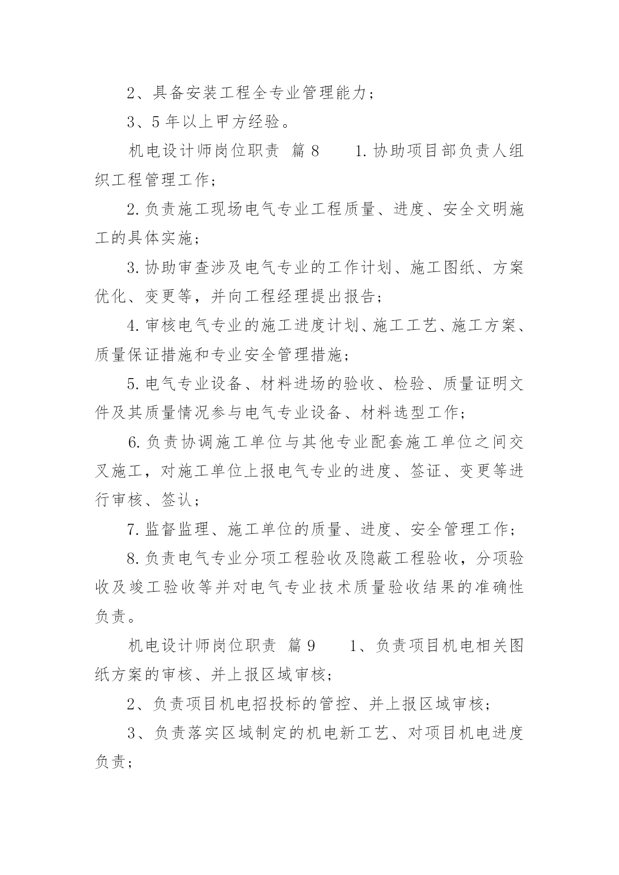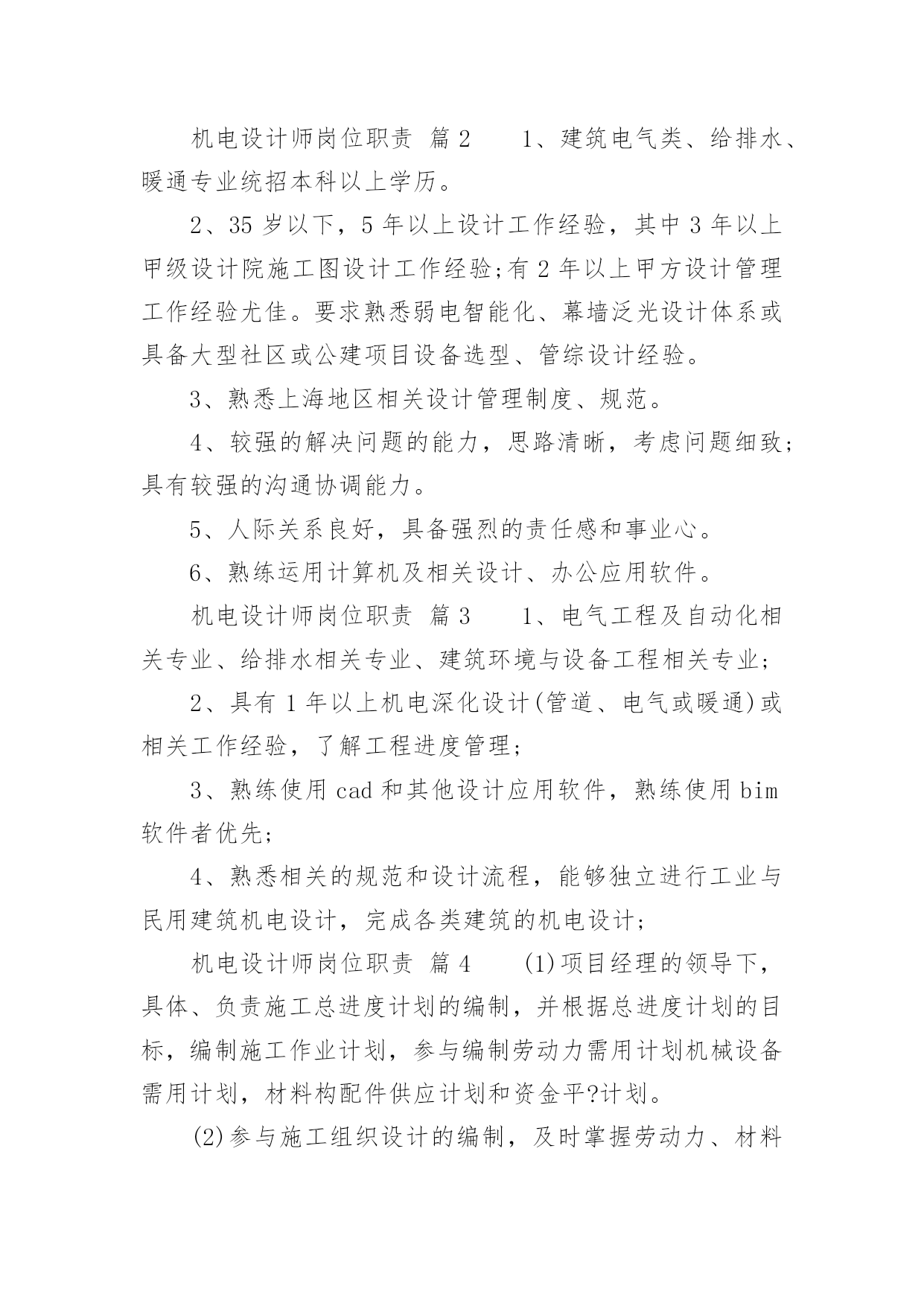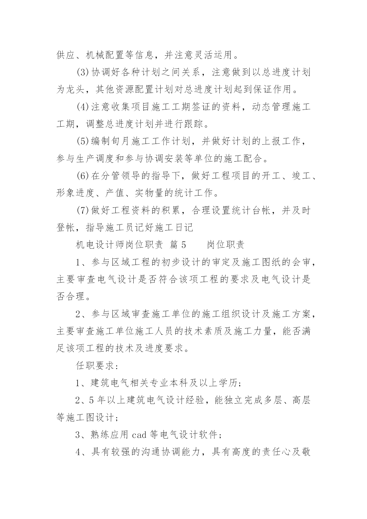 机电设计师岗位职责机电设计师岗位职责(精选16篇)在现在社会,需要使用岗位职责的场合越来越多,明确岗位职责能让员工知晓和掌握岗位职责,能够最大化的进行劳动用工管理,科学的进行人力配置,做到人尽其才、人岗匹配。大家知道岗位职责的格式吗?以下是小编帮大家整理的机电设计师岗位职责,欢迎阅读与收藏。机电设计师岗位职责篇1职责描述:1.协助设计经理推动bim研究及应用工作;2.负责装配式建筑电气设计(含机电拆分等深化设计),并提出优化建议;3.负责装配式建筑施工配合及现场重大技术的变更;4.收集和总结本专业信息资料,参与本专业企业标准的编制与制定;5.负责编写相关工作计划及资金计划并进行管理;6.完成上级交办的其他工作。任职要求:1.本科以上学历,电气自动化相关专业,三年以上甲级建筑设计院工作经验;2.熟悉房地产建筑电气设计的相关法规或标准,并能娴熟运用;3.熟悉revit和planbar软件,对bim建模、拆模有一定认识和实际经验,了解施工图绘制标准,可独立制图。机电设计师岗位职责篇21、建筑电气类、给排水、暖通专业统招本科以上学历。2、35岁以下,5年以上设计工作经验,其中3年以上甲级设计院施工图设计工作经验;有2年以上甲方设计管理工作经验尤佳。要求熟悉弱电智能化、幕墙泛光设计体系或具备大型社区或公建项目设备选型、管综设计经验。3、熟悉上海地区相关设计管理制度、规范。4、较强的解决问题的能力,思路清晰,考虑问题细致;具有较强的沟通协调能力。5、人际关系良好,具备强烈的责任感和事业心。6、熟练运用计算机及相关设计、办公应用软件。机电设计师岗位职责篇31、电气工程及自动化相关专业、给排水相关专业、建筑环境与设备工程相关专业;2、具有1年以上机电深化设计(管道、电气或暖通)或相关工作经验,了解工程进度管理;3、熟练使用cad和其他设计应用软件,熟练使用bim软件者优先;4、熟悉相关的规范和设计流程,能够独立进行工业与民用建筑机电设计,完成各类建筑的机电设计;机电设计师岗位职责篇4(1)项目经理的领导下,具体、负责施工总进度计划的编制,并根据总进度计划的目标,编制施工作业计划,参与编制劳动力需用计划机械设备需用计划,材料构配件供应计划和资金平?计划。(2)参与施工组织设计的编制,及时掌握劳动力、材料供应、机械配置等信息,并注意灵活运用。(3)协调好各种计划之间关系,注意做到以总进度计划为龙头,其他资源配置计划对总进度计划起到保证作用。(4)注意收集项目施工工期签证的资料,动态管理施工工期,调整总进度计划并进行跟踪。(5)编制旬月施工工作计划,并做好计划的上报工作,参与生产调度和参与协调安装等单位的施工配合。(6)在分管领导的指导下,做好工程项目的开工、竣工、形象进度、产值、实物量的统计工作。(7)做好工程资料的积累,合理设置统计台帐,并及时登帐,指导施工员记好施工日记机电设计师岗位职责篇5岗位职责1、参与区域工程的初步设计的审定及施工图纸的会审,主要审查电气设计是否符合该项工程的要求及电气设计是否合理。2、参与区域审查施工单位的施工组织设计及施工方案,主要审查施工单位施工人员的技术素质及施工力量,能否满足该项工程的技术及进度要求。任职要求:1、建筑电气相关专业本科及以上学历;2、5年以上建筑电气设计经验,能独立完成多层、高层等施工图设计;3、熟练应用cad等电气设计软件;4、具有较强的沟通协调能力,具有高度的责任心及敬业精神;机电设计师岗位职责篇6职责描述:1、负责编制机电设计任务书;2、负责项目机电方案、初步设计及施工图设计管理工作、严格把控各阶段设计成果;3、负责设计成果跟踪、设计意见反馈、施工现场图纸变更及技术支持;4、负责按照产品设计要求,配合项目部对相关施工阶段进行验收和评价;5、负责在机电方案阶段组织多方案比选,审核机电方案可行性;6、配合公司其他部门关于设计版块的对接工作。任职要求:1、机电一体化、机电工程、建筑电气及相关专业本科及以上学历;2、八年以上地产机电专业工作经验,具有高端豪宅及商业综合体项目经验;3、勤奋敬业、责任心强,具有团队合作精神及一定的.组织管理能力;4、熟悉国家相关设计管理规范及文件;5、熟练使用office办公软件、cad绘图软件的操作。机电设计师岗位职责篇7职责描述:1.正确执行国家及地方的建设法规、规范、标准,做好主管的强弱电、给排水、暖通等专业的投资、质量、进度“三控制”工作;2.积级配合本部门各专业及设计院、施工单位等处理好强弱电、给排水、暖通等系统的各种技术问题;3.积极与材料组配合,严格把好甲供、甲控电气设备、材料的质量关,保证选用质优价廉的产品;对设备选型及方案设计不合理者,应及时提出意见和合理化建议;4.深入现场及时发现并提出问题,严格执行现场签证手续,所有现场签证均应留底,并及时送
