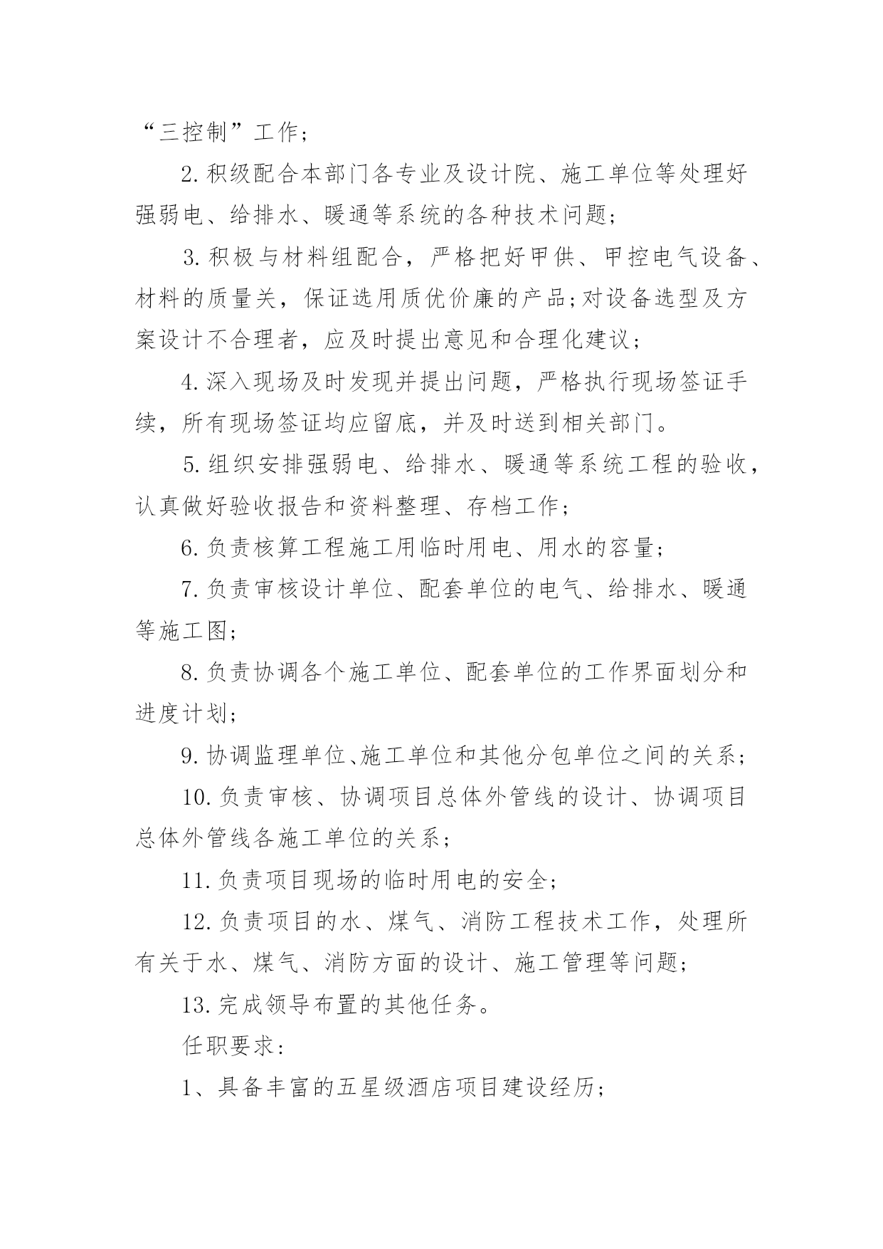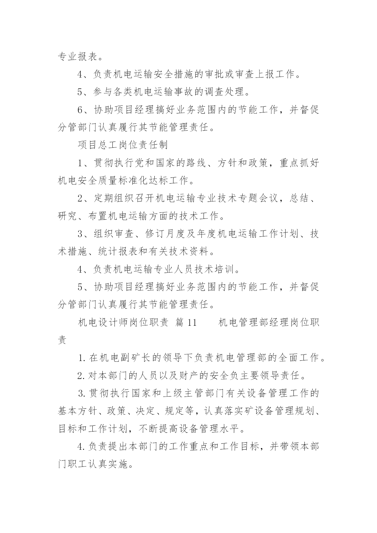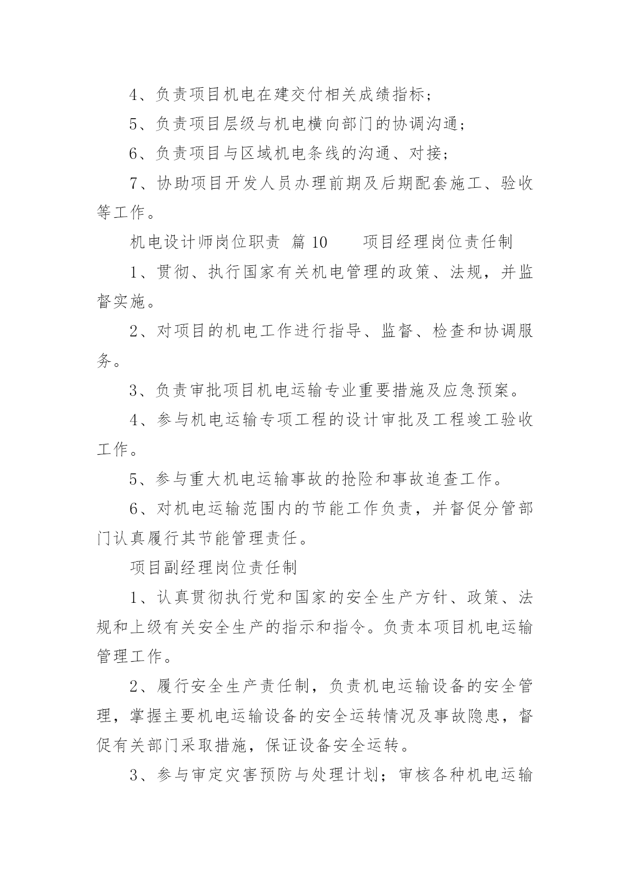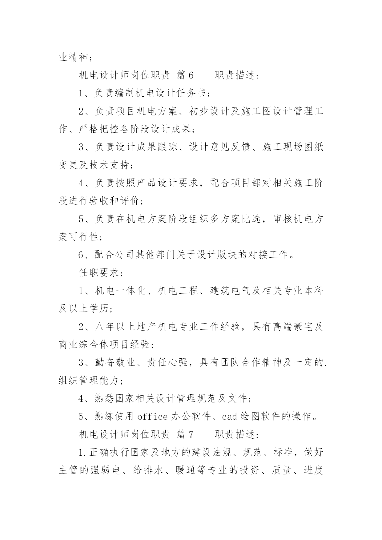 机电设计师岗位职责机电设计师岗位职责(精选16篇)在现在社会,需要使用岗位职责的场合越来越多,明确岗位职责能让员工知晓和掌握岗位职责,能够最大化的进行劳动用工管理,科学的进行人力配置,做到人尽其才、人岗匹配。大家知道岗位职责的格式吗?以下是小编帮大家整理的机电设计师岗位职责,欢迎阅读与收藏。机电设计师岗位职责篇1职责描述:1.协助设计经理推动bim研究及应用工作;2.负责装配式建筑电气设计(含机电拆分等深化设计),并提出优化建议;3.负责装配式建筑施工配合及现场重大技术的变更;4.收集和总结本专业信息资料,参与本专业企业标准的编制与制定;5.负责编写相关工作计划及资金计划并进行管理;6.完成上级交办的其他工作。任职要求:1.本科以上学历,电气自动化相关专业,三年以上甲级建筑设计院工作经验;2.熟悉房地产建筑电气设计的相关法规或标准,并能娴熟运用;3.熟悉revit和planbar软件,对bim建模、拆模有一定认识和实际经验,了解施工图绘制标准,可独立制图。机电设计师岗位职责篇21、建筑电气类、给排水、暖通专业统招本科以上学历。2、35岁以下,5年以上设计工作经验,其中3年以上甲级设计院施工图设计工作经验;有2年以上甲方设计管理工作经验尤佳。要求熟悉弱电智能化、幕墙泛光设计体系或具备大型社区或公建项目设备选型、管综设计经验。3、熟悉上海地区相关设计管理制度、规范。4、较强的解决问题的能力,思路清晰,考虑问题细致;具有较强的沟通协调能力。5、人际关系良好,具备强烈的责任感和事业心。6、熟练运用计算机及相关设计、办公应用软件。机电设计师岗位职责篇31、电气工程及自动化相关专业、给排水相关专业、建筑环境与设备工程相关专业;2、具有1年以上机电深化设计(管道、电气或暖通)或相关工作经验,了解工程进度管理;3、熟练使用cad和其他设计应用软件,熟练使用bim软件者优先;4、熟悉相关的规范和设计流程,能够独立进行工业与民用建筑机电设计,完成各类建筑的机电设计;机电设计师岗位职责篇4(1)项目经理的领导下,具体、负责施工总进度计划的编制,并根据总进度计划的目标,编制施工作业计划,参与编制劳动力需用计划机械设备需用计划,材料构配件供应计划和资金平?计划。(2)参与施工组织设计的编制,及时掌握劳动力、材料供应、机械配置等信息,并注意灵活运用。(3)协调好各种计划之间关系,注意做到以总进度计划为龙头,其他资源配置计划对总进度计划起到保证作用。(4)注意收集项目施工工期签证的资料,动态管理施工工期,调整总进度计划并进行跟踪。(5)编制旬月施工工作计划,并做好计划的上报工作,参与生产调度和参与协调安装等单位的施工配合。(6)在分管领导的指导下,做好工程项目的开工、竣工、形象进度、产值、实物量的统计工作。(7)做好工程资料的积累,合理设置统计台帐,并及时登帐,指导施工员记好施工日记机电设计师岗位职责篇5岗位职责1、参与区域工程的初步设计的审定及施工图纸的会审,主要审查电气设计是否符合该项工程的要求及电气设计是否合理。2、参与区域审查施工单位的施工组织设计及施工方案,主要审查施工单位施工人员的技术素质及施工力量,能否满足该项工程的技术及进度要求。任职要求:1、建筑电气相关专业本科及以上学历;2、5年以上建筑电气设计经验,能独立完成多层、高层等施工图设计;3、熟练应用cad等电气设计软件;4、具有较强的沟通协调能力,具有高度的责任心及敬业精神;机电设计师岗位职责篇6职责描述:1、负责编制机电设计任务书;2、负责项目机电方案、初步设计及施工图设计管理工作、严格把控各阶段设计成果;3、负责设计成果跟踪、设计意见反馈、施工现场图纸变更及技术支持;4、负责按照产品设计要求,配合项目部对相关施工阶段进行验收和评价;5、负责在机电方案阶段组织多方案比选,审核机电方案可行性;6、配合公司其他部门关于设计版块的对接工作。任职要求:1、机电一体化、机电工程、建筑电气及相关专业本科及以上学历;2、八年以上地产机电专业工作经验,具有高端豪宅及商业综合体项目经验;3、勤奋敬业、责任心强,具有团队合作精神及一定的.组织管理能力;4、熟悉国家相关设计管理规范及文件;5、熟练使用office办公软件、cad绘图软件的操作。机电设计师岗位职责篇7职责描述:1.正确执行国家及地方的建设法规、规范、标准,做好主管的强弱电、给排水、暖通等专业的投资、质量、进度“三控制”工作;2.积级配合本部门各专业及设计院、施工单位等处理好强弱电、给排水、暖通等系统的各种技术问题;3.积极与材料组配合,严格把好甲供、甲控电气设备、材料的质量关,保证选用质优价廉的产品;对设备选型及方案设计不合理者,应及时提出意见和合理化建议;4.深入现场及时发现并提出问题,严格执行现场签证手续,所有现场签证均应留底,并及时送
