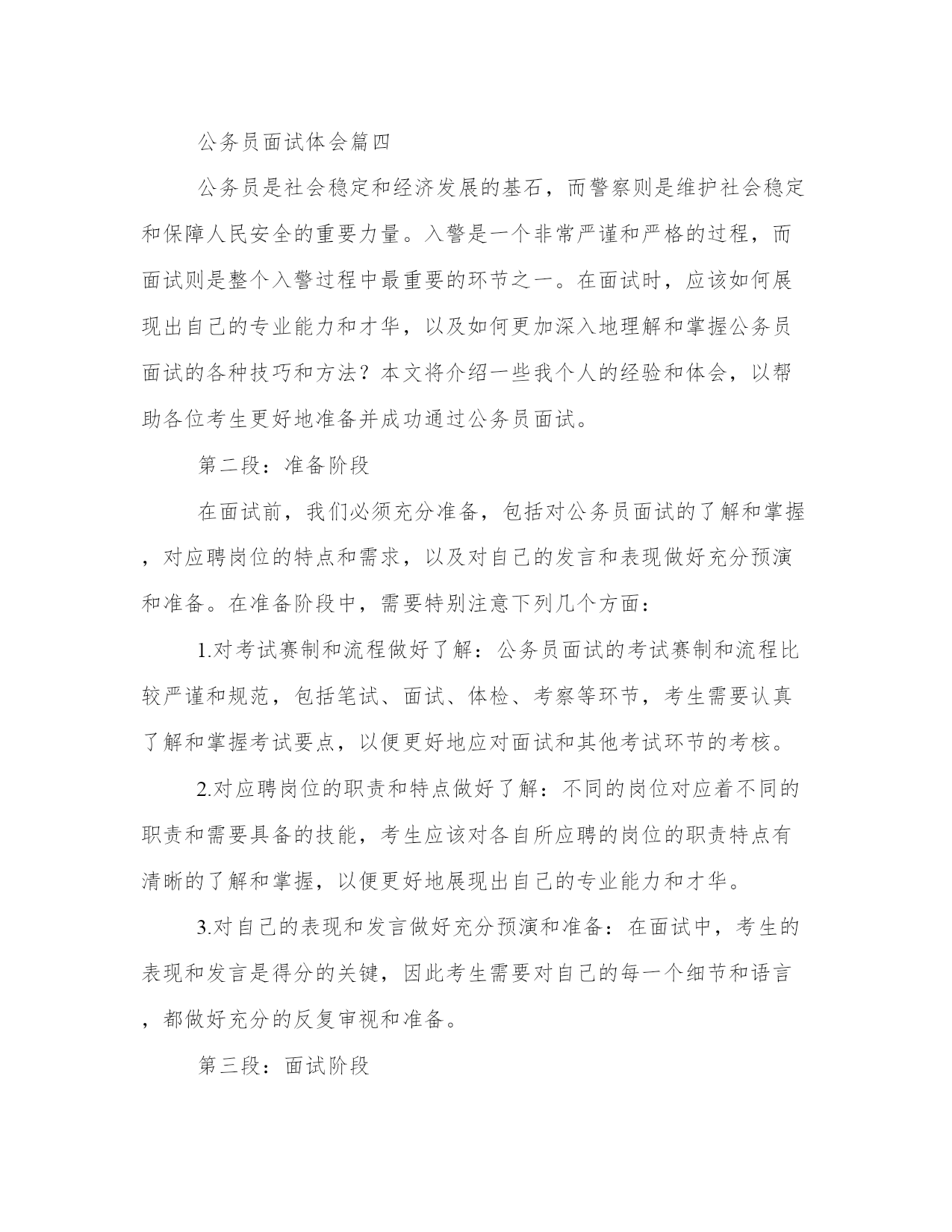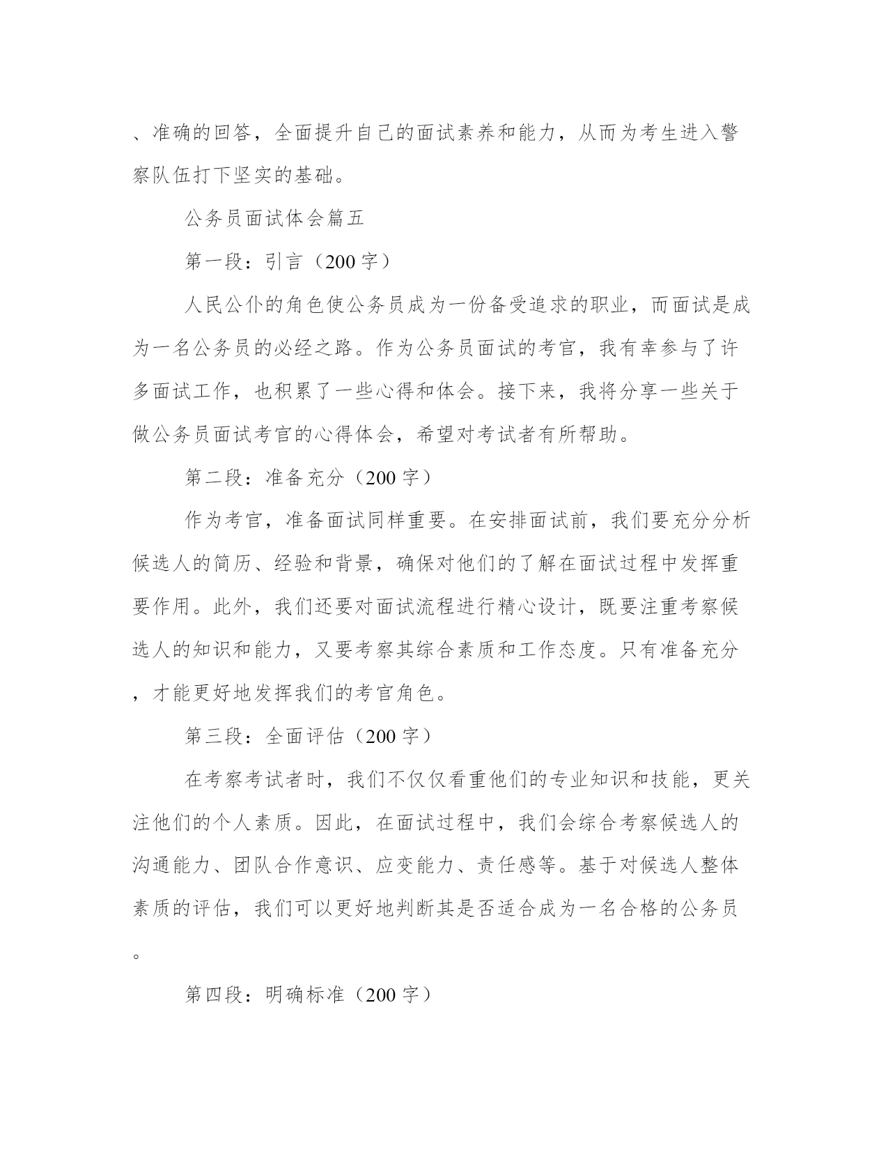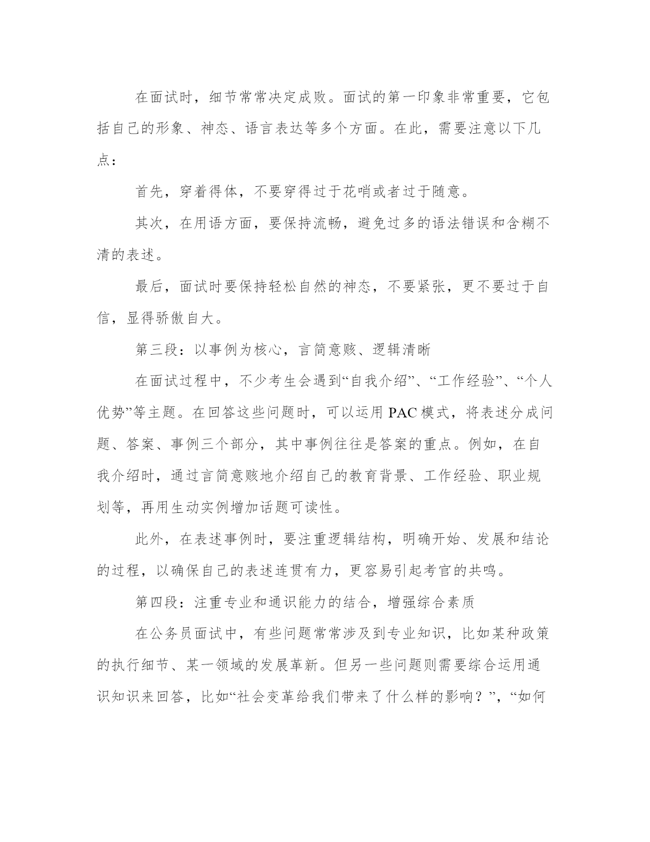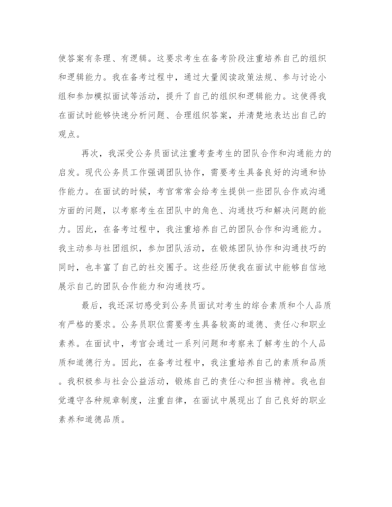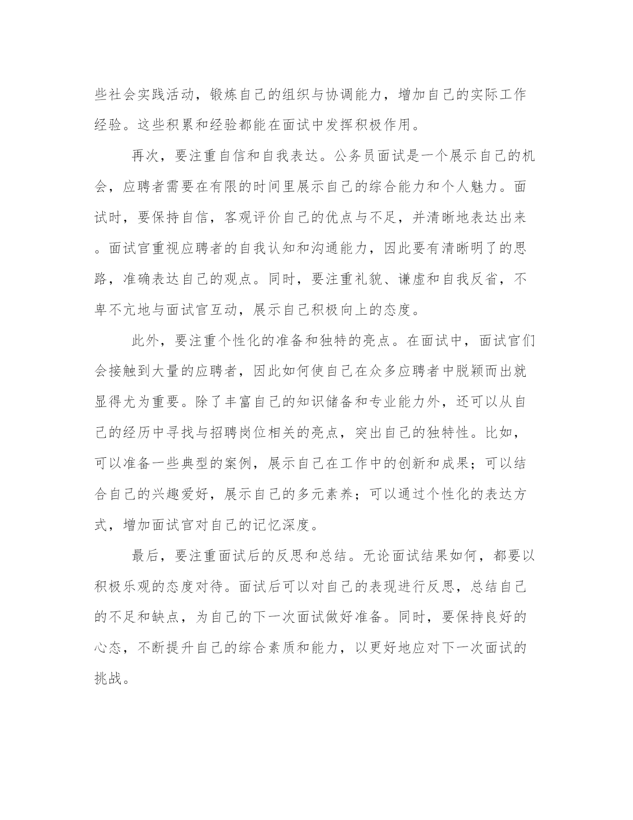 实用公务员面试体会(汇总16篇)总结是一个机会,它让我们重新审视自己的成长和进步。总结应当客观真实,同时要加入自己的观点和思考,使其更具个性和独特性。以下是小编为大家收集的总结范文,希望能给你带来灵感。公务员面试体会篇一公务员考试是许多青年人梦寐以求的崇高职业之一。然而,并非每个参加公务员考试的人都能够成功通过,取得稳定的工作。公务员面试被认为是公务员考试中最关键、最重要的一环,它不仅是考察考生知识水平和专业素质的重要手段,更是考察考生综合能力和个人品质的重要途径。在我参加公务员面试的过程中,我深有体会和感悟。以下是我对公务员面试的心得体会。首先,我深切体会到公务员面试对考生的思维和语言表达能力提出了较高的要求。一场面试中,考官不仅仅对考生提出一些文化、政策等各个方面的问题,更重要的是看考生在表达和解决问题的过程中所展现出的思维能力以及语言表达的能力。因此,在备考面试的过程中,我注重培养自己良好的思维习惯和发展流利的语言表达能力。我通过观看热门电视节目、读书和参加辩论赛等活动,提升了自己的思维能力和语言表达能力,这在面试过程中给予了我很大的帮助。其次,公务员面试要求考生有较强的组织和逻辑能力。在面试中,考生需要从众多的考题中选择,并将答案以合理的顺序进行组织,使答案有条理、有逻辑。这要求考生在备考阶段注重培养自己的组织和逻辑能力。我在备考过程中,通过大量阅读政策法规、参与讨论小组和参加模拟面试等活动,提升了自己的组织和逻辑能力。这使得我在面试时能够快速分析问题、合理组织答案,并清楚地表达出自己的观点。再次,我深受公务员面试注重考查考生的团队合作和沟通能力的启发。现代公务员工作强调团队协作,需要考生具备良好的沟通和协作能力。在面试的时候,考官常常会给考生提供一些团队合作或沟通方面的问题,以考察考生在团队中的角色、沟通技巧和解决问题的能力。因此,在备考过程中,我注重培养自己的团队合作和沟通能力。我主动参与社团组织,参加团队活动,在锻炼团队协作和沟通技巧的同时,也丰富了自己的社交圈子。这些经历使我在面试中能够自信地展示自己的团队合作能力和沟通技巧。最后,我还深切感受到公务员面试对考生的综合素质和个人品质有严格的要求。公务员职位需要考生具备较高的道德、责任心和职业素养。在面试中,考官会通过一系列问题和考察来了解考生的个人品质和道德行为。因此,在备考过程中,我注重培养自己的素质和品质。我积极参与社会公益活动,锻炼自己的责任心和担当精神。我也自觉遵守各种规章制度,注重自律,在面试中展现出了自己良好的职业素养和道德品质。总结起来,公务员面试是考察考生综合能力和个人品质的重要环节。在我的备考和面试过程中,我深刻认识到良好的思维和语言表达能力、组织和逻辑能力、团队合作和沟通能力以及个人素质和品质对于成功通过公务员面试起到的重要作用。通过不懈努力和积极实践,我相信我能够在公务员面试中取得好的成绩,实现自己的职业目标。公务员面试体会篇二公务员面试是公务员招录过程中的关键环节,作为竞争激烈的选拔方式之一,使得每一位应聘者都非常重视。经过自己的亲身经历,我意识到公务员面试不仅仅是对知识和能力的考察,更重要的是对应聘者的综合素质和个人品质的审查。在面试过程中,我从中获得了很多宝贵的经验和体会,形成了一些心得,希望能与大家分享。首先,要充分了解招考公告和招聘岗位的要求。公务员面试是一个高度专业化的选拔过程,对报考岗位的相关知识和要求都要进行详细了解。通过仔细研读公示材料,了解政府部门的职责和工作内容,对于应聘者来说至关重要。只有对招聘岗位要求有充分了解,才能更好地回答面试官的问题,展示自己的专业能力和知识储备。其次,要注重平时的积累和实践经验。公务员面试注重综合素质和个人能力的考察,除了专业知识,良好的思维能力、沟通能力和人际交往能力都是面试官关注的重点。因此,平时要注重阅读各类书籍、报纸,提高自己的文化素质和综合能力。在实践方面,可以参加一些社会实践活动,锻炼自己的组织与协调能力,增加自己的实际工作经验。这些积累和经验都能在面试中发挥积极作用。再次,要注重自信和自我表达。公务员面试是一个展示自己的机会,应聘者需要在有限的时间里展示自己的综合能力和个人魅力。面试时,要保持自信,客观评价自己的优点与不足,并清晰地表达出来。面试官重视应聘者的自我认知和沟通能力,因此要有清晰明了的思路,准确表达自己的观点。同时,要注重礼貌、谦虚和自我反省,不卑不亢地与面试官互动,展示自己积极向上的态度。此外,要注重个性化的准备和独特的亮点。在面试中,面试官们会接触到大量的应聘者,因此如何使自己在众多应聘者中脱颖而出就显得尤为重要。除了丰富自己的知识储备和专业能力外,还可以从自己的经历中寻找与招聘岗位相关的亮点,突出自己的独特性。比如,可以准备一些典