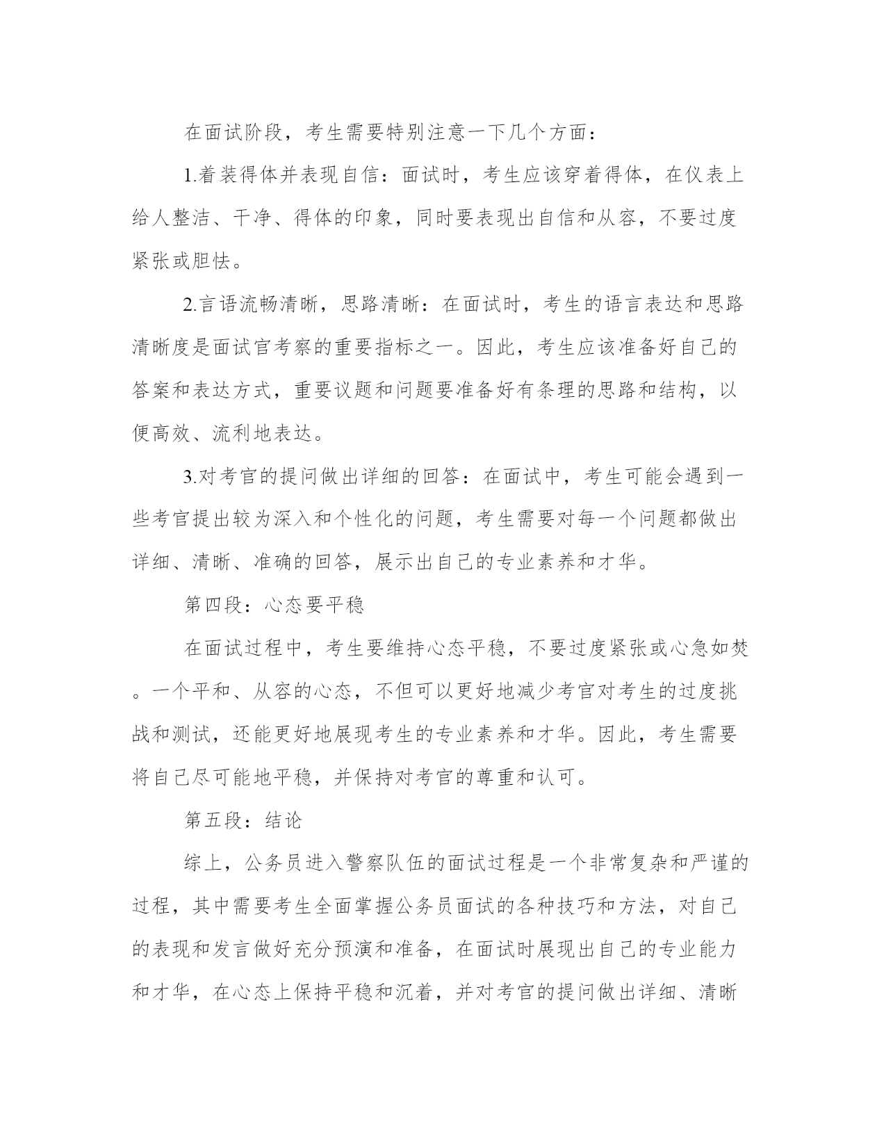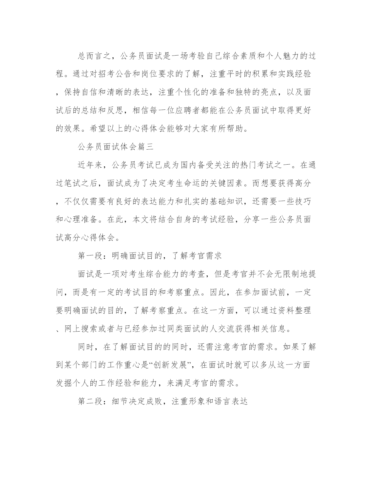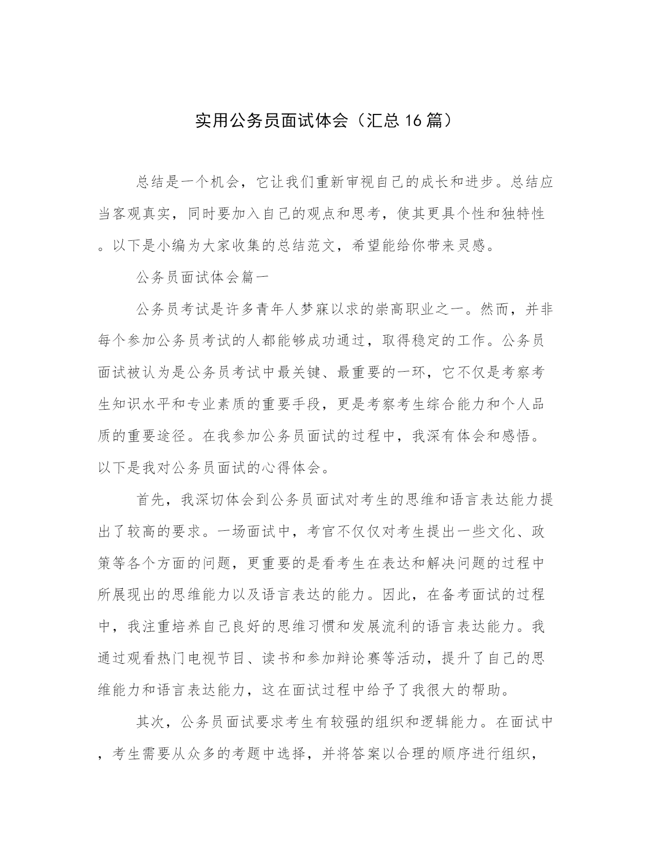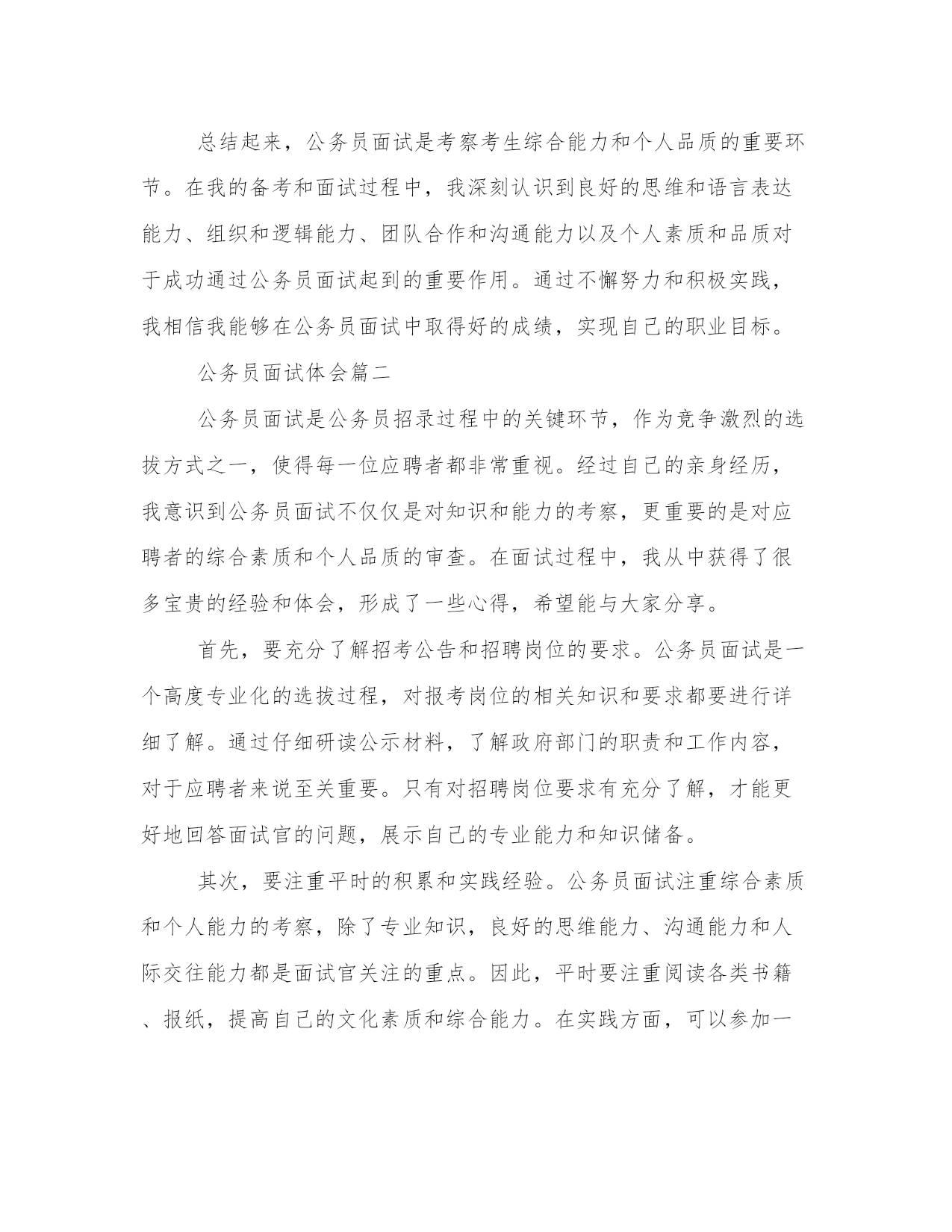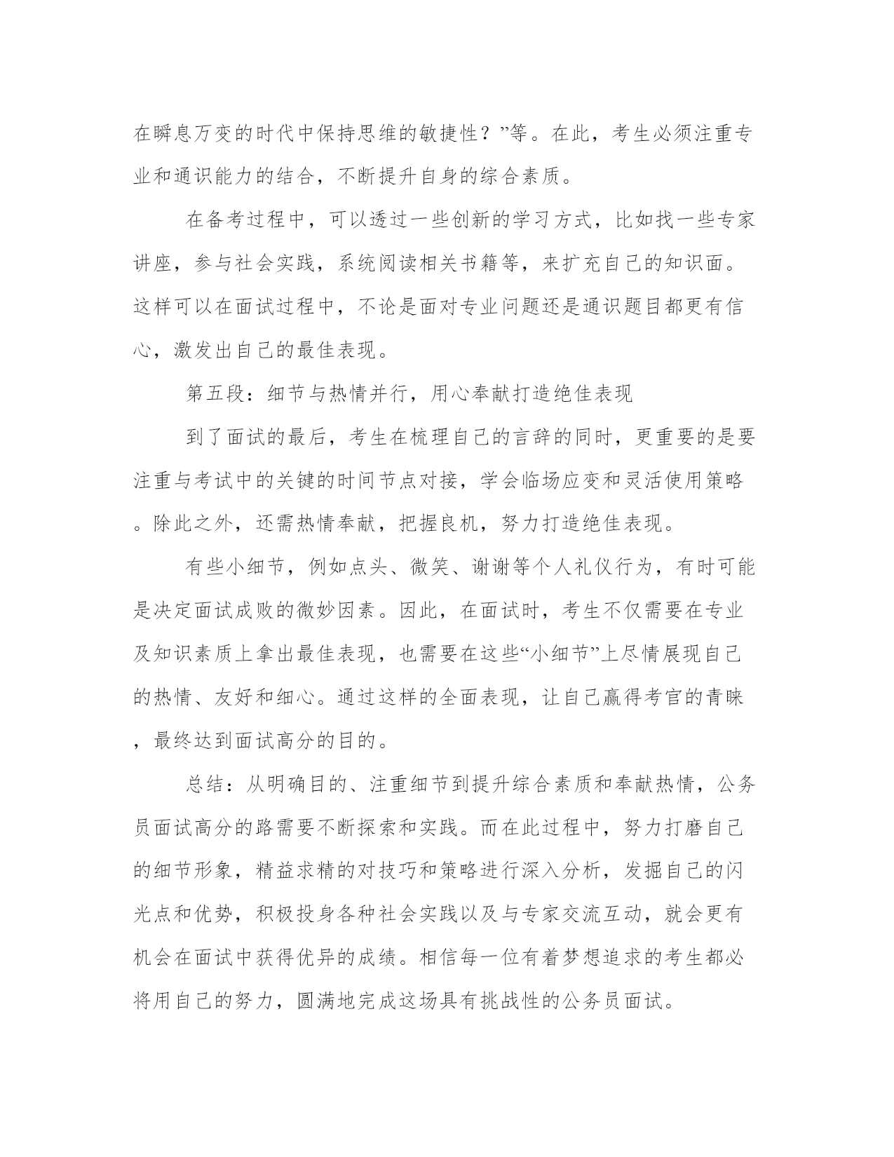 实用公务员面试体会(汇总16篇)总结是一个机会,它让我们重新审视自己的成长和进步。总结应当客观真实,同时要加入自己的观点和思考,使其更具个性和独特性。以下是小编为大家收集的总结范文,希望能给你带来灵感。公务员面试体会篇一公务员考试是许多青年人梦寐以求的崇高职业之一。然而,并非每个参加公务员考试的人都能够成功通过,取得稳定的工作。公务员面试被认为是公务员考试中最关键、最重要的一环,它不仅是考察考生知识水平和专业素质的重要手段,更是考察考生综合能力和个人品质的重要途径。在我参加公务员面试的过程中,我深有体会和感悟。以下是我对公务员面试的心得体会。首先,我深切体会到公务员面试对考生的思维和语言表达能力提出了较高的要求。一场面试中,考官不仅仅对考生提出一些文化、政策等各个方面的问题,更重要的是看考生在表达和解决问题的过程中所展现出的思维能力以及语言表达的能力。因此,在备考面试的过程中,我注重培养自己良好的思维习惯和发展流利的语言表达能力。我通过观看热门电视节目、读书和参加辩论赛等活动,提升了自己的思维能力和语言表达能力,这在面试过程中给予了我很大的帮助。其次,公务员面试要求考生有较强的组织和逻辑能力。在面试中,考生需要从众多的考题中选择,并将答案以合理的顺序进行组织,使答案有条理、有逻辑。这要求考生在备考阶段注重培养自己的组织和逻辑能力。我在备考过程中,通过大量阅读政策法规、参与讨论小组和参加模拟面试等活动,提升了自己的组织和逻辑能力。这使得我在面试时能够快速分析问题、合理组织答案,并清楚地表达出自己的观点。再次,我深受公务员面试注重考查考生的团队合作和沟通能力的启发。现代公务员工作强调团队协作,需要考生具备良好的沟通和协作能力。在面试的时候,考官常常会给考生提供一些团队合作或沟通方面的问题,以考察考生在团队中的角色、沟通技巧和解决问题的能力。因此,在备考过程中,我注重培养自己的团队合作和沟通能力。我主动参与社团组织,参加团队活动,在锻炼团队协作和沟通技巧的同时,也丰富了自己的社交圈子。这些经历使我在面试中能够自信地展示自己的团队合作能力和沟通技巧。最后,我还深切感受到公务员面试对考生的综合素质和个人品质有严格的要求。公务员职位需要考生具备较高的道德、责任心和职业素养。在面试中,考官会通过一系列问题和考察来了解考生的个人品质和道德行为。因此,在备考过程中,我注重培养自己的素质和品质。我积极参与社会公益活动,锻炼自己的责任心和担当精神。我也自觉遵守各种规章制度,注重自律,在面试中展现出了自己良好的职业素养和道德品质。总结起来,公务员面试是考察考生综合能力和个人品质的重要环节。在我的备考和面试过程中,我深刻认识到良好的思维和语言表达能力、组织和逻辑能力、团队合作和沟通能力以及个人素质和品质对于成功通过公务员面试起到的重要作用。通过不懈努力和积极实践,我相信我能够在公务员面试中取得好的成绩,实现自己的职业目标。公务员面试体会篇二公务员面试是公务员招录过程中的关键环节,作为竞争激烈的选拔方式之一,使得每一位应聘者都非常重视。经过自己的亲身经历,我意识到公务员面试不仅仅是对知识和能力的考察,更重要的是对应聘者的综合素质和个人品质的审查。在面试过程中,我从中获得了很多宝贵的经验和体会,形成了一些心得,希望能与大家分享。首先,要充分了解招考公告和招聘岗位的要求。公务员面试是一个高度专业化的选拔过程,对报考岗位的相关知识和要求都要进行详细了解。通过仔细研读公示材料,了解政府部门的职责和工作内容,对于应聘者来说至关重要。只有对招聘岗位要求有充分了解,才能更好地回答面试官的问题,展示自己的专业能力和知识储备。其次,要注重平时的积累和实践经验。公务员面试注重综合素质和个人能力的考察,除了专业知识,良好的思维能力、沟通能力和人际交往能力都是面试官关注的重点。因此,平时要注重阅读各类书籍、报纸,提高自己的文化素质和综合能力。在实践方面,可以参加一些社会实践活动,锻炼自己的组织与协调能力,增加自己的实际工作经验。这些积累和经验都能在面试中发挥积极作用。再次,要注重自信和自我表达。公务员面试是一个展示自己的机会,应聘者需要在有限的时间里展示自己的综合能力和个人魅力。面试时,要保持自信,客观评价自己的优点与不足,并清晰地表达出来。面试官重视应聘者的自我认知和沟通能力,因此要有清晰明了的思路,准确表达自己的观点。同时,要注重礼貌、谦虚和自我反省,不卑不亢地与面试官互动,展示自己积极向上的态度。此外,要注重个性化的准备和独特的亮点。在面试中,面试官们会接触到大量的应聘者,因此如何使自己在众多应聘者中脱颖而出就显得尤为重要。除了丰富自己的知识储备和专业能力外,还可以从自己的经历中寻找与招聘岗位相关的亮点,突出自己的独特性。比如,可以准备一些典