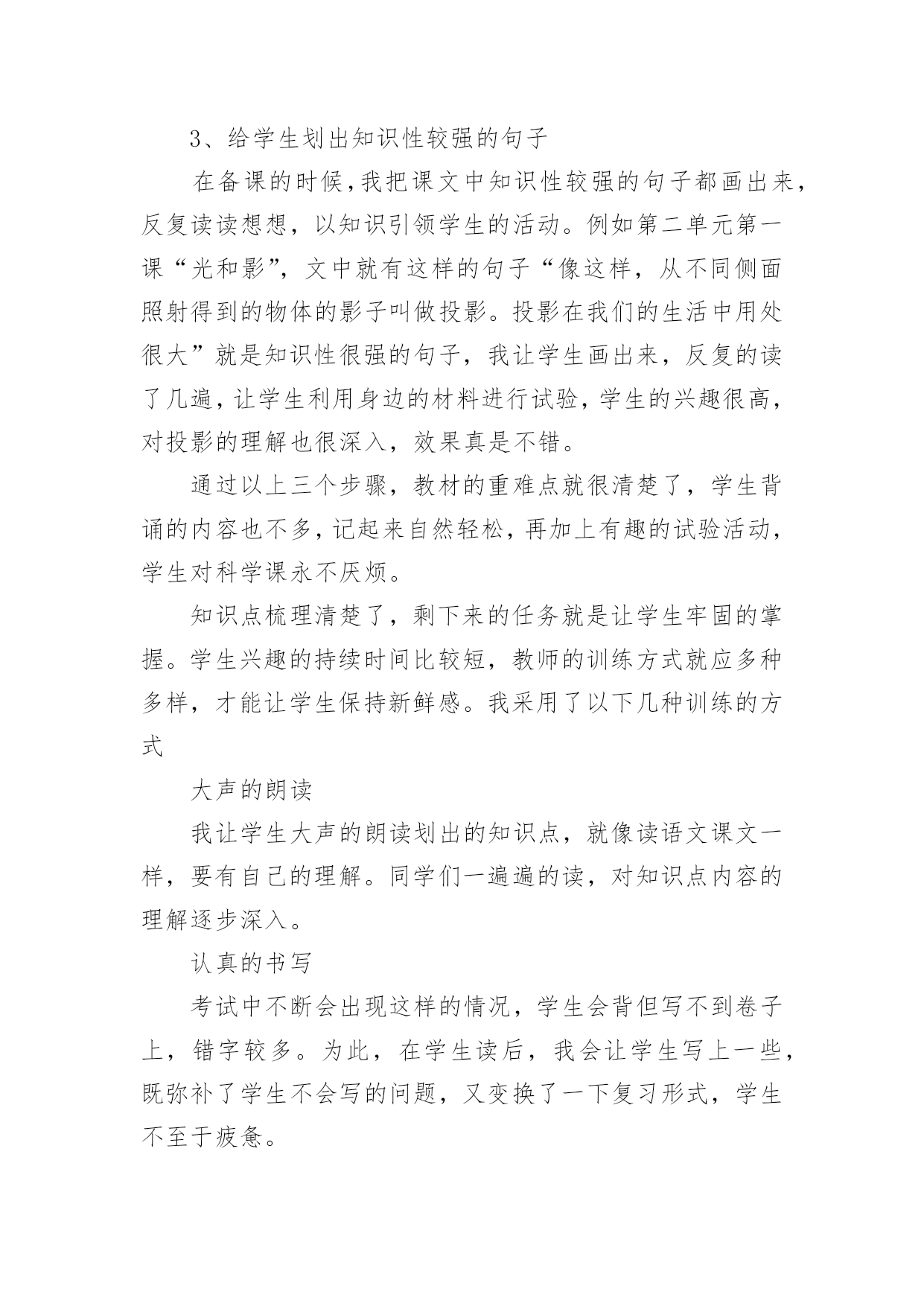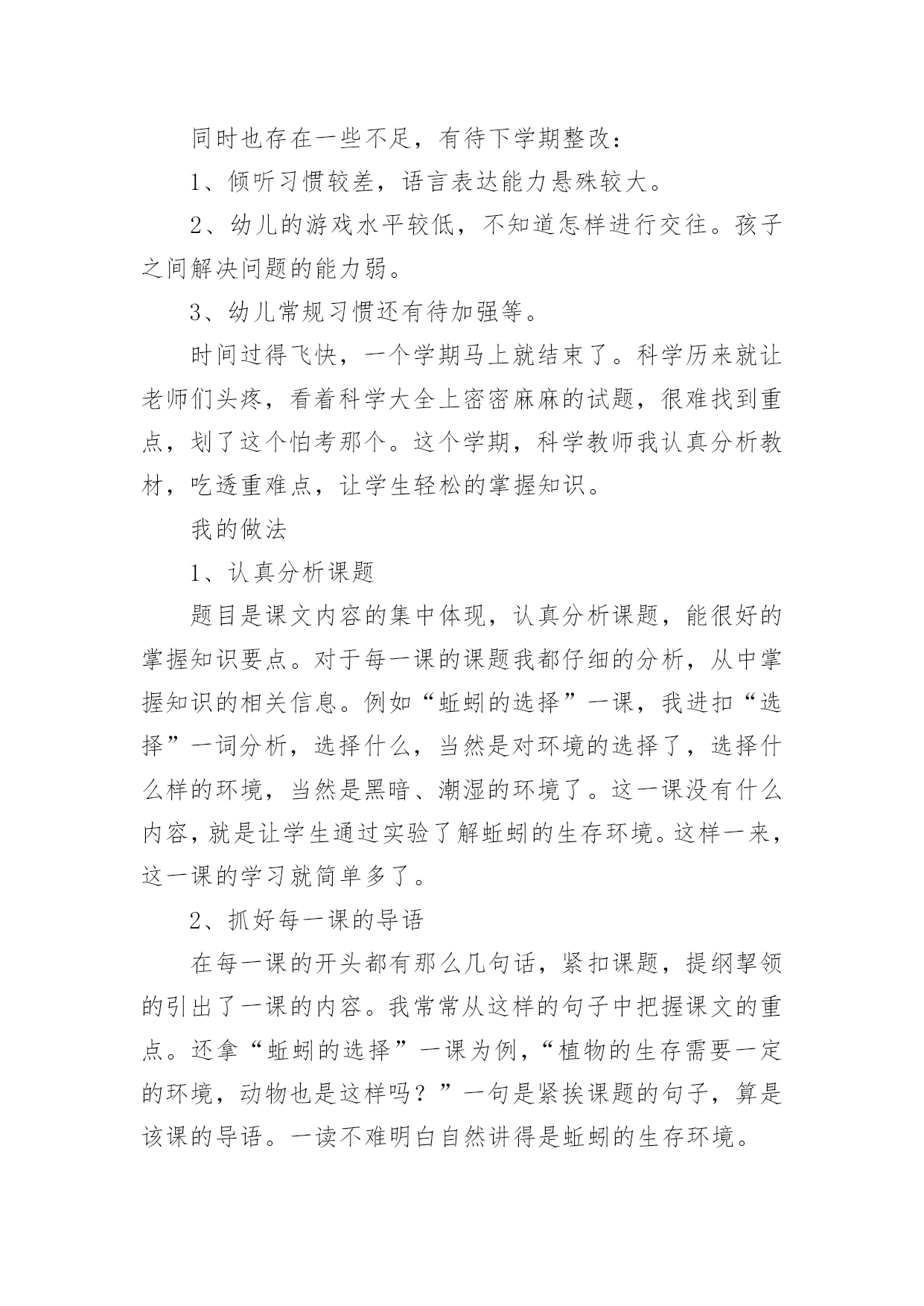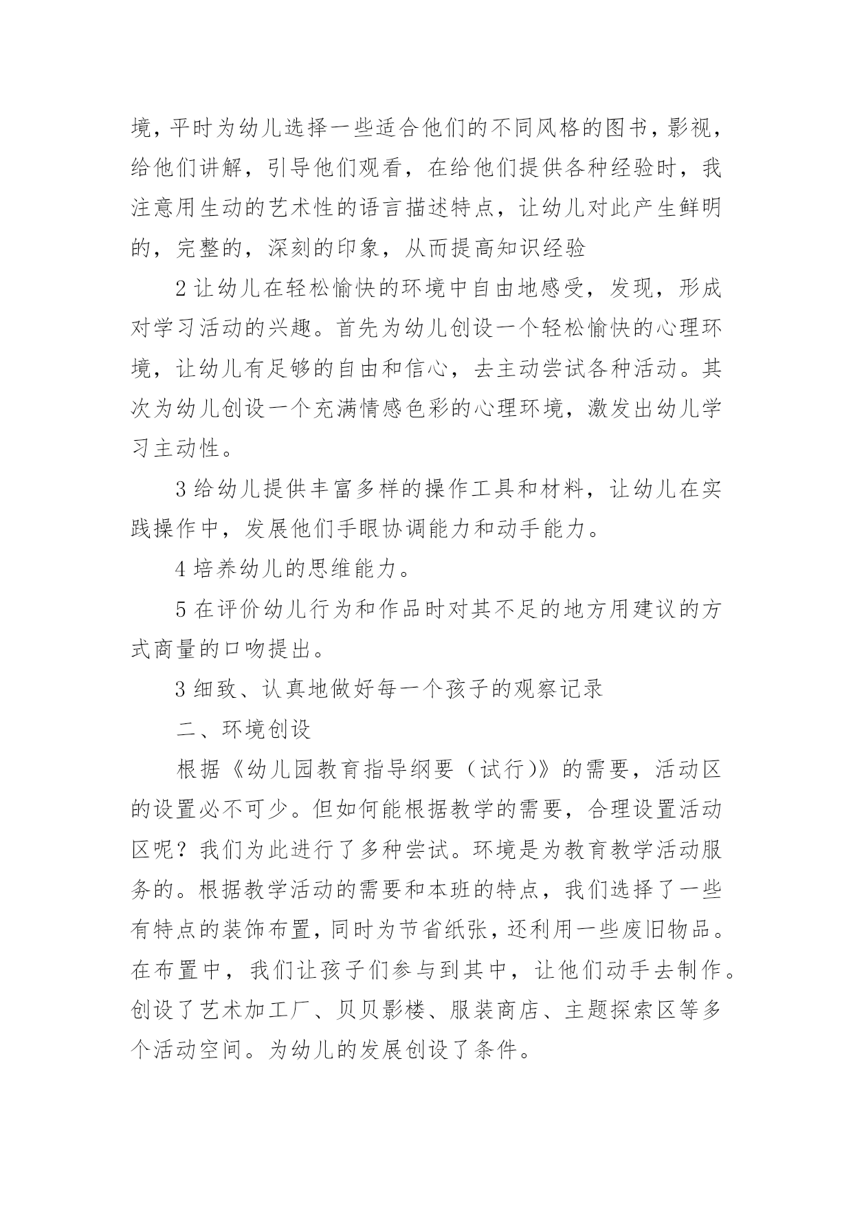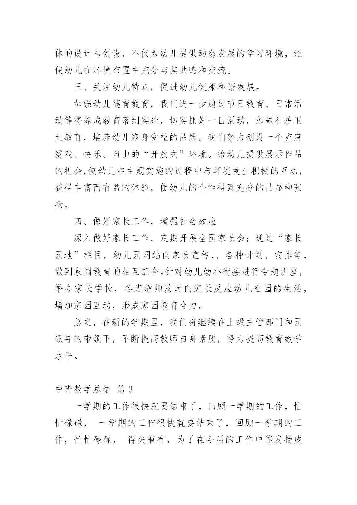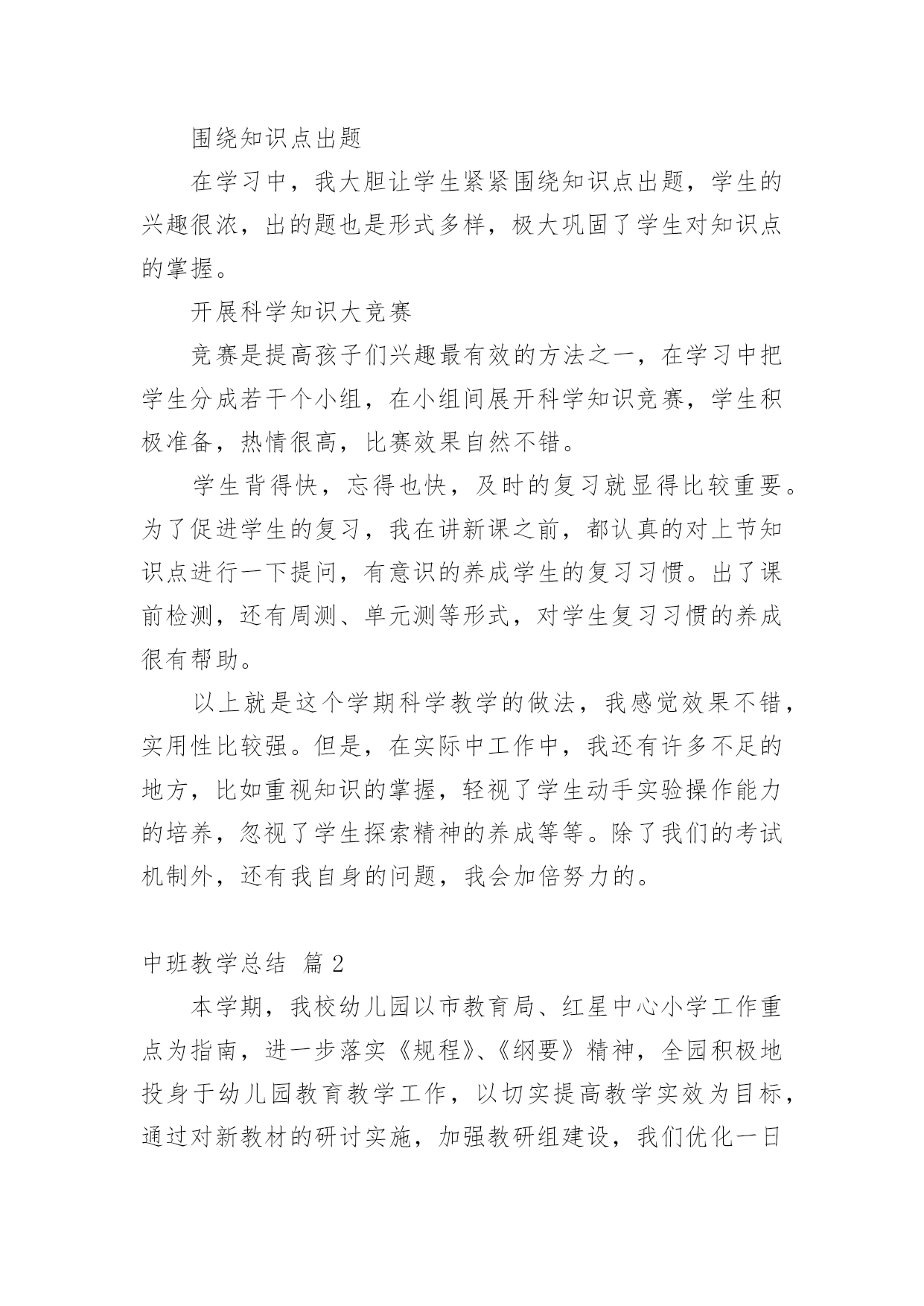 中班教学总结关于中班教学总结集锦五篇总结在一个时期、一个年度、一个阶段对学习和工作生活等情况加以回顾和分析的一种书面材料,通过它可以正确认识以往学习和工作中的优缺点,让我们一起认真地写一份总结吧。那么总结应该包括什么内容呢?下面是小编整理的中班教学总结6篇,仅供参考,欢迎大家阅读。中班教学总结篇1一学期又要过去了,看着孩子们在中班度过了一个愉快而充实的学习生活,我们从心里感到欣慰。一份耕耘一份收获,我们付出了辛勤的汗水,才有了孩子们长足的进步。幼儿园的孩子小,来自不同的家庭,生活规律各不相同。为了培养他们良好的常规,我们真是呕心沥血。一、教育教学工作1、认真备课,提前做好备课工作备课是确保教育活动能顺利完成的前提。我们每次备课前都会先讨论,做到目标明确、条理清晰确保目标的一致性。2、充分遵循《幼儿园教育指导纲要(试行)》1给幼儿提供多种生活经验,通过多种渠道丰富幼儿的日常生活经验,扩大其知识面,让幼儿积累丰富的内在图示,通过参观散步等方式接触幼儿可理解的自然环境和社会环境,平时为幼儿选择一些适合他们的不同风格的图书,影视,给他们讲解,引导他们观看,在给他们提供各种经验时,我注意用生动的艺术性的语言描述特点,让幼儿对此产生鲜明的,完整的,深刻的印象,从而提高知识经验2让幼儿在轻松愉快的环境中自由地感受,发现,形成对学习活动的兴趣。首先为幼儿创设一个轻松愉快的心理环境,让幼儿有足够的自由和信心,去主动尝试各种活动。其次为幼儿创设一个充满情感色彩的心理环境,激发出幼儿学习主动性。3给幼儿提供丰富多样的操作工具和材料,让幼儿在实践操作中,发展他们手眼协调能力和动手能力。4培养幼儿的思维能力。5在评价幼儿行为和作品时对其不足的地方用建议的方式商量的口吻提出。3细致、认真地做好每一个孩子的观察记录二、环境创设根据《幼儿园教育指导纲要(试行)》的需要,活动区的设置必不可少。但如何能根据教学的需要,合理设置活动区呢?我们为此进行了多种尝试。环境是为教育教学活动服务的。根据教学活动的需要和本班的特点,我们选择了一些有特点的装饰布置,同时为节省纸张,还利用一些废旧物品。在布置中,我们让孩子们参与到其中,让他们动手去制作。创设了艺术加工厂、贝贝影楼、服装商店、主题探索区等多个活动空间。为幼儿的发展创设了条件。同时也存在一些不足,有待下学期整改:1、倾听习惯较差,语言表达能力悬殊较大。2、幼儿的游戏水平较低,不知道怎样进行交往。孩子之间解决问题的能力弱。3、幼儿常规习惯还有待加强等。时间过得飞快,一个学期马上就结束了。科学历来就让老师们头疼,看着科学大全上密密麻麻的试题,很难找到重点,划了这个怕考那个。这个学期,科学教师我认真分析教材,吃透重难点,让学生轻松的掌握知识。我的做法1、认真分析课题题目是课文内容的集中体现,认真分析课题,能很好的掌握知识要点。对于每一课的课题我都仔细的分析,从中掌握知识的相关信息。例如“蚯蚓的选择”一课,我进扣“选择”一词分析,选择什么,当然是对环境的选择了,选择什么样的环境,当然是黑暗、潮湿的环境了。这一课没有什么内容,就是让学生通过实验了解蚯蚓的生存环境。这样一来,这一课的学习就简单多了。2、抓好每一课的导语在每一课的开头都有那么几句话,紧扣课题,提纲挈领的引出了一课的内容。我常常从这样的句子中把握课文的重点。还拿“蚯蚓的选择”一课为例,“植物的生存需要一定的环境,动物也是这样吗?”一句是紧挨课题的句子,算是该课的导语。一读不难明白自然讲得是蚯蚓的生存环境。3、给学生划出知识性较强的句子在备课的时候,我把课文中知识性较强的句子都画出来,反复读读想想,以知识引领学生的活动。例如第二单元第一课“光和影”,文中就有这样的句子“像这样,从不同侧面照射得到的物体的影子叫做投影。投影在我们的生活中用处很大”就是知识性很强的句子,我让学生画出来,反复的读了几遍,让学生利用身边的材料进行试验,学生的兴趣很高,对投影的理解也很深入,效果真是不错。通过以上三个步骤,教材的重难点就很清楚了,学生背诵的内容也不多,记起来自然轻松,再加上有趣的试验活动,学生对科学课永不厌烦。知识点梳理清楚了,剩下来的任务就是让学生牢固的掌握。学生兴趣的持续时间比较短,教师的训练方式就应多种多样,才能让学生保持新鲜感。我采用了以下几种训练的方式大声的朗读我让学生大声的朗读划出的知识点,就像读语文课文一样,要有自己的理解。同学们一遍遍的读,对知识点内容的理解逐步深入。认真的书写考试中不断会出现这样的情况,学生会背但写不到卷子上,错字较多。为此,在学生读后,我会让学生写上一些,既弥补了学生不会写的问题,又变换了一下复习形式,学生不至于疲惫。围绕知识点出题在学习中,我大胆让学生紧紧围绕知识点出题,学生的兴趣很浓,出的题也是形式多样,极大巩固了学生对知识点的掌握。开