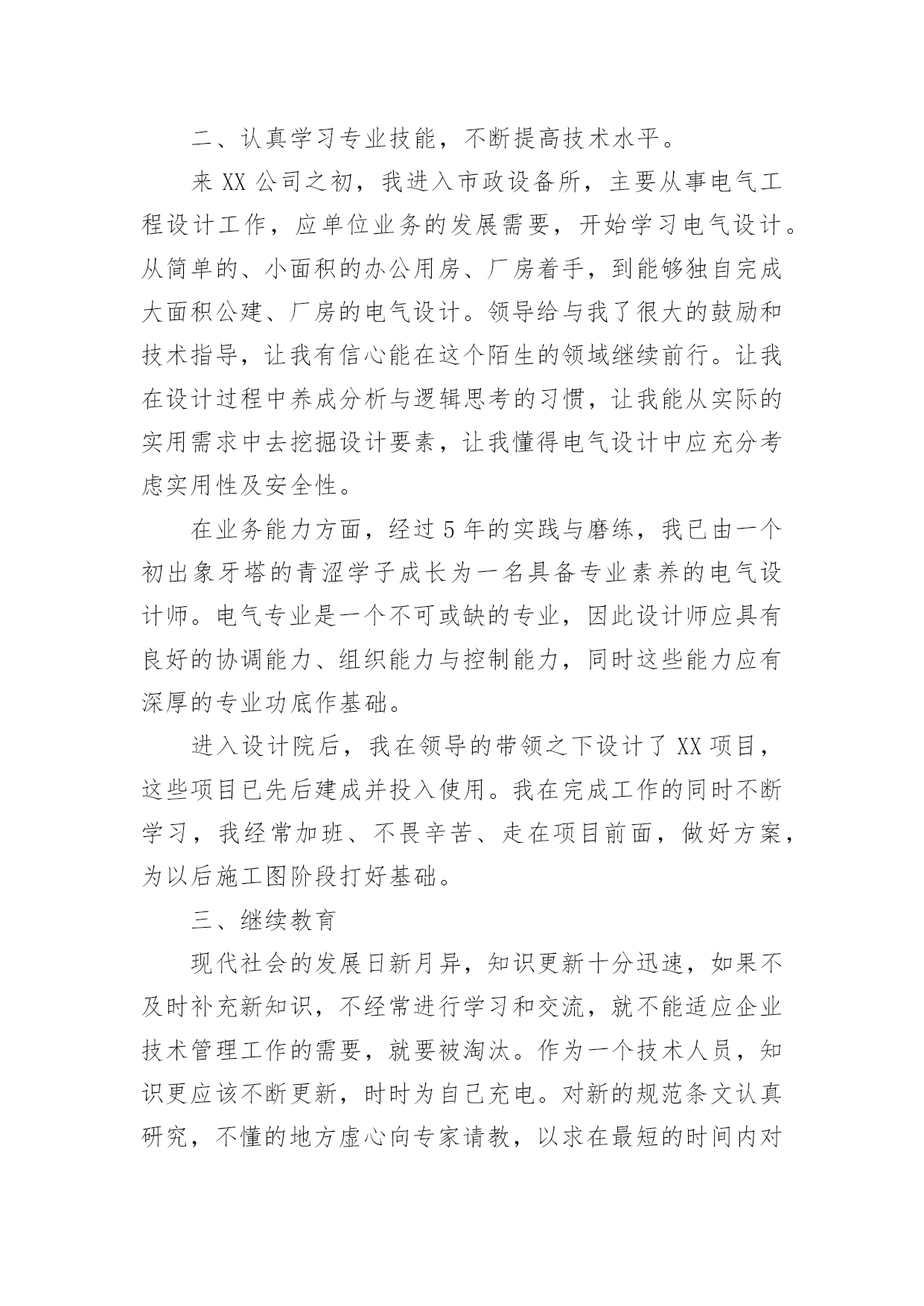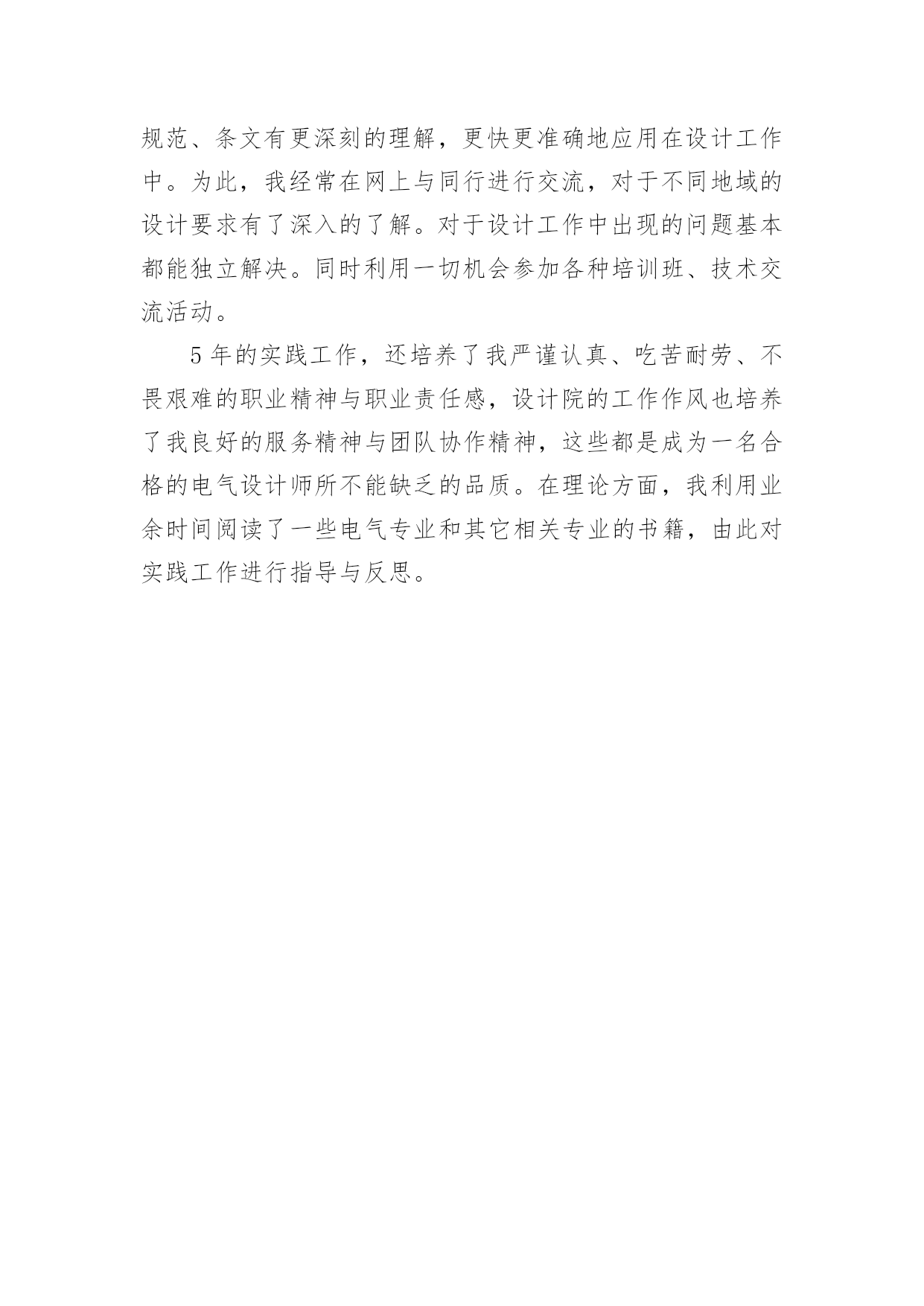 电气中级职称—专业技术工作总结电气中级职称—专业技术工作总结总结是把一定阶段内的有关情况分析研究,做出有指导性的经验方法以及结论的书面材料,它能够给人努力工作的动力,快快来写一份总结吧。那么总结有什么格式呢?以下是小编整理的电气中级职称—专业技术工作总结,仅供参考,希望能够帮助到大家。本人20xx年6月毕业于XX大学XX系。20xx年8月进XXX公司任电气工程设计人员。参加工作至今,已经5年,通过自己的不断努力和刻苦学习,我的专业技术有了长足的进步,在这5年中,我从同行工程师、施工师傅们那里学到了丰富的电气设计知识和施工经验,他们对工作的敬业精神鼓励和感染着我。下面是我从事专业技术工作后的总结,以便评审组织审查。一、政治思想品德参加工作以来,为了进上步提高自身政治敏锐力、政治鉴别力和政策水平,增强贯彻落实党的方针、政策的自觉性、坚定性。我坚持用邓小平理论和“三个代表”重要思想武装头脑,认真学习党的十八大精神。通过加强理论学习,夯实自身的思想政治基础,牢固树立为人民服务的工作宗旨,筑牢反腐拒变的防线,增强抵御各种腐朽思想侵蚀的免疫力。二、认真学习专业技能,不断提高技术水平。来XX公司之初,我进入市政设备所,主要从事电气工程设计工作,应单位业务的发展需要,开始学习电气设计。从简单的、小面积的办公用房、厂房着手,到能够独自完成大面积公建、厂房的电气设计。领导给与我了很大的鼓励和技术指导,让我有信心能在这个陌生的领域继续前行。让我在设计过程中养成分析与逻辑思考的习惯,让我能从实际的实用需求中去挖掘设计要素,让我懂得电气设计中应充分考虑实用性及安全性。在业务能力方面,经过5年的实践与磨练,我已由一个初出象牙塔的青涩学子成长为一名具备专业素养的电气设计师。电气专业是一个不可或缺的专业,因此设计师应具有良好的协调能力、组织能力与控制能力,同时这些能力应有深厚的专业功底作基础。进入设计院后,我在领导的带领之下设计了XX项目,这些项目已先后建成并投入使用。我在完成工作的同时不断学习,我经常加班、不畏辛苦、走在项目前面,做好方案,为以后施工图阶段打好基础。三、继续教育现代社会的发展日新月异,知识更新十分迅速,如果不及时补充新知识,不经常进行学习和交流,就不能适应企业技术管理工作的需要,就要被淘汰。作为一个技术人员,知识更应该不断更新,时时为自己充电。对新的规范条文认真研究,不懂的地方虚心向专家请教,以求在最短的时间内对规范、条文有更深刻的理解,更快更准确地应用在设计工作中。为此,我经常在网上与同行进行交流,对于不同地域的设计要求有了深入的了解。对于设计工作中出现的问题基本都能独立解决。同时利用一切机会参加各种培训班、技术交流活动。5年的实践工作,还培养了我严谨认真、吃苦耐劳、不畏艰难的职业精神与职业责任感,设计院的工作作风也培养了我良好的服务精神与团队协作精神,这些都是成为一名合格的电气设计师所不能缺乏的品质。在理论方面,我利用业余时间阅读了一些电气专业和其它相关专业的书籍,由此对实践工作进行指导与反思。
