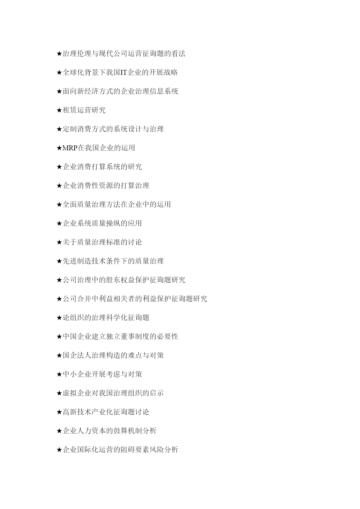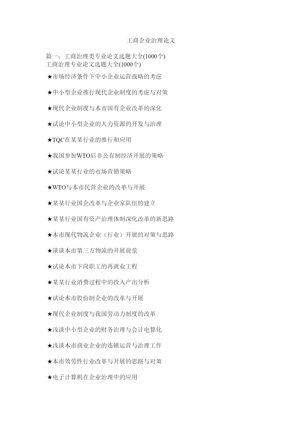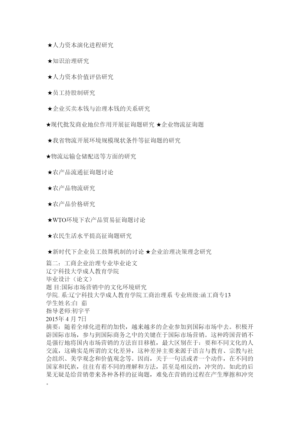 工商企业治理论文篇一:工商治理类专业论文选题大全(1000个)工商治理专业论文选题大全(1000个)★市场经济条件下中小企业运营战略的考虑★中小型企业推行现代企业制度的考虑与对策★现代企业制度与本市国有企业改革的深化★试论中小型企业的人力资源的开发与治理★TQC在某某行业的推行和应用★我国参加WTO后非公有制经济开展的策略★试论某某行业的市场营销策略★WTO与本市民营企业的改革与开展★某某行业国企改革与企业家队伍的建立★某某行业国有资产治理体制深化改革的新思路★本市现代物流企业(行业)开展的对策与思路★谈谈本市第三方物流的开展前景★试论本市下岗职工的再就业工程★某某行业消费过程中的投入产出分析★试论本市股份制企业的改革与开展★现代企业制度与我国劳动力制度的改革★浅谈中小型企业的财务治理与会计电算化★浅谈本市商业企业的连锁运营与治理工作★本市效劳性行业改革与开展的思路与对策★电子计算机在企业治理中的应用★谈谈标准在某某行业(企业)的推行和应用★网络打算技术在中小企业消费治理中的推行与应用★积极引导和鼓舞本市非公经济健康开展的对策与思路★本市三资企业改革与开展的思路★现代企业制度的产权征询题研究★企业股份制改造的思路与对策★理顺产权关系,加强国有资产的治理★坚持政企分开,转变政府职能的考虑★某某行业产品的效应与营销策略★某某企业新产品开发的战略考虑★试论企业现代化运营的战略★试论市场定位与占有率分析★试论产品营销价格策略★试论筹资与股利分配策略★试论企业人才策略★试论一体化与多角化营销的关系★走出投资误区把握平安系数★科研是企业开展的生命线★信息系统是企业治理的根底★法制建立是企业良性开展的保证★试论节能减排的宏微观效益★试论创立绿色产业★试论可再生能源的利用★试论循环经济与可持续开展★从自立自强到外向型扩张★企业核心竞争力探析★企业品牌战略与对策★试论开展中小企业的假设干征询题★上市公司的亏损征询题与重组研究★企业战略理论演化的研究★品牌延伸的征询题与对策★企业组织流程的优化设计策略★产业链上的价值链分析★战略联盟征询题研究★网络经济对现代企业的阻碍★企业的跨文化治理策略★战略转型征询题研究★企业并购征询题研究★对多元化运营战略的全方位考虑★关于企业施行名牌战略的征询题研究★企业成长策略研究★知识治理策略研究★组织构造及形态演化研究★我国上市公司的公司治理构造完善★治理伦理与现代公司运营征询题的看法★全球化背景下我国IT企业的开展战略★面向新经济方式的企业治理信息系统★租赁运营研究★定制消费方式的系统设计与治理★MRP在我国企业的运用★企业消费打算系统的研究★企业消费性资源的打算治理★全面质量治理方法在企业中的运用★企业系统质量操纵的应用★关于质量治理标准的讨论★先进制造技术条件下的质量治理★公司治理中的股东权益保护征询题研究★公司合并中利益相关者的利益保护征询题研究★论组织的治理科学化征询题★中国企业建立独立董事制度的必要性★国企法人治理构造的难点与对策★中小企业开展考虑与对策★虚拟企业对我国治理组织的启示★高新技术产业化征询题讨论★企业人力资本的鼓舞机制分析★企业国际化运营的阻碍要素风险分析★我国入世后,市场运营面临的主要风险及其预防策略★入世后加强我国效劳业国际竞争才能策对策★企业方式的比拟研究★跨国公司先进治理方法的启迪与借鉴★中小企业融资障碍及对策研究★员工培训与开发的理论实践和创新研究★企业人力资源的合理配置与使用研究★知识经济时代人才治理与企业家鼓舞机制研究★家族企业治理分析★企业绩效考核研究★企业文化构建征询题的讨论★和谐社会条件下企业的人力资源治理与开发★电子商务企业的客户效劳★鼓舞理论的运用与实践★企业文化构建方式初探★和谐社会条件下企业家的素养探析★跨国公司并购企业的文化治理策略★中国家电企业家电市场(亦可其它领域)“价格战”征询题的调查(案例)分析和研究★客户关系治理关系营销或数据库营销的调查(案例)分析和研究★中小企业营销或战略治理征询题的调查(案例)分析和研究★市场细分与目的市场选择★购置者行为分析★营销策略(产品策略价格策略分销策略促销策略)★市场竞争与市场价格★国际市场竞争与策略★中国企业分销网络的设计与治理★中国各行业市场营销渠道实证研究★银行业市场营销研究★银行客户经理制研究★零售业市场营销研究(定位战略等方面)★转型时期中国企业营销晋级对策研究★中国MAII的营销战略和策略研究★世界经济一体化背景下中小企业的营销创新★制造商和销售商的营业推行活动探析