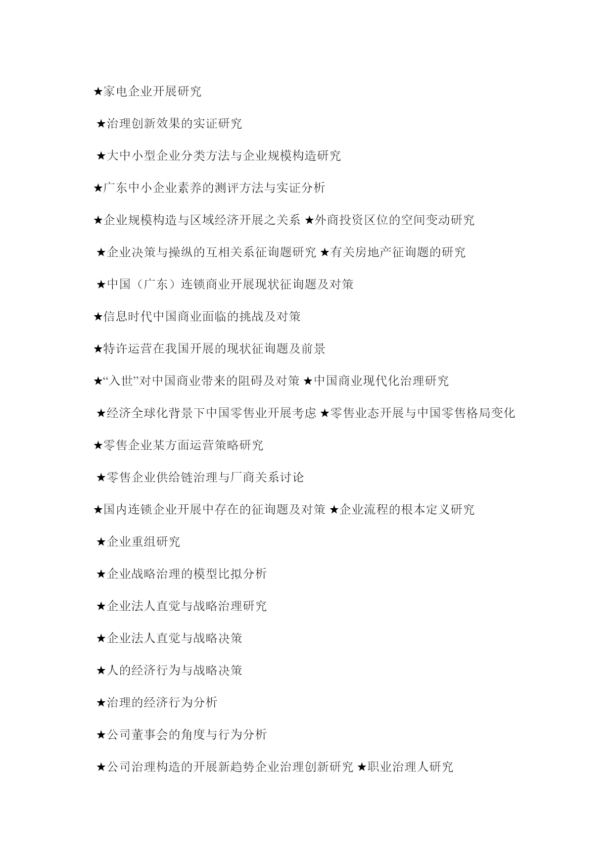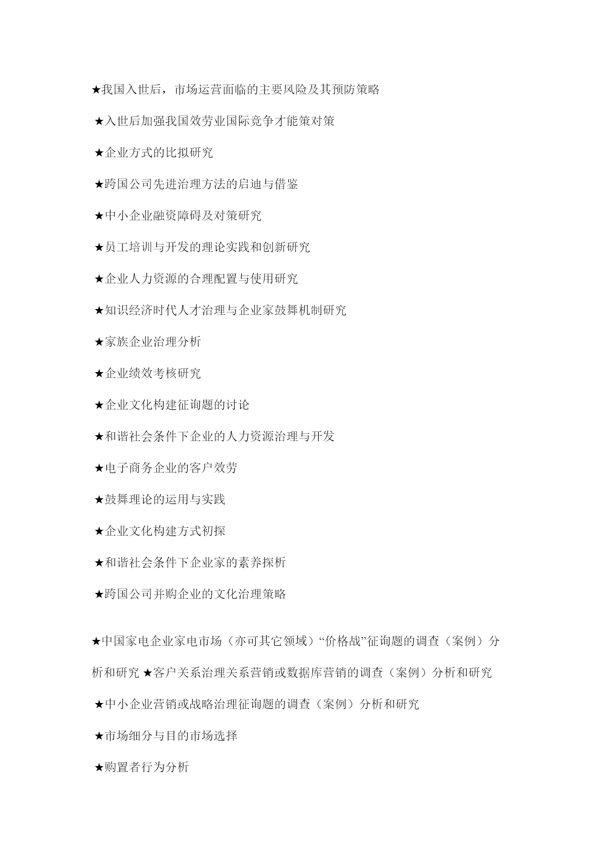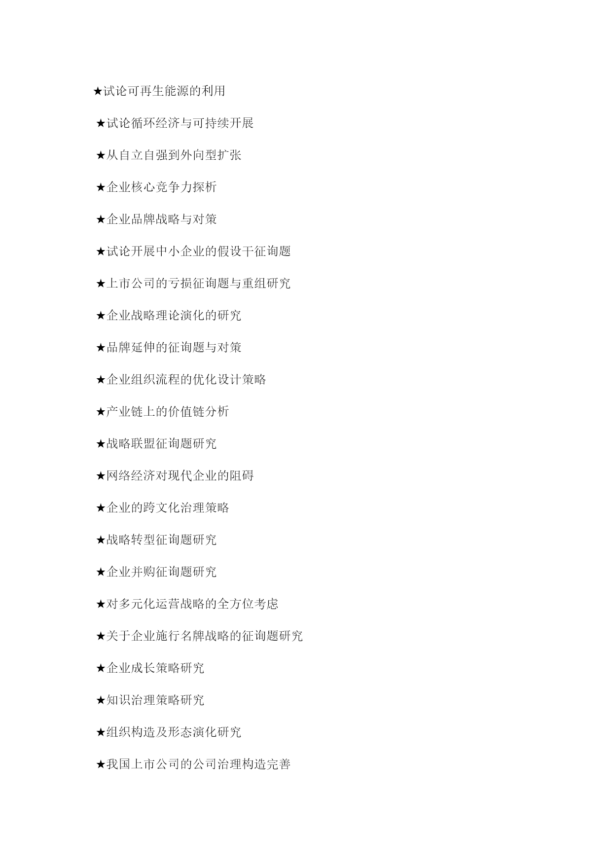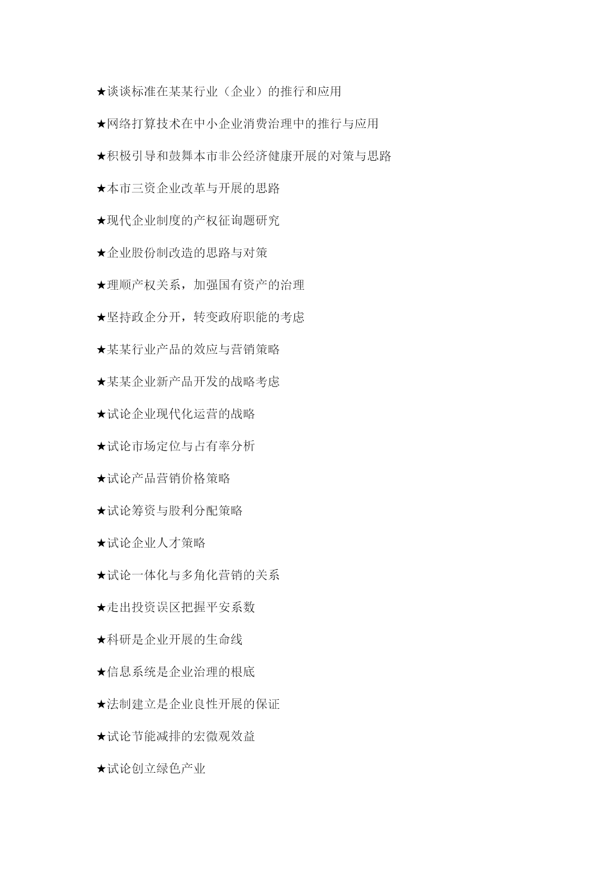工商企业治理论文篇一:工商治理类专业论文选题大全(1000个)工商治理专业论文选题大全(1000个)★市场经济条件下中小企业运营战略的考虑★中小型企业推行现代企业制度的考虑与对策★现代企业制度与本市国有企业改革的深化★试论中小型企业的人力资源的开发与治理★TQC在某某行业的推行和应用★我国参加WTO后非公有制经济开展的策略★试论某某行业的市场营销策略★WTO与本市民营企业的改革与开展★某某行业国企改革与企业家队伍的建立★某某行业国有资产治理体制深化改革的新思路★本市现代物流企业(行业)开展的对策与思路★谈谈本市第三方物流的开展前景★试论本市下岗职工的再就业工程★某某行业消费过程中的投入产出分析★试论本市股份制企业的改革与开展★现代企业制度与我国劳动力制度的改革★浅谈中小型企业的财务治理与会计电算化★浅谈本市商业企业的连锁运营与治理工作★本市效劳性行业改革与开展的思路与对策★电子计算机在企业治理中的应用★谈谈标准在某某行业(企业)的推行和应用★网络打算技术在中小企业消费治理中的推行与应用★积极引导和鼓舞本市非公经济健康开展的对策与思路★本市三资企业改革与开展的思路★现代企业制度的产权征询题研究★企业股份制改造的思路与对策★理顺产权关系,加强国有资产的治理★坚持政企分开,转变政府职能的考虑★某某行业产品的效应与营销策略★某某企业新产品开发的战略考虑★试论企业现代化运营的战略★试论市场定位与占有率分析★试论产品营销价格策略★试论筹资与股利分配策略★试论企业人才策略★试论一体化与多角化营销的关系★走出投资误区把握平安系数★科研是企业开展的生命线★信息系统是企业治理的根底★法制建立是企业良性开展的保证★试论节能减排的宏微观效益★试论创立绿色产业★试论可再生能源的利用★试论循环经济与可持续开展★从自立自强到外向型扩张★企业核心竞争力探析★企业品牌战略与对策★试论开展中小企业的假设干征询题★上市公司的亏损征询题与重组研究★企业战略理论演化的研究★品牌延伸的征询题与对策★企业组织流程的优化设计策略★产业链上的价值链分析★战略联盟征询题研究★网络经济对现代企业的阻碍★企业的跨文化治理策略★战略转型征询题研究★企业并购征询题研究★对多元化运营战略的全方位考虑★关于企业施行名牌战略的征询题研究★企业成长策略研究★知识治理策略研究★组织构造及形态演化研究★我国上市公司的公司治理构造完善★治理伦理与现代公司运营征询题的看法★全球化背景下我国IT企业的开展战略★面向新经济方式的企业治理信息系统★租赁运营研究★定制消费方式的系统设计与治理★MRP在我国企业的运用★企业消费打算系统的研究★企业消费性资源的打算治理★全面质量治理方法在企业中的运用★企业系统质量操纵的应用★关于质量治理标准的讨论★先进制造技术条件下的质量治理★公司治理中的股东权益保护征询题研究★公司合并中利益相关者的利益保护征询题研究★论组织的治理科学化征询题★中国企业建立独立董事制度的必要性★国企法人治理构造的难点与对策★中小企业开展考虑与对策★虚拟企业对我国治理组织的启示★高新技术产业化征询题讨论★企业人力资本的鼓舞机制分析★企业国际化运营的阻碍要素风险分析★我国入世后,市场运营面临的主要风险及其预防策略★入世后加强我国效劳业国际竞争才能策对策★企业方式的比拟研究★跨国公司先进治理方法的启迪与借鉴★中小企业融资障碍及对策研究★员工培训与开发的理论实践和创新研究★企业人力资源的合理配置与使用研究★知识经济时代人才治理与企业家鼓舞机制研究★家族企业治理分析★企业绩效考核研究★企业文化构建征询题的讨论★和谐社会条件下企业的人力资源治理与开发★电子商务企业的客户效劳★鼓舞理论的运用与实践★企业文化构建方式初探★和谐社会条件下企业家的素养探析★跨国公司并购企业的文化治理策略★中国家电企业家电市场(亦可其它领域)“价格战”征询题的调查(案例)分析和研究★客户关系治理关系营销或数据库营销的调查(案例)分析和研究★中小企业营销或战略治理征询题的调查(案例)分析和研究★市场细分与目的市场选择★购置者行为分析★营销策略(产品策略价格策略分销策略促销策略)★市场竞争与市场价格★国际市场竞争与策略★中国企业分销网络的设计与治理★中国各行业市场营销渠道实证研究★银行业市场营销研究★银行客户经理制研究★零售业市场营销研究(定位战略等方面)★转型时期中国企业营销晋级对策研究★中国MAII的营销战略和策略研究★世界经济一体化背景下中小企业的营销创新★制造商和销售商的营业推行活动探析