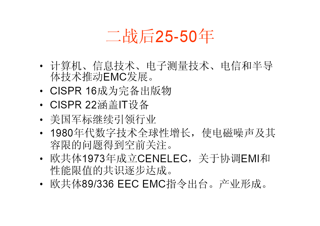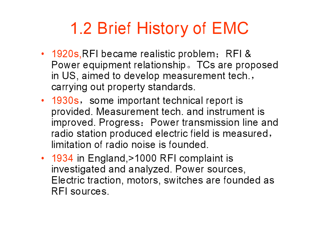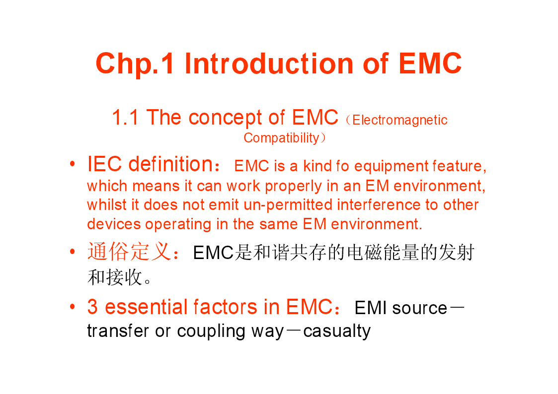 EMC-1Dept.ofE.E.SJTUChp.1IntroductionofEMC1.1TheconceptofEMC(ElectromagneticCompatibility)•IECdefinition:EMCisakindfoequipmentfeature,whichmeansitcanworkproperlyinanEMenvironment,whilstitdoesnotemitun-permittedinterferencetootherdevicesoperatinginthesameEMenvironment.•通俗定义:EMC是和谐共存的电磁能量的发射和接收。•3essentialfactorsinEMC:EMIsource-transferorcouplingway-casualty1.2BriefHistoryofEMC•1920s,RFIbecamerealisticproblem;RFI&Powerequipmentrelationship。TCsareproposedinUS,aimedtodevelopmeasurementtech.,carryingoutpropertystandards.•1930s,someimportanttechnicalreportisprovided.Measurementtech.andinstrumentisimproved.Progress:Powertransmissionlineandradiostationproducedelectricfieldismeasured,limitationofradionoiseisfounded.•1934inEngland,>1000RFIcomplaintisinvestigatedandanalyzed.Powersources,Electrictraction,motors,switchesarefoundedasRFIsources.•IEC,IRAInternationalRadioAlliancefacedtotheproblem.CISPRisfoundedin1933.Thefirstmeetingisin1934.ResearchesareaimedatRFImeasurementmethodandacceptableupperlimit.After2~3years,160~1605kHzmeas.devicesarebasicallyaccepted.20%amplitudeturningdepth&1mV/mfieldreferenced&40dBsignal/noiseratiointerferencelimitisagreed.•Progress:USRFImeas.methodreport1940;CISPRtestreceiver,LISN,fieldconferenceproceedings;0.15~18MHzbandRFIandfieldmeasurement.Regulation;Measurement.ofRFInearPTL;160~1605HzbandRFImeasurement.&LISNoperatingregulation;RFIreceiverisdeveloped.DuringWorldWarIIandlater25ys•CISPRstoppedoperating•Militarypurposepushedcommunicationandradardevelopment.1940s,20MHz,1950s,30MHz,1960s,1GHz。MilitarySTDisimplementsinforce.Butsecretkeepingobstructtechnicalintercourse.•AfterWorldWarII,CISPRisveryactive,Canada、Australia&thenAsiancountriesjoined,CCIR(国际无线电咨询委员会)joinedalso,goestohigherfreq.andinmoredetail.RadioTV,PTL,residentialdevices,ISMdevicesareinvestigated.•FCC,Britishinst.ofIndustrialstandardizationpublishedinterferencecontrollimits.Progress•1945,U.S.navyandair-forcecommontechnical
