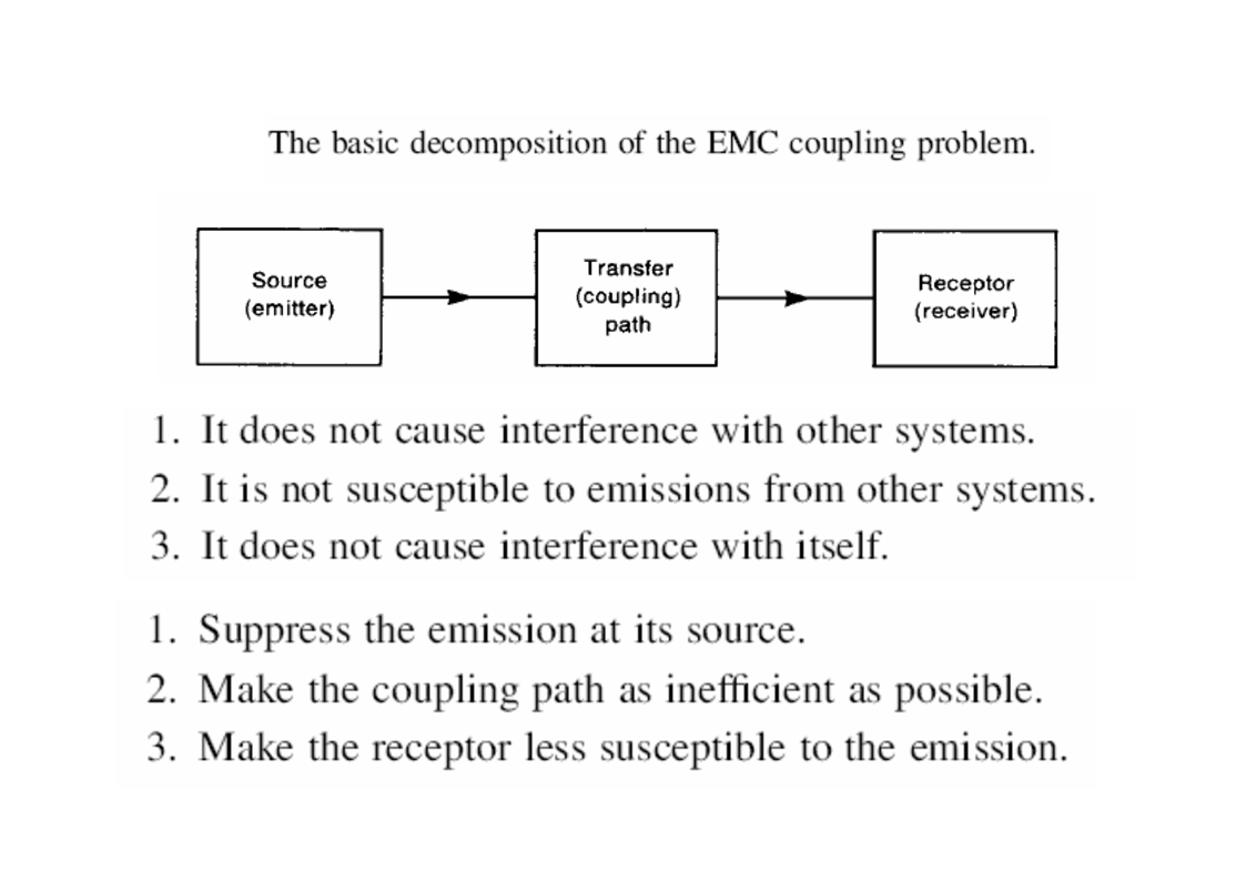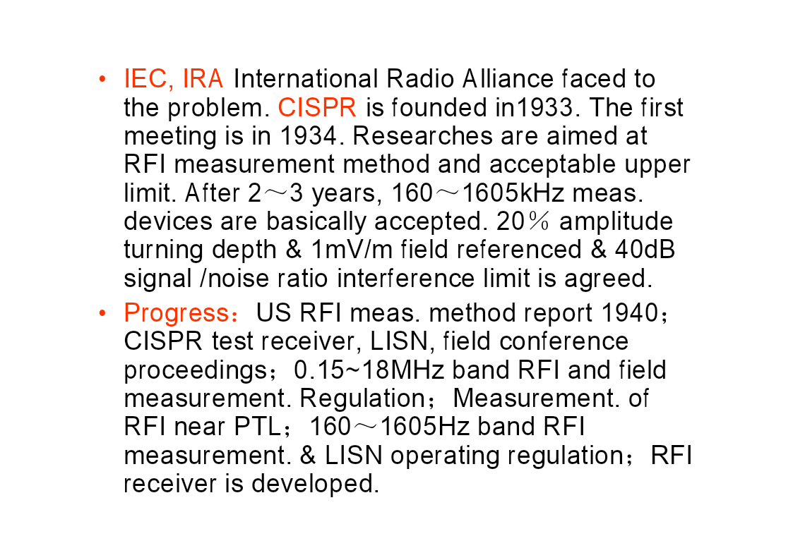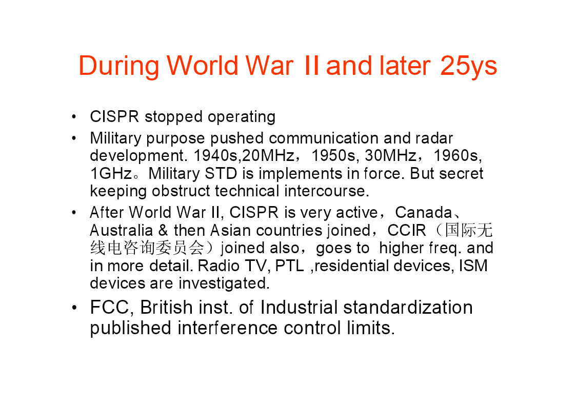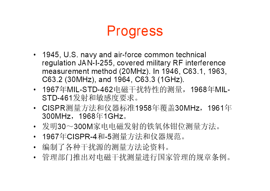 EMC-1Dept.ofE.E.SJTUChp.1IntroductionofEMC1.1TheconceptofEMC(ElectromagneticCompatibility)•IECdefinition:EMCisakindfoequipmentfeature,whichmeansitcanworkproperlyinanEMenvironment,whilstitdoesnotemitun-permittedinterferencetootherdevicesoperatinginthesameEMenvironment.•通俗定义:EMC是和谐共存的电磁能量的发射和接收。•3essentialfactorsinEMC:EMIsource-transferorcouplingway-casualty1.2BriefHistoryofEMC•1920s,RFIbecamerealisticproblem;RFI&Powerequipmentrelationship。TCsareproposedinUS,aimedtodevelopmeasurementtech.,carryingoutpropertystandards.•1930s,someimportanttechnicalreportisprovided.Measurementtech.andinstrumentisimproved.Progress:Powertransmissionlineandradiostationproducedelectricfieldismeasured,limitationofradionoiseisfounded.•1934inEngland,>1000RFIcomplaintisinvestigatedandanalyzed.Powersources,Electrictraction,motors,switchesarefoundedasRFIsources.•IEC,IRAInternationalRadioAlliancefacedtotheproblem.CISPRisfoundedin1933.Thefirstmeetingisin1934.ResearchesareaimedatRFImeasurementmethodandacceptableupperlimit.After2~3years,160~1605kHzmeas.devicesarebasicallyaccepted.20%amplitudeturningdepth&1mV/mfieldreferenced&40dBsignal/noiseratiointerferencelimitisagreed.•Progress:USRFImeas.methodreport1940;CISPRtestreceiver,LISN,fieldconferenceproceedings;0.15~18MHzbandRFIandfieldmeasurement.Regulation;Measurement.ofRFInearPTL;160~1605HzbandRFImeasurement.&LISNoperatingregulation;RFIreceiverisdeveloped.DuringWorldWarIIandlater25ys•CISPRstoppedoperating•Militarypurposepushedcommunicationandradardevelopment.1940s,20MHz,1950s,30MHz,1960s,1GHz。MilitarySTDisimplementsinforce.Butsecretkeepingobstructtechnicalintercourse.•AfterWorldWarII,CISPRisveryactive,Canada、Australia&thenAsiancountriesjoined,CCIR(国际无线电咨询委员会)joinedalso,goestohigherfreq.andinmoredetail.RadioTV,PTL,residentialdevices,ISMdevicesareinvestigated.•FCC,Britishinst.ofIndustrialstandardizationpublishedinterferencecontrollimits.Progress•1945,U.S.navyandair-forcecommontechnical