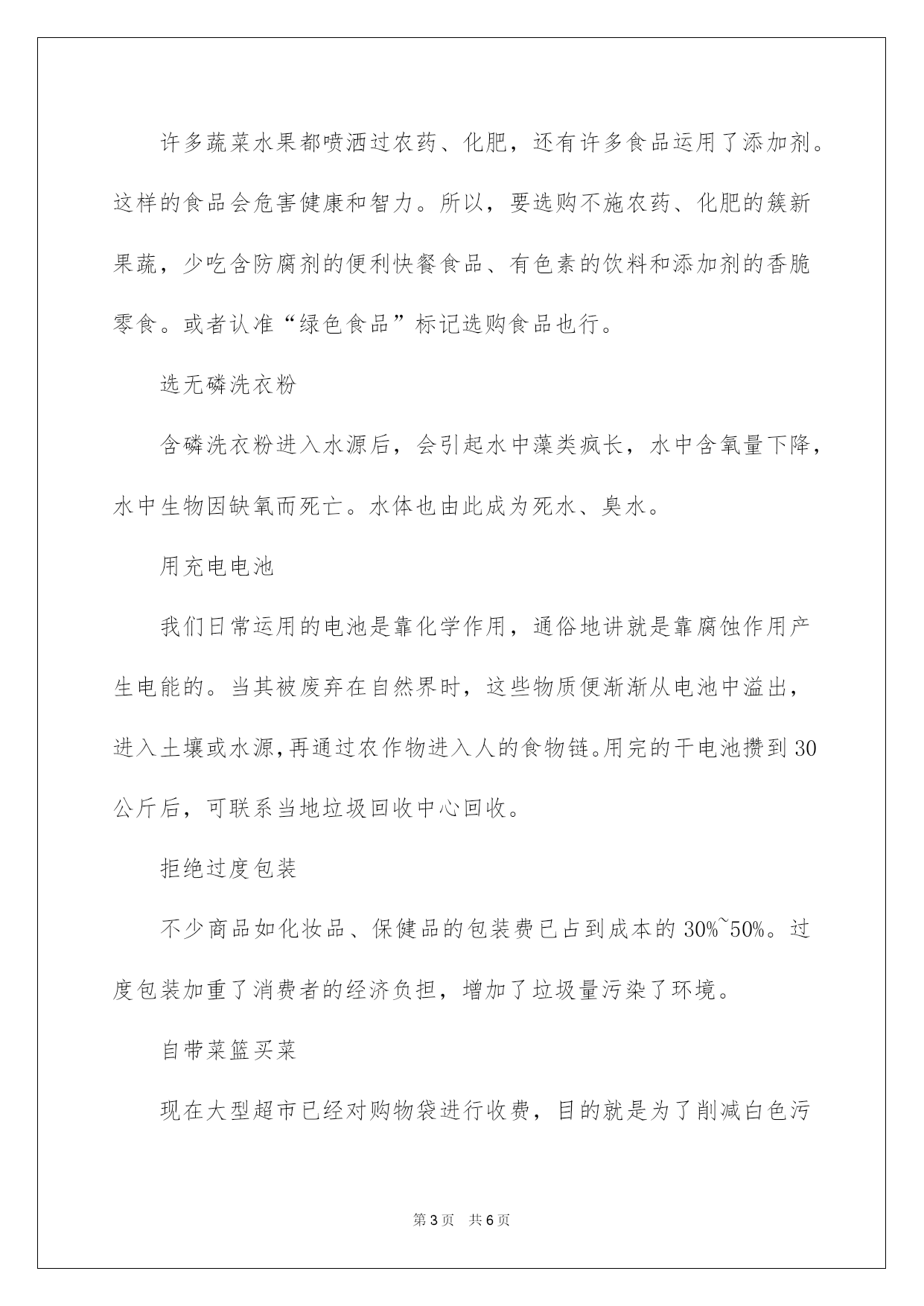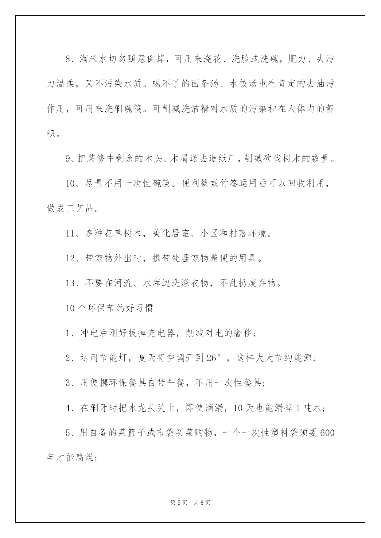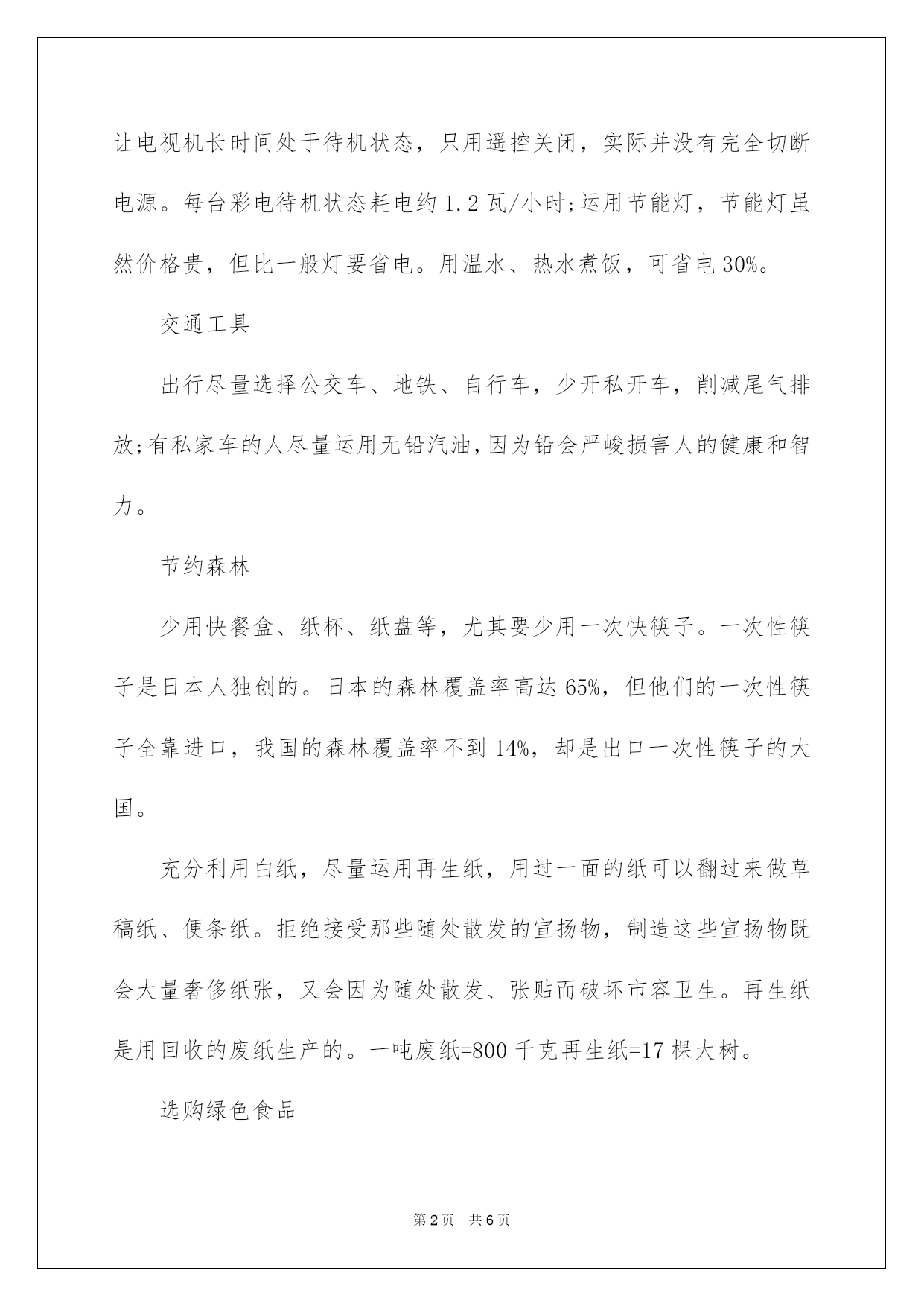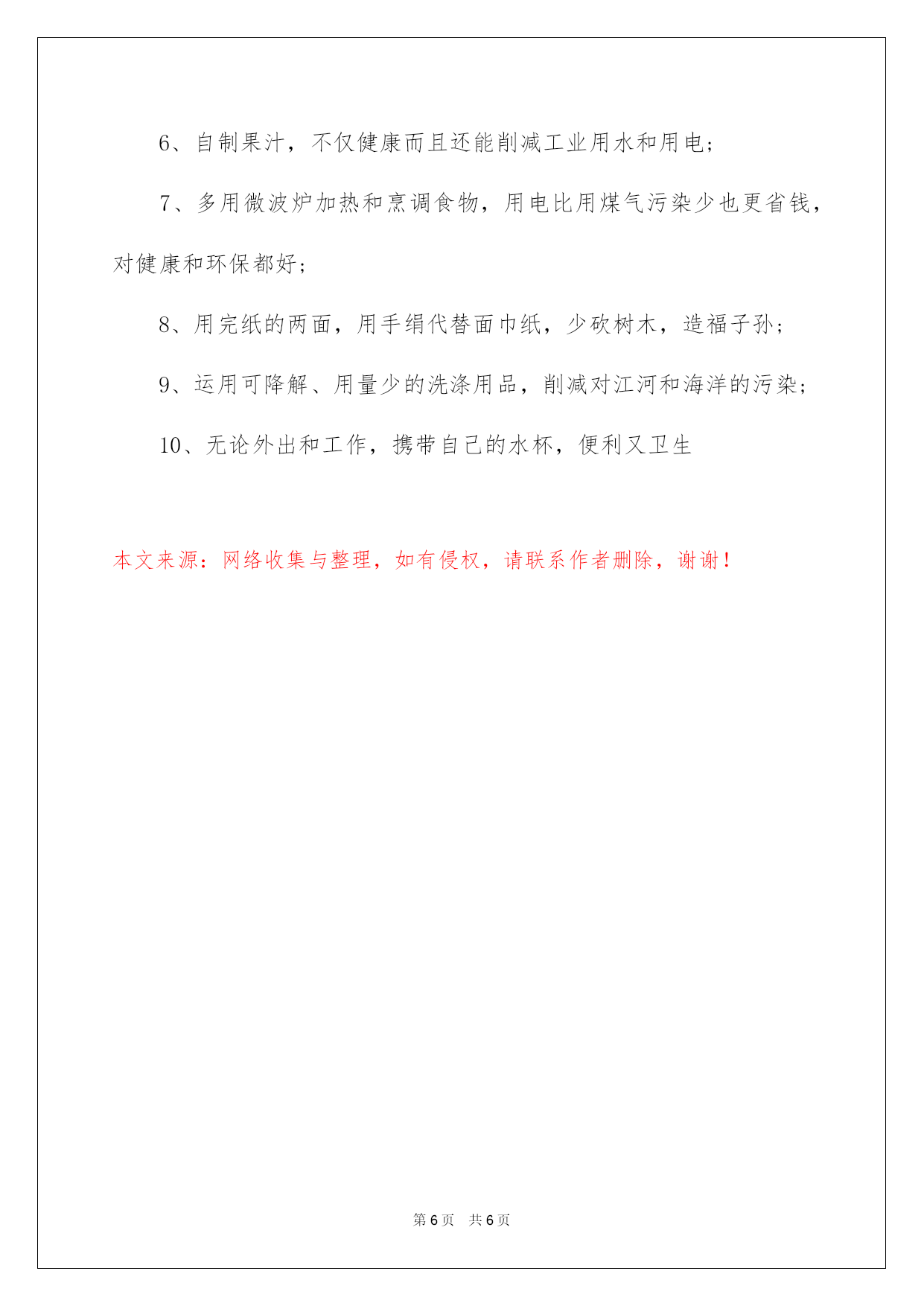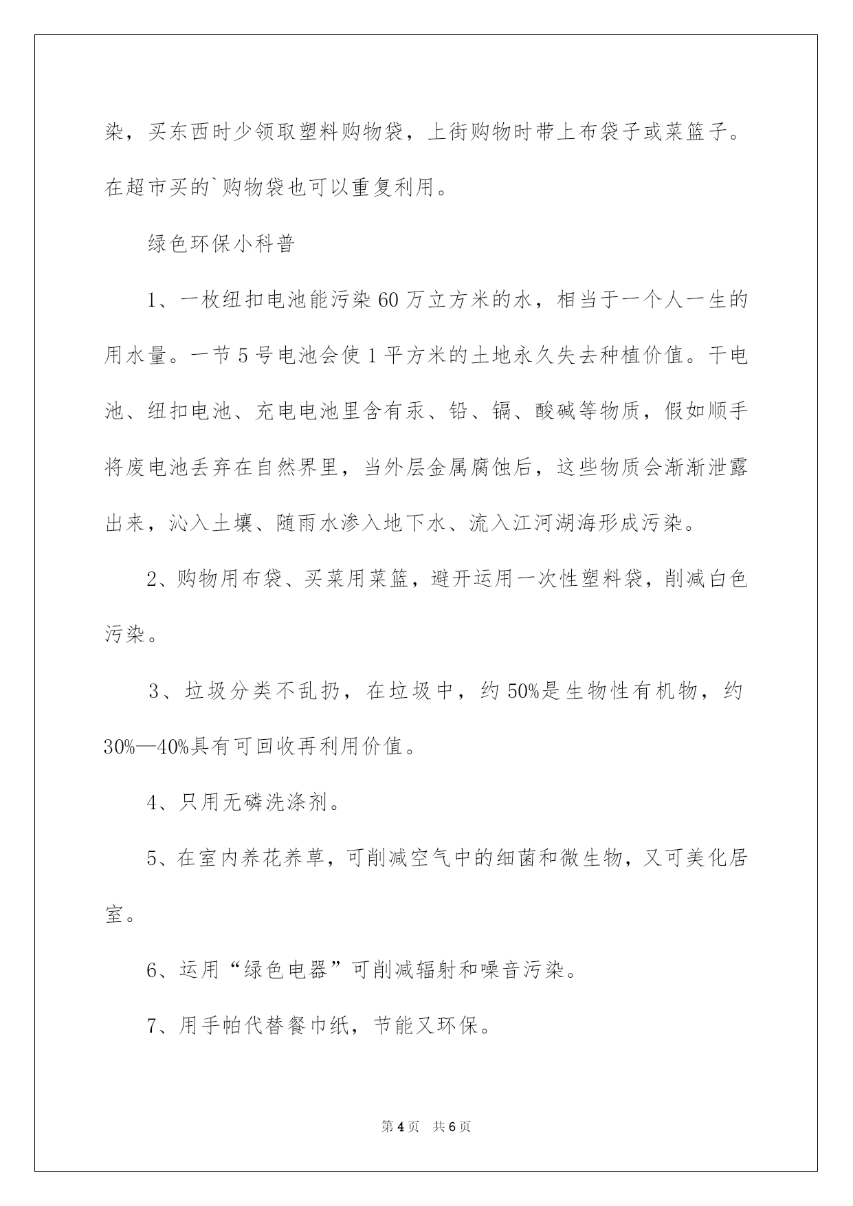 第PAGE\*Arabic\*MERGEFORMAT6页共NUMPAGES\*Arabic\*MERGEFORMAT6页第PAGE\*MERGEFORMAT6页共NUMPAGES\*MERGEFORMAT6页第PAGE\*MERGEFORMAT6页共NUMPAGES\*MERGEFORMAT6页第PAGE\*MERGEFORMAT6页共NUMPAGES\*MERGEFORMAT6页第PAGE\*MERGEFORMAT6页共NUMPAGES\*MERGEFORMAT6页第PAGE\*MERGEFORMAT6页共NUMPAGES\*MERGEFORMAT6页第PAGE\*MERGEFORMAT6页共NUMPAGES\*MERGEFORMAT6页第PAGE\*MERGEFORMAT6页共NUMPAGES\*MERGEFORMAT6页第PAGE\*MERGEFORMAT6页共NUMPAGES\*MERGEFORMAT6页第PAGE\*MERGEFORMAT6页共NUMPAGES\*MERGEFORMAT6页第PAGE\*MERGEFORMAT6页共NUMPAGES\*MERGEFORMAT6页2022绿色环保小常识2022绿色环保小常识演讲稿网发布2022绿色环保小常识,更多2022绿色环保小常识相关信息请访问演讲稿网演讲稿频道。节约用水随时关上水龙头,别让水白流;望见漏水的龙头肯定要拧紧它。尽量运用二次水。例如,淘米或洗菜的水可以浇花;洗脸、洗衣后的水可以留下来擦地、冲厕所。假如您家冲水马桶的容量较大,可以在水箱里放一个装满水的可乐瓶,你的这一小小行动每次可节约1.25升水。少用洗洁精大部分洗涤剂是化学产品,会污染水源。洗餐具时假如油腻过多,可先将残余的油腻倒掉,再用热面汤或热肥皂水等清洗,这样就不会让油污过多地排入水道了。有重油污的厨房用具也可以用苏打加热水来清洗。节约用电顺手关灯、少用电器、少用空调为减缓地球暖和化出一把力;不要让电视机长时间处于待机状态,只用遥控关闭,实际并没有完全切断电源。每台彩电待机状态耗电约1.2瓦/小时;运用节能灯,节能灯虽然价格贵,但比一般灯要省电。用温水、热水煮饭,可省电30%。交通工具出行尽量选择公交车、地铁、自行车,少开私开车,削减尾气排放;有私家车的人尽量运用无铅汽油,因为铅会严峻损害人的健康和智力。节约森林少用快餐盒、纸杯、纸盘等,尤其要少用一次快筷子。一次性筷子是日本人独创的。日本的森林覆盖率高达65%,但他们的一次性筷子全靠进口,我国的森林覆盖率不到14%,却是出口一次性筷子的大国。充分利用白纸,尽量运用再生纸,用过一面的纸可以翻过来做草稿纸、便条纸。拒绝接受那些随处散发的宣扬物,制造这些宣扬物既会大量奢侈纸张,又会因为随处散发、张贴而破坏市容卫生。再生纸是用回收的废纸生产的。一吨废纸=800千克再生纸=17棵大树。选购绿色食品许多蔬菜水果都喷洒过农药、化肥,还有许多食品运用了添加剂。这样的食品会危害健康和智力。所以,要选购不施农药、化肥的簇新果蔬,少吃含防腐剂的便利快餐食品、有色素的饮料和添加剂的香脆零食。或者认准“绿色食品”标记选购食品也行。选无磷洗衣粉含磷洗衣粉进入水源后,会引起水中藻类疯长,水中含氧量下降,水中生物因缺氧而死亡。水体也由此成为死水、臭水。用充电电池我们日常运用的电池是靠化学作用,通俗地讲就是靠腐蚀作用产生电能的。当其被废弃在自然界时,这些物质便渐渐从电池中溢出,进入土壤或水源,再通过农作物进入人的食物链。用完的干电池攒到30公斤后,可联系当地垃圾回收中心回收。拒绝过度包装不少商品如化妆品、保健品的包装费已占到成本的30%~50%。过度包装加重了消费者的经济负担,增加了垃圾量污染了环境。自带菜篮买菜现在大型超市已经对购物袋进行收费,目的就是为了削减白色污染,买东西时少领取塑料购物袋,上街购物时带上布袋子或菜篮子。在超市买的`购物袋也可以重复利用。绿色环保小科普1、一枚纽扣电池能污染60万立方米的水,相当于一个人一生的用水量。一节5号电池会使1平方米的土地永久失去种植价值。干电池、纽扣电池、充电电池里含有汞、铅、镉、酸碱等物质,假如顺手将废电池丢弃在自然界里,当外层金属腐蚀后,这些物质会渐渐泄露出来,沁入土壤、随雨水渗入地下水、流入江河湖海形成污染。2、购物用布袋、买菜用菜篮,避开运用一次性塑料袋,削减白色污染。3、垃圾分类不乱扔,在垃圾中,约50%是生物性有机物,约30%—40%具有可回收再利用价值。4、只用无磷洗涤剂。5、在室内养花养草,可削减空气中的细菌和微生物,又可美化居室。6、运用“绿色电器”可削减辐射
