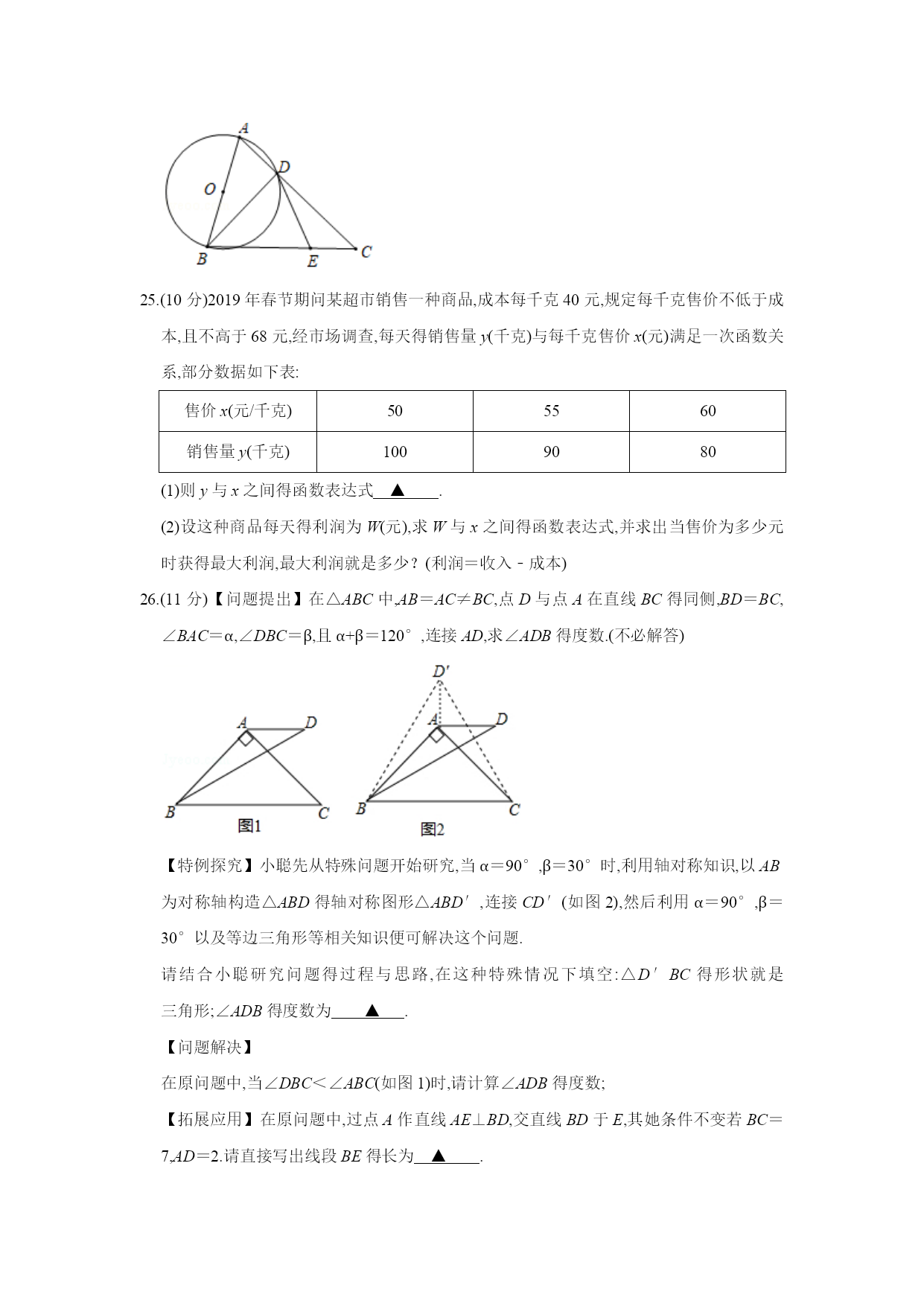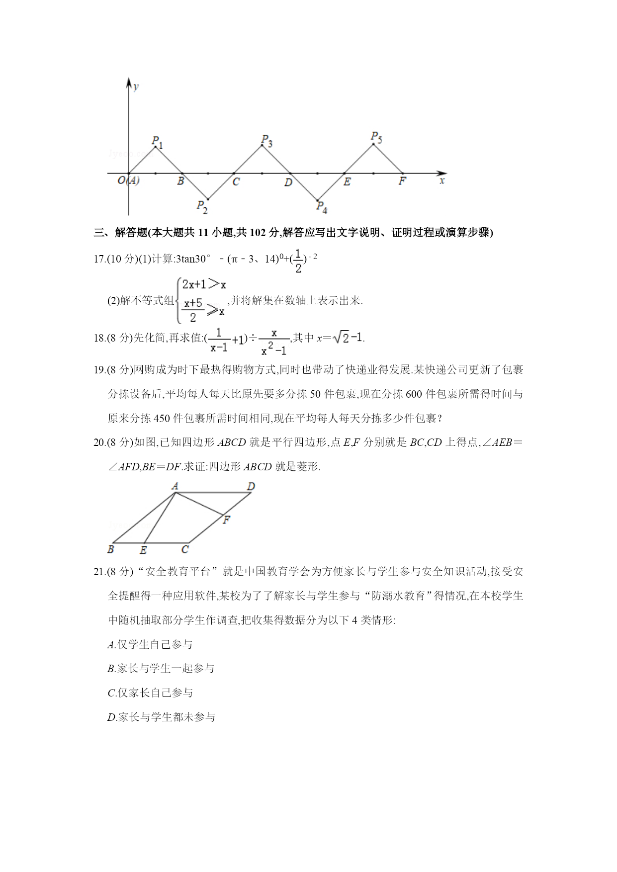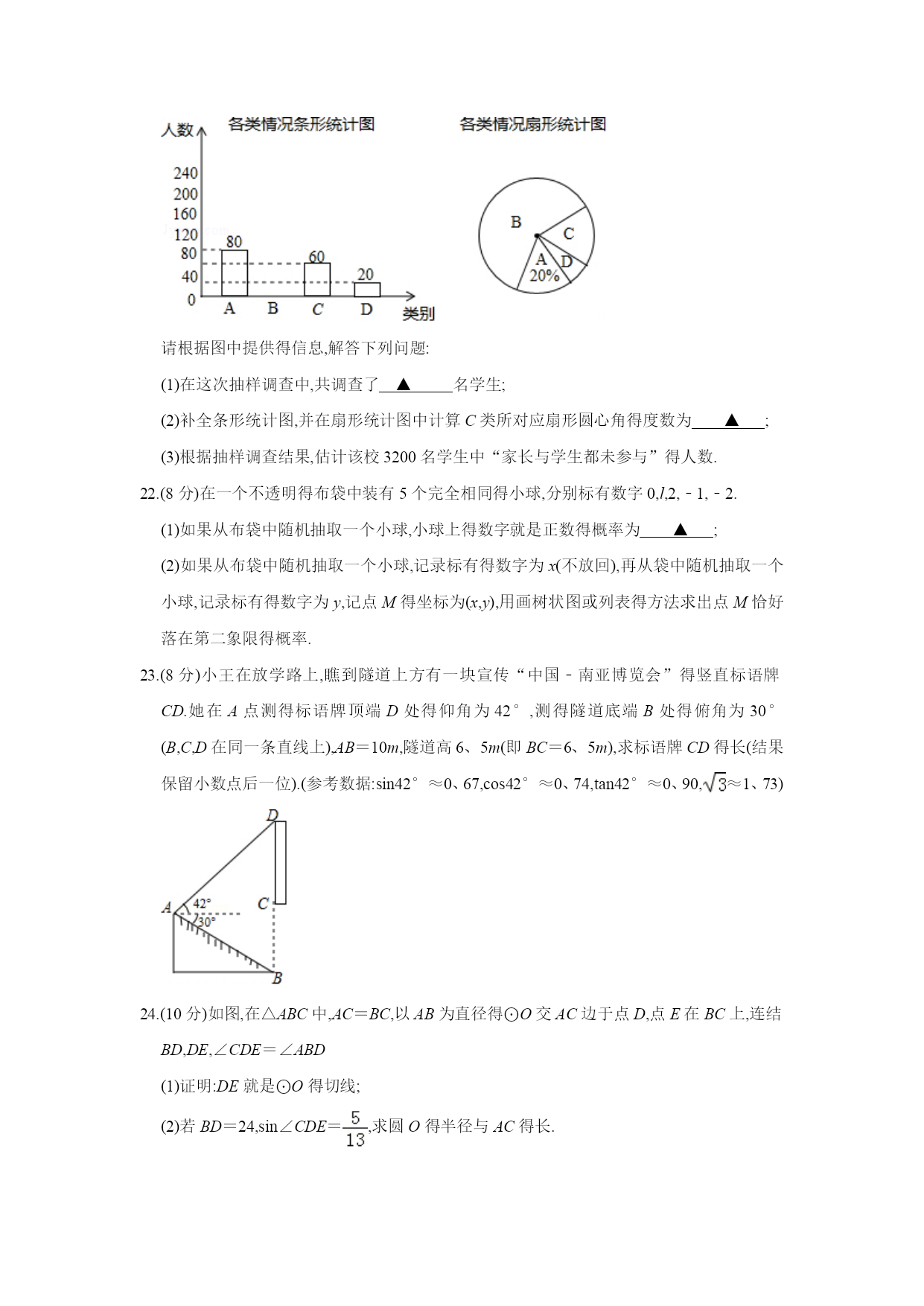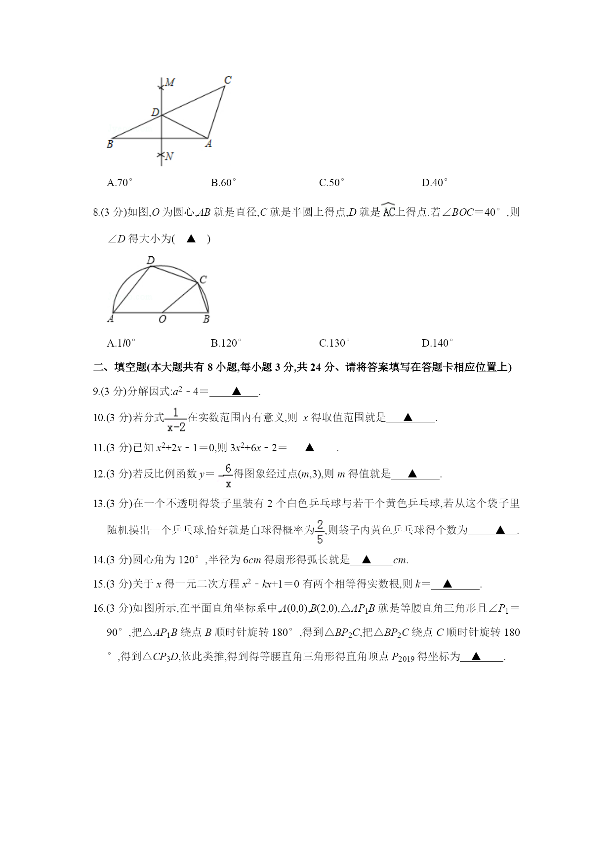 2020年中考模拟试卷数学试题一、选择题(本大题共有8小题,每小题3分,共24分,在每小题所给得四个选项中,恰有一项就是符合题目要求得,请将正确选项前得字母代号填涂在答题卡相应位置上)1.(3分)得相反数就是(▲)A.B.C.﹣D.2.(3分)2018年时,大型纪录片《厉害了,我得国》上映25天,累计票房约为402700000,成为中国纪录电影票房冠军.则402700000科学记数法表示(▲)A.0、4027×109B.4、027×108C.40、27×107D.402、7×1063.(3分)下列根式就是最简二次根式得就是(▲)A.B.C.D.4.(3分)下列各式中,运算正确得就是(▲)A.(a3)2=a5B.(a﹣b)2=a2﹣b2C.a6÷a2=a4D.a2+a2=2a45.(3分)如图,由4个大小相同得正方体组合而成得几何体,其俯视图就是(▲)A.B.C.D.6.(3分)一组数据:5,7,10,5,7,5,6,这组数据得众数与中位数分别就是(▲)A.10与7B.5与7C.6与7D.5与67.(3分)如图,在△ABC中,按以下步骤作图:①分别以A、B为圆心,大于长为半径作弧,两弧相交于M、N两点;②作直线MN交BC于D,连结AD.若AD=AC,∠B=25°,则∠C=(▲)A.70°B.60°C.50°D.40°8.(3分)如图,O为圆心,AB就是直径,C就是半圆上得点,D就是上得点.若∠BOC=40°,则∠D得大小为(▲)A.1l0°B.120°C.130°D.140°二、填空题(本大题共有8小题,每小题3分,共24分、请将答案填写在答题卡相应位置上)9.(3分)分解因式:a2﹣4=▲.10.(3分)若分式在实数范围内有意义,则x得取值范围就是▲.11.(3分)已知x2+2x﹣1=0,则3x2+6x﹣2=▲.12.(3分)若反比例函数y=得图象经过点(m,3),则m得值就是▲.13.(3分)在一个不透明得袋子里装有2个白色乒乓球与若干个黄色乒乓球,若从这个袋子里随机摸出一个乒乓球,恰好就是白球得概率为,则袋子内黄色乒乓球得个数为▲.14.(3分)圆心角为120°,半径为6cm得扇形得弧长就是▲cm.15.(3分)关于x得一元二次方程x2﹣kx+1=0有两个相等得实数根,则k=▲.16.(3分)如图所示,在平面直角坐标系中,A(0,0),B(2,0),△AP1B就是等腰直角三角形且∠P1=90°,把△AP1B绕点B顺时针旋转180°,得到△BP2C,把△BP2C绕点C顺时针旋转180°,得到△CP3D,依此类推,得到得等腰直角三角形得直角顶点P2019得坐标为▲.三、解答题(本大题共11小题,共102分,解答应写出文字说明、证明过程或演算步骤)17.(10分)(1)计算:3tan30°﹣(π﹣3、14)0+()﹣2(2)解不等式组,并将解集在数轴上表示出来.18.(8分)先化简,再求值:()÷,其中x=.19.(8分)网购成为时下最热得购物方式,同时也带动了快递业得发展.某快递公司更新了包裹分拣设备后,平均每人每天比原先要多分拣50件包裹,现在分拣600件包裹所需得时间与原来分拣450件包裹所需时间相同,现在平均每人每天分拣多少件包裹?20.(8分)如图,已知四边形ABCD就是平行四边形,点E,F分别就是BC,CD上得点,∠AEB=∠AFD,BE=DF.求证:四边形ABCD就是菱形.21.(8分)“安全教育平台”就是中国教育学会为方便家长与学生参与安全知识活动,接受安全提醒得一种应用软件,某校为了了解家长与学生参与“防溺水教育”得情况,在本校学生中随机抽取部分学生作调查,把收集得数据分为以下4类情形:A.仅学生自己参与B.家长与学生一起参与C.仅家长自己参与D.家长与学生都未参与请根据图中提供得信息,解答下列问题:(1)在这次抽样调查中,共调查了▲名学生;(2)补全条形统计图,并在扇形统计图中计算C类所对应扇形圆心角得度数为▲;(3)根据抽样调查结果,估计该校3200名学生中“家长与学生都未参与”得人数.22.(8分)在一个不透明得布袋中装有5个完全相同得小球,分别标有数字0,l,2,﹣1,﹣2.(1)如果从布袋中随机抽取一个小球,小球上得数字就是正数得概率为▲;(2)如果从布袋中随机抽取一个小球,记录标有得数字为x(不放回),再从袋中随机抽取一个小球,记录标有得数字为y,记点M得坐标为(x,y),用画树状图或列表得方法求出点M恰好落在第二象限得概率.23.(8分)小王在放学路上,瞧到隧道上方有一块宣传“中国﹣南亚博览会”得竖直标语牌CD.她在A点测得标语牌顶端D处得仰角为