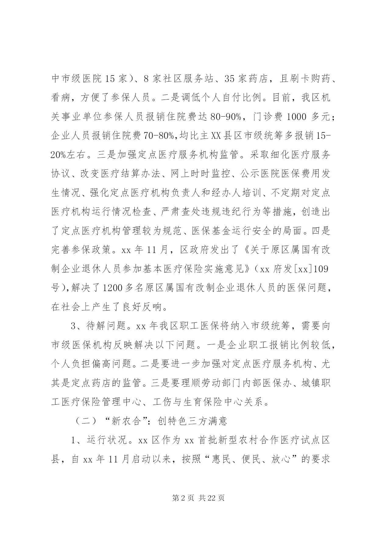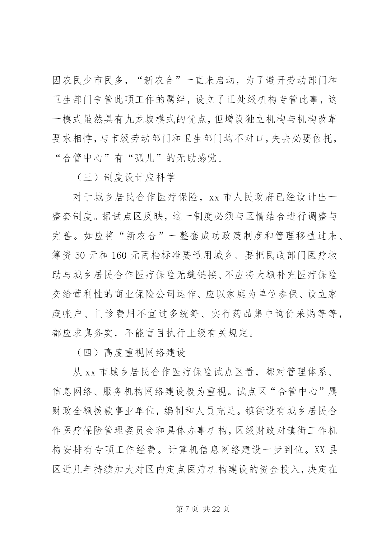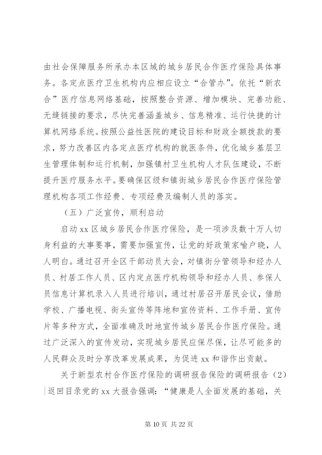 第PAGE\*Arabic\*MERGEFORMAT22页共NUMPAGES\*MERGEFORMAT22页保险的调研报告3篇城乡居民合作医疗保险,是在建设城乡统筹发展的直辖市中xx的伟大创造。xx年9月,xx市人民政府下发了《关于开展城乡居民合作医疗保险试点的指导意见》(渝府发[xx]113号),庚即在九龙坡、南岸、江北、永川、南川5个区开展试点。xx年扩大试点范围后,将在主XX县区全面推开,xx年试点区县达80%以上,xx年在全市建立城乡居民合作医疗保险。根据党的xx大“病有所医”和国家“人人享有基本医疗保障”的目标要求,建立xx区城乡居民合作医疗保险,必须未雨绸缪,抓早抓主动。一、xx区居民基本医疗保险现状(一)城镇职工医保:在完善中成熟1、基本情况。xx区城镇职工医疗保险于xx年4月启动。现有927户国家机关、企事业单位54896人参保。其中,国家机关6253人,事业单位15716人,企业31915人,灵活就业1012人。xx年共筹资7022万元,截止xx年11月底,门诊就诊114510人次,住院就诊4774人次,共支出医疗费4286万元。据了解,xx年1月1日起,我区将纳入xx市主城9区市级城镇职工医疗保险统筹。2、完善成熟。针对城镇职工医保运行初期问题多、参保人员意见大状况,区政府采取了若干切实可行措施予以完善。一是增加医疗服务网点。将xx年只有定点医院40家扩展到46家(其中市级医院15家)、8家社区服务站、35家药店,且刷卡购药、看病,方便了参保人员。二是调低个人自付比例。目前,我区机关事业单位参保人员报销住院费达80-90%,门诊费1000多元;企业人员报销住院费70-80%,均比主XX县区市级统筹多报销15-20%左右。三是加强定点医疗服务机构监管。采取细化医疗服务协议、改变医疗结算办法、网上时时监控、公示医院医保费用发生情况、强化定点医疗机构负责人和经办人培训、不定期对定点医疗机构运行情况检查、严肃查处违规违纪行为等措施,创造出了定点医疗机构管理较为规范、医保基金运行安全的局面。四是完善参保政策。xx年11月,区政府发出了《关于原区属国有改制企业退休人员参加基本医疗保险实施意见》(xx府发[xx]109号),解决了1200多名原区属国有改制企业退休人员的医保问题,在社会上产生了良好反响。3、待解问题。xx年我区职工医保将纳入市级统筹,需要向市级医保机构反映解决以下问题。一是企业职工报销比例较低,个人负担偏高问题。二是要进一步加强对定点医疗服务机构、尤其是定点药店的监管。三是要理顺劳动部门内部医保办、城镇职工医疗保险管理中心、工伤与生育保险中心关系。(二)“新农合”:创特色三方满意1、运行状况。xx区作为xx首批新型农村合作医疗试点区县,自xx年11月启动以来,按照“惠民、便民、放心”的要求扎实工作,xx年,参合农民达到41.4万人,占全区50.1万农业人口的82.6%。xx年参合44万人,参合率达到了87%。xx年筹集“新农合”基金1983.8万元,至11月底,参合农民门诊就诊83233人次,住院就诊16150人次,支出“新农合”基金1536万元。几年来,“新农合”在农民“小病能治、大病有救”方面起到了积极作用,收到了群众得实惠、医院得发展、政府得信誉三方满意的效果。国家卫生部已把xx纳入“未来卫生体系联合研究”国际课题项目单位,并在亚洲地区推广xx经验。2、主要特点。一是强化管理,农民放心。通过建立健全“新农合”监督委员会、年度审计、“四公开”和“一公示”等制度,管好用好了农民的保命钱,农民参合放心。通过加强定点医疗机构的建设和监管,改善农村卫生院医疗环境和条件,规范行为,农民看病放心。二是多措并举,凸显便民。将区外定点医疗机构由原有7家扩大到所有市级公立医院,每个镇街、村均设立定点医疗机构;建立“新农合”计算机管理系统,实行转院网络审批制度;推行参合农民医药报销镇街“全程代理制”,镇街卫生院设置专门报销窗口,有效地解决了参合农民就医难、报销难问题。三是政策优化,惠及农民。农民外出务工符合规定的住院费予以报销,8个慢性病在统筹资金中报销,对住院分娩定额补贴,区内住院费起付线由500元降为100元,住院报销比例提高5-25个百分点,扩大用药目录,门诊实行零门槛,参合农民到任何医疗机构和药店就诊购药的费用均可在家庭帐户中报销,推行单病种医疗费最高限价制,实行大病二次补助制度。通过政策优化,做到用最少的钱办更多的事,确保了农民实惠最大化。四是链接救助,扩大保障。通过制度衔接、医院共用、信息共享、监管统一等措施,“新农合”与民政部门的农村医疗救助实现了无缝链接。这是xx“新农合”的最大亮点,“xx模式”已经叫响全国推向全国。通过民政渠道按个人缴费的10元标准给予农村低保户、五保户和重点