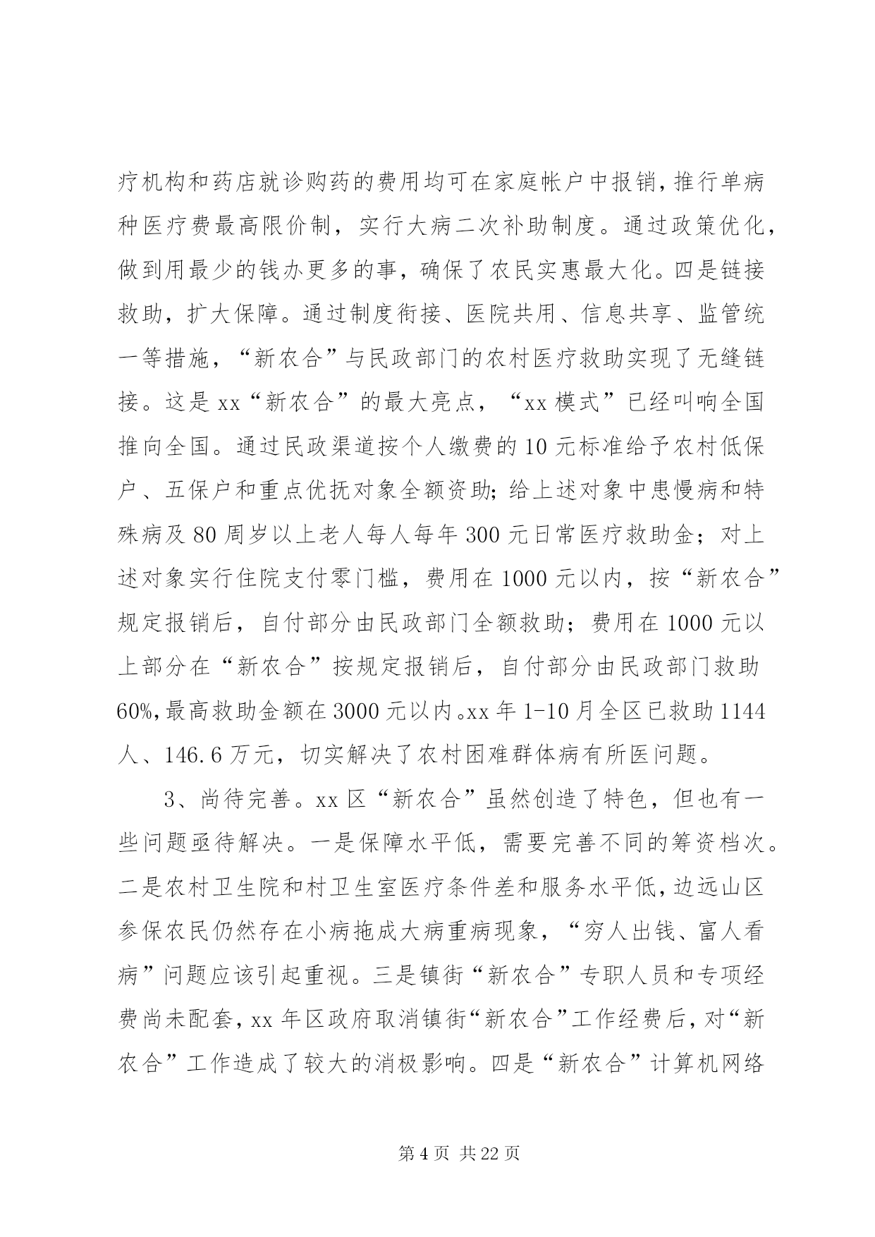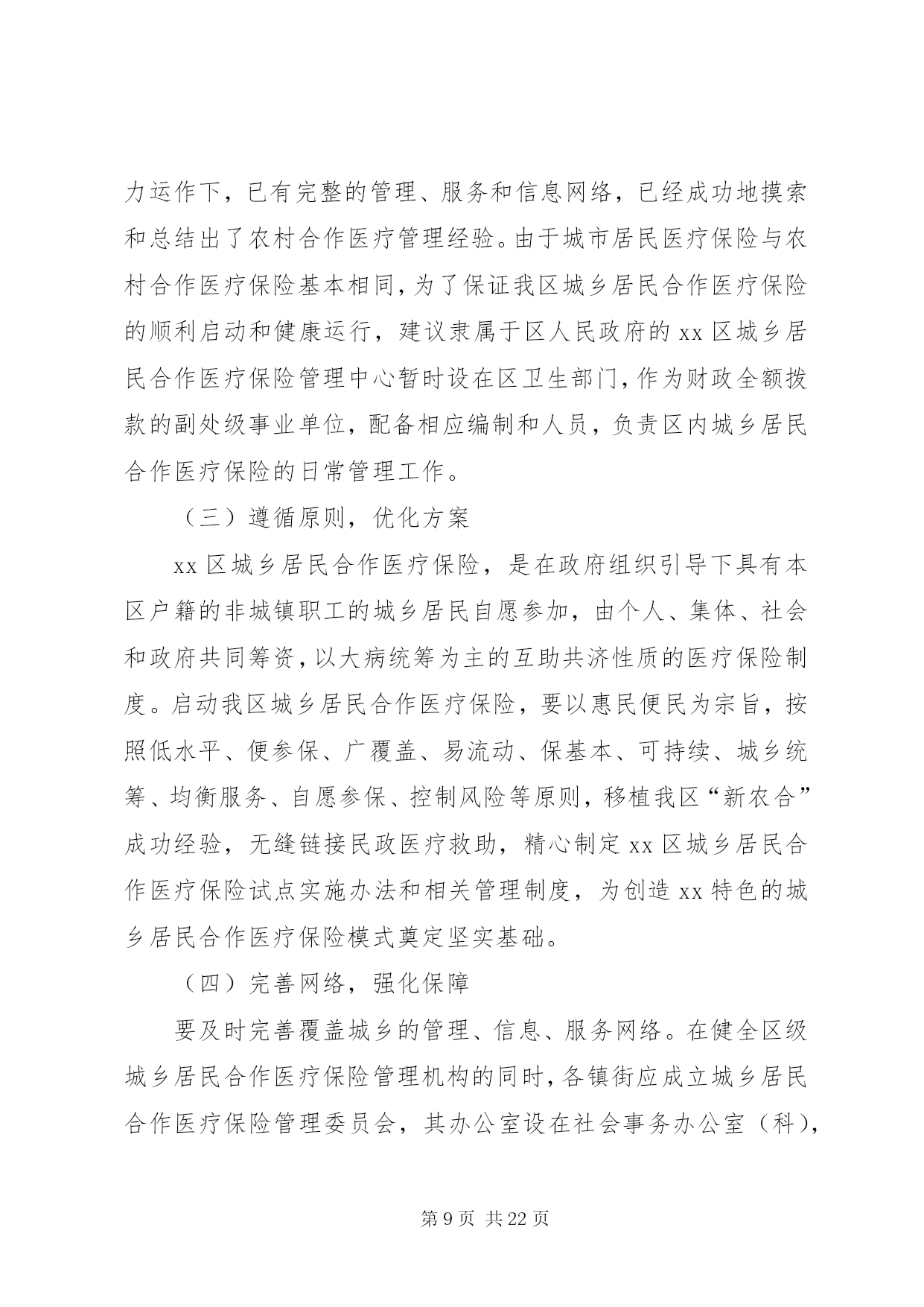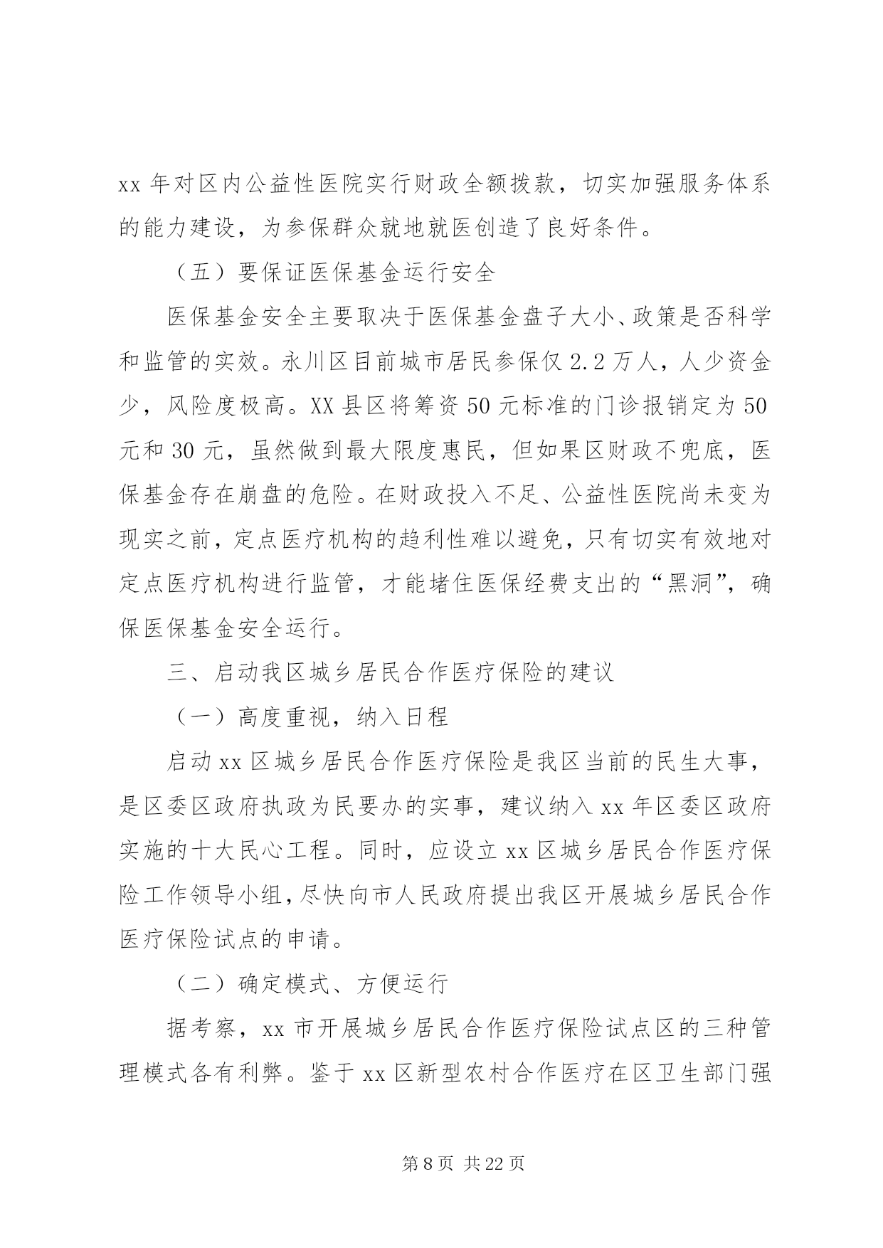 第PAGE\*Arabic\*MERGEFORMAT22页共NUMPAGES\*MERGEFORMAT22页保险的调研报告3篇城乡居民合作医疗保险,是在建设城乡统筹发展的直辖市中xx的伟大创造。xx年9月,xx市人民政府下发了《关于开展城乡居民合作医疗保险试点的指导意见》(渝府发[xx]113号),庚即在九龙坡、南岸、江北、永川、南川5个区开展试点。xx年扩大试点范围后,将在主XX县区全面推开,xx年试点区县达80%以上,xx年在全市建立城乡居民合作医疗保险。根据党的xx大“病有所医”和国家“人人享有基本医疗保障”的目标要求,建立xx区城乡居民合作医疗保险,必须未雨绸缪,抓早抓主动。一、xx区居民基本医疗保险现状(一)城镇职工医保:在完善中成熟1、基本情况。xx区城镇职工医疗保险于xx年4月启动。现有927户国家机关、企事业单位54896人参保。其中,国家机关6253人,事业单位15716人,企业31915人,灵活就业1012人。xx年共筹资7022万元,截止xx年11月底,门诊就诊114510人次,住院就诊4774人次,共支出医疗费4286万元。据了解,xx年1月1日起,我区将纳入xx市主城9区市级城镇职工医疗保险统筹。2、完善成熟。针对城镇职工医保运行初期问题多、参保人员意见大状况,区政府采取了若干切实可行措施予以完善。一是增加医疗服务网点。将xx年只有定点医院40家扩展到46家(其中市级医院15家)、8家社区服务站、35家药店,且刷卡购药、看病,方便了参保人员。二是调低个人自付比例。目前,我区机关事业单位参保人员报销住院费达80-90%,门诊费1000多元;企业人员报销住院费70-80%,均比主XX县区市级统筹多报销15-20%左右。三是加强定点医疗服务机构监管。采取细化医疗服务协议、改变医疗结算办法、网上时时监控、公示医院医保费用发生情况、强化定点医疗机构负责人和经办人培训、不定期对定点医疗机构运行情况检查、严肃查处违规违纪行为等措施,创造出了定点医疗机构管理较为规范、医保基金运行安全的局面。四是完善参保政策。xx年11月,区政府发出了《关于原区属国有改制企业退休人员参加基本医疗保险实施意见》(xx府发[xx]109号),解决了1200多名原区属国有改制企业退休人员的医保问题,在社会上产生了良好反响。3、待解问题。xx年我区职工医保将纳入市级统筹,需要向市级医保机构反映解决以下问题。一是企业职工报销比例较低,个人负担偏高问题。二是要进一步加强对定点医疗服务机构、尤其是定点药店的监管。三是要理顺劳动部门内部医保办、城镇职工医疗保险管理中心、工伤与生育保险中心关系。(二)“新农合”:创特色三方满意1、运行状况。xx区作为xx首批新型农村合作医疗试点区县,自xx年11月启动以来,按照“惠民、便民、放心”的要求扎实工作,xx年,参合农民达到41.4万人,占全区50.1万农业人口的82.6%。xx年参合44万人,参合率达到了87%。xx年筹集“新农合”基金1983.8万元,至11月底,参合农民门诊就诊83233人次,住院就诊16150人次,支出“新农合”基金1536万元。几年来,“新农合”在农民“小病能治、大病有救”方面起到了积极作用,收到了群众得实惠、医院得发展、政府得信誉三方满意的效果。国家卫生部已把xx纳入“未来卫生体系联合研究”国际课题项目单位,并在亚洲地区推广xx经验。2、主要特点。一是强化管理,农民放心。通过建立健全“新农合”监督委员会、年度审计、“四公开”和“一公示”等制度,管好用好了农民的保命钱,农民参合放心。通过加强定点医疗机构的建设和监管,改善农村卫生院医疗环境和条件,规范行为,农民看病放心。二是多措并举,凸显便民。将区外定点医疗机构由原有7家扩大到所有市级公立医院,每个镇街、村均设立定点医疗机构;建立“新农合”计算机管理系统,实行转院网络审批制度;推行参合农民医药报销镇街“全程代理制”,镇街卫生院设置专门报销窗口,有效地解决了参合农民就医难、报销难问题。三是政策优化,惠及农民。农民外出务工符合规定的住院费予以报销,8个慢性病在统筹资金中报销,对住院分娩定额补贴,区内住院费起付线由500元降为100元,住院报销比例提高5-25个百分点,扩大用药目录,门诊实行零门槛,参合农民到任何医疗机构和药店就诊购药的费用均可在家庭帐户中报销,推行单病种医疗费最高限价制,实行大病二次补助制度。通过政策优化,做到用最少的钱办更多的事,确保了农民实惠最大化。四是链接救助,扩大保障。通过制度衔接、医院共用、信息共享、监管统一等措施,“新农合”与民政部门的农村医疗救助实现了无缝链接。这是xx“新农合”的最大亮点,“xx模式”已经叫响全国推向全国。通过民政渠道按个人缴费的10元标准给予农村低保户、五保户和重点