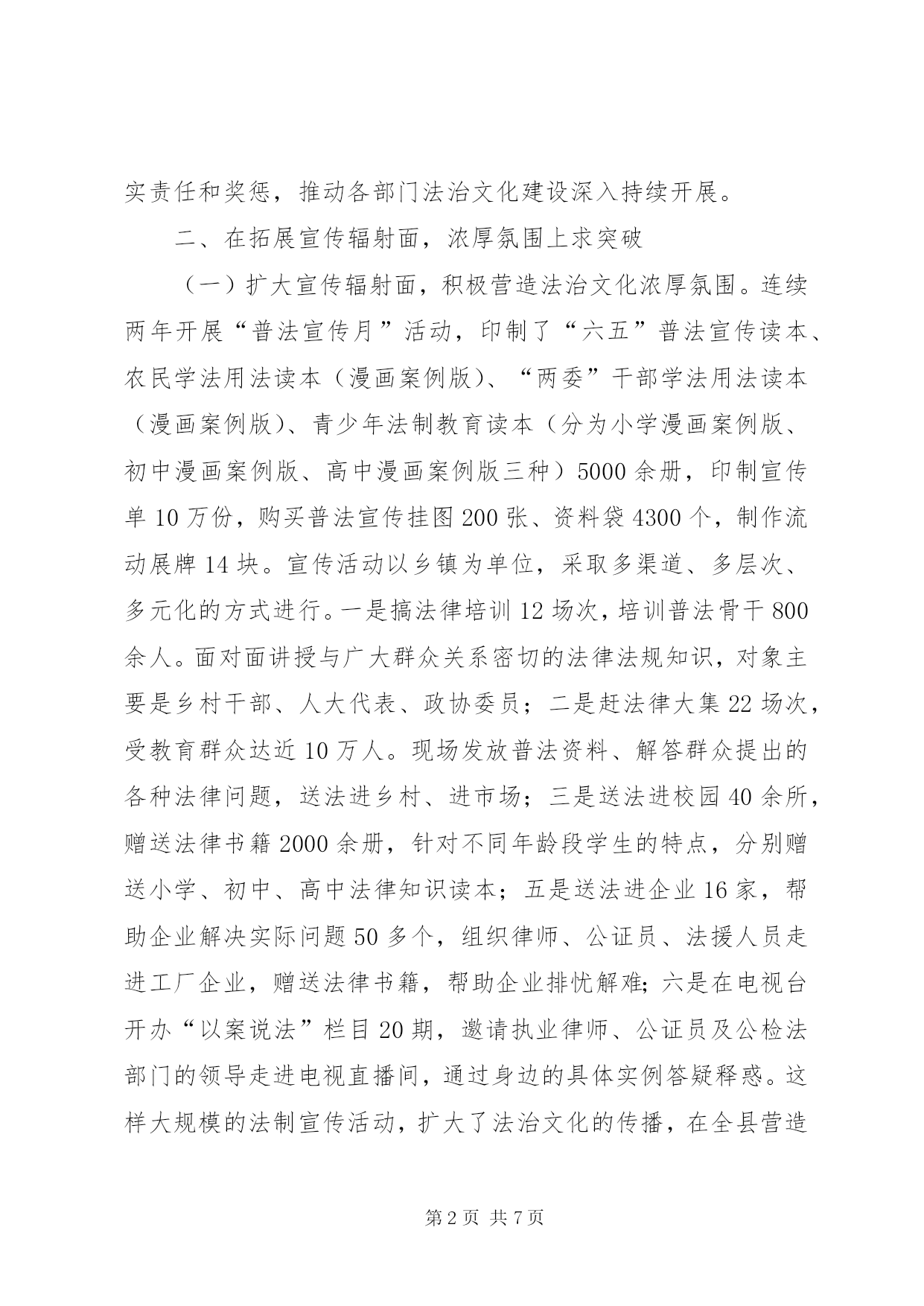 第PAGE\*Arabic\*MERGEFORMAT7页共NUMPAGES\*MERGEFORMAT7页县司法局法治文化建设情况汇报为认真贯彻落实“六五”普法规划,努力推进社会主义法治文化建设,加快建设法治吴桥,在全县营造良好的法治环境,近年来,XX县区司法局认真组织开展了各项法治文化建设工作,倾力打造法治吴桥。一、在增强法治文化建设合力上求突破一是健全组织领导机制。调整充实普法教育领导小组,制定“六五”普法规划,明确工作职责。全县普遍建立由党委政府统一领导,司法行政部门牵头协调,宣传、文化、广电、新闻等单位共同参与、各司其职的领导体制,形成了权责分明、通力协作的工作格局,为全面普及法律知识,推动法治实践提供扎实的组织保障。二是健全协调联动机制。加强与相关部门之间纵横联动,努力解决法治文化建设基础弱、周期长、投入大、见效慢等难点问题,积极探索“企业运营、市场运作、政府购买、百姓受惠”的法治文化建设新模式,加强与文化单位等专业团体之间的内外联动,形成法治文化建设合力。今年来,共召开法治文化部门协调会议5次,征求意见15条。三是完善考核评估机制。完善目标管理考核细则,将法治文化建设列入其中,特别是围绕阵地拓展、活动开展、载体创新等法治文化建设的主要内容,进一步明确考核要求、量化指标,落实责任和奖惩,推动各部门法治文化建设深入持续开展。二、在拓展宣传辐射面,浓厚氛围上求突破(一)扩大宣传辐射面,积极营造法治文化浓厚氛围。连续两年开展“普法宣传月”活动,印制了“六五”普法宣传读本、农民学法用法读本(漫画案例版)、“两委”干部学法用法读本(漫画案例版)、青少年法制教育读本(分为小学漫画案例版、初中漫画案例版、高中漫画案例版三种)5000余册,印制宣传单10万份,购买普法宣传挂图200张、资料袋4300个,制作流动展牌14块。宣传活动以乡镇为单位,采取多渠道、多层次、多元化的方式进行。一是搞法律培训12场次,培训普法骨干800余人。面对面讲授与广大群众关系密切的法律法规知识,对象主要是乡村干部、人大代表、政协委员;二是赶法律大集22场次,受教育群众达近10万人。现场发放普法资料、解答群众提出的各种法律问题,送法进乡村、进市场;三是送法进校园40余所,赠送法律书籍2000余册,针对不同年龄段学生的特点,分别赠送小学、初中、高中法律知识读本;五是送法进企业16家,帮助企业解决实际问题50多个,组织律师、公证员、法援人员走进工厂企业,赠送法律书籍,帮助企业排忧解难;六是在电视台开办“以案说法”栏目20期,邀请执业律师、公证员及公检法部门的领导走进电视直播间,通过身边的具体实例答疑释惑。这样大规模的法制宣传活动,扩大了法治文化的传播,在全县营造了依法办事、依法维权的浓厚法治氛围。(二)以点带面,着力建好法治文化示范点。按照因地制宜、注重实效原则,在于集镇西街创建法治文化广场和“普法走廊”、“普法调解室”。广场设立普法橱窗、村务公开栏、法治墙画等;“普法走廊”向农民展出涉农法律案例,并配以通俗易懂的法律条文讲解,图文并茂,形象生动;“普法调解室”有司法局捐赠的300余册法律书籍,方便周围群众阅览、借阅,同时每天有一名村“两委”成员值班,可以及时解答群众的疑难问题,调解民间纠纷。除此外,还在宋门乡辛镇店村、桑园镇田庄村、县城新兴社区等地设立普法橱窗,结合基层组织建设年和农村面貌改造提升在全县320个村街设立“普法书屋”、绘制“普法墙画”,同时,还利用县城杂技艺术中心广场电子屏,每晚播出带有法制内容的短语、警句和普法口号,极大提高了干部群众及周边村民的法制意识。(三)协调联动,搞好“节点”专场宣传。依托特定节日、纪念日为平台,与相关部门联合,共同开展法治文化活动,近年来在“三八”妇女节联合县妇联开展“三八”妇女维权周活动3场次,每年4月与税务部门联合开展“税法宣传月”活动3场次,在“六一”联合县教育局和学校开展普法手抄报、诗歌朗诵、演讲比赛等活动12场次,在“6.25”全国土地日联合县国土资源局开展图片展览2场次,12.4全国法制宣传日联合各执法部门开展普法宣传活动12场次。三、在丰富法治文化建设内涵上求突破(一)注重把法治文化与机关文化建设结合。结合各单位的办公环境,采取宣传栏、政务公开栏、电子屏等灵活多样的方式,把法治文化融入到机关文化建设之中,让广大干部职工在日常的工作生活中尽享法治文化的熏陶。目前拥有机关宣传栏42处,电子屏15处。(二)注重把法治文化与民俗文化结合。在新农村文化建设中注入法治元素,运用小品、快板、说唱、相声、三句半等形式,把法律知识通俗化,把法律规范直观化,在春节或农闲季节组织法治文艺演出,在丰富群众文化生活的同时,提升农民法律素质,增强法制观念,从而使法治理念深入群众生产生活。近年开展法治文艺演出3