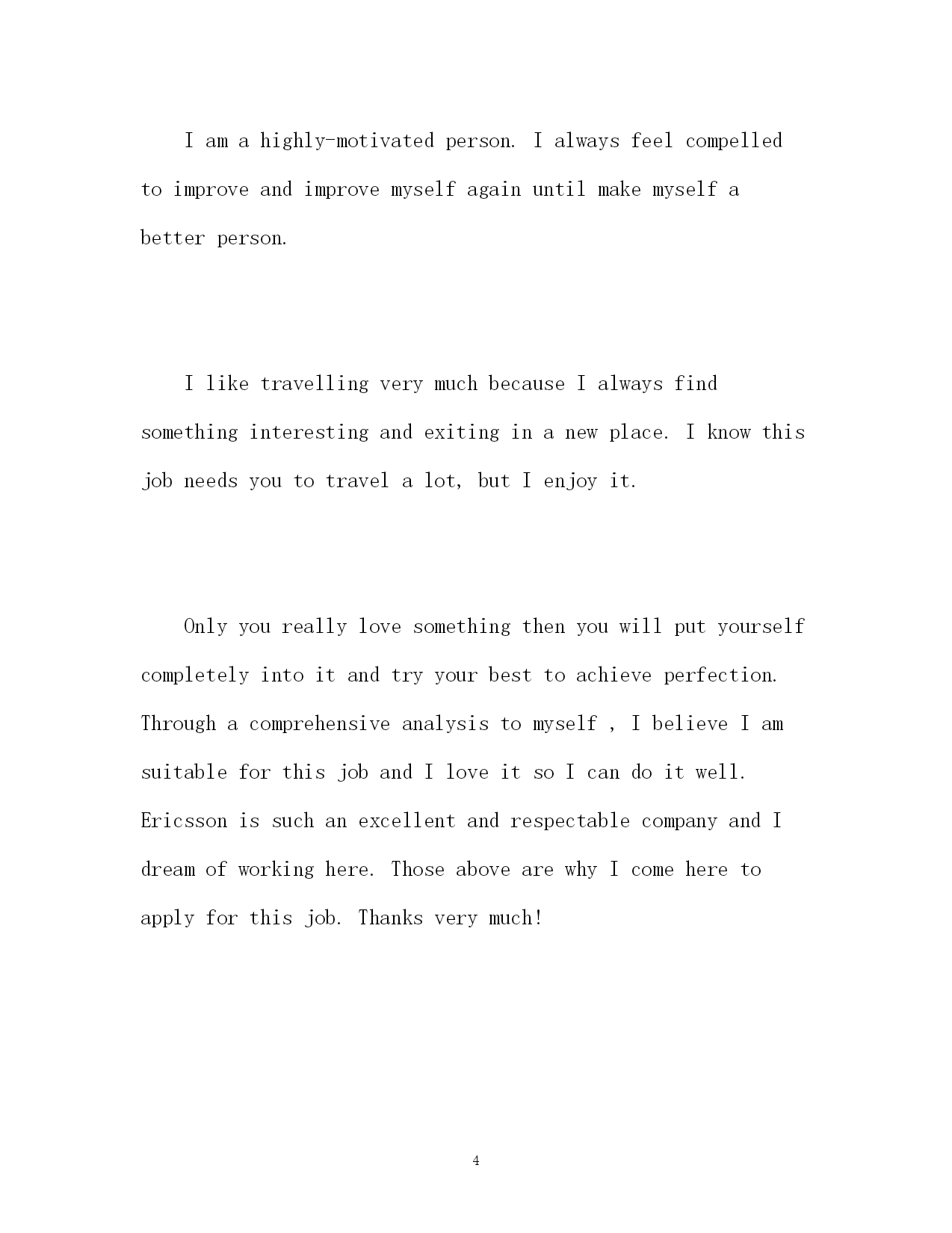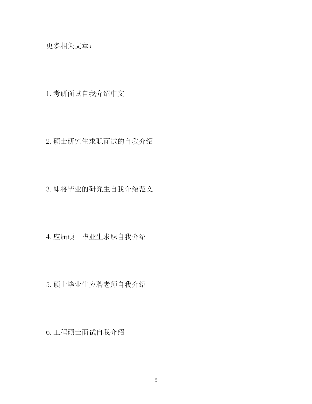 此资料由网络收集而来,如有侵权请告知上传者立即删除。资料共分享,我们负责传递知识。PAGEPAGE6硕士研究生毕业面试自我介绍中英文硕士研究生毕业面试自我介绍范文(中英文)硕士研究生毕业面试自我介绍怎么说?要说些什么?下面小编收集整理了相关的范文做参考!你好,我叫xx,本科和研究生都就读于xx,专业方向是是信息与系统。我的职业理想是成为一名优秀的工程师,所以我选择了xx,选择了我现在的专业。我希望在未来成为这方面的专家。为了实现这个梦想,我特别注重与此相关的专业课程的学习,也取得了很好的成绩。并且在教研室里一年半的时间,我积累许多相关领域经验,也锻炼了自己的实际动手能力,使我更进一步接近我的梦想。在课余时间,我积极参见各种活动,比如歌唱比赛,学校交谊舞会,户外徒步露营,骑自行车旅行,创立研究生英语角……我是一个比较外向的人,喜欢与人交流。同时我是一个有强烈进取心的人,期望每天都能做一个更好的’自己,所以常常找出自己的不足,并且加以改进。我非常喜欢旅行因为我总能在一个新的地方发现有趣和令人兴奋的事情。我知道这份职业需要大量出差,但是我能享受它。我认为一份职业要符合自己的兴趣和性格,能充分发挥自己的特长,这样你才能够以全部的热情投入工作,享受你所从事的事业,获得成功。通过对自己的综合分析,我相信我适合这份职业,热爱这份职业并且能干好它。xx又是如此优秀和受人尊敬的公司,我梦想在这里工作。这就是我来到这里应聘这份工作的原因。谢谢!英文版MynameisJIANGWEI.IspentbothmyundergraduateandpostgraduatetimeinUESTC,majoratInformationandSystem.Idreamofbeinganexcellentengineer,that’sthereasonIchoseUESTCandmypresentmajor.IhopeIwillbeanexpertinthisfield.Toachievethisgoal,Ifocusedonlearningmymajorcourseshardlyandgotgoodmarks.Inthepastoneandahalfyears,Iaccumulatedalotofpracticalprojectexperiencesandskillsinthelab.Thismakesmeapproachmydream.Oncampus,Ijoinedinmanyactivities,suchassingingcontest,danceparty,hike,ridingbicycle,Englishcorner.Iamoutgoingandenjoycommunicatingwithothers.Iamahighly-motivatedperson.Ialwaysfeelcompelledtoimproveandimprovemyselfagainuntilmakemyselfabetterperson.IliketravellingverymuchbecauseIalwaysfindsomethinginterestingandexitinginanewplace.Iknowthisjobneedsyoutotravelalot,butIenjoyit.Onlyyoureallylovesomethingthenyouwillputyourselfcompletelyintoitandtryyourbesttoachieveperfection.Throughacomprehensiveanalysistomyself,IbelieveIamsuitableforthisjobandIloveitsoIcandoitwell.EricssonissuchanexcellentandrespectablecompanyandIdreamofworkinghere.ThoseabovearewhyIcomeheretoapplyforthisjob.Thanksverymuch!更多相关文章:1.考研面试自我介绍中文2.硕士研究生求职面试的自我介绍3.即将毕业的研究生自我介绍范文4.应届硕士毕业生求职自我介绍5.硕士毕业生应聘老师自我介绍6.工程硕士面试自我介绍7.银行面试自我介绍研究生8.IT行业面试自我介绍范文9.经济毕业生面试自我介绍10.音乐学硕士面试的自我介绍