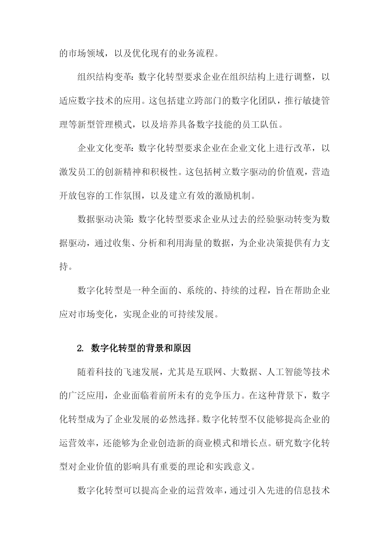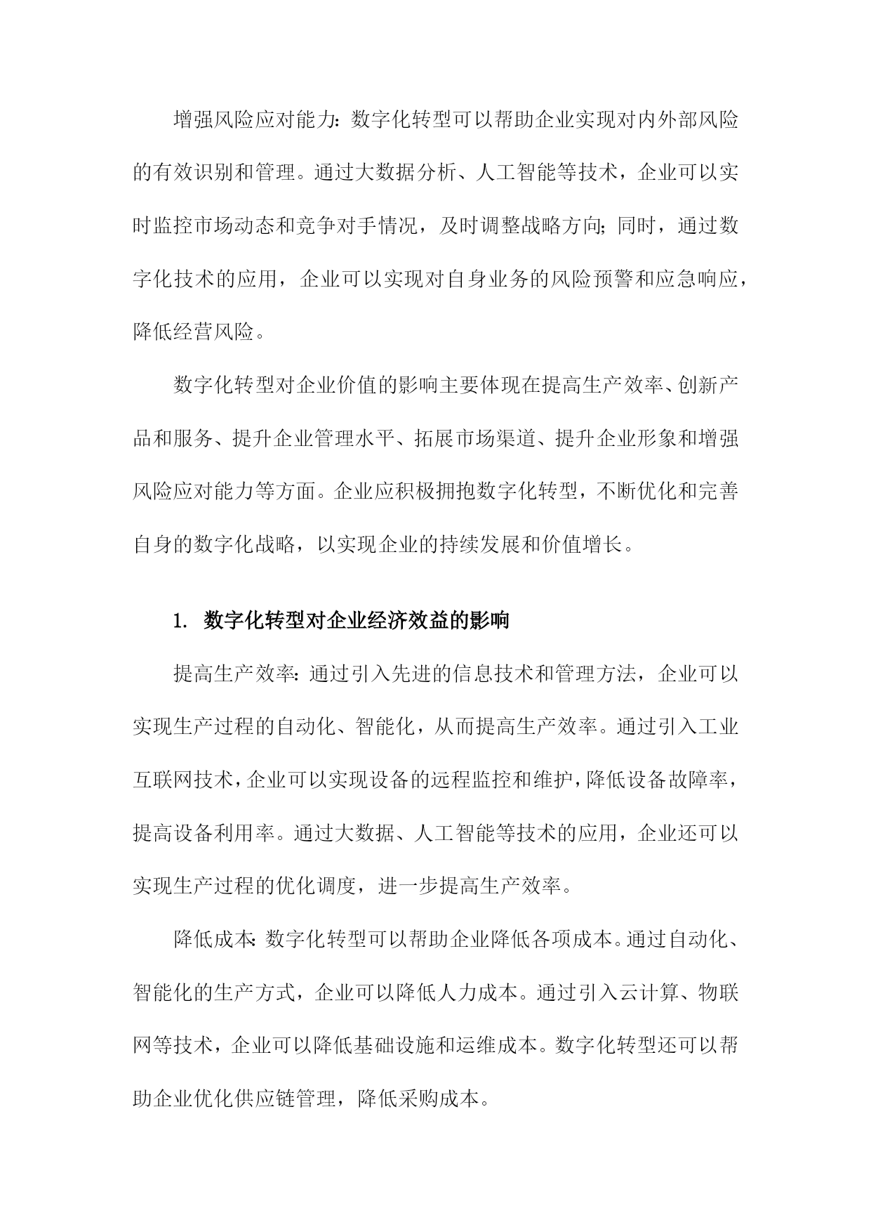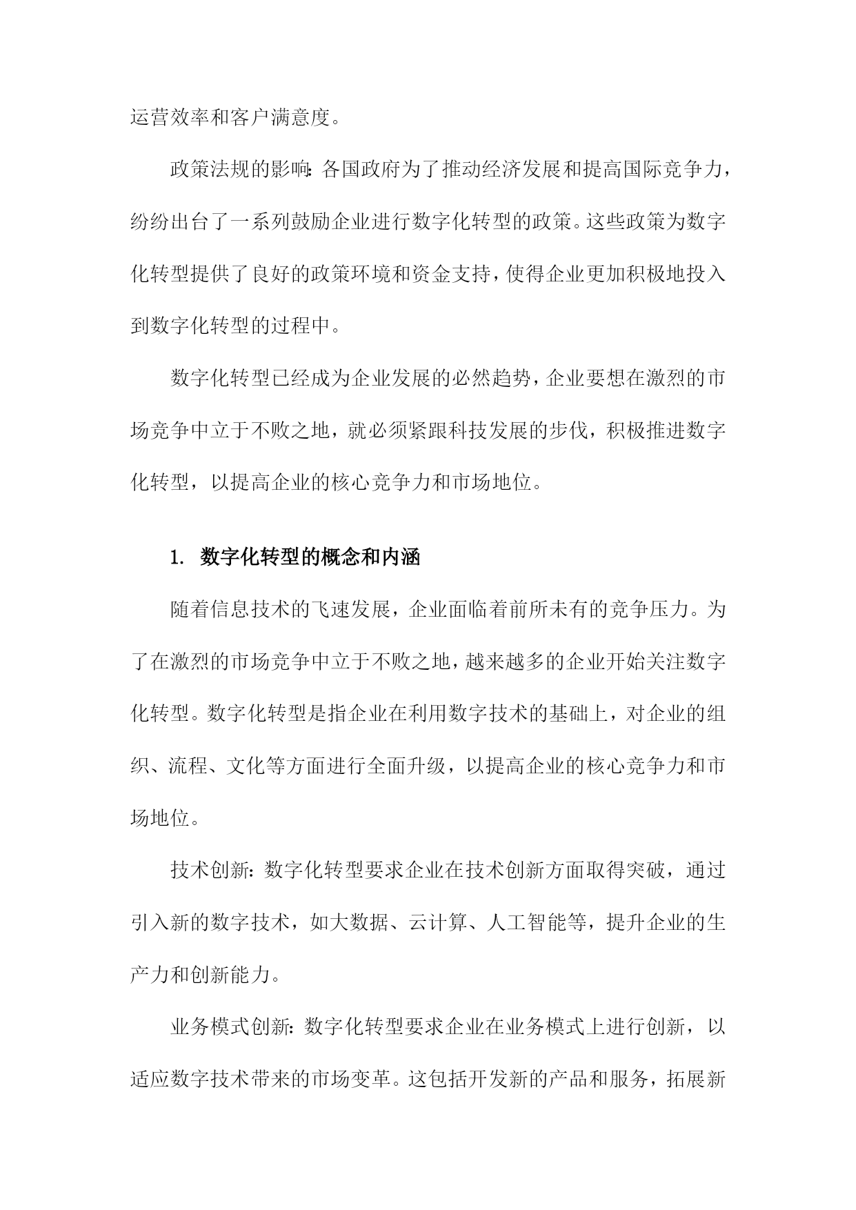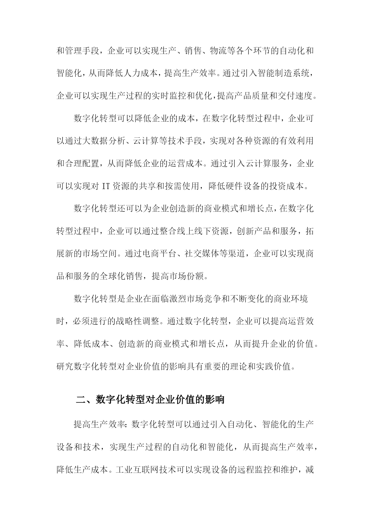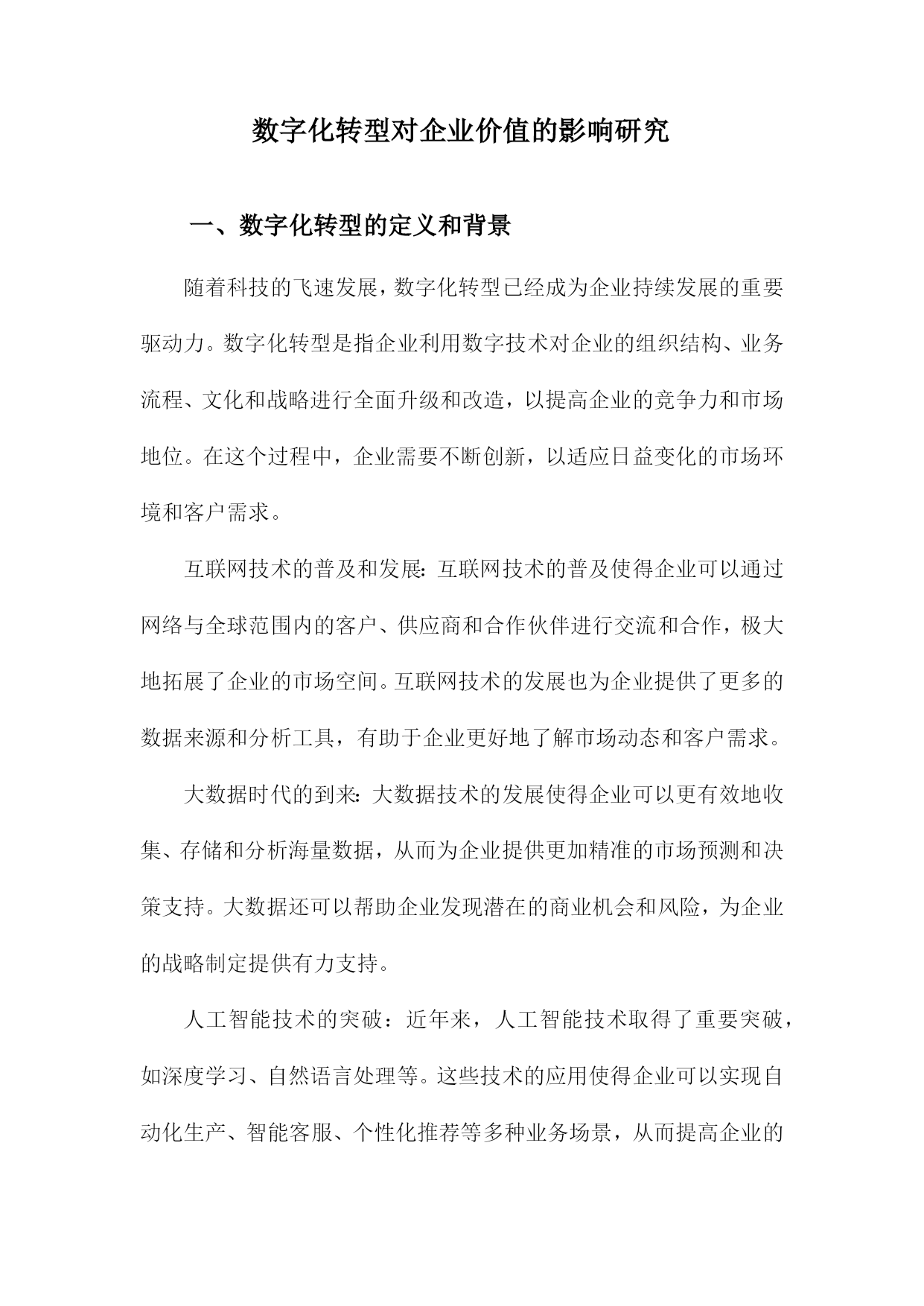 数字化转型对企业价值的影响研究一、数字化转型的定义和背景随着科技的飞速发展,数字化转型已经成为企业持续发展的重要驱动力。数字化转型是指企业利用数字技术对企业的组织结构、业务流程、文化和战略进行全面升级和改造,以提高企业的竞争力和市场地位。在这个过程中,企业需要不断创新,以适应日益变化的市场环境和客户需求。互联网技术的普及和发展:互联网技术的普及使得企业可以通过网络与全球范围内的客户、供应商和合作伙伴进行交流和合作,极大地拓展了企业的市场空间。互联网技术的发展也为企业提供了更多的数据来源和分析工具,有助于企业更好地了解市场动态和客户需求。大数据时代的到来:大数据技术的发展使得企业可以更有效地收集、存储和分析海量数据,从而为企业提供更加精准的市场预测和决策支持。大数据还可以帮助企业发现潜在的商业机会和风险,为企业的战略制定提供有力支持。人工智能技术的突破:近年来,人工智能技术取得了重要突破,如深度学习、自然语言处理等。这些技术的应用使得企业可以实现自动化生产、智能客服、个性化推荐等多种业务场景,从而提高企业的运营效率和客户满意度。政策法规的影响:各国政府为了推动经济发展和提高国际竞争力,纷纷出台了一系列鼓励企业进行数字化转型的政策。这些政策为数字化转型提供了良好的政策环境和资金支持,使得企业更加积极地投入到数字化转型的过程中。数字化转型已经成为企业发展的必然趋势,企业要想在激烈的市场竞争中立于不败之地,就必须紧跟科技发展的步伐,积极推进数字化转型,以提高企业的核心竞争力和市场地位。1.数字化转型的概念和内涵随着信息技术的飞速发展,企业面临着前所未有的竞争压力。为了在激烈的市场竞争中立于不败之地,越来越多的企业开始关注数字化转型。数字化转型是指企业在利用数字技术的基础上,对企业的组织、流程、文化等方面进行全面升级,以提高企业的核心竞争力和市场地位。技术创新:数字化转型要求企业在技术创新方面取得突破,通过引入新的数字技术,如大数据、云计算、人工智能等,提升企业的生产力和创新能力。业务模式创新:数字化转型要求企业在业务模式上进行创新,以适应数字技术带来的市场变革。这包括开发新的产品和服务,拓展新的市场领域,以及优化现有的业务流程。组织结构变革:数字化转型要求企业在组织结构上进行调整,以适应数字技术的应用。这包括建立跨部门的数字化团队,推行敏捷管理等新型管理模式,以及培养具备数字技能的员工队伍。企业文化变革:数字化转型要求企业在企业文化上进行改革,以激发员工的创新精神和积极性。这包括树立数字驱动的价值观,营造开放包容的工作氛围,以及建立有效的激励机制。数据驱动决策:数字化转型要求企业从过去的经验驱动转变为数据驱动,通过收集、分析和利用海量的数据,为企业决策提供有力支持。数字化转型是一种全面的、系统的、持续的过程,旨在帮助企业应对市场变化,实现企业的可持续发展。2.数字化转型的背景和原因随着科技的飞速发展,尤其是互联网、大数据、人工智能等技术的广泛应用,企业面临着前所未有的竞争压力。在这种背景下,数字化转型成为了企业发展的必然选择。数字化转型不仅能够提高企业的运营效率,还能够为企业创造新的商业模式和增长点。研究数字化转型对企业价值的影响具有重要的理论和实践意义。数字化转型可以提高企业的运营效率,通过引入先进的信息技术和管理手段,企业可以实现生产、销售、物流等各个环节的自动化和智能化,从而降低人力成本,提高生产效率。通过引入智能制造系统,企业可以实现生产过程的实时监控和优化,提高产品质量和交付速度。数字化转型可以降低企业的成本,在数字化转型过程中,企业可以通过大数据分析、云计算等技术手段,实现对各种资源的有效利用和合理配置,从而降低企业的运营成本。通过引入云计算服务,企业可以实现对IT资源的共享和按需使用,降低硬件设备的投资成本。数字化转型还可以为企业创造新的商业模式和增长点,在数字化转型过程中,企业可以通过整合线上线下资源,创新产品和服务,拓展新的市场空间。通过电商平台、社交媒体等渠道,企业可以实现商品和服务的全球化销售,提高市场份额。数字化转型是企业在面临激烈市场竞争和不断变化的商业环境时,必须进行的战略性调整。通过数字化转型,企业可以提高运营效率、降低成本、创造新的商业模式和增长点,从而提升企业的价值。研究数字化转型对企业价值的影响具有重要的理论和实践价值。二、数字化转型对企业价值的影响提高生产效率:数字化转型可以通过引入自动化、智能化的生产设备和技术,实现生产过程的自动化和智能化,从而提高生产效率,降低生产成本。工业互联网技术可以实现设备的远程监控和维护,减少故障率,提高设备的运行效率。数字化转型还可以帮助企业实现生产计划的优化,提高资源利用率,进一步降低生产成本。创新产品和服务:数字化