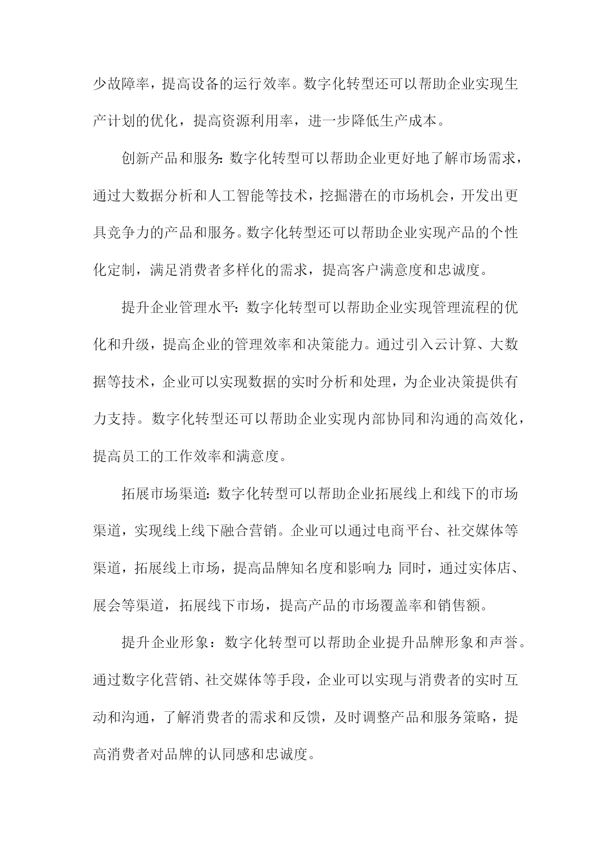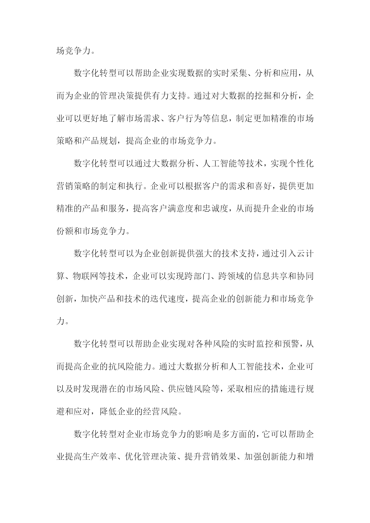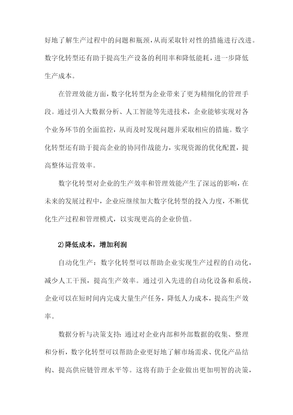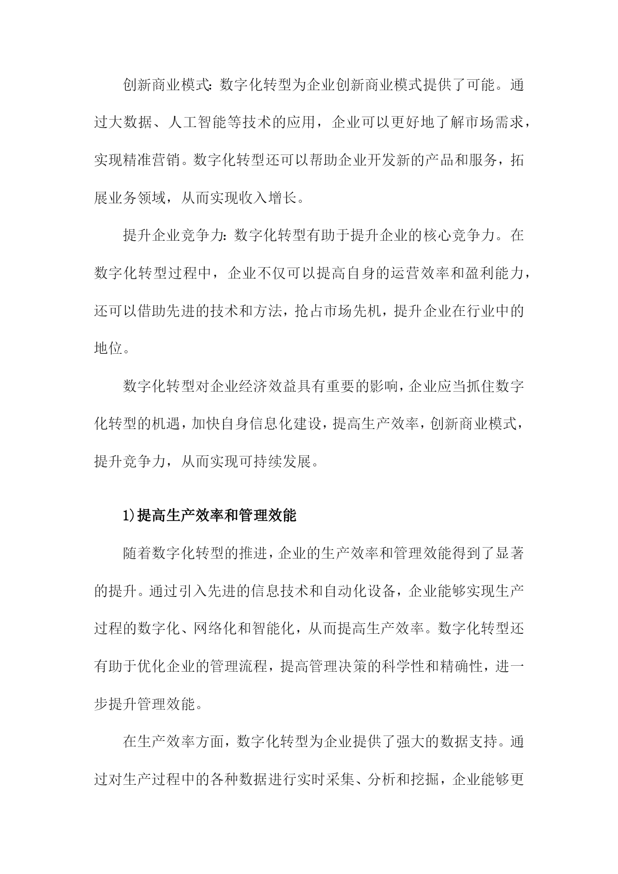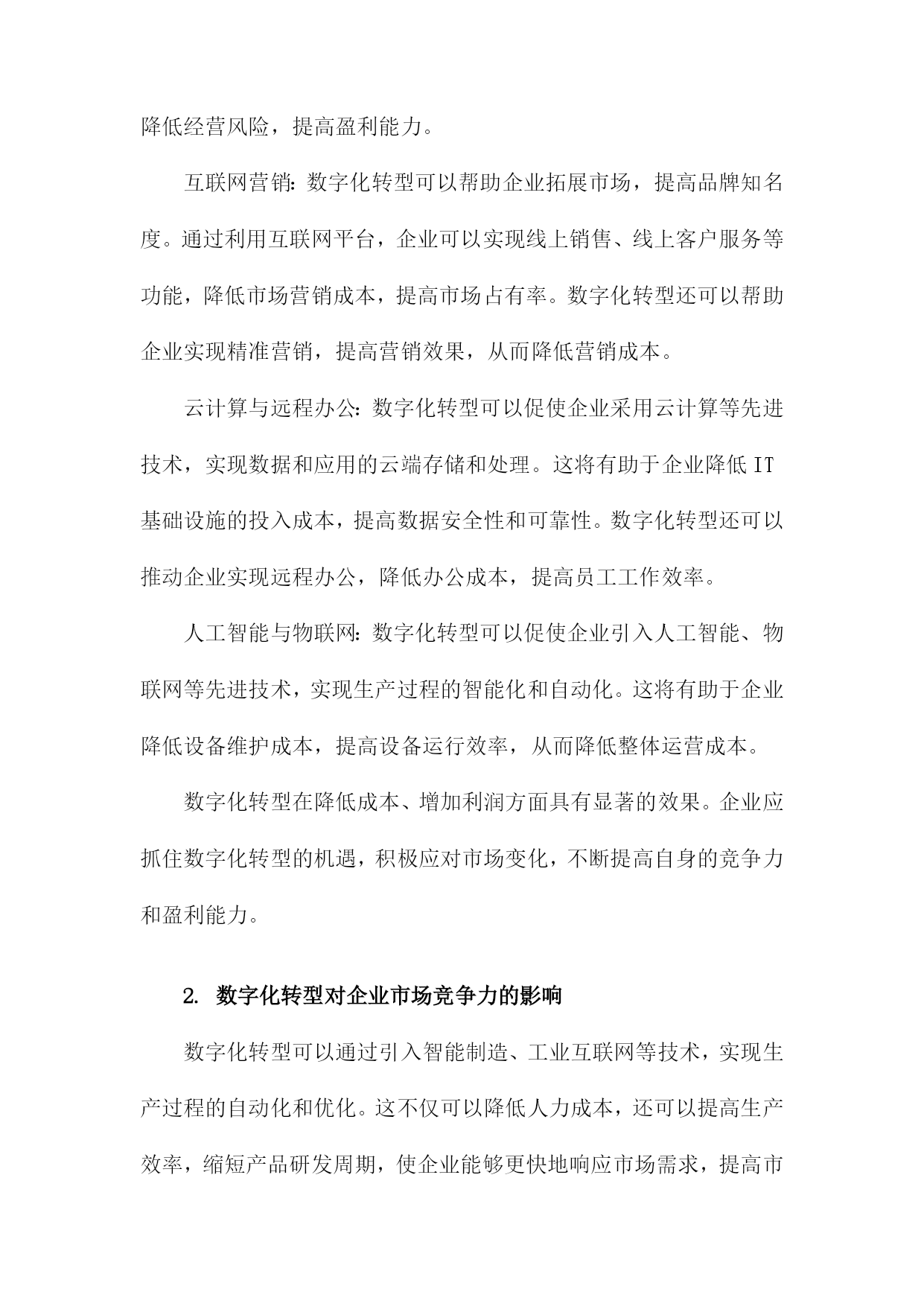 数字化转型对企业价值的影响研究一、数字化转型的定义和背景随着科技的飞速发展,数字化转型已经成为企业持续发展的重要驱动力。数字化转型是指企业利用数字技术对企业的组织结构、业务流程、文化和战略进行全面升级和改造,以提高企业的竞争力和市场地位。在这个过程中,企业需要不断创新,以适应日益变化的市场环境和客户需求。互联网技术的普及和发展:互联网技术的普及使得企业可以通过网络与全球范围内的客户、供应商和合作伙伴进行交流和合作,极大地拓展了企业的市场空间。互联网技术的发展也为企业提供了更多的数据来源和分析工具,有助于企业更好地了解市场动态和客户需求。大数据时代的到来:大数据技术的发展使得企业可以更有效地收集、存储和分析海量数据,从而为企业提供更加精准的市场预测和决策支持。大数据还可以帮助企业发现潜在的商业机会和风险,为企业的战略制定提供有力支持。人工智能技术的突破:近年来,人工智能技术取得了重要突破,如深度学习、自然语言处理等。这些技术的应用使得企业可以实现自动化生产、智能客服、个性化推荐等多种业务场景,从而提高企业的运营效率和客户满意度。政策法规的影响:各国政府为了推动经济发展和提高国际竞争力,纷纷出台了一系列鼓励企业进行数字化转型的政策。这些政策为数字化转型提供了良好的政策环境和资金支持,使得企业更加积极地投入到数字化转型的过程中。数字化转型已经成为企业发展的必然趋势,企业要想在激烈的市场竞争中立于不败之地,就必须紧跟科技发展的步伐,积极推进数字化转型,以提高企业的核心竞争力和市场地位。1.数字化转型的概念和内涵随着信息技术的飞速发展,企业面临着前所未有的竞争压力。为了在激烈的市场竞争中立于不败之地,越来越多的企业开始关注数字化转型。数字化转型是指企业在利用数字技术的基础上,对企业的组织、流程、文化等方面进行全面升级,以提高企业的核心竞争力和市场地位。技术创新:数字化转型要求企业在技术创新方面取得突破,通过引入新的数字技术,如大数据、云计算、人工智能等,提升企业的生产力和创新能力。业务模式创新:数字化转型要求企业在业务模式上进行创新,以适应数字技术带来的市场变革。这包括开发新的产品和服务,拓展新的市场领域,以及优化现有的业务流程。组织结构变革:数字化转型要求企业在组织结构上进行调整,以适应数字技术的应用。这包括建立跨部门的数字化团队,推行敏捷管理等新型管理模式,以及培养具备数字技能的员工队伍。企业文化变革:数字化转型要求企业在企业文化上进行改革,以激发员工的创新精神和积极性。这包括树立数字驱动的价值观,营造开放包容的工作氛围,以及建立有效的激励机制。数据驱动决策:数字化转型要求企业从过去的经验驱动转变为数据驱动,通过收集、分析和利用海量的数据,为企业决策提供有力支持。数字化转型是一种全面的、系统的、持续的过程,旨在帮助企业应对市场变化,实现企业的可持续发展。2.数字化转型的背景和原因随着科技的飞速发展,尤其是互联网、大数据、人工智能等技术的广泛应用,企业面临着前所未有的竞争压力。在这种背景下,数字化转型成为了企业发展的必然选择。数字化转型不仅能够提高企业的运营效率,还能够为企业创造新的商业模式和增长点。研究数字化转型对企业价值的影响具有重要的理论和实践意义。数字化转型可以提高企业的运营效率,通过引入先进的信息技术和管理手段,企业可以实现生产、销售、物流等各个环节的自动化和智能化,从而降低人力成本,提高生产效率。通过引入智能制造系统,企业可以实现生产过程的实时监控和优化,提高产品质量和交付速度。数字化转型可以降低企业的成本,在数字化转型过程中,企业可以通过大数据分析、云计算等技术手段,实现对各种资源的有效利用和合理配置,从而降低企业的运营成本。通过引入云计算服务,企业可以实现对IT资源的共享和按需使用,降低硬件设备的投资成本。数字化转型还可以为企业创造新的商业模式和增长点,在数字化转型过程中,企业可以通过整合线上线下资源,创新产品和服务,拓展新的市场空间。通过电商平台、社交媒体等渠道,企业可以实现商品和服务的全球化销售,提高市场份额。数字化转型是企业在面临激烈市场竞争和不断变化的商业环境时,必须进行的战略性调整。通过数字化转型,企业可以提高运营效率、降低成本、创造新的商业模式和增长点,从而提升企业的价值。研究数字化转型对企业价值的影响具有重要的理论和实践价值。二、数字化转型对企业价值的影响提高生产效率:数字化转型可以通过引入自动化、智能化的生产设备和技术,实现生产过程的自动化和智能化,从而提高生产效率,降低生产成本。工业互联网技术可以实现设备的远程监控和维护,减少故障率,提高设备的运行效率。数字化转型还可以帮助企业实现生产计划的优化,提高资源利用率,进一步降低生产成本。创新产品和服务:数字化