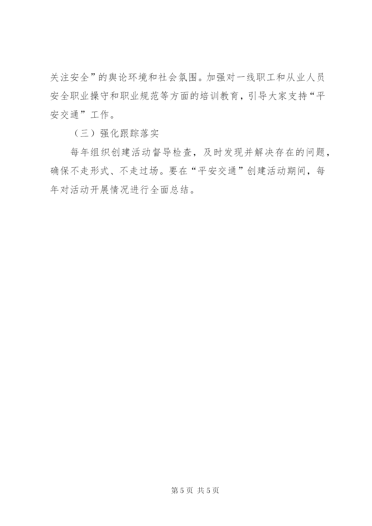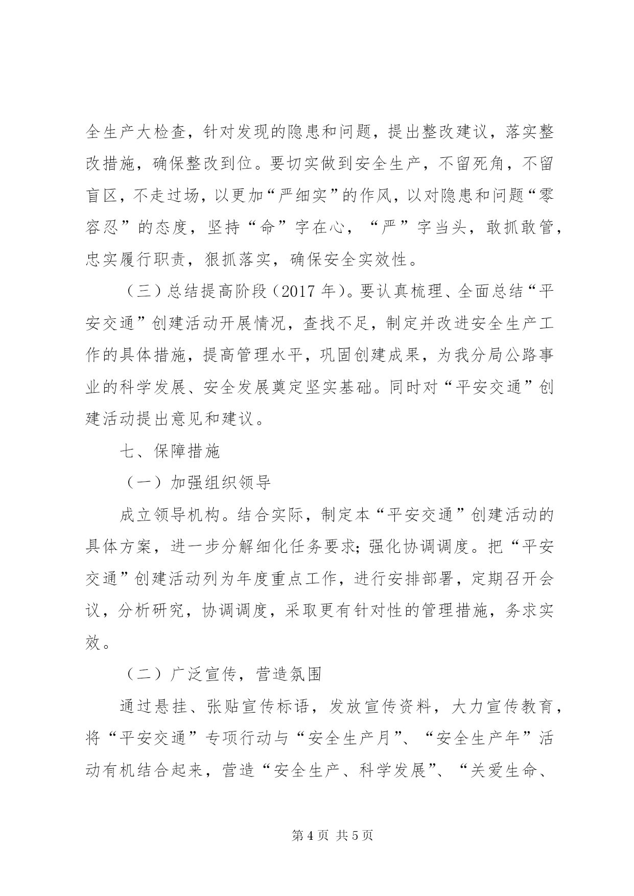 第PAGE\*Arabic\*MERGEFORMAT5页共NUMPAGES\*MERGEFORMAT5页平安交通创建活动方案为扎实开展“平安交通”创建活动,实现我分局公路行业安全生产形式持续稳定,根据《市公路管理局关于印发“平安交通”创建活动实施方案的通知》文件精神,分局结合行业实际制定本方案。一、指导思想深入贯彻落实科学发展观,坚持“安全第一,预防为主,综合治理”方针,牢固树立以人为本、安全发展的理念,全面组织实施“平安交通”创建活动,动员全体职工、从业人员积极参与,努力营造创建氛围,形成创建合力,取得创建成效,促进我分局公路行业安全生产形势持续稳定,全力推进我分局公路事业科学、安全、快速发展。二、总体目标进一步完善安全生产规章制度,进一步提高安全生产保障能力,进一步提升安全生产队伍素质,进一步加强安全生产长效机制,进一步完善安全生产应急预案,确保以安全生产为重点,以安全生产零事故为目标,规范养护及施工作业安全,严查违规、违章施工作业行为,确保我分局公路事业安全生产形式持续稳定。三、活动主体平安交通,人人有责。四、组织机构为确保活动扎实有效开展,分局成立了“平安交通”创建活动领导小组,领导小组下设办公室,办公室设在分局养护科,负责组织协调开展分局“平安交通”创建活动。五、重点工作围绕创建“平安公路”,开展系列活动以“平安交通”创建为载体,全面提高普通公路安全保障水平。不断完善安保工程实施内容,进一步加强公路安保工程建设,对临崖、急弯陡坡等事故易发路段严格按照施工作业标准设置安全防护设施。加大危桥监控、改造力度,确保桥梁使用安全。强化治理车辆超载工作,在路面和道路货运装载源头进一步采取有效措施加强路政执法力度。对四、五类危桥设置限载限速标志,对已经纳入计划并进行改造桥梁采取禁止通行,确保桥梁安全运营和人民生命财产安全。一是强化安全隐患排查治理,实现安全隐患排查治理常态化。根据季节特点,在入汛前的4月份和入冬前的10月份组织开展桥梁、危险灾害路段的全面排查治理,并从养护生产、路政巡查方面,及时形成道路安全通行条件评价报告。组织对重点路段进行灾害风险评估,合理确定灾害风险处置方案,切实提高抗灾能力。加强桥隧经常及定期检查,做好长大桥梁隧道监测工作,落实日常养管责任,及时维护安全设施,确保公路安全通行。二是严格落实《公路法》、《公路安全保护条例》,加大路政执法和公路保护工作力度,继续深入开展公路治超专项活动,完善治超长效机制,控制超限超载率,确保公路桥梁安全。三是建立和完善公路应急体制,进一步完善应急预案体系,建立健全应急保障体系,完善以公路养护管理部门、路政管理部门、公路养护工程施工部门为主体的公路交通应急保障队伍,提升应急保障能力。四是大力开展“平安工地”活动。不断完善公路工程安全监管和安全管理,加强对建设、施工、监理等各个环节的安全监督。开展施工作业现场规范为重点的专项治理行动,加大公路施工标准化建设力度,逐步做到施工现场安全防护标准化、场容场貌规范化、安全管理程序化,建平安工程。六、方法步骤“平安交通”创建活动自2013年起至2017年底,分三个阶段。(一)发动实施阶段(2013年)。按照市局的部署要求,结合本部门职能开展“平安交通”创建活动实施方案,健全组织机构,明确目标任务,细化措施要求,做到周密部署,层层动员,广泛宣传,坚持分局每月至少1次安全学习、每季一次安全调度会,营造浓厚氛围,将安全工作列入各队月度、年终评检考核目标,实行一票否决权。(二)推进突破阶段(2014年-2016年)。坚持每年的安全月(年)活动,强化安全隐患排查治理,根据季节特点,做好安全生产大检查,针对发现的隐患和问题,提出整改建议,落实整改措施,确保整改到位。要切实做到安全生产,不留死角,不留盲区,不走过场,以更加“严细实”的作风,以对隐患和问题“零容忍”的态度,坚持“命”字在心,“严”字当头,敢抓敢管,忠实履行职责,狠抓落实,确保安全实效性。(三)总结提高阶段(2017年)。要认真梳理、全面总结“平安交通”创建活动开展情况,查找不足,制定并改进安全生产工作的具体措施,提高管理水平,巩固创建成果,为我分局公路事业的科学发展、安全发展奠定坚实基础。同时对“平安交通”创建活动提出意见和建议。七、保障措施(一)加强组织领导成立领导机构。结合实际,制定本“平安交通”创建活动的具体方案,进一步分解细化任务要求;强化协调调度。把“平安交通”创建活动列为年度重点工作,进行安排部署,定期召开会议,分析研究,协调调度,采取更有针对性的管理措施,务求实效。(二)广泛宣传,营造氛围通过悬挂、张贴宣传标语,发放宣传资料,大力宣传教育,将“平安交通”专项行动与“安全生产月”、“安全生产年”活动有机结合起来,营造“安全生产、科学发展”、“关爱生命、关