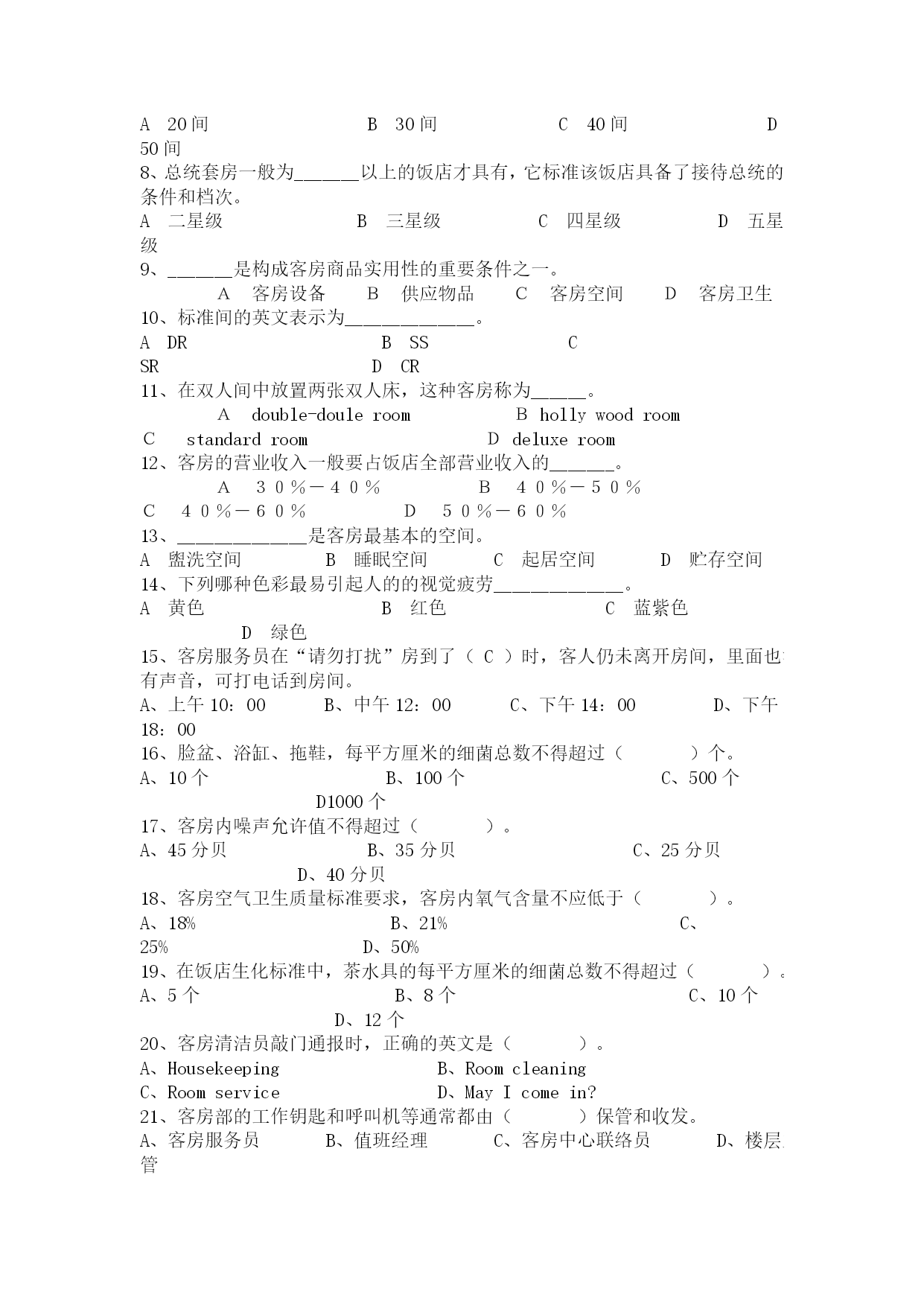 旅游专业练习一、单选1.()一般位于饭店前台的中央,是饭店的一个形象所在。A.接待处B.大堂副理处C.电梯D.行李处2.订房核对工作一般分三次进行,其中最后一次为()。A.一月前B.一周前C.三天前D.一天前3.一日三餐全包的计价方法是()。A.欧式计价B.美式计价C.欧陆式计价D.修正美式计价4.大厅休息处要随时清理,保证烟缸内不能积()以上的烟头。A.一个B.两个C.三个D.四个5.按国际惯例,由于饭店方面原因造成的衣物缺损,赔偿金额一般以洗涤费用的()为限。A.5倍B.10倍C.15倍D.20倍6、_____是客房的基础。A客房空间B客房设备C供应物品D客房卫生7、三星级饭店客房至少有______________间可供出租的客房。A20间B30间C40间D50间8、总统套房一般为_______以上的饭店才具有,它标准该饭店具备了接待总统的条件和档次。A二星级B三星级C四星级D五星级9、_______是构成客房商品实用性的重要条件之一。A客房设备B供应物品C客房空间D客房卫生10、标准间的英文表示为______________。ADRBSSCSRDCR11、在双人间中放置两张双人床,这种客房称为______。Adouble-douleroomBhollywoodroomCstandardroomDdeluxeroom12、客房的营业收入一般要占饭店全部营业收入的_______。A30%-40%B40%-50%C40%-60%D50%-60%13、______________是客房最基本的空间。A盥洗空间B睡眠空间C起居空间D贮存空间14、下列哪种色彩最易引起人的的视觉疲劳______________。A黄色B红色C蓝紫色D绿色15、客房服务员在“请勿打扰”房到了(C)时,客人仍未离开房间,里面也没有声音,可打电话到房间。A、上午10:00B、中午12:00C、下午14:00D、下午18:0016、脸盆、浴缸、拖鞋,每平方厘米的细菌总数不得超过()个。A、10个B、100个C、500个D1000个17、客房内噪声允许值不得超过()。A、45分贝B、35分贝C、25分贝D、40分贝18、客房空气卫生质量标准要求,客房内氧气含量不应低于()。A、18%B、21%C、25%D、50%19、在饭店生化标准中,茶水具的每平方厘米的细菌总数不得超过()。A、5个B、8个C、10个D、12个20、客房清洁员敲门通报时,正确的英文是()。A、HousekeepingB、RoomcleaningC、RoomserviceD、MayIcomein?21、客房部的工作钥匙和呼叫机等通常都由()保管和收发。A、客房服务员B、值班经理C、客房中心联络员D、楼层主管22、放在房务工作车的最下格的是()。A、床单、枕套B、五大巾C、香皂、浴帽D、杯具23、房态标记为OCC的是指()。A、住客房B、走客房C、维修房D、空房24、“准备退房”的房态,表示该客房住客应于当天()退房,但现在还没有退。A、下午6:00以前B、上午8:00以前C、中午12:00以前D、凌晨0:00以前25、在考虑客房打扫顺序时,正确的做法是()。A、请即打扫房、空房、VIP房间B、请即打扫房、VIP房间、空房C、VIP房间、请即打扫房、空房D、VIP房间、空房、请即打扫房26、客房的清洁整理又称()。A、做床B、做房C、做夜床D、开夜床27、在擦拭和检查卫生间、卧室的设备用品的路线上,应采用()客房清扫法进行。A、从上到下B、从里到外C、环形清理D、先卧室后卫生间28、在清洁住客房时,一般应按照()顺序清洁。A、与清洁走客房相同B、先卫生间后卧室C、与清洁空房相同D、先卧室后卫生间29、服务员被客人叫进客房时,房门应该怎么办?()A、应该随手关门B、让房门半掩C、让房门完全打开D、听从客人的指示30、擦拭()时,应用干布,切勿用湿布抹尘。A、行李架B、梳妆镜C、台灯和镜灯D、写字台31、清洁卫生间金属件时,注意不要使用(),以免“烧坏”电镀表层。A、酸性清洁剂B、中性清洁剂C、碱性清洁剂D、抛光剂32、卫生间消毒后要紧闭门窗约()小时,然后进行房间通风。A、1B、1·5C、2D、半个33、整理好的卫生间的浴帘应()。A、全部收紧B、全部拉开C、拉出1/2D、拉出1/334、夜床服务中,遇到双人房住一人时,应该()。A、开靠近浴室的床B、开靠近窗户的床C、两张床都开D、任意开一张35、空房整理时要将浴缸、脸盆的冷热水及恭桶的水放流()分钟。A、1~2分钟B、4分钟C、5~7分钟D、半分钟36、夜床服务通常在