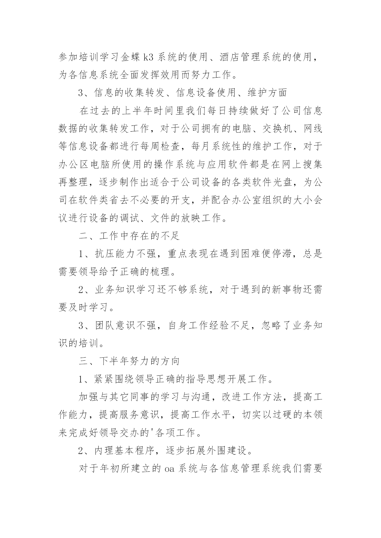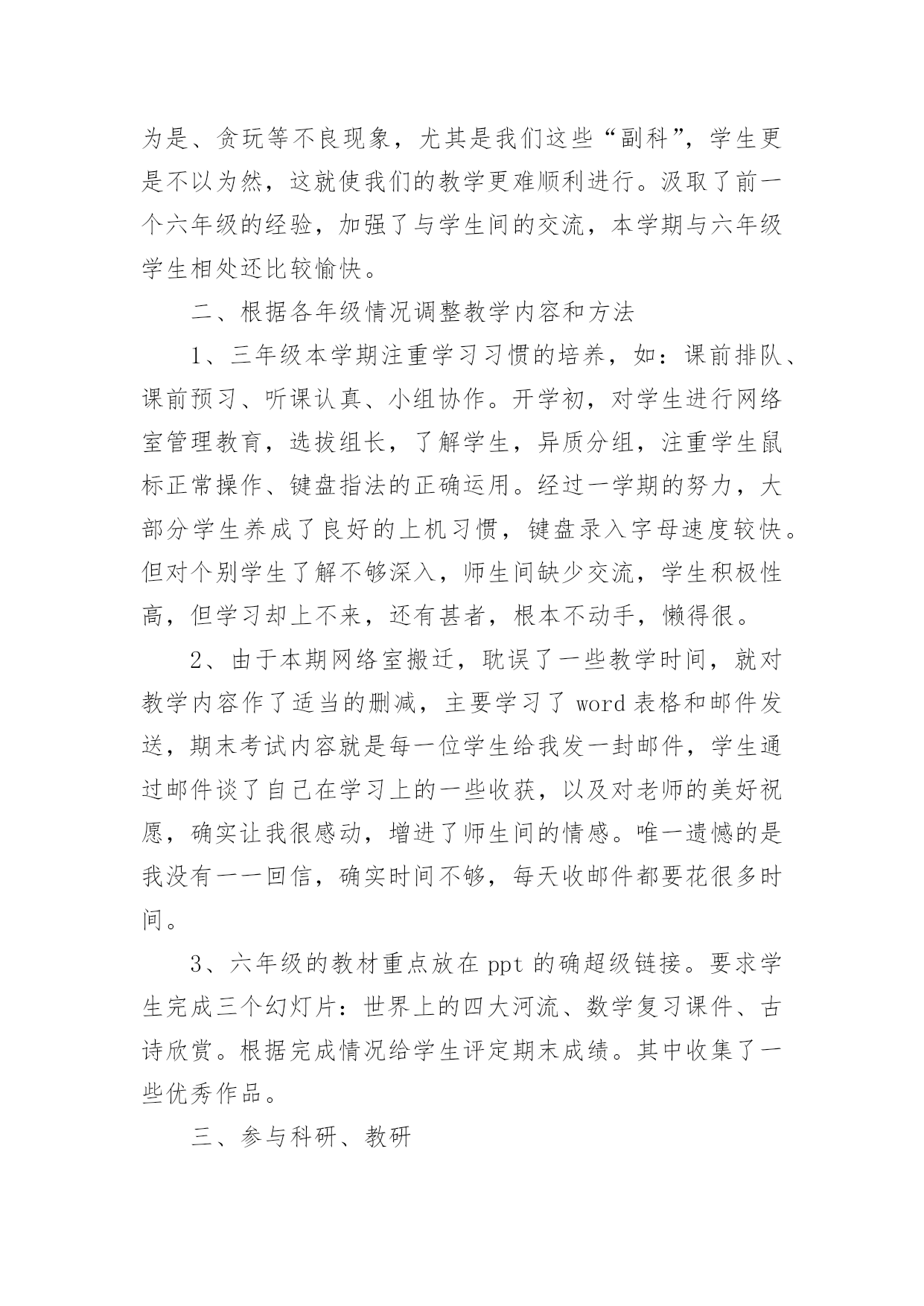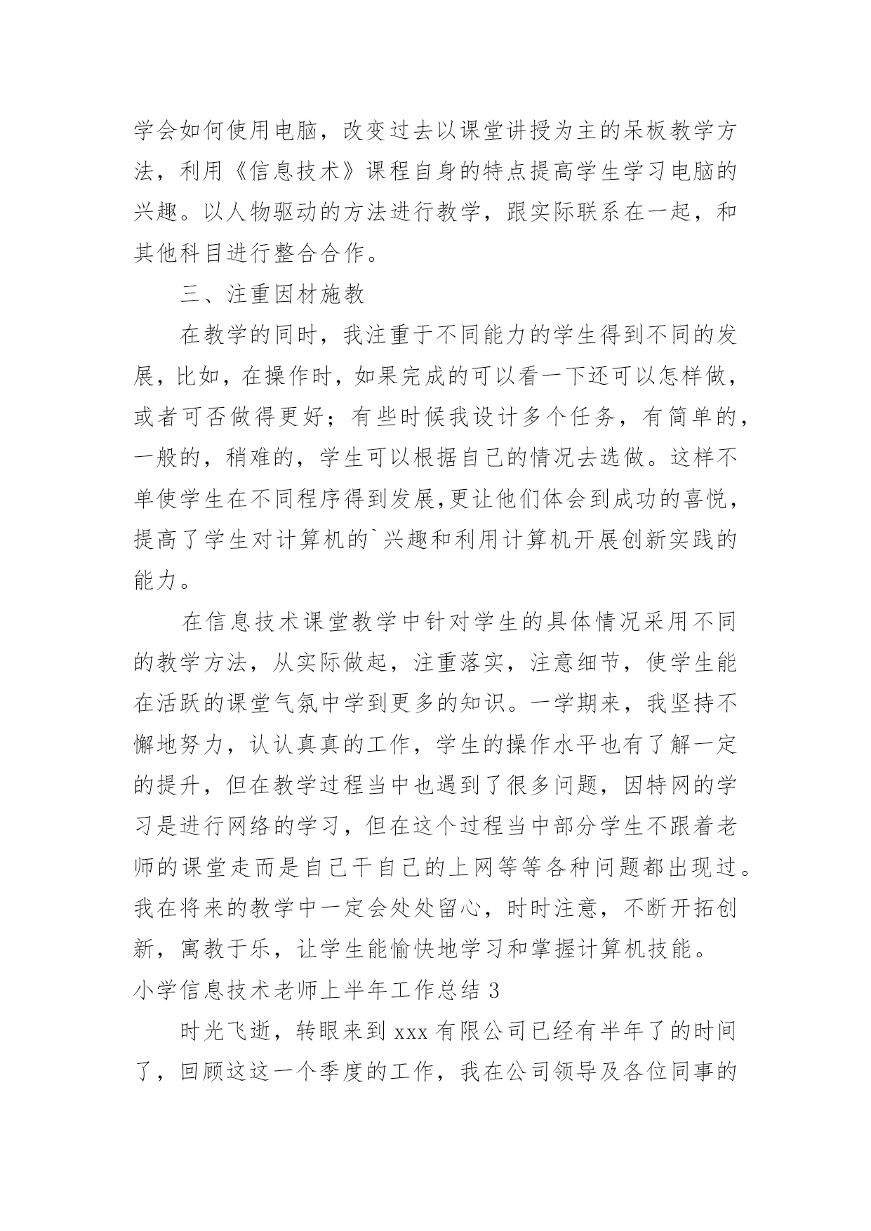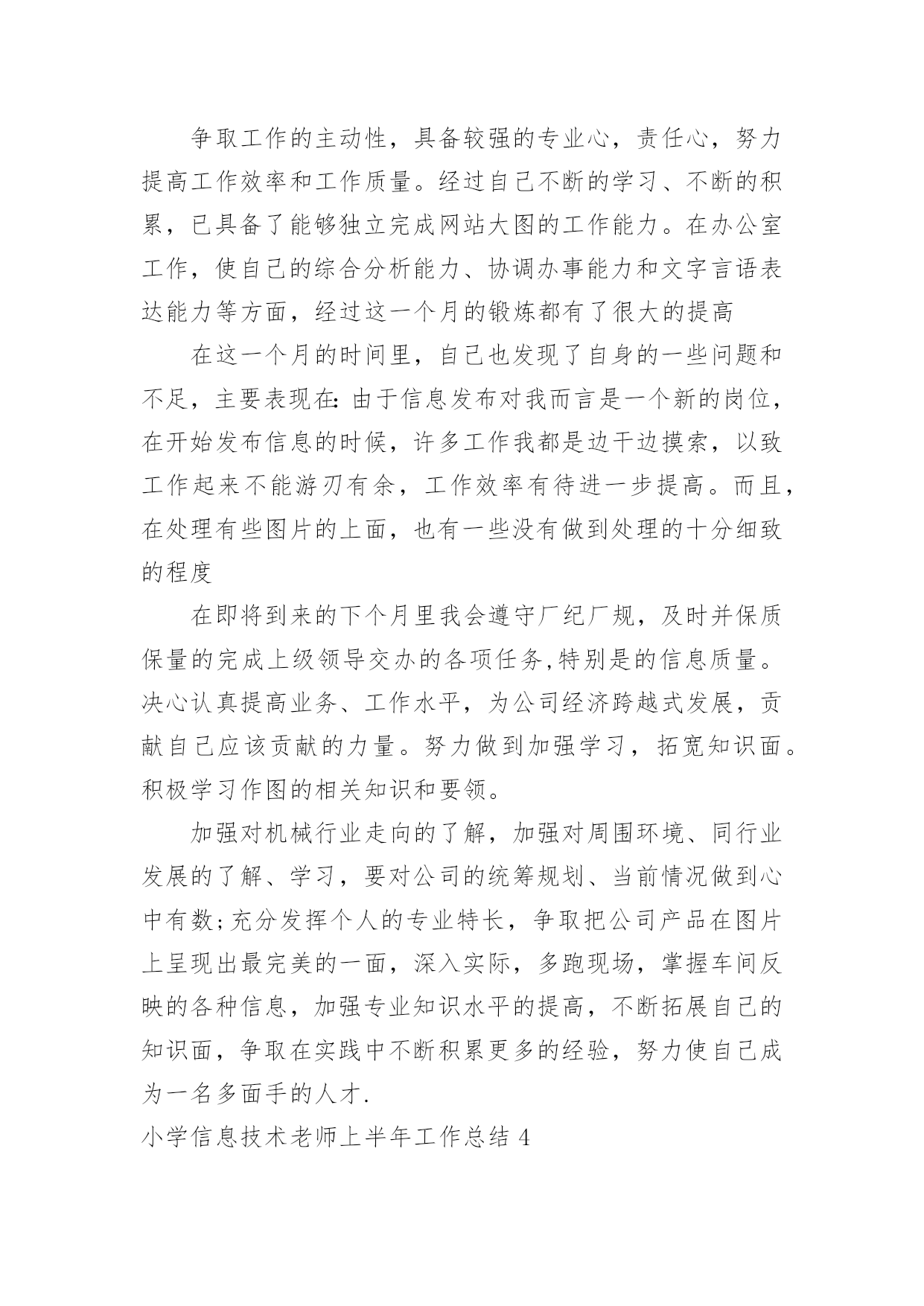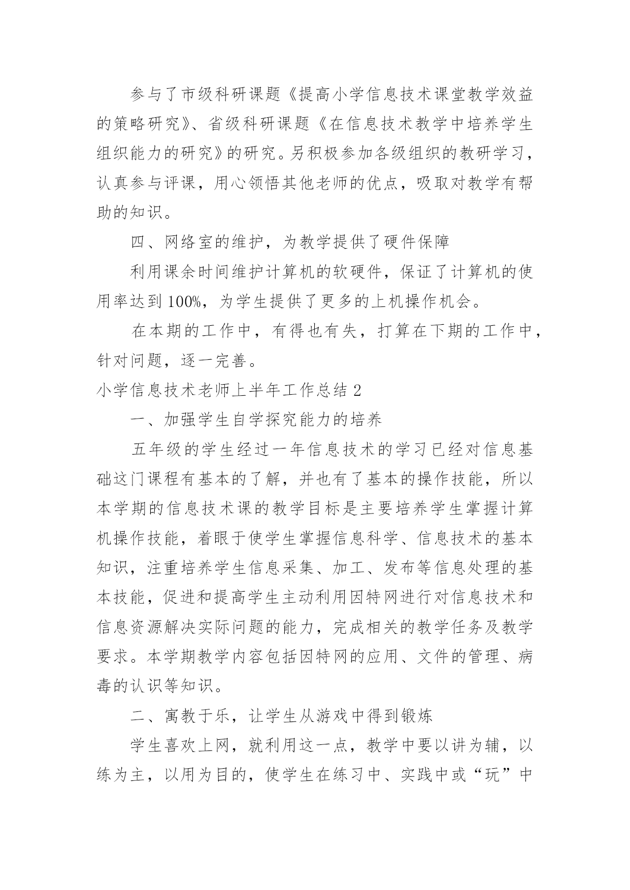 小学信息技术老师上半年工作总结小学信息技术老师上半年工作总结总结是在某一特定时间段对学习和工作生活或其完成情况,包括取得的成绩、存在的问题及得到的经验和教训加以回顾和分析的书面材料,他能够提升我们的书面表达能力,因此我们需要回头归纳,写一份总结了。你想知道总结怎么写吗?下面是小编收集整理的小学信息技术老师上半年工作总结,供大家参考借鉴,希望可以帮助到有需要的朋友。小学信息技术老师上半年工作总结1一、学生分析本学年主要从事三、五、六年级的信息技术教学工作。三年级的学生经过一学期的学习,在学习上,学生间差距不大,差距体现在学习习惯上,由于个别学生长期自由散漫,不听老师劝告,甚至教育。尤其是三年四班,学习习惯特差,一些学生不爱学习,并且好斗,经常打架,对学习成绩没有概念,无论优秀与不及格,都与他无关似的,对成绩可以说是不闻不问。五年级发展较均衡,只是全班之后,班额更大了,不便于困难生的辅导。六年级跟开学时预料的一样,学生发生了很大的`变大,优生减少,差生增多,学生处在从少年向青年的过渡期,生理和心理都在悄悄发生变化,出现了不爱学习、顽固、自心为是、贪玩等不良现象,尤其是我们这些“副科”,学生更是不以为然,这就使我们的教学更难顺利进行。汲取了前一个六年级的经验,加强了与学生间的交流,本学期与六年级学生相处还比较愉快。二、根据各年级情况调整教学内容和方法1、三年级本学期注重学习习惯的培养,如:课前排队、课前预习、听课认真、小组协作。开学初,对学生进行网络室管理教育,选拔组长,了解学生,异质分组,注重学生鼠标正常操作、键盘指法的正确运用。经过一学期的努力,大部分学生养成了良好的上机习惯,键盘录入字母速度较快。但对个别学生了解不够深入,师生间缺少交流,学生积极性高,但学习却上不来,还有甚者,根本不动手,懒得很。2、由于本期网络室搬迁,耽误了一些教学时间,就对教学内容作了适当的删减,主要学习了word表格和邮件发送,期末考试内容就是每一位学生给我发一封邮件,学生通过邮件谈了自己在学习上的一些收获,以及对老师的美好祝愿,确实让我很感动,增进了师生间的情感。唯一遗憾的是我没有一一回信,确实时间不够,每天收邮件都要花很多时间。3、六年级的教材重点放在ppt的确超级链接。要求学生完成三个幻灯片:世界上的四大河流、数学复习课件、古诗欣赏。根据完成情况给学生评定期末成绩。其中收集了一些优秀作品。三、参与科研、教研参与了市级科研课题《提高小学信息技术课堂教学效益的策略研究》、省级科研课题《在信息技术教学中培养学生组织能力的研究》的研究。另积极参加各级组织的教研学习,认真参与评课,用心领悟其他老师的优点,吸取对教学有帮助的知识。四、网络室的维护,为教学提供了硬件保障利用课余时间维护计算机的软硬件,保证了计算机的使用率达到100%,为学生提供了更多的上机操作机会。在本期的工作中,有得也有失,打算在下期的工作中,针对问题,逐一完善。小学信息技术老师上半年工作总结2一、加强学生自学探究能力的培养五年级的学生经过一年信息技术的学习已经对信息基础这门课程有基本的了解,并也有了基本的操作技能,所以本学期的信息技术课的教学目标是主要培养学生掌握计算机操作技能,着眼于使学生掌握信息科学、信息技术的基本知识,注重培养学生信息采集、加工、发布等信息处理的基本技能,促进和提高学生主动利用因特网进行对信息技术和信息资源解决实际问题的能力,完成相关的教学任务及教学要求。本学期教学内容包括因特网的应用、文件的管理、病毒的认识等知识。二、寓教于乐,让学生从游戏中得到锻炼学生喜欢上网,就利用这一点,教学中要以讲为辅,以练为主,以用为目的,使学生在练习中、实践中或“玩”中学会如何使用电脑,改变过去以课堂讲授为主的呆板教学方法,利用《信息技术》课程自身的特点提高学生学习电脑的兴趣。以人物驱动的方法进行教学,跟实际联系在一起,和其他科目进行整合合作。三、注重因材施教在教学的同时,我注重于不同能力的学生得到不同的发展,比如,在操作时,如果完成的可以看一下还可以怎样做,或者可否做得更好;有些时候我设计多个任务,有简单的,一般的,稍难的,学生可以根据自己的情况去选做。这样不单使学生在不同程序得到发展,更让他们体会到成功的喜悦,提高了学生对计算机的`兴趣和利用计算机开展创新实践的能力。在信息技术课堂教学中针对学生的具体情况采用不同的教学方法,从实际做起,注重落实,注意细节,使学生能在活跃的课堂气氛中学到更多的知识。一学期来,我坚持不懈地努力,认认真真的工作,学生的操作水平也有了解一定的提升,但在教学过程当中也遇到了很多问题,因特网的学习是进行网络的学习,但在这个过程当中部分学生不跟着老师的课堂走而是自己干自己的上网等等各种问题都出现过。我在将来的教学中一定会处处留心,时时注意,不断开拓创新,寓教于乐