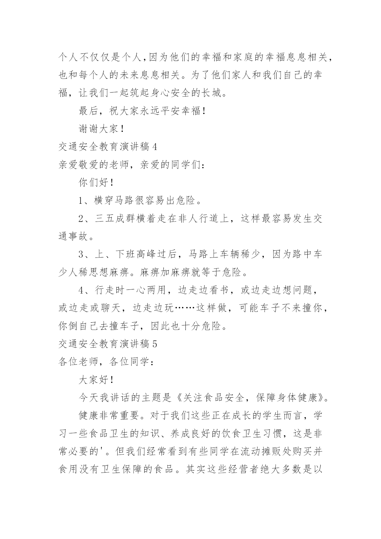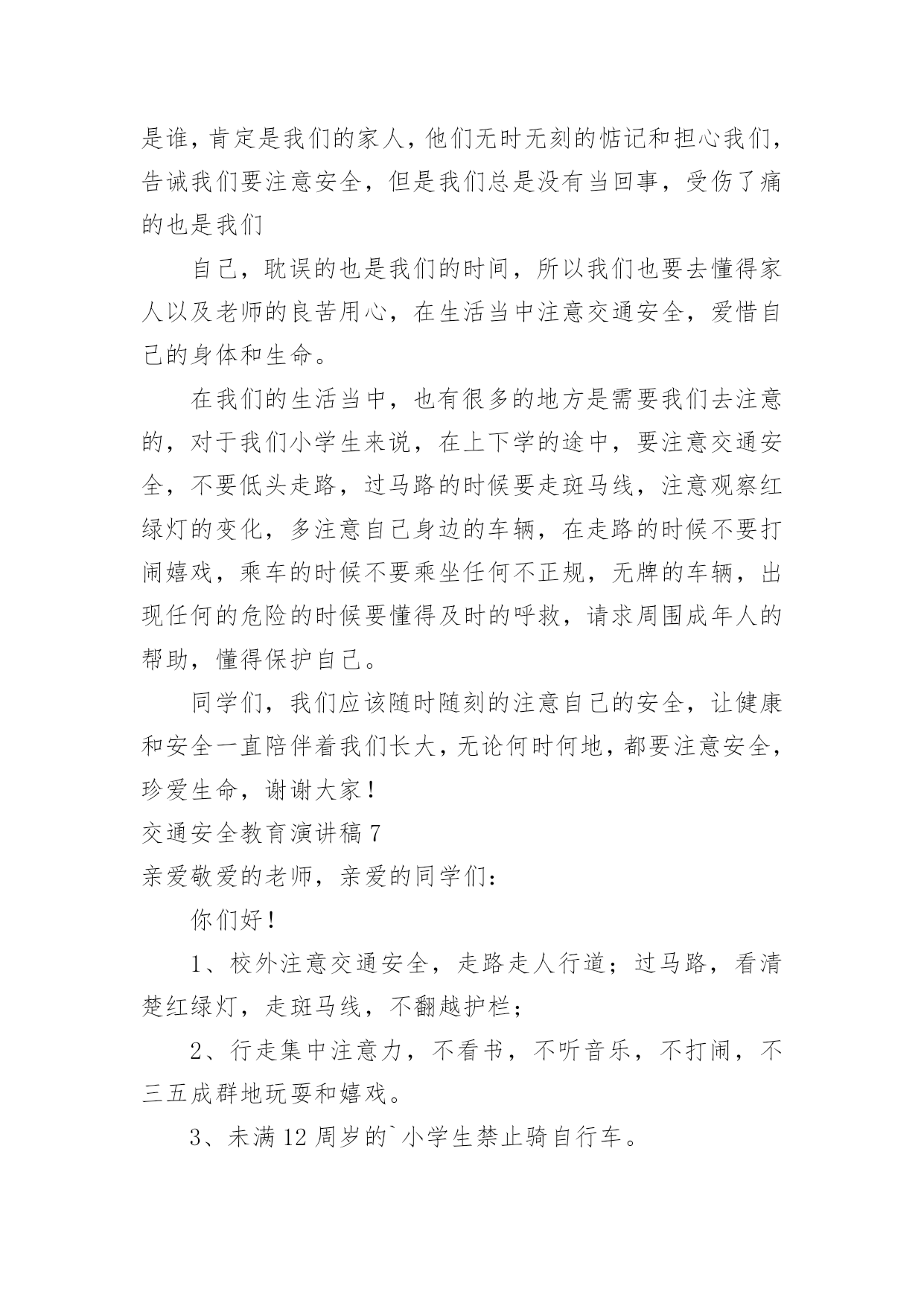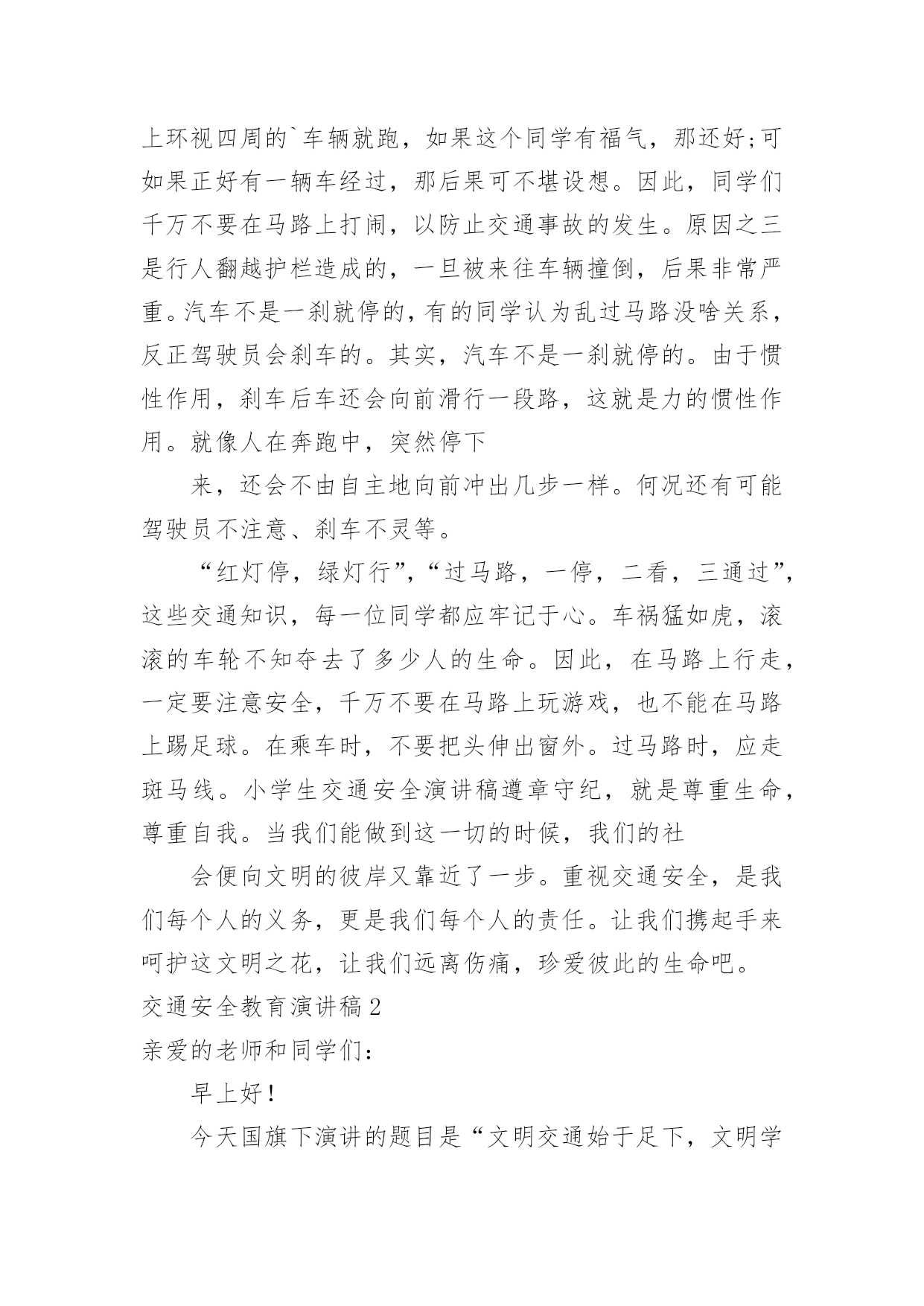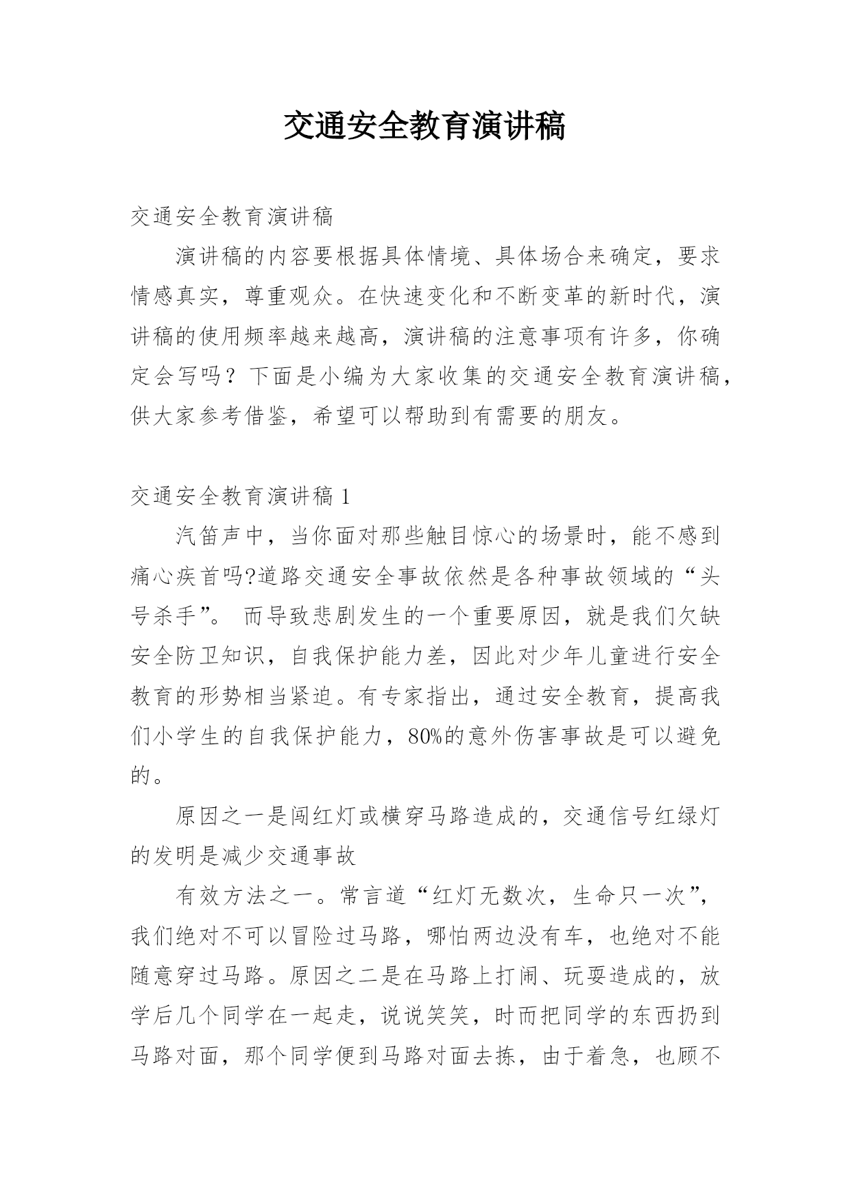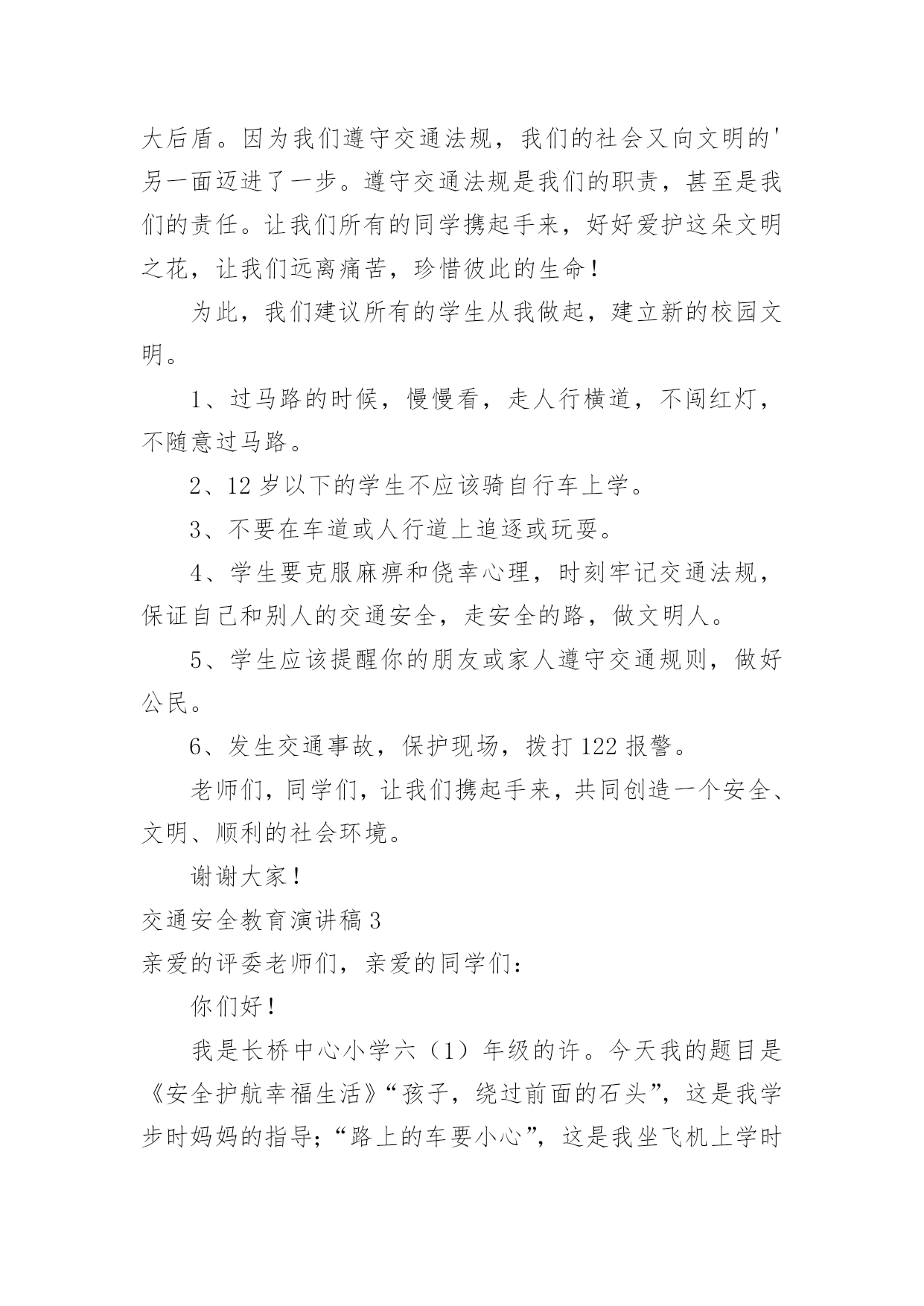 交通安全教育演讲稿交通安全教育演讲稿演讲稿的内容要根据具体情境、具体场合来确定,要求情感真实,尊重观众。在快速变化和不断变革的新时代,演讲稿的使用频率越来越高,演讲稿的注意事项有许多,你确定会写吗?下面是小编为大家收集的交通安全教育演讲稿,供大家参考借鉴,希望可以帮助到有需要的朋友。交通安全教育演讲稿1汽笛声中,当你面对那些触目惊心的场景时,能不感到痛心疾首吗?道路交通安全事故依然是各种事故领域的“头号杀手”。而导致悲剧发生的一个重要原因,就是我们欠缺安全防卫知识,自我保护能力差,因此对少年儿童进行安全教育的形势相当紧迫。有专家指出,通过安全教育,提高我们小学生的自我保护能力,80%的意外伤害事故是可以避免的。原因之一是闯红灯或横穿马路造成的,交通信号红绿灯的发明是减少交通事故有效方法之一。常言道“红灯无数次,生命只一次”,我们绝对不可以冒险过马路,哪怕两边没有车,也绝对不能随意穿过马路。原因之二是在马路上打闹、玩耍造成的,放学后几个同学在一起走,说说笑笑,时而把同学的东西扔到马路对面,那个同学便到马路对面去拣,由于着急,也顾不上环视四周的`车辆就跑,如果这个同学有福气,那还好;可如果正好有一辆车经过,那后果可不堪设想。因此,同学们千万不要在马路上打闹,以防止交通事故的发生。原因之三是行人翻越护栏造成的,一旦被来往车辆撞倒,后果非常严重。汽车不是一刹就停的,有的同学认为乱过马路没啥关系,反正驾驶员会刹车的。其实,汽车不是一刹就停的。由于惯性作用,刹车后车还会向前滑行一段路,这就是力的惯性作用。就像人在奔跑中,突然停下来,还会不由自主地向前冲出几步一样。何况还有可能驾驶员不注意、刹车不灵等。“红灯停,绿灯行”,“过马路,一停,二看,三通过”,这些交通知识,每一位同学都应牢记于心。车祸猛如虎,滚滚的车轮不知夺去了多少人的生命。因此,在马路上行走,一定要注意安全,千万不要在马路上玩游戏,也不能在马路上踢足球。在乘车时,不要把头伸出窗外。过马路时,应走斑马线。小学生交通安全演讲稿遵章守纪,就是尊重生命,尊重自我。当我们能做到这一切的时候,我们的社会便向文明的彼岸又靠近了一步。重视交通安全,是我们每个人的义务,更是我们每个人的责任。让我们携起手来呵护这文明之花,让我们远离伤痛,珍爱彼此的生命吧。交通安全教育演讲稿2亲爱的老师和同学们:早上好!今天国旗下演讲的题目是“文明交通始于足下,文明学生始于我”。我们生活在一个交通便利的社会。我们每天往返于学校、家庭和其他地方。你看到我们在拥挤的街道上每天走的交通路线中隐藏的危险了吗?因为不遵守交通法,所以看到了血的事实,忍受了血的教训。那些场景令人心碎,令人恐怖。那些因为抢救无效而离开我们的人,给我们留下了精神创伤,给离开我们的人留下了无尽的遗憾。在痛惜他们的同时,我们要清醒地认识到,遵守交通法规就是珍惜生命!有人曾经说过,动荡时期最可怕的是战争,而和平时期最可怕的是车祸。这绝不是危言耸听,因为全球每年交通事故死亡人数相当于一场中等规模的战争死亡人数。以下数字让人相信‘车祸比老虎还凶’,交通事故就在你我身边:据公安部交通管理局统计,20xx年全国共报告道路交通事故3906164起,同比上升35。9%。其中,道路交通事故伤亡219,521起,死亡65,225人,受伤254,075人,直接财产损失9。3%几十亿。65225人是什么概念?相当于我们第二小学50多人。如何形容9。3亿元的经济损失?交通安全专家分析,如果花20万元建一所希望小学,全年因交通事故造成经济损失可建近5000所希望小学;如果每年需要500元帮助一个失学儿童,全年交通事故造成的经济损失可以让近500万失学儿童重返校园。俗话说,“没有规则造就方圆”。因此,所有在道路上进行交通相关活动的人都不能随心所欲,必须严格遵守规则,即交通规则。它是保证我国社会有序、健康、快速发展的强大后盾。因为我们遵守交通法规,我们的社会又向文明的'另一面迈进了一步。遵守交通法规是我们的职责,甚至是我们的责任。让我们所有的同学携起手来,好好爱护这朵文明之花,让我们远离痛苦,珍惜彼此的生命!为此,我们建议所有的学生从我做起,建立新的校园文明。1、过马路的时候,慢慢看,走人行横道,不闯红灯,不随意过马路。2、12岁以下的学生不应该骑自行车上学。3、不要在车道或人行道上追逐或玩耍。4、学生要克服麻痹和侥幸心理,时刻牢记交通法规,保证自己和别人的交通安全,走安全的路,做文明人。5、学生应该提醒你的朋友或家人遵守交通规则,做好公民。6、发生交通事故,保护现场,拨打122报警。老师们,同学们,让我们携起手来,共同创造一个安全、文明、顺利的社会环境。谢谢大家!交通安全教育演讲稿3亲爱的评委老师们,亲爱的同学们:你们好!我是长桥中心小学六(1)年级的许。今天我的题目是《安全
