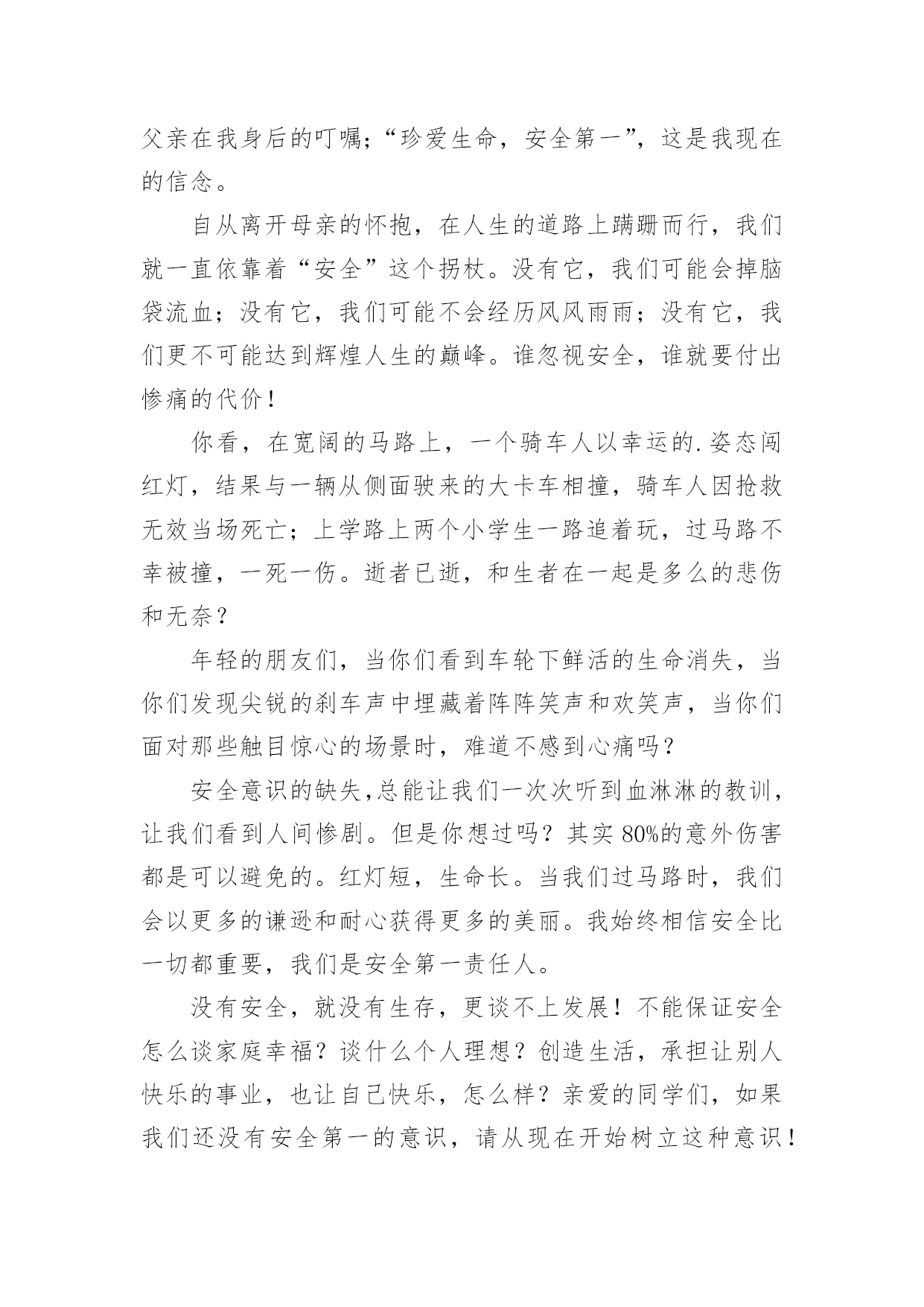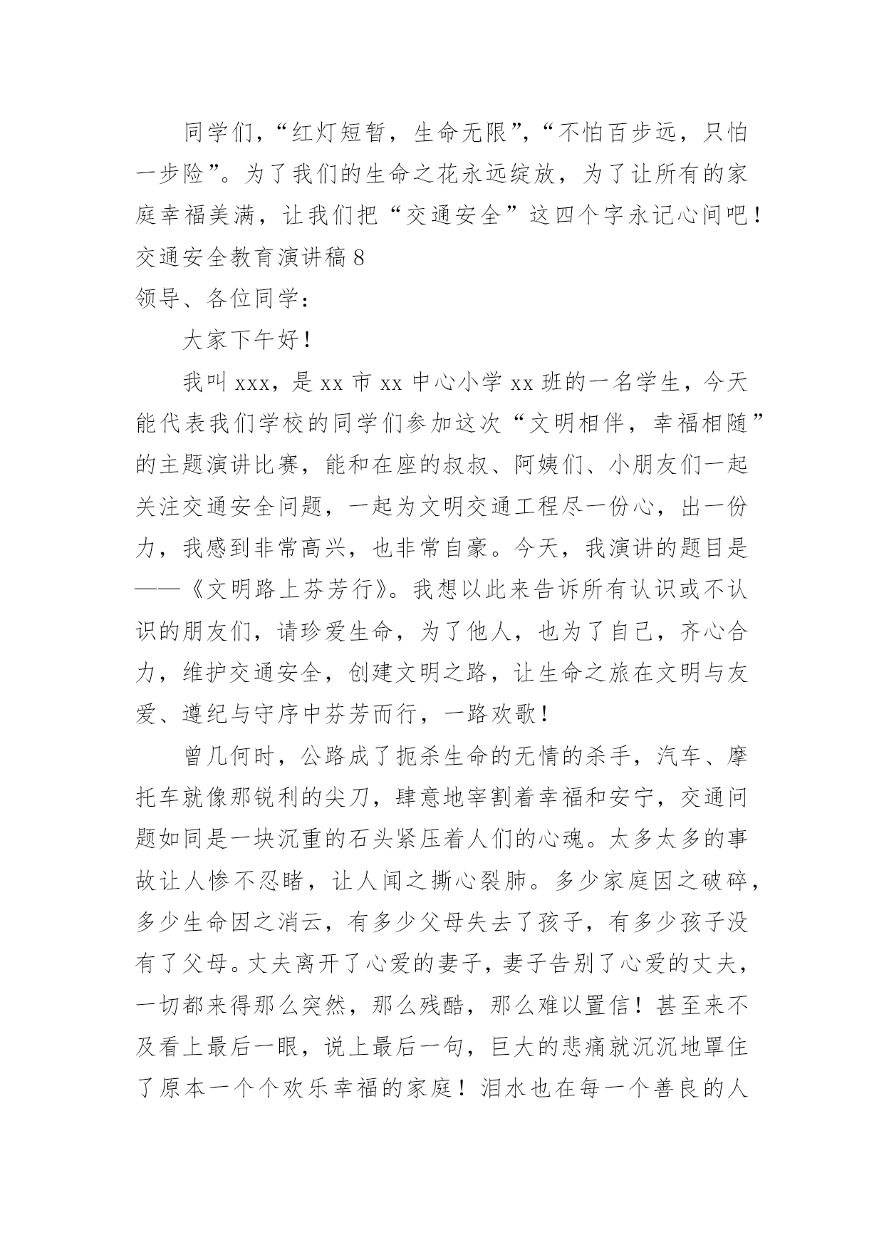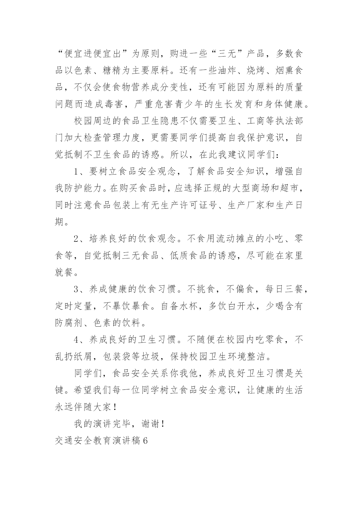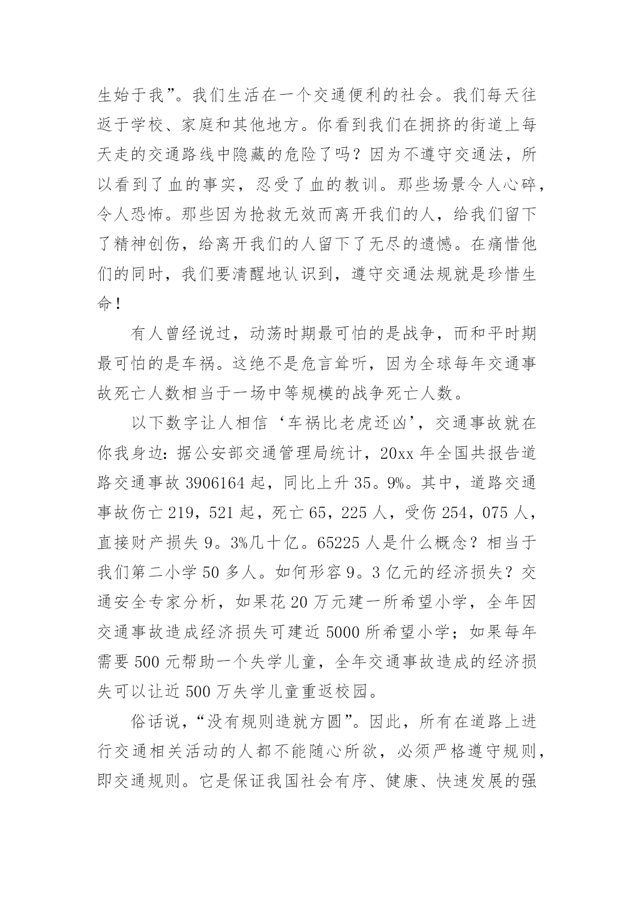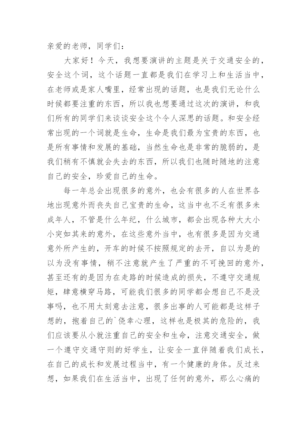 交通安全教育演讲稿交通安全教育演讲稿演讲稿的内容要根据具体情境、具体场合来确定,要求情感真实,尊重观众。在快速变化和不断变革的新时代,演讲稿的使用频率越来越高,演讲稿的注意事项有许多,你确定会写吗?下面是小编为大家收集的交通安全教育演讲稿,供大家参考借鉴,希望可以帮助到有需要的朋友。交通安全教育演讲稿1汽笛声中,当你面对那些触目惊心的场景时,能不感到痛心疾首吗?道路交通安全事故依然是各种事故领域的“头号杀手”。而导致悲剧发生的一个重要原因,就是我们欠缺安全防卫知识,自我保护能力差,因此对少年儿童进行安全教育的形势相当紧迫。有专家指出,通过安全教育,提高我们小学生的自我保护能力,80%的意外伤害事故是可以避免的。原因之一是闯红灯或横穿马路造成的,交通信号红绿灯的发明是减少交通事故有效方法之一。常言道“红灯无数次,生命只一次”,我们绝对不可以冒险过马路,哪怕两边没有车,也绝对不能随意穿过马路。原因之二是在马路上打闹、玩耍造成的,放学后几个同学在一起走,说说笑笑,时而把同学的东西扔到马路对面,那个同学便到马路对面去拣,由于着急,也顾不上环视四周的`车辆就跑,如果这个同学有福气,那还好;可如果正好有一辆车经过,那后果可不堪设想。因此,同学们千万不要在马路上打闹,以防止交通事故的发生。原因之三是行人翻越护栏造成的,一旦被来往车辆撞倒,后果非常严重。汽车不是一刹就停的,有的同学认为乱过马路没啥关系,反正驾驶员会刹车的。其实,汽车不是一刹就停的。由于惯性作用,刹车后车还会向前滑行一段路,这就是力的惯性作用。就像人在奔跑中,突然停下来,还会不由自主地向前冲出几步一样。何况还有可能驾驶员不注意、刹车不灵等。“红灯停,绿灯行”,“过马路,一停,二看,三通过”,这些交通知识,每一位同学都应牢记于心。车祸猛如虎,滚滚的车轮不知夺去了多少人的生命。因此,在马路上行走,一定要注意安全,千万不要在马路上玩游戏,也不能在马路上踢足球。在乘车时,不要把头伸出窗外。过马路时,应走斑马线。小学生交通安全演讲稿遵章守纪,就是尊重生命,尊重自我。当我们能做到这一切的时候,我们的社会便向文明的彼岸又靠近了一步。重视交通安全,是我们每个人的义务,更是我们每个人的责任。让我们携起手来呵护这文明之花,让我们远离伤痛,珍爱彼此的生命吧。交通安全教育演讲稿2亲爱的老师和同学们:早上好!今天国旗下演讲的题目是“文明交通始于足下,文明学生始于我”。我们生活在一个交通便利的社会。我们每天往返于学校、家庭和其他地方。你看到我们在拥挤的街道上每天走的交通路线中隐藏的危险了吗?因为不遵守交通法,所以看到了血的事实,忍受了血的教训。那些场景令人心碎,令人恐怖。那些因为抢救无效而离开我们的人,给我们留下了精神创伤,给离开我们的人留下了无尽的遗憾。在痛惜他们的同时,我们要清醒地认识到,遵守交通法规就是珍惜生命!有人曾经说过,动荡时期最可怕的是战争,而和平时期最可怕的是车祸。这绝不是危言耸听,因为全球每年交通事故死亡人数相当于一场中等规模的战争死亡人数。以下数字让人相信‘车祸比老虎还凶’,交通事故就在你我身边:据公安部交通管理局统计,20xx年全国共报告道路交通事故3906164起,同比上升35。9%。其中,道路交通事故伤亡219,521起,死亡65,225人,受伤254,075人,直接财产损失9。3%几十亿。65225人是什么概念?相当于我们第二小学50多人。如何形容9。3亿元的经济损失?交通安全专家分析,如果花20万元建一所希望小学,全年因交通事故造成经济损失可建近5000所希望小学;如果每年需要500元帮助一个失学儿童,全年交通事故造成的经济损失可以让近500万失学儿童重返校园。俗话说,“没有规则造就方圆”。因此,所有在道路上进行交通相关活动的人都不能随心所欲,必须严格遵守规则,即交通规则。它是保证我国社会有序、健康、快速发展的强大后盾。因为我们遵守交通法规,我们的社会又向文明的'另一面迈进了一步。遵守交通法规是我们的职责,甚至是我们的责任。让我们所有的同学携起手来,好好爱护这朵文明之花,让我们远离痛苦,珍惜彼此的生命!为此,我们建议所有的学生从我做起,建立新的校园文明。1、过马路的时候,慢慢看,走人行横道,不闯红灯,不随意过马路。2、12岁以下的学生不应该骑自行车上学。3、不要在车道或人行道上追逐或玩耍。4、学生要克服麻痹和侥幸心理,时刻牢记交通法规,保证自己和别人的交通安全,走安全的路,做文明人。5、学生应该提醒你的朋友或家人遵守交通规则,做好公民。6、发生交通事故,保护现场,拨打122报警。老师们,同学们,让我们携起手来,共同创造一个安全、文明、顺利的社会环境。谢谢大家!交通安全教育演讲稿3亲爱的评委老师们,亲爱的同学们:你们好!我是长桥中心小学六(1)年级的许。今天我的题目是《安全