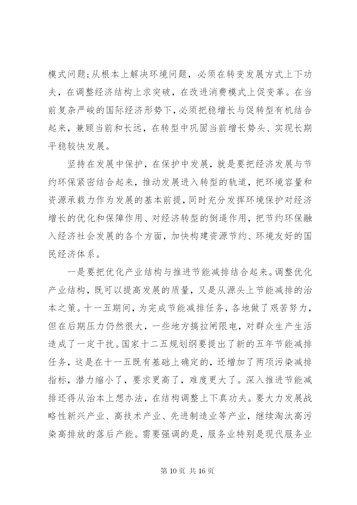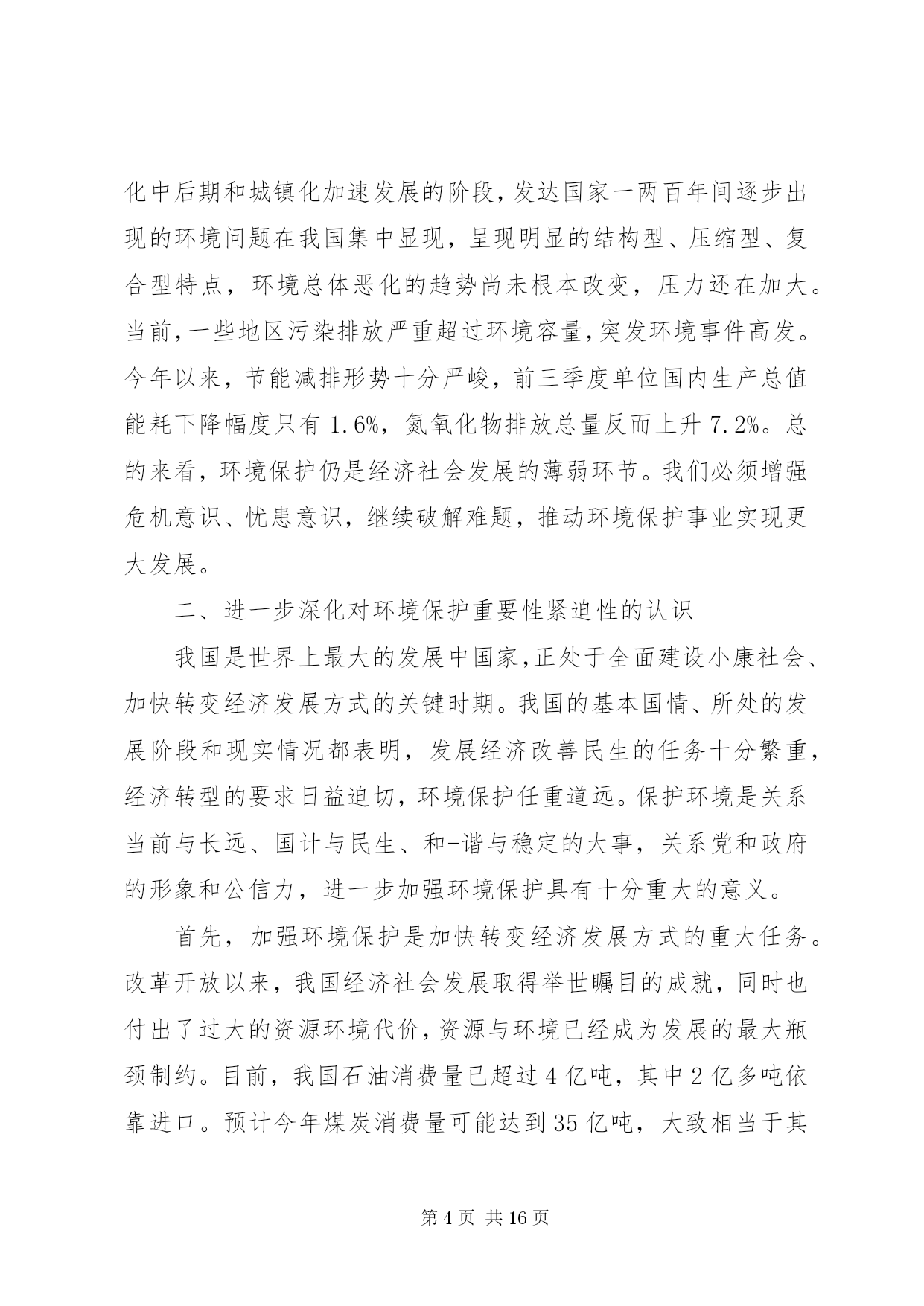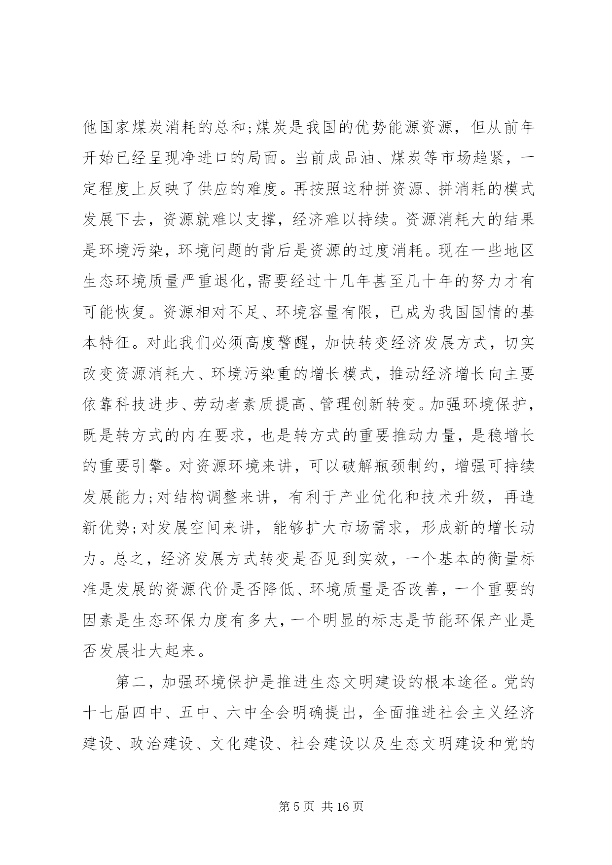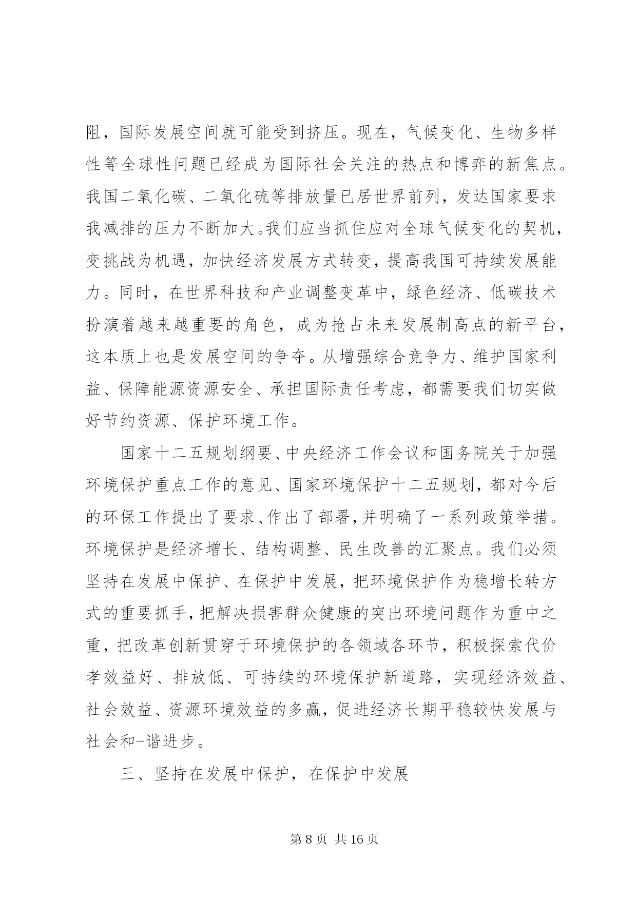 第PAGE\*Arabic\*MERGEFORMAT16页共NUMPAGES\*MERGEFORMAT16页最新环保大会上的讲话最新环保大会上的讲话篇1同志们:第七次全国环境保护大会是在国家实施十二五规划的开局之年,在我国经济社会发展到了新阶段,面临着复杂的国际经济形势的情况下,也是在中央经济工作会议之后召开的一次十分重要的会议。会议的主要目的是,落实十二五规划的主题和主线,落实中央经济工作会议精神,落实国务院出台的《关于加强环境保护重点工作的意见》和《国家环境保护十二五规划》,总结十一五期间的环境保护工作,分析环境保护面临的新形势,部署今后一个时期的环保任务。下面,我讲几点意见。一、十一五时期环境保护工作取得显著成绩党中央、国务院历来高度重视环境保护,把保护环境确立为基本国策,大力实施可持续发展战略。十一五时期,国家作出一系列新的重大部署。在各方面共同努力下,我国环保工作取得显著成绩。一是环境保护从认识到实践发生重要变化。国家提出了建设生态文明和建设资源节约型、环境友好型社会的战略任务,环境保护在经济社会全面协调可持续发展中的作用显著增强。经全国人大批准,组建了环境保护部,为更好地发挥环保在服务民生、宏观调控等方面的功能提供了组织保障。制定了循环经济促进法、《规划环境影响评价条例》等法律法规,修订了水污染防治法,环保的法律支撑更加有力。出台了一些有利于环境保护的价格、财税等经济政策,以及绿色信贷、绿色证券、生态补偿等举措,市场机制在环境保护中的作用更加显现。国家十一五环保规划确定的各项指标和重点任务全面完成。二是环境保护投入和能力建设力度明显加大。十一五期间,从中央到地方都加大了环保的财政资金支持,带动全社会环保投入2.1万亿元,有力地推动了环境保护基础设施建设进入快车道。中央安排专项资金70多亿元,完成了全国一半以上的县区级环境监测站标准化建设,初步建成了环境监测和污染源自动监控网络。过去环保系统一些基层单位废气靠闻、污水靠看、噪声靠听,现在已经有了很大改观。环境执法能力也有了很大提高。完成了第一次全国污染源普查,开展了中国环境宏观战略研究,加强了科技攻关、人才培养、国际合作,为做好环保工作提供了基础支撑。三是环境保护优化经济发展的作用逐步显现。大力推动环境保护的三个转变(见附注),促进保护环境与经济增长并重、环境保护和经济发展同步,以保护环境优化经济发展的工作逐步加强。在结构调整中,严把节能环保关,采取综合措施淘汰落后产能,全国30万千瓦以上火电机组装机容量占总容量的比重由47%提高到71%,钢铁行业1000立方米以上高炉比重由21%增加到52%。严格项目环评,实行必要的区域限批,国家层面拒批的两高一资建设项目总投资达3万多亿元。加强重点行业环保核查,积极推行清洁生产,大力发展循环经济,为转变经济发展方式作出了贡献。四是污染防治和主要污染物减排成效明显。持续推进重点流域、区域污染防控,着力解决突出污染问题,部分地区环境质量有所改善。加大饮用水水源保护力度,解决了2.15亿农村人口饮水不安全问题。支持6600多个村镇开展农村环境综合整治和生态示范建设,2400多万农村人口直接受益。五年中,主要污染物减排预定任务超额完成,全国城市污水处理率由52%提高到77%,火电脱硫比例从14%提高到86%,七大水系好于Ⅲ类水质的比例提高幅度超过14个百分点,北京奥运会、上海世博会期间环境质量得到有效保障。总之,十一五时期是全社会环保意识明显提升的五年,是投入和整治力度最大的五年,是环保领域不断拓展的五年。这些成绩来之不易,凝聚着包括在座各位的辛劳和智慧。刚才,大会表彰了全国环保系统先进集体和先进工作者。在此,我代表党中央、国务院,向受到表彰的单位和个人表示热烈祝贺。向多年来辛勤工作的环保工作者,以及关心、支持、参与环境保护的各界人士表示诚挚慰问。在看到成绩的同时,也要看到矛盾和问题。我国正处于工业化中后期和城镇化加速发展的阶段,发达国家一两百年间逐步出现的环境问题在我国集中显现,呈现明显的结构型、压缩型、复合型特点,环境总体恶化的趋势尚未根本改变,压力还在加大。当前,一些地区污染排放严重超过环境容量,突发环境事件高发。今年以来,节能减排形势十分严峻,前三季度单位国内生产总值能耗下降幅度只有1.6%,氮氧化物排放总量反而上升7.2%。总的来看,环境保护仍是经济社会发展的薄弱环节。我们必须增强危机意识、忧患意识,继续破解难题,推动环境保护事业实现更大发展。二、进一步深化对环境保护重要性紧迫性的认识我国是世界上最大的发展中国家,正处于全面建设小康社会、加快转变经济发展方式的关键时期。我国的基本国情、所处的发展阶段和现实情况都表明,发展经济改善民生的任务十分繁重,经济转型的要求日益迫切,环境保护任重道远。保护环境是关系