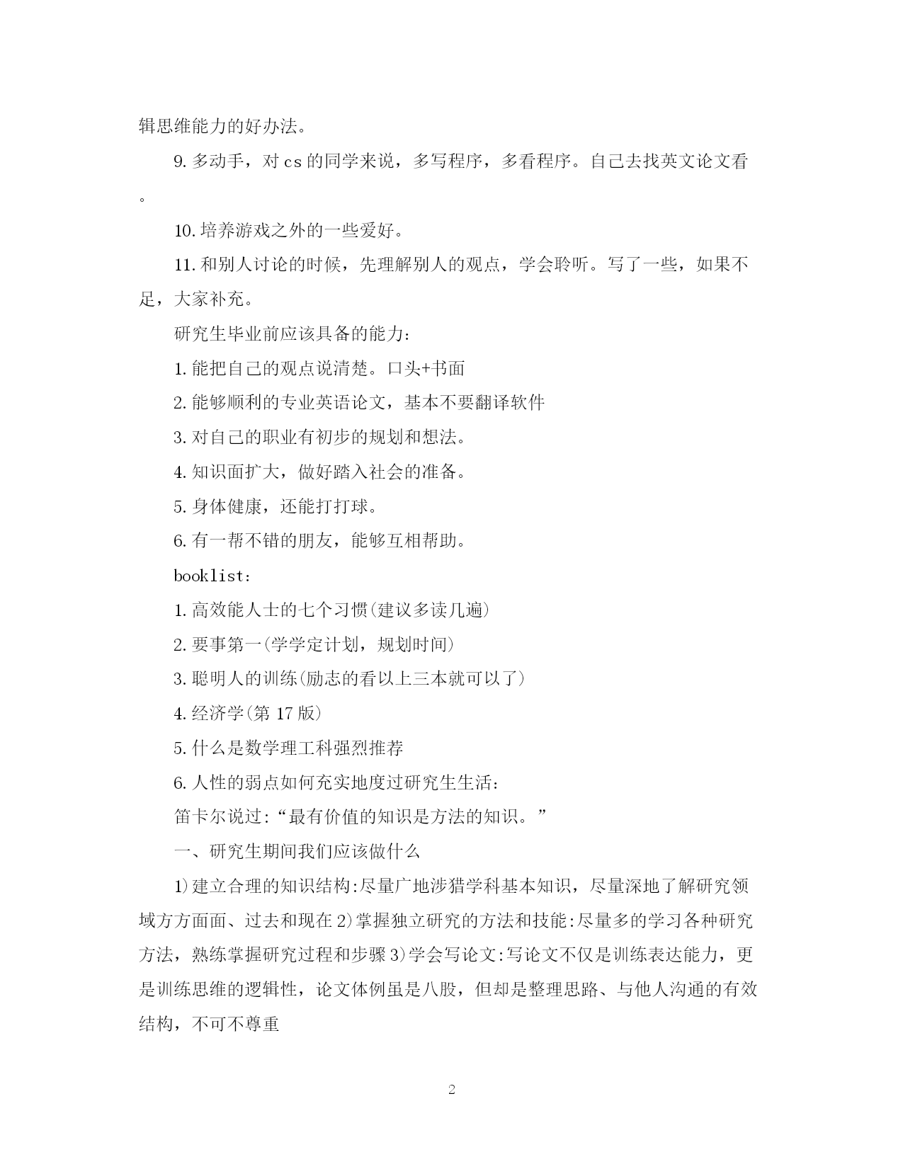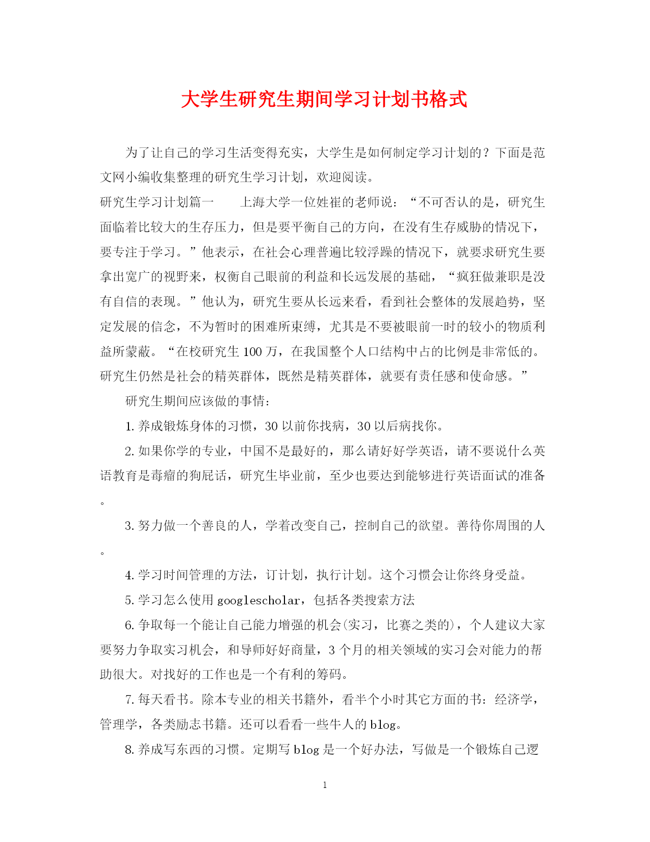 此资料由网络收集而来,如有侵权请告知上传者立即删除。资料共分享,我们负责传递知识。PAGEPAGE9大学生研究生期间学习计划书格式为了让自己的学习生活变得充实,大学生是如何制定学习计划的?下面是范文网小编收集整理的研究生学习计划,欢迎阅读。研究生学习计划篇一上海大学一位姓崔的老师说:“不可否认的是,研究生面临着比较大的生存压力,但是要平衡自己的方向,在没有生存威胁的情况下,要专注于学习。”他表示,在社会心理普遍比较浮躁的情况下,就要求研究生要拿出宽广的视野来,权衡自己眼前的利益和长远发展的基础,“疯狂做兼职是没有自信的表现。”他认为,研究生要从长远来看,看到社会整体的发展趋势,坚定发展的信念,不为暂时的困难所束缚,尤其是不要被眼前一时的较小的物质利益所蒙蔽。“在校研究生100万,在我国整个人口结构中占的比例是非常低的。研究生仍然是社会的精英群体,既然是精英群体,就要有责任感和使命感。”研究生期间应该做的事情:1.养成锻炼身体的习惯,30以前你找病,30以后病找你。2.如果你学的专业,中国不是最好的,那么请好好学英语,请不要说什么英语教育是毒瘤的狗屁话,研究生毕业前,至少也要达到能够进行英语面试的准备。3.努力做一个善良的人,学着改变自己,控制自己的欲望。善待你周围的人。4.学习时间管理的方法,订计划,执行计划。这个习惯会让你终身受益。5.学习怎么使用googlescholar,包括各类搜索方法6.争取每一个能让自己能力增强的机会(实习,比赛之类的),个人建议大家要努力争取实习机会,和导师好好商量,3个月的相关领域的实习会对能力的帮助很大。对找好的工作也是一个有利的筹码。7.每天看书。除本专业的相关书籍外,看半个小时其它方面的书:经济学,管理学,各类励志书籍。还可以看看一些牛人的blog。8.养成写东西的习惯。定期写blog是一个好办法,写做是一个锻炼自己逻辑思维能力的好办法。9.多动手,对cs的同学来说,多写程序,多看程序。自己去找英文论文看。10.培养游戏之外的一些爱好。11.和别人讨论的时候,先理解别人的观点,学会聆听。写了一些,如果不足,大家补充。研究生毕业前应该具备的能力:1.能把自己的观点说清楚。口头+书面2.能够顺利的专业英语论文,基本不要翻译软件3.对自己的职业有初步的规划和想法。4.知识面扩大,做好踏入社会的准备。5.身体健康,还能打打球。6.有一帮不错的朋友,能够互相帮助。booklist:1.高效能人士的七个习惯(建议多读几遍)2.要事第一(学学定计划,规划时间)3.聪明人的训练(励志的看以上三本就可以了)4.经济学(第17版)5.什么是数学理工科强烈推荐6.人性的弱点如何充实地度过研究生生活:笛卡尔说过:“最有价值的知识是方法的知识。”一、研究生期间我们应该做什么1)建立合理的知识结构:尽量广地涉猎学科基本知识,尽量深地了解研究领域方方面面、过去和现在2)掌握独立研究的方法和技能:尽量多的学习各种研究方法,熟练掌握研究过程和步骤3)学会写论文:写论文不仅是训练表达能力,更是训练思维的逻辑性,论文体例虽是八股,但却是整理思路、与他人沟通的有效结构,不可不尊重就个人而言,个人心理管理就是经常自我心态调整。知足长乐、量力而行1、研究和娱乐要相结合2、凡事都是都有它存在的理由,不要经常有抱怨3、不要随随便便拿两个人来比,只看到他所得到的,却看不到他所失去的,这有什么意义?4、正确面对困境,用辩证的眼光去看问题。二、如何确定适合自己的研究领域?(小故事)有一个草坪铺路的故事可以用来回答这个问题。保护草坪是很难的,因为草坪上的路往往并不是按人的方便性来修的。有一次一个设计师承接了一个项目,交付使用后在这个建筑物的周围全部铺上了草坪,没有路,任人去踩,几个月后,草坪上就分明出现了几条道:有粗有细,然后他就此基础上修路,也有粗有细,结果可想而知。在开始的时候,你可以没有明确的目标,只要张开你的所有触角,去看,去读,去感受,你会不自觉地爱看一些东西,那是你的兴趣,也是你的知识结构决定的,日子久了,也会出现几条路,这些路也都可以通向你要追求的目标。学会倾听心音,让心来告诉你如何走,就不会被别人的价值观、流行的热点牵着跑。三、如何选定一个研究课题对于现在我们研一的学生,在学习基础课程的同时不妨多做一些泛读:1、浏览各有关协会的网站,看看最近召开的学术会议的议题2、翻翻国内有关的期刊,看看最近这些年大家都在忙什么根据你自己的知识结构,你会很自然地有所倾向,再多看看你感兴趣的话题,比较之后,也许就形成了你的论文选题了。听过一句话,不管现在的专业是不是热门,或者多么地不堪,但是,一旦不爱自己的专业,自甘平庸,那毕业的时候真的死定