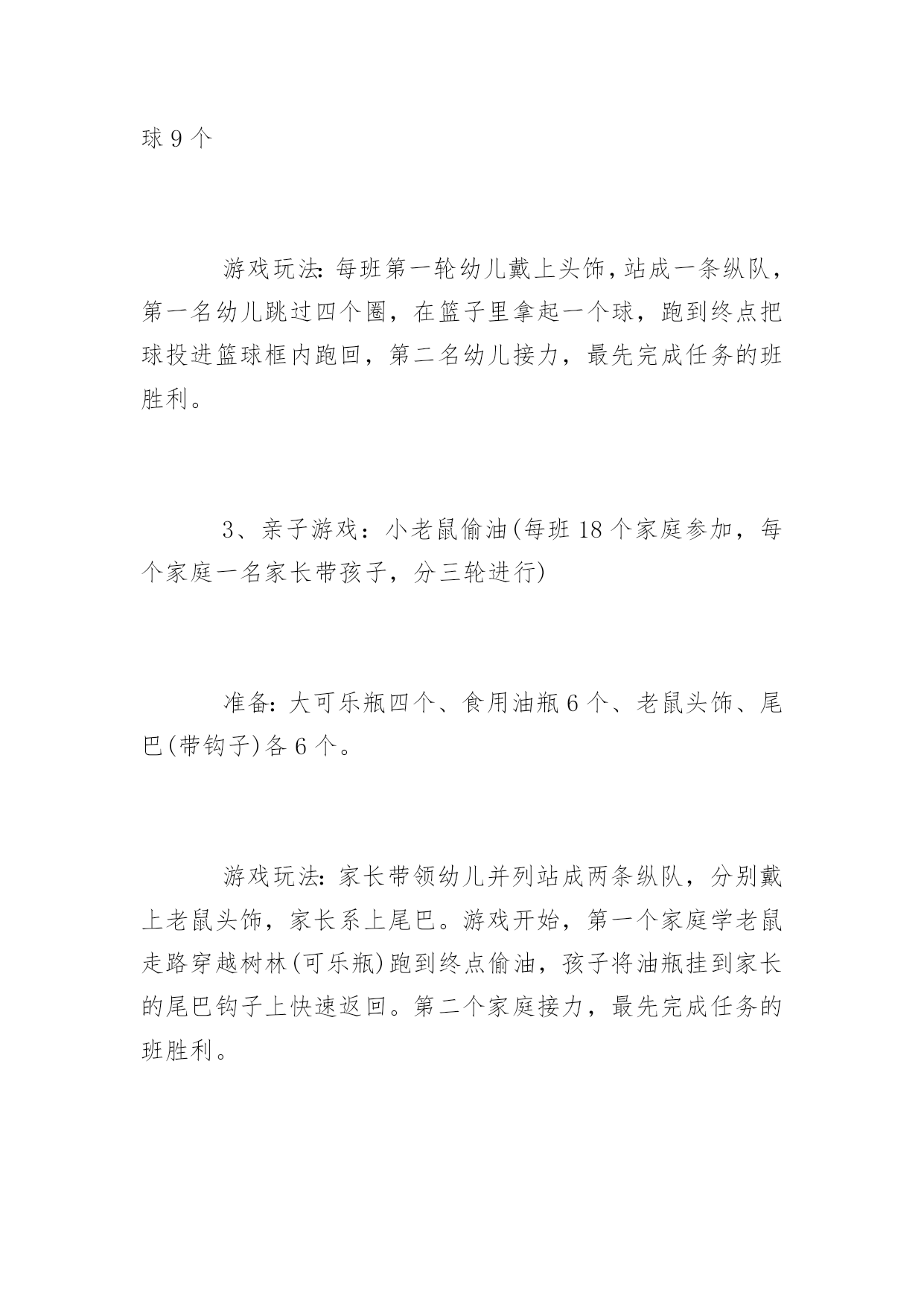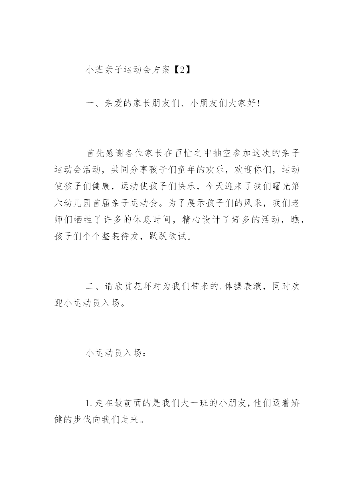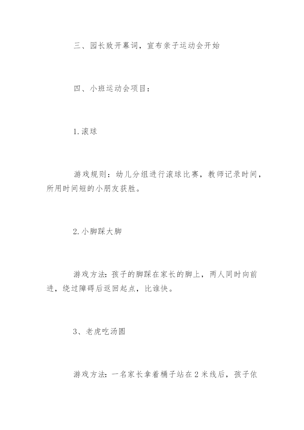 小班亲子运动会方案亲子运动会的召开能够增强孩子与家长之前的交流与合作!下面是应届毕业生小编为大家收集的关于小班亲子运动会方案,欢迎大家阅读!小班亲子运动会方案【1】活动意图:全面贯彻“纲要”精神,全面实施幼儿启蒙教育。加强家园教育,促进幼儿健康成长。同时让教师和幼儿的精神风貌进行充分展示。让孩子在爱的阳光下,其心智之门,雅童之趣,受到最好的教育,也让家长们体会到孩子在教师慈母般的关怀下、爱护、引导下,各方面能力有较大提高,行为习惯明显改观,性格变得更加活泼,举止变得端庄大方,更加坚信幼儿园是孩子成长的摇篮,是孩子放飞希望的绿草地。活动过程:一、入场式(运动员进行曲)1、每班幼儿手拿太阳花排成四条纵队入场,最前面一幼儿举班牌。顺序为:小一、小二、小三、小四、小五、小六。2、幼儿进入场地举行升旗仪式,由护旗手上升旗台升旗。奏国歌、升国旗(负责教师:沈玉洁)。3.园长致辞4.、幼儿表演团体操:《花儿朵朵》带操教师:童欣梅、曾燕、张雯、刘晶、沈玉洁、涂璐5.幼儿整队退场(运动员进行曲),各班幼儿在指定位置坐下。二、游戏环节:(活动中配音乐)1、战胜灰太狼(每班18人参加,分两轮进行)准备:喜羊羊美羊羊头饰、山洞一个、大鼓及鼓槌各一(大鼓上贴灰太狼图)。游戏玩法:每班第一轮幼儿戴上头饰,站成一条纵队,第一名幼儿爬过山洞,跑向终点拿起鼓槌打“灰太狼”三下返回,第二名幼儿接力,最先完成任务的'班胜利。2、灌篮高手(每班18人参加,分两轮进行)准备:喜洋洋美羊羊头饰、跳圈4个小篮球架一个,球9个游戏玩法:每班第一轮幼儿戴上头饰,站成一条纵队,第一名幼儿跳过四个圈,在篮子里拿起一个球,跑到终点把球投进篮球框内跑回,第二名幼儿接力,最先完成任务的班胜利。3、亲子游戏:小老鼠偷油(每班18个家庭参加,每个家庭一名家长带孩子,分三轮进行)准备:大可乐瓶四个、食用油瓶6个、老鼠头饰、尾巴(带钩子)各6个。游戏玩法:家长带领幼儿并列站成两条纵队,分别戴上老鼠头饰,家长系上尾巴。游戏开始,第一个家庭学老鼠走路穿越树林(可乐瓶)跑到终点偷油,孩子将油瓶挂到家长的尾巴钩子上快速返回。第二个家庭接力,最先完成任务的班胜利。4、亲子游戏:车轮滚滚(每班18个家庭参加,每个家庭一名家长带孩子,分两轮进行)准备:大车轮(废旧广告布做)游戏玩法:一家长带领孩子站在车轮内(孩子在前,家长在后),用手撑住车轮,脚踩着车轮向前滚动,到达终点向后转身将车轮滚回,第二个家庭接力,以先完成游戏的班为胜。5、亲子游戏:吹泡泡(各班自愿报名参加,每个家庭两名家长带孩子)准备:汽球、包装带若干游戏玩法:父母双手搭成轿子,幼儿坐在上面,到达终点后父亲拿一个气球吹至最大,再交给母亲用包装带扎紧由幼儿拿住气球,抬轿子返回。小班亲子运动会方案【2】一、亲爱的家长朋友们、小朋友们大家好!首先感谢各位家长在百忙之中抽空参加这次的亲子运动会活动,共同分享孩子们童年的欢乐,欢迎你们,运动使孩子们健康,运动使孩子们快乐,今天迎来了我们曙光第六幼儿园首届亲子运动会。为了展示孩子们的风采,我们老师们牺牲了许多的休息时间,精心设计了好多的活动,瞧,孩子们个个整装待发,跃跃欲试。二、请欣赏花环对为我们带来的.体操表演,同时欢迎小运动员入场。小运动员入场:1.走在最前面的是我们大一班的小朋友,他们迈着矫健的步伐向我们走来。2.接着后面是大二班的小朋友,灿烂的微笑写着他们的热情。为了这次运动会,天天训练,毫不松懈,今天他们一定能获得突出的成绩!3.第三个出场的是中一班的小朋友们,他们脸上洋溢的幸福的微笑,因为他们都是运动小天使。4.现在出场的是中二班的小宝贝们,对参加这次运动会充满了信心,决心在运动会上积极拼搏,个个争光,为班级增添光彩!5.现在向我们走来的是小一班的小朋友们,他们个个精神饱满,迈着整齐的步伐,宝贝们加油,胜利是属于你们的!6.接下来是小二班的的小朋友们,别看他们年龄小可是他们志气高!三、园长致开幕词,宣布亲子运动会开始四、小班运动会项目:1.滚球游戏规则:幼儿分组进行滚球比赛,教师记录时间,所用时间短的小朋友获胜。2.小脚踩大脚游戏方法:孩子的脚踩在家长的脚上,两人同时向前进,绕过障碍后返回起点,比谁快。3、老虎吃汤圆游戏方法:一名家长拿着桶子站在2米线后,孩子依次将10个小球投向桶内,家长可以移动接球,比比哪组接球数最多。五、颁奖仪式。