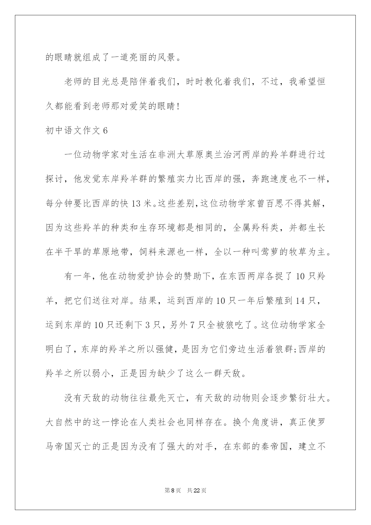 第PAGE\*Arabic\*MERGEFORMAT22页共NUMPAGES\*Arabic\*MERGEFORMAT22页第PAGE\*MERGEFORMAT22页共NUMPAGES\*MERGEFORMAT22页第PAGE\*MERGEFORMAT22页共NUMPAGES\*MERGEFORMAT22页第PAGE\*MERGEFORMAT22页共NUMPAGES\*MERGEFORMAT22页第PAGE\*MERGEFORMAT22页共NUMPAGES\*MERGEFORMAT22页第PAGE\*MERGEFORMAT22页共NUMPAGES\*MERGEFORMAT22页第PAGE\*MERGEFORMAT22页共NUMPAGES\*MERGEFORMAT22页第PAGE\*MERGEFORMAT22页共NUMPAGES\*MERGEFORMAT22页第PAGE\*MERGEFORMAT22页共NUMPAGES\*MERGEFORMAT22页第PAGE\*MERGEFORMAT22页共NUMPAGES\*MERGEFORMAT22页第PAGE\*MERGEFORMAT22页共NUMPAGES\*MERGEFORMAT22页2022初中语文作文初中语文作文15篇在平凡的学习、工作、生活中,大家总免不了要接触或运用作文吧,作文是从内部言语向外部言语的过渡,即从经过压缩的简要的、自己能明白的语言,向开展的、具有规范语法结构的、能为他人所理解的外部语言形式的转化。为了让您在写作文时更加简洁便利,以下是我帮大家整理的初中语文作文,欢迎阅读与保藏。初中语文作文1熟识的地方也有风景,雨过后,温热的风拂面而来,吹起额旁的发,风中带着淡淡的花香,清爽淡雅,引起我无尽的思绪。早晨,刺眼的阳光透过窗帘的缝隙照进房中,照在我的脸上,使我不得不睁开紧闭的双眼,穿衣起床,起先一天的生活,两点一线的生活。我扭头向床头看去,在那熟识的地方整整齐齐的摆着我的衣服,心头突然不禁有些触动,每天早晨那都放着我一天所用的东西,那是母亲放那的,以前我竟没有发觉床头那熟识的风景,在旭日的照耀下,那散发出暖和的光线,照亮我的心扉。床头处那熟识的风景,犹如一幅淡雅的水墨画,安静安好,带给我无尽的暖和与感动,它独自形成一处风景,使人看多久也不会厌烦,它总是静默地,使人不易感到它的漂亮,犹如母亲的爱一般。心头不禁涌起万千思绪,原来,熟识的地方也有风景,生活中不是缺少美,而是缺少发觉美的眼睛,观赏美的心。细细的去品尝,去体会,你或许会感到多种感情,或许会发觉熟识的地方风景无限美妙,往往引起无尽的遐想。"咚咚"的敲门声打断了我飞扬的思绪,母亲的话语传来"孩子,该起床了。"母亲的话语还是那样的柔软,滋润我的心田,暖和我的心房。年华安稳,岁月静好,微风拂面,吹起我额旁的发,嗅到那清爽淡雅的花香,犹如母亲的爱,那样润物细无声。床头那熟识的风景,映在我眼里,记在我心里。初中语文作文2夜深了,被主子摆放在桌子上的织布工具说起了静静话。“嘿,店员们!听说主子要运用我我们做一件美丽的衣裳呢!“快嘴的毛线先开了口。“真的吗?那真是太好了!平常主子对我们那么好,为她服务我真兴奋!“绣花针接过了话头儿,兴奋地说。”是呀是呀“家很兴奋能为主子效劳,都舍命地点头。”哼,一群白痴,“一个不和谐的声音传了过来,大家扭头一看,原来是穿着色调斑斓衣裳的布,”我才不要和你们这些脏兮兮的家伙一起合作呢!你们细致瞧瞧,我这么名贵,这么美丽,是你们能比的吗?“布说着,还扭了扭身体。”为什么?“毛线非常生气,不满地说道,“主子那么喜爱你,每天都要把你拿起来看一看,然后洗干净、晾好后放在桌子上,等客人来了还要把你拿出去让客人观赏一番,对你这样好,你竟不情愿为她做一件衣裳!”听了毛线的话,布高傲地说道:”她?她把我放到这个破旧的小屋里和一大堆蠢货放在一起叫对我好?要知道我可是从国外花重金买回来的呢!怎么可以和你们同日而语呢!我应当在豪华的别墅里的一张梳妆台上,和一些美丽的工具在一起,可谁知……“没等布说完,始终默默无语的剪刀听不下去了,只听“咔擦”一下,布的生命就被剪刀结束了。“店员,当时你要是肯和我们一起干,就不会酿成现在的悲剧了。”毛线瞅着已被剪成碎片的布,幸灾乐祸地说道。初中语文作文3隐私花园的大门已经打开;百合花瓣上的金粉已默然飘去;指间的水珠已叮咚落地。是的,万物总有终点,繁花总会落荆我,一个短暂的儿童生涯也已经淡然逝去。虽然无痕,但也留恋。现在,我却已经是一位中学生了,有了新的母校了。小学里很幸运,遇到的老师都如慈祥的父母,不轻易惩处我们。被“娇宠”惯了,