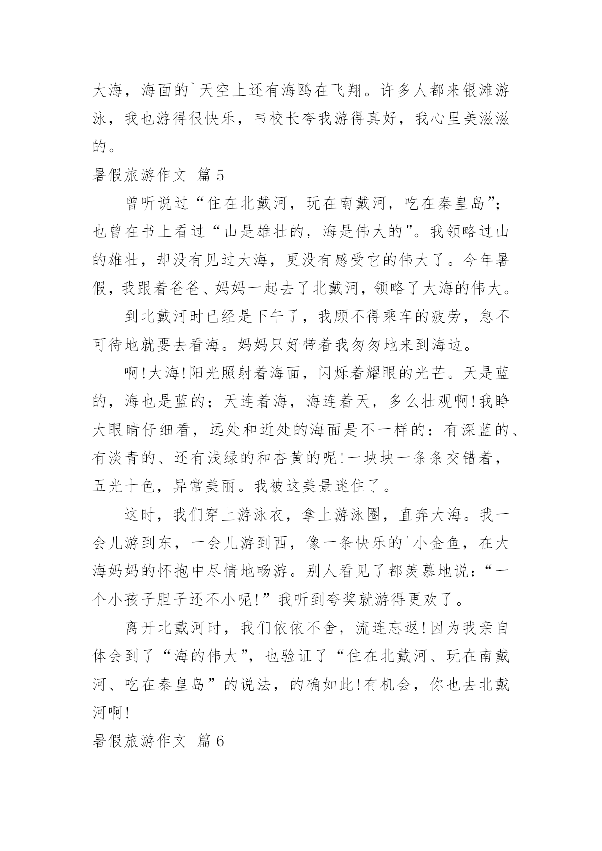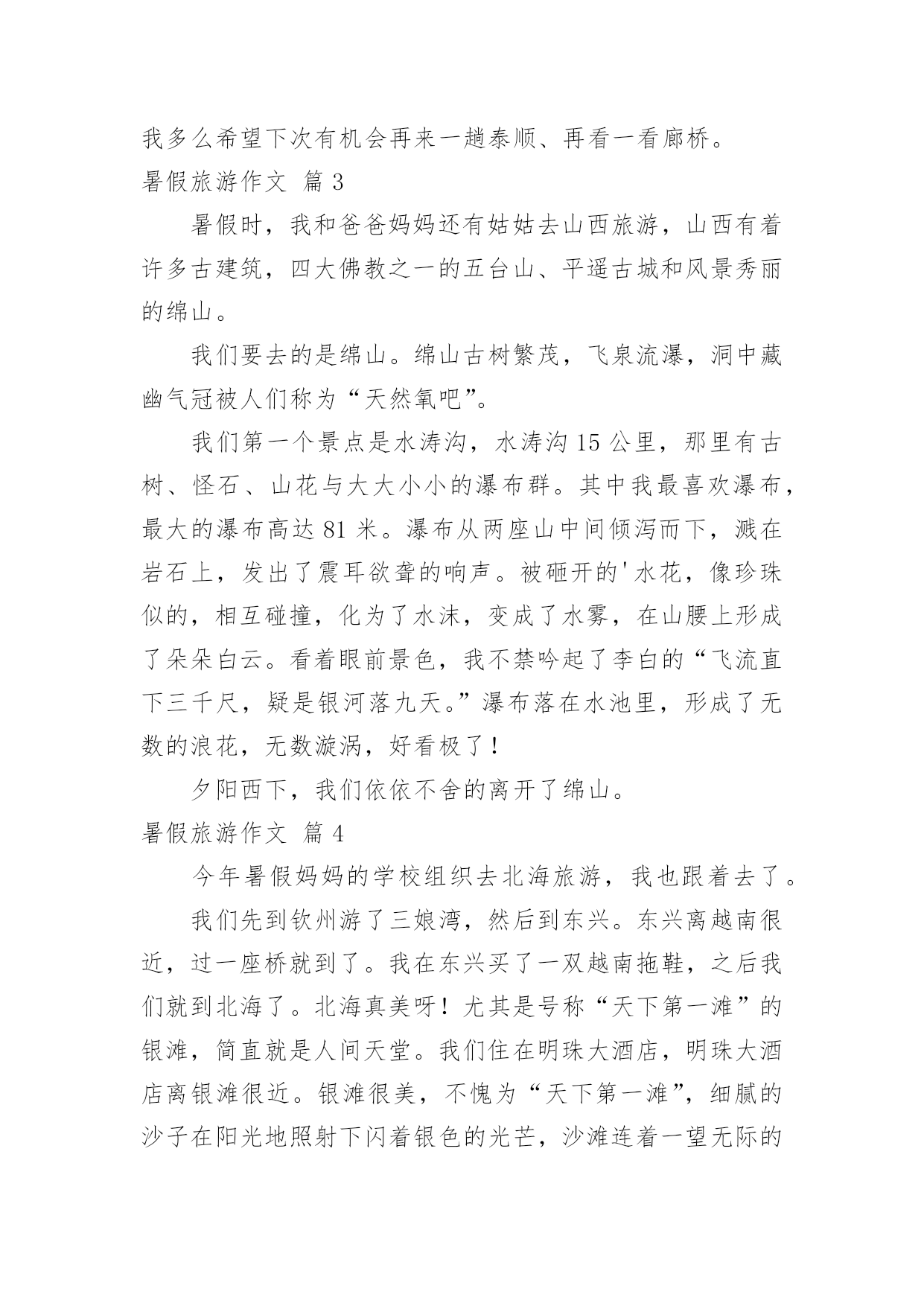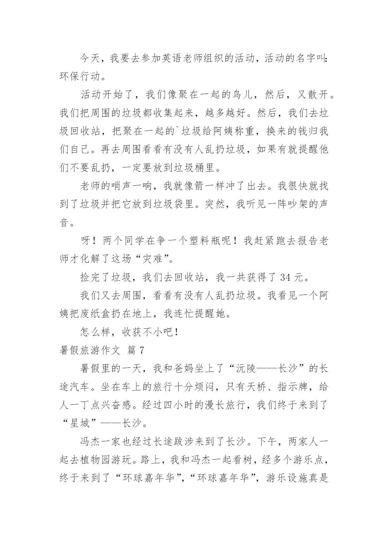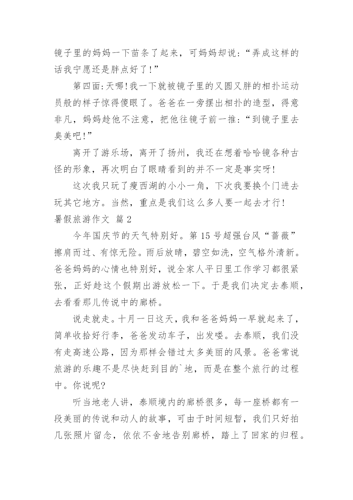 暑假旅游作文【精华】暑假旅游作文9篇在日常学习、工作抑或是生活中,大家都跟作文打过交道吧,借助作文人们可以实现文化交流的目的。你写作文时总是无从下笔?以下是小编整理的暑假旅游作文9篇,供大家参考借鉴,希望可以帮助到有需要的朋友。暑假旅游作文篇1古诗云:“烟花三月下扬州”。三月我们都在学校里,没有闲暇下扬州;暑假里虽然有大把的时间,无奈太阳的威力让我们望出门而生畏;最近台风频频,但一直与扬州擦肩而过,却带来了凉风习习、细雨点点。乘着这“天凉好个秋”,乘着这暑假的最后几天,我们和姑姑们四家人约定下扬州游瘦西湖。门票瘦西湖公园在暑假对未成年人是免费开放的,老年人和老师是半价。于是爸爸在公园门口让我们一行人排好队算了半天,原来只需要买他自己一个全票,而妈妈、姑姑们和奶奶都是半票,至于我、表妹、表姐、表哥则全是免票!郁闷的爸爸买好门票领着我们进门,公园里繁花似锦,道路两旁整齐地摆放着小水缸种植的荷花,可惜只见莲叶何田田,却一个花骨朵也看不见,这不免让人有些遗憾。不过很快惊喜出现了,我们看到了一大群洁白可爱的鸽子。鸽子瘦西湖的鸽子白白胖胖的,它们非常贪吃,人们只要把手伸出,手心向上,它们就会飞过来看看有什么好吃的,如果没有就飞走,如果有就停到手心上开始大吃一顿。我和表妹玩得不亦乐乎,我问表妹:“你觉得这些鸽子可爱吗?”表妹说:“不可爱,它们简直就像是自动送上门的美味!”可我一点都不觉的它们是自动送上门的,因为我每次引诱鸽子停在我手心后都想摸摸它们的羽毛,可一次也没摸到。当我手上的最后一粒玉米被吃掉时,我忍不住顺手一抓,意外地抓住了一只“呆鸽”。表哥看着那只倒霉的鸽子感叹道:“珍爱生命,远离吴迪!”妈妈则命令我把鸽子放开:“以后这只鸽子会有心理阴影,不敢停到人们的手上,我们就不能享受与鸽子亲密接触的乐趣了!”我放走了鸽子,说声对不起后继续前行,不久就脚酸了,幸好湖边停着很多代步工具——船。游船瘦西湖里有两种船:电动船和人工大船。本来我们有10个人应该坐大船的,可表妹一再坚持要坐电动船,还宣布说如果坐大船的.话她就宁愿不坐船了。我们没有办法说服这个有主见的小妹,就只好“如妹所愿”了。在确定上船人选时表哥和表姐坚决拒绝和我们同船,我妈妈也认为让大孩子照顾小孩子是最糟糕的选择,最后决定让我、表妹、小姑姑、爸爸组合上船。我和表妹争着想做船长去开船,但表妹先下手为强,第一个第一时间占领了驾驶座,我只好在副驾驶位置上耐心等待。小姑姑和爸爸做乘客,不会游泳的小姑姑一上船就穿上了橙色的救生衣,这成了我们这艘船的醒目标志,因为这可是唯一一件当时湖面上被穿在身上的救生衣啊!湖面上清风徐来,水波不兴,在湖面上的小船来回穿梭,你追我赶,我们玩得不亦乐乎。忽然迎面驶来一艘人工大船,眼看就要一头撞在一起了,大船上的船工大叫:“转弯!”岸上妈妈她们惊叫:“不好啦!不好啦!快撞了!……”可表妹早就手足无措,也不知该向哪个方向逃了,我爸爸理直气壮地对大船上的船工嚷道:“你让我们!”惊险中,两船擦肩而过,这下轮到我开船啦!哈哈镜下船后由于体力原因我们开始往出口走,看到了一个小小游乐场,因为台风下雨里面的设施基本停用了,只有几面哈哈镜前围着不少游客。我听到游客们不停的欢笑声,忍不住前去一探究竟。第一面:嘻!我变得矮矮的,像白雪公主里的小矮人,表哥看了直笑,可他1米83的个子竟然在镜子里和我一样高。第二面:呵!我变得胖胖的,像一个被惹恼的河豚,表妹把我挤到一旁,于是两只鼓气河豚出现了,乐得我们笑弯了腰。第三面:哈!我变得瘦瘦高高的,像根竹竿,比现实中的表哥瘦多了。我赶紧把一直认为自己太胖的妈妈拉来照镜子,镜子里的妈妈一下苗条了起来,可妈妈却说:“弄成这样的话我宁愿还是胖点好了!”第四面:天哪!我一下就被镜子里的又圆又胖的相扑运动员般的样子惊得傻眼了。爸爸在一旁摆出相扑的造型,得意非凡,妈妈趁他不注意,把他往镜子前一推:“到镜子里去臭美吧!”离开了游乐场,离开了扬州,我还在想着哈哈镜各种古怪的形象,再次明白了眼睛看到的并不一定是事实呀!这次我只玩了瘦西湖的小小一角,下次我要换个门进去玩其它地方。当然,重点是我们这么多人要一起去才行!暑假旅游作文篇2今年国庆节的天气特别好。第15号超强台风“蔷薇”擦肩而过、有惊无险。雨后放晴,碧空如洗,空气格外清新。爸爸妈妈的心情也特别好,说全家人平日里工作学习都很紧张,正好趁这个假期出游放松一下。于是我们决定去泰顺,去看看那儿传说中的廊桥。说走就走。十月一日这天,我和爸爸妈妈一早就起来了,简单收拾好行李,爸爸发动车子,出发喽。去泰顺,我们没有走高速公路,因为那样会错过太多美丽的风景。爸爸常说旅游的乐趣不是尽快赶到目的`地,而是在整个旅行的过程中。你说呢?听当地老人讲,泰顺境内的廊桥很多,每一座桥都有一段美丽的传说和动人的故事,可由于时间短暂,我