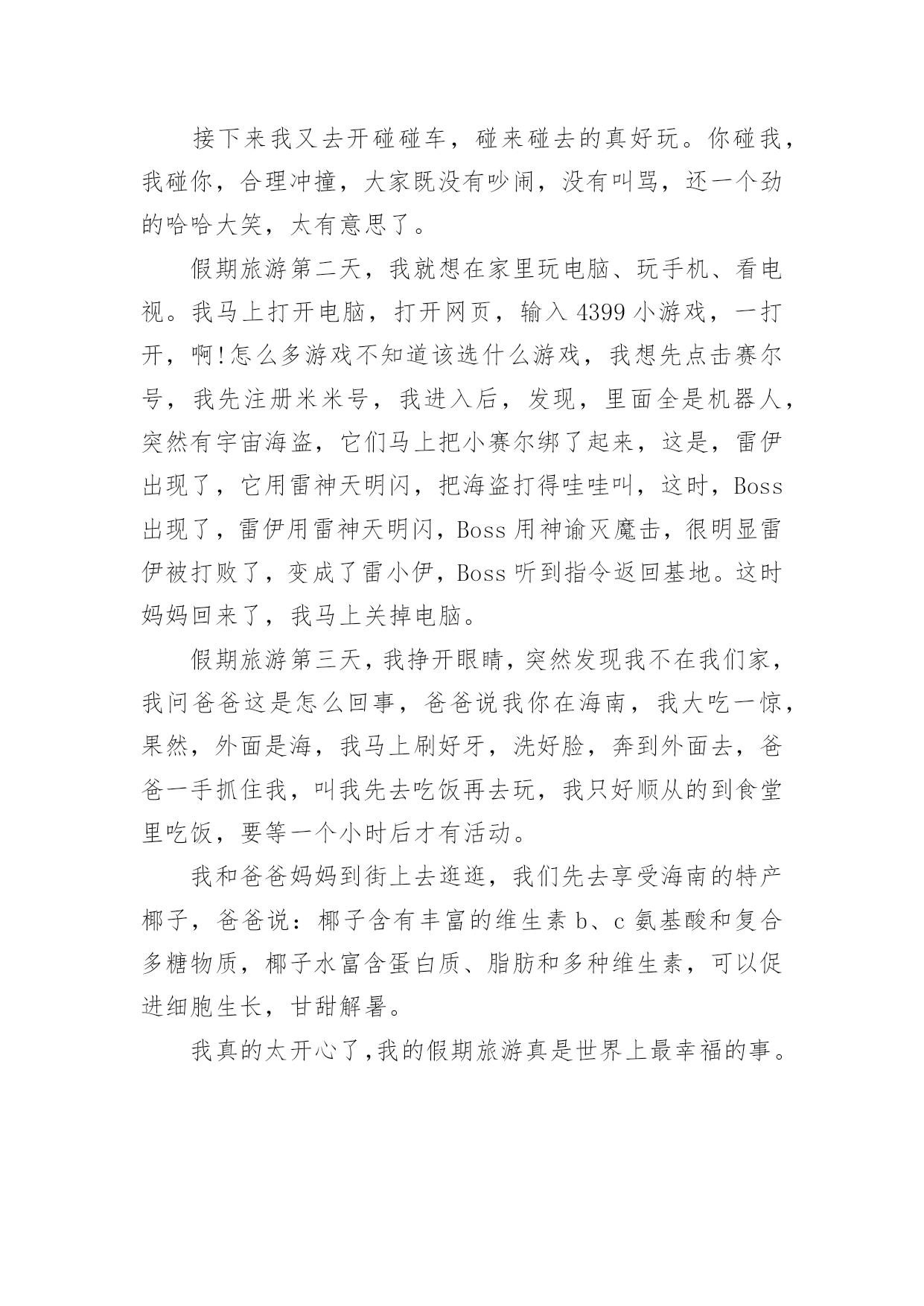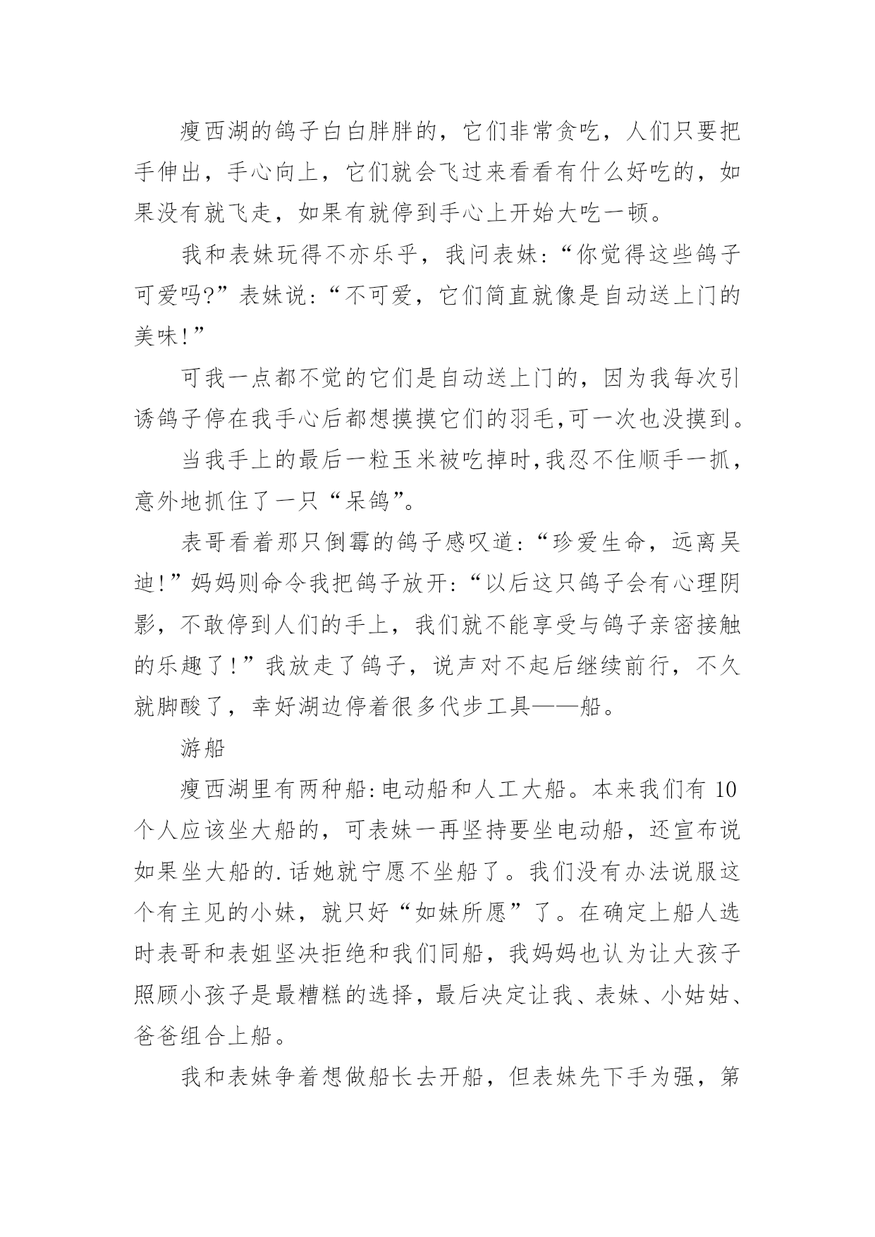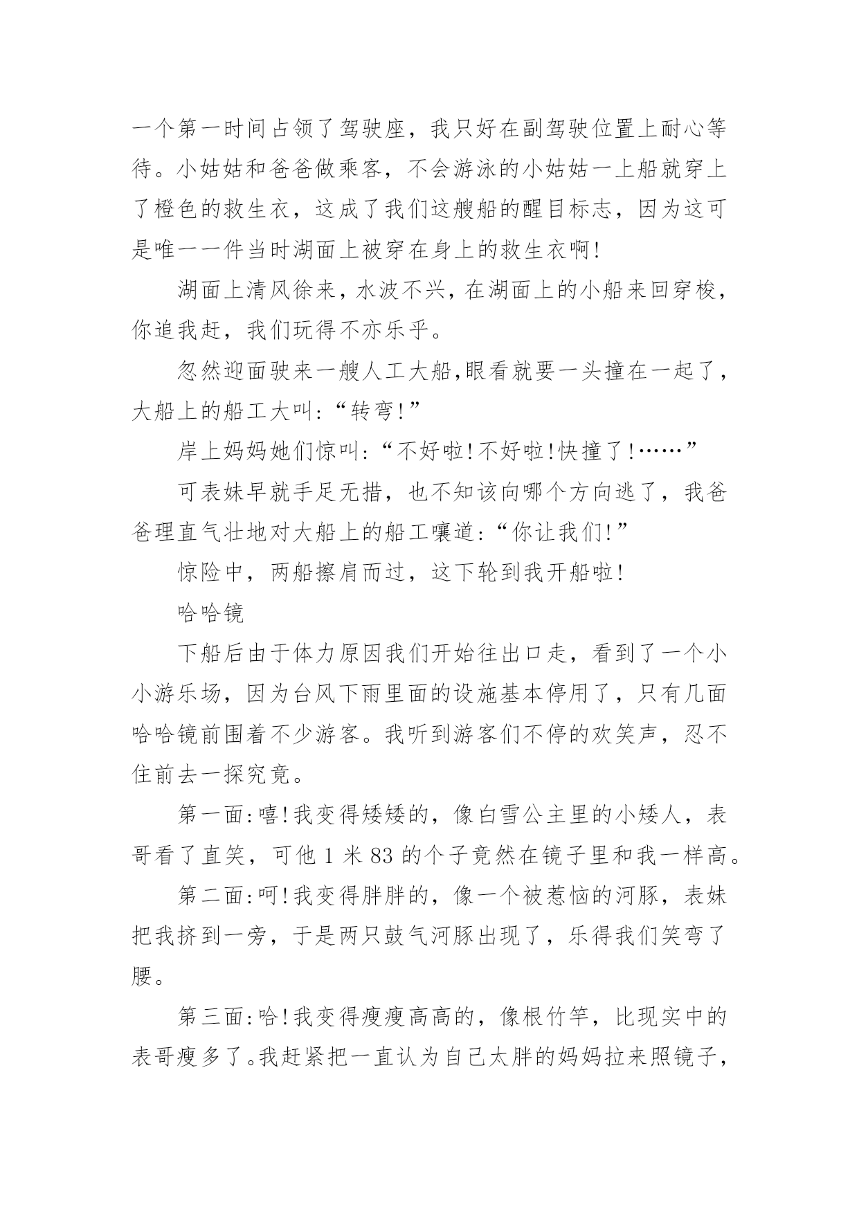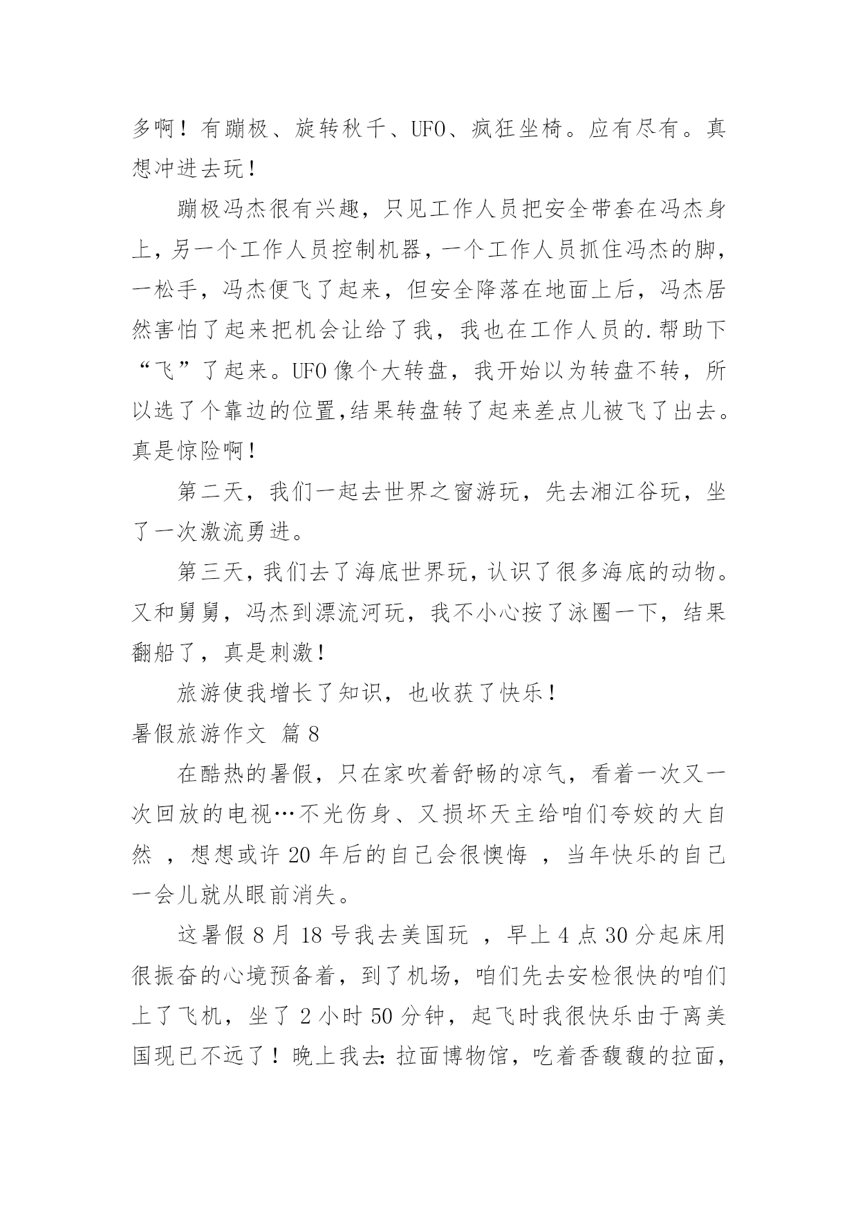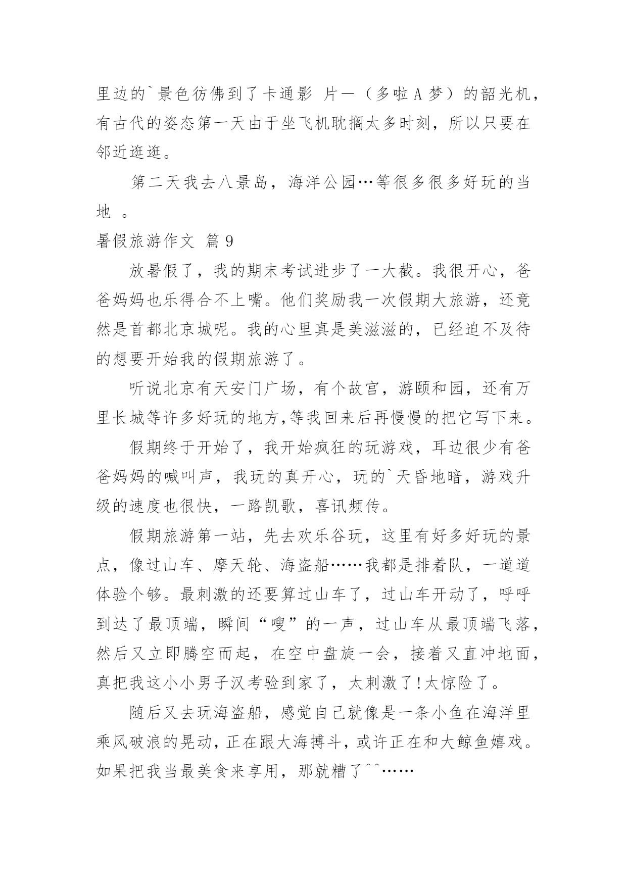 暑假旅游作文【精华】暑假旅游作文9篇在日常学习、工作抑或是生活中,大家都跟作文打过交道吧,借助作文人们可以实现文化交流的目的。你写作文时总是无从下笔?以下是小编整理的暑假旅游作文9篇,供大家参考借鉴,希望可以帮助到有需要的朋友。暑假旅游作文篇1古诗云:“烟花三月下扬州”。三月我们都在学校里,没有闲暇下扬州;暑假里虽然有大把的时间,无奈太阳的威力让我们望出门而生畏;最近台风频频,但一直与扬州擦肩而过,却带来了凉风习习、细雨点点。乘着这“天凉好个秋”,乘着这暑假的最后几天,我们和姑姑们四家人约定下扬州游瘦西湖。门票瘦西湖公园在暑假对未成年人是免费开放的,老年人和老师是半价。于是爸爸在公园门口让我们一行人排好队算了半天,原来只需要买他自己一个全票,而妈妈、姑姑们和奶奶都是半票,至于我、表妹、表姐、表哥则全是免票!郁闷的爸爸买好门票领着我们进门,公园里繁花似锦,道路两旁整齐地摆放着小水缸种植的荷花,可惜只见莲叶何田田,却一个花骨朵也看不见,这不免让人有些遗憾。不过很快惊喜出现了,我们看到了一大群洁白可爱的鸽子。鸽子瘦西湖的鸽子白白胖胖的,它们非常贪吃,人们只要把手伸出,手心向上,它们就会飞过来看看有什么好吃的,如果没有就飞走,如果有就停到手心上开始大吃一顿。我和表妹玩得不亦乐乎,我问表妹:“你觉得这些鸽子可爱吗?”表妹说:“不可爱,它们简直就像是自动送上门的美味!”可我一点都不觉的它们是自动送上门的,因为我每次引诱鸽子停在我手心后都想摸摸它们的羽毛,可一次也没摸到。当我手上的最后一粒玉米被吃掉时,我忍不住顺手一抓,意外地抓住了一只“呆鸽”。表哥看着那只倒霉的鸽子感叹道:“珍爱生命,远离吴迪!”妈妈则命令我把鸽子放开:“以后这只鸽子会有心理阴影,不敢停到人们的手上,我们就不能享受与鸽子亲密接触的乐趣了!”我放走了鸽子,说声对不起后继续前行,不久就脚酸了,幸好湖边停着很多代步工具——船。游船瘦西湖里有两种船:电动船和人工大船。本来我们有10个人应该坐大船的,可表妹一再坚持要坐电动船,还宣布说如果坐大船的.话她就宁愿不坐船了。我们没有办法说服这个有主见的小妹,就只好“如妹所愿”了。在确定上船人选时表哥和表姐坚决拒绝和我们同船,我妈妈也认为让大孩子照顾小孩子是最糟糕的选择,最后决定让我、表妹、小姑姑、爸爸组合上船。我和表妹争着想做船长去开船,但表妹先下手为强,第一个第一时间占领了驾驶座,我只好在副驾驶位置上耐心等待。小姑姑和爸爸做乘客,不会游泳的小姑姑一上船就穿上了橙色的救生衣,这成了我们这艘船的醒目标志,因为这可是唯一一件当时湖面上被穿在身上的救生衣啊!湖面上清风徐来,水波不兴,在湖面上的小船来回穿梭,你追我赶,我们玩得不亦乐乎。忽然迎面驶来一艘人工大船,眼看就要一头撞在一起了,大船上的船工大叫:“转弯!”岸上妈妈她们惊叫:“不好啦!不好啦!快撞了!……”可表妹早就手足无措,也不知该向哪个方向逃了,我爸爸理直气壮地对大船上的船工嚷道:“你让我们!”惊险中,两船擦肩而过,这下轮到我开船啦!哈哈镜下船后由于体力原因我们开始往出口走,看到了一个小小游乐场,因为台风下雨里面的设施基本停用了,只有几面哈哈镜前围着不少游客。我听到游客们不停的欢笑声,忍不住前去一探究竟。第一面:嘻!我变得矮矮的,像白雪公主里的小矮人,表哥看了直笑,可他1米83的个子竟然在镜子里和我一样高。第二面:呵!我变得胖胖的,像一个被惹恼的河豚,表妹把我挤到一旁,于是两只鼓气河豚出现了,乐得我们笑弯了腰。第三面:哈!我变得瘦瘦高高的,像根竹竿,比现实中的表哥瘦多了。我赶紧把一直认为自己太胖的妈妈拉来照镜子,镜子里的妈妈一下苗条了起来,可妈妈却说:“弄成这样的话我宁愿还是胖点好了!”第四面:天哪!我一下就被镜子里的又圆又胖的相扑运动员般的样子惊得傻眼了。爸爸在一旁摆出相扑的造型,得意非凡,妈妈趁他不注意,把他往镜子前一推:“到镜子里去臭美吧!”离开了游乐场,离开了扬州,我还在想着哈哈镜各种古怪的形象,再次明白了眼睛看到的并不一定是事实呀!这次我只玩了瘦西湖的小小一角,下次我要换个门进去玩其它地方。当然,重点是我们这么多人要一起去才行!暑假旅游作文篇2今年国庆节的天气特别好。第15号超强台风“蔷薇”擦肩而过、有惊无险。雨后放晴,碧空如洗,空气格外清新。爸爸妈妈的心情也特别好,说全家人平日里工作学习都很紧张,正好趁这个假期出游放松一下。于是我们决定去泰顺,去看看那儿传说中的廊桥。说走就走。十月一日这天,我和爸爸妈妈一早就起来了,简单收拾好行李,爸爸发动车子,出发喽。去泰顺,我们没有走高速公路,因为那样会错过太多美丽的风景。爸爸常说旅游的乐趣不是尽快赶到目的`地,而是在整个旅行的过程中。你说呢?听当地老人讲,泰顺境内的廊桥很多,每一座桥都有一段美丽的传说和动人的故事,可由于时间短暂,我