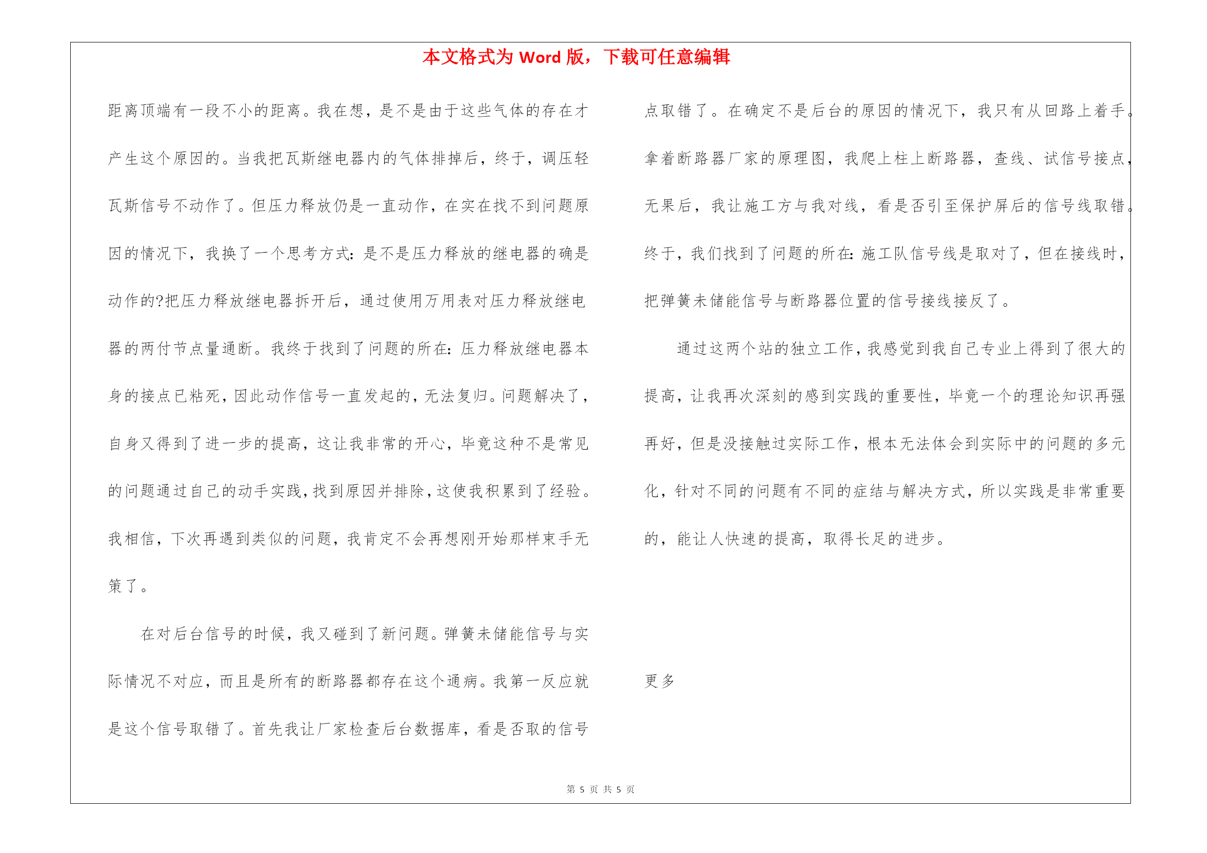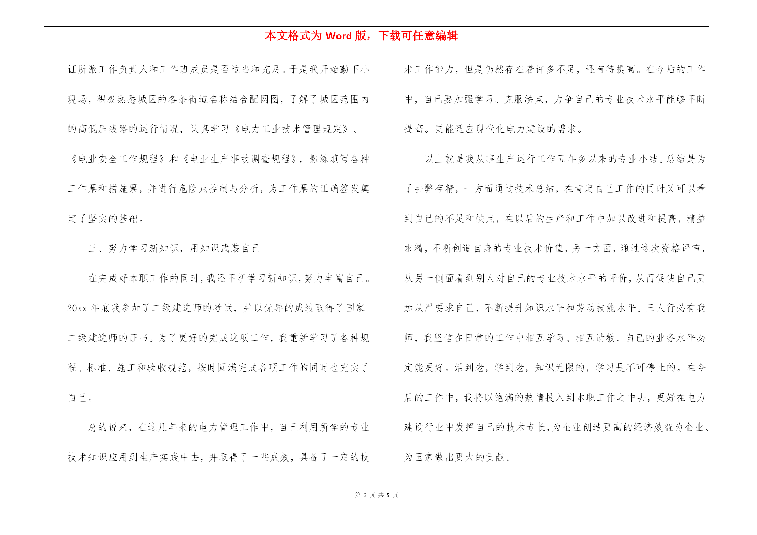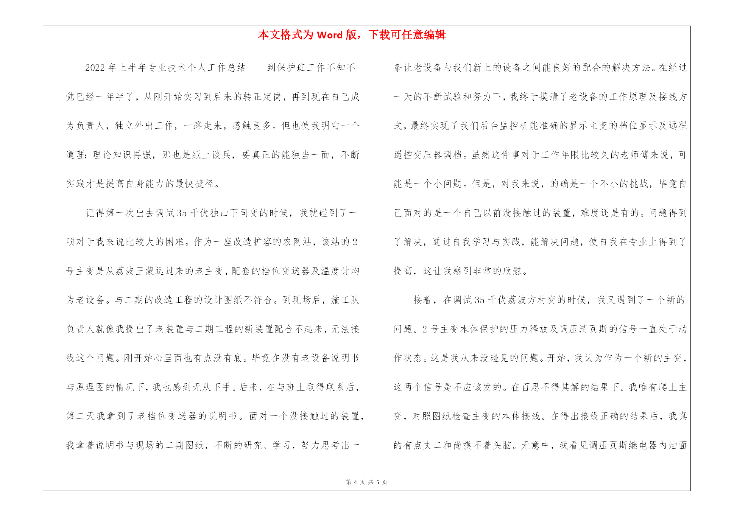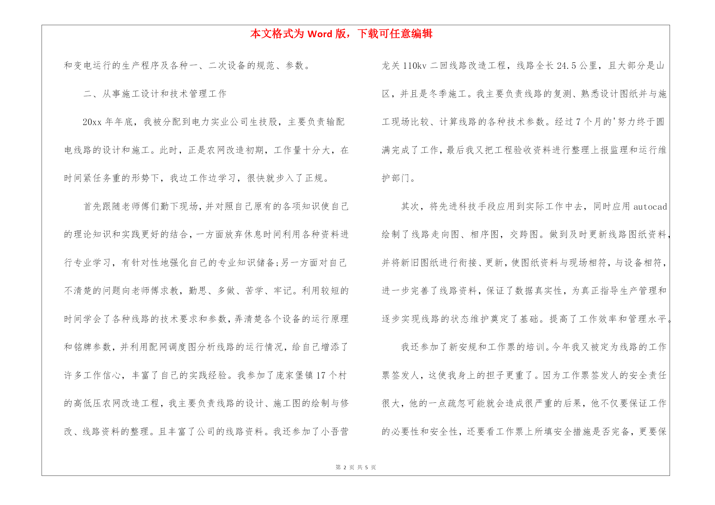 本文格式为Word版,下载可任意编辑第PAGE\*MERGEFORMAT5页共NUMPAGES\*MERGEFORMAT5页2022年上半年专业技术个人工作总结2022年上半年专业技术个人工作总结专业的人员的工作总结应该要以什么为主要内容着手去写呢?下面是应届毕业生我为大家搜集整理出来的有关于2022年上半年专业技术个人工作总结范文,欢迎阅读!2022年上半年业技术个人工作总结在20xx年8月进入电力实业公司参加工作至今。在这五年中,我先后在电力实业公司的线路班、变电班、生技股从事生产一线工作。在各位领导和同事的支持和帮助下,自己的思想、工作、学习等各方面都取得了一定的成绩,个人综合素质也得到了一定的提高,下面就从专业技术角度对我这五年来的工作做一次全面总结:电力企业是一个特殊的行业,它需要职工有良好的自身能力和心理素质,因此我不断学习各种技能,努力学习和掌握电力系统运行方式及其特点,了解全地区的配电网运行情况,同时能根据各类电气设备的需要,掌握相关的电工基础、电工材料、高压工程技术专业知识,能根据现场电气设备运行情况选择最佳运行方式及经济运行方法,根据实际运行经验,正确处理电气系统的设备故障以及系统突发性事故,初步了解班组管理和生产技术管理的基本常识,进一步加强自己的业务水平。一、学习生产运行专业知识,提高岗位劳动技能从20xx年参加工作,领导为了让我尽快转变角色,熟悉工作环境,适应生产要求,我先后被分配至电力实业公司的线路班和变电班从事线路架设、电缆敷设、高压试验、继保及变电检修等工作。工作伊始,我发现学校里学到的专业知识同生产实际有很大的不同和差距。为此我努力学习生产运行专业知识,努力提高自己的岗位劳动技能,在短短的一年内,我主动吸收老师傅们的工作经验,虚心向他们请教工作中的技术问题,并通过自己的努力,迅速掌握了线路和变电运行的生产程序及各种一、二次设备的规范、参数。二、从事施工设计和技术管理工作20xx年年底,我被分配到电力实业公司生技股,主要负责输配电线路的设计和施工。此时,正是农网改造初期,工作量十分大,在时间紧任务重的形势下,我边工作边学习,很快就步入了正规。首先跟随老师傅们勤下现场,并对照自己原有的各项知识使自己的理论知识和实践更好的结合,一方面放弃休息时间利用各种资料进行专业学习,有针对性地强化自己的专业知识储备;另一方面对自己不清楚的问题向老师傅求教,勤思、多做、苦学、牢记。利用较短的时间学会了各种线路的技术要求和参数,弄清楚各个设备的运行原理和铭牌参数,并利用配网调度图分析线路的运行情况,给自己增添了许多工作信心,丰富了自己的实践经验。我参加了庞家堡镇17个村的高低压农网改造工程,我主要负责线路的设计、施工图的绘制与修改、线路资料的整理。且丰富了公司的线路资料。我还参加了小吾营龙关110kv二回线路改造工程,线路全长24.5公里,且大部分是山区,并且是冬季施工。我主要负责线路的复测、熟悉设计图纸并与施工现场比较、计算线路的各种技术参数。经过7个月的'努力终于圆满完成了工作,最后我又把工程验收资料进行整理上报监理和运行维护部门。其次,将先进科技手段应用到实际工作中去,同时应用autocad绘制了线路走向图、相序图,交跨图。做到及时更新线路图纸资料,并将新旧图纸进行衔接、更新,使图纸资料与现场相符,与设备相符,进一步完善了线路资料,保证了数据真实性,为真正指导生产管理和逐步实现线路的状态维护奠定了基础。提高了工作效率和管理水平。我还参加了新安规和工作票的培训。今年我又被定为线路的工作票签发人,这使我身上的担子更重了。因为工作票签发人的安全责任很大,他的一点疏忽可能就会造成很严重的后果,他不仅要保证工作的必要性和安全性,还要看工作票上所填安全措施是否完备,更要保证所派工作负责人和工作班成员是否适当和充足。于是我开始勤下小现场,积极熟悉城区的各条街道名称结合配网图,了解了城区范围内的高低压线路的运行情况,认真学习《电力工业技术管理规定》、《电业安全工作规程》和《电业生产事故调查规程》,熟练填写各种工作票和措施票,并进行危险点控制与分析,为工作票的正确签发奠定了坚实的基础。三、努力学习新知识,用知识武装自己在完成好本职工作的同时,我还不断学习新知识,努力丰富自己。20xx年底我参加了二级建造师的考试,并以优异的成绩取得了国家二级建造师的证书。为了更好的完成这项工作,我重新学习了各种规程、标准、施工和验收规范,按时圆满完成各项工作的同时也充实了自己。总的说来,在这几年来的电力管理工作中,自已利用所学的专业技术知识应用到生产实践中去,并取得了一些成效,具备了一定的技术工作能力,但是仍然存在着许多不足,还有待提高。在今后的工作中,自已要加强学习、克服缺点,力争自己的专业技术水平能够不断提高。更能适应现