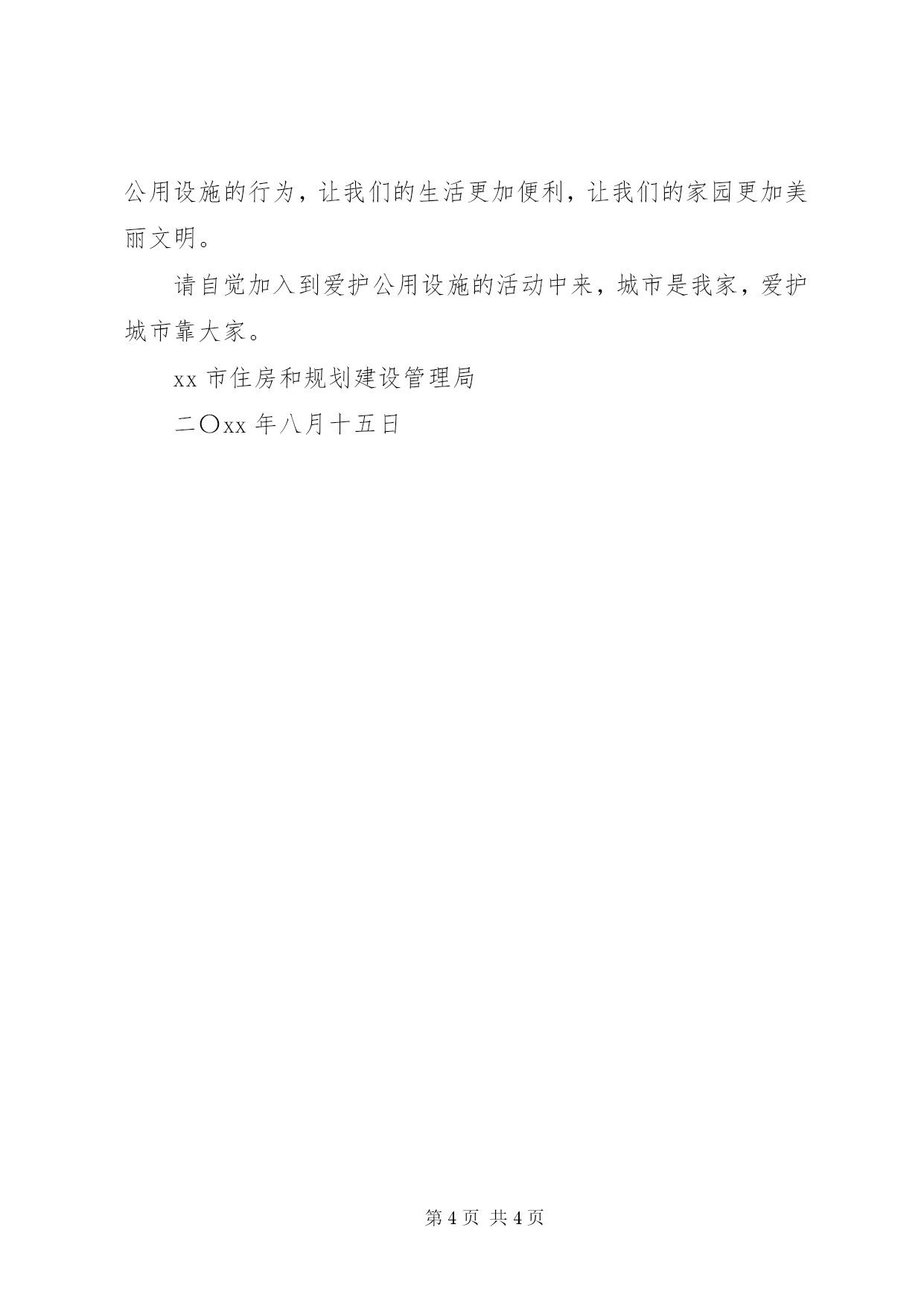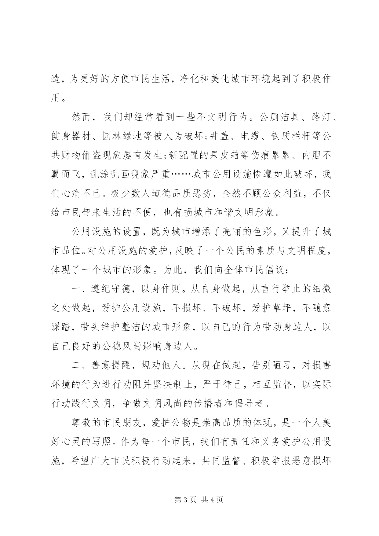 第PAGE\*Arabic\*MERGEFORMAT4页共NUMPAGES\*MERGEFORMAT4页爱护公共设施的倡议书【一】尊敬的家长、学生朋友:文明城市,是我们共同的荣耀。作为xx市民,我们既是城市文明的受益者,更是城市文明的创造者,我们有责任、有义务践行文明一言一行,推进全国卫生城市、全国文明城市的建设步伐。为此,北竹岛小学向全体家长、学生发出倡议:1.实施“爱护设施,保护环境”行动。自觉增强文明意识,自觉遵守公共道德。爱护公共设施,不损坏体育健身器材、不在公共场所乱刻乱画;保持公共卫生整洁,不乱扔果皮、纸屑垃圾,不随地吐口香糖;珍惜一草一木,不践踏绿地草坪、不攀折花草树木。2.实施“文明出行,文明交通”行动。自觉遵守交通法规,养成文明出行的良好习惯,不乱闯红灯、不逆行、不横穿马路、不在机动车道骑行、不追逐打闹;排队候车、依次上车、主动让座、先下后上。做到文明行走,文明乘车,文明骑车,文明游园(上下学期间、休假期间不在崇义园、胜溪湖等公园骑自行车、折花、踩草、追逐打闹),形成互谅互让、和谐相处、安全畅通的文明秩序。3.实施“文明用语”行动。自觉遵守文明礼仪,诚实守信,礼貌待人;举止文明,言行得当,管住我们的嘴,不说脏话,告别污言秽语。谈吐斯文,礼貌大方,自觉使用礼貌用语:请、您、您好、谢谢、对不起、没关系、再见等,让我们的话语像春风般和善悦耳。4.实施“文明传递”行动。以微笑传递文明,语言传递文明,和别人接触时,面带微笑,以适宜的方式,主动和别人打招呼,让微笑拉近人与人的距离,体现文明内涵,彰显乐观自信、开放包容、亲切温馨的城市形象。宣传、遵守交通规则和爱护公共设施、爱护公共环境的重要意义,影响、带动周围市民不断自我提高,达到“一个文明学生带动一个文明家庭、一个文明家庭推动文明社区”的目的。美好心灵是文明行为的前提,文明的行动是美好心灵的外化。播种行为,收获习惯;播种习惯,收获性格;播种性格,收获命运。尊敬的家长先生、学生朋友,让我们自觉行动起来吧。从我做起,从现在做起,从小事做起,携手努力,共创文明威海,让威海的天地更洁净,让威海的环境更美好,让威海的氛围更和谐。【二】尊敬的市民朋友们:公用设施是城市基础建设的组成部分,是一个城市文明程度、发展水平和综合功能的集中体现。近年来,在市委、市政府高度重视与大力支持下,我市XX县区的基础设施着重进行了升级改造,为更好的方便市民生活,净化和美化城市环境起到了积极作用。然而,我们却经常看到一些不文明行为。公厕洁具、路灯、健身器材、园林绿地等被人为破坏;井盖、电缆、铁质栏杆等公共财物偷盗现象屡有发生;新配置的果皮箱等伤痕累累、内胆不翼而飞,乱涂乱画现象严重……城市公用设施惨遭如此破坏,我们心痛不已。极少数人道德品质恶劣,全然不顾公众利益,不仅给市民带来生活的不便,也有损城市和谐文明形象。公用设施的设置,既为城市增添了亮丽的色彩,又提升了城市品位。对公用设施的爱护,反映了一个公民的素质与文明程度,体现了一个城市的形象。为此,我们向全体市民倡议:一、遵纪守德,以身作则。从自身做起,从言行举止的细微之处做起,爱护公用设施,不损坏、不破坏,爱护草坪,不随意踩踏,带头维护整洁的城市形象,以自己的行为带动身边人,以自己良好的公德风尚影响身边人。二、善意提醒,规劝他人。从现在做起,告别陋习,对损害环境的行为进行劝阻并坚决制止,严于律己,相互监督,以实际行动践行文明,争做文明风尚的传播者和倡导者。尊敬的市民朋友,爱护公物是崇高品质的体现,是一个人美好心灵的写照。作为每一个市民,我们有责任和义务爱护公用设施,希望广大市民积极行动起来,共同监督、积极举报恶意损坏公用设施的行为,让我们的生活更加便利,让我们的家园更加美丽文明。请自觉加入到爱护公用设施的活动中来,城市是我家,爱护城市靠大家。xx市住房和规划建设管理局二〇xx年八月十五日