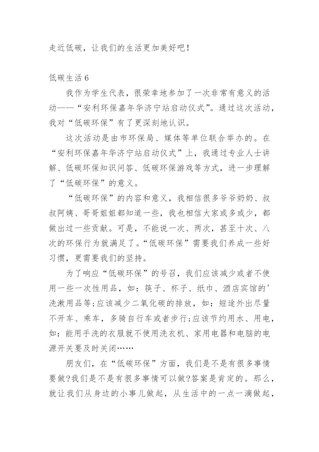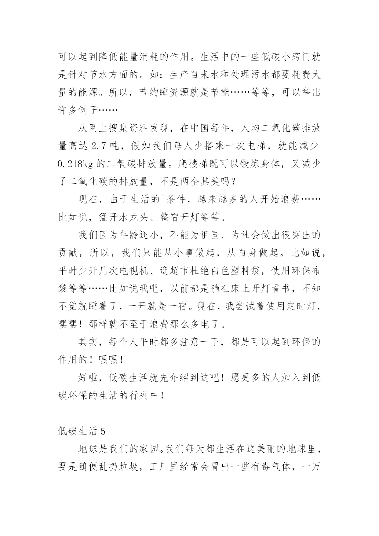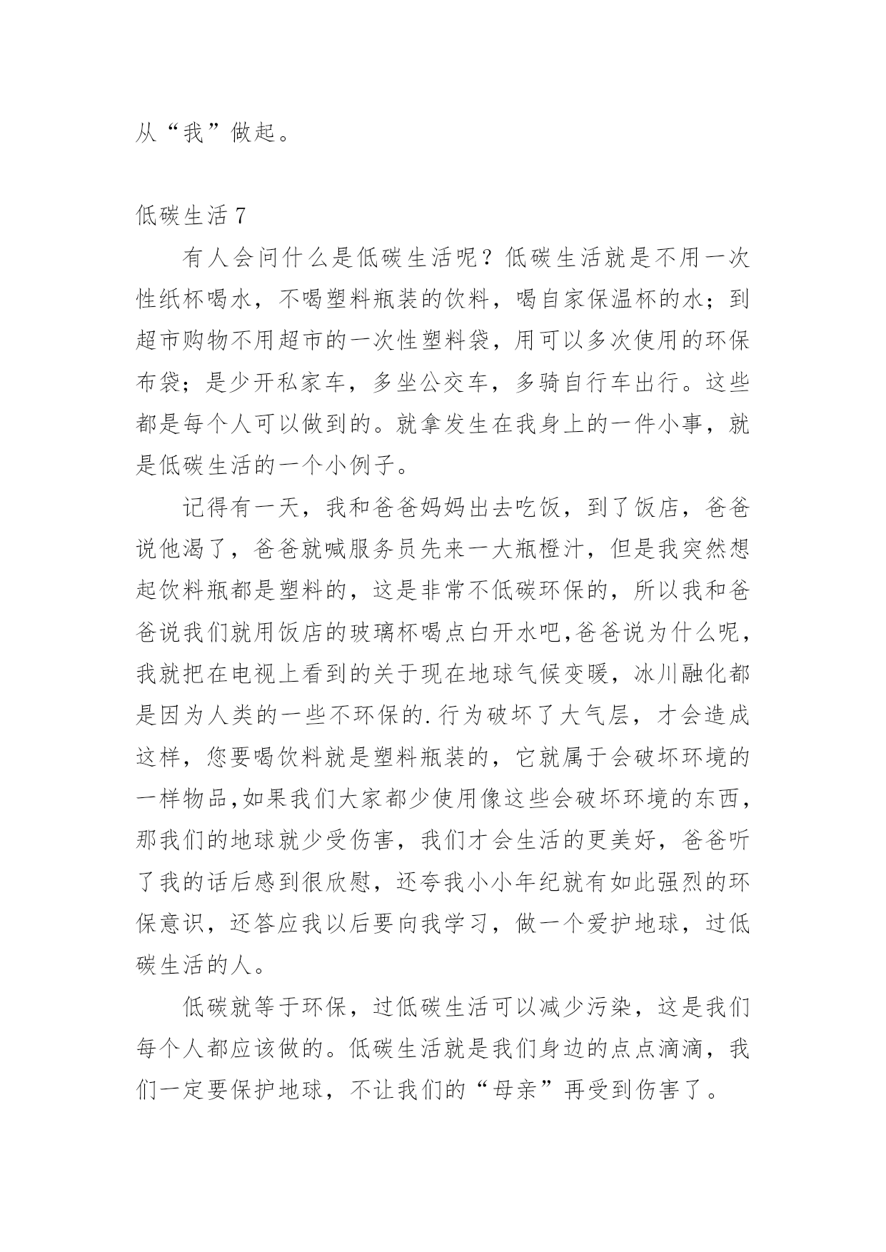 低碳生活(通用)低碳生活15篇低碳生活1我们居住在一个被大气所包围的蓝色星球,这就是地球。地球本来是一个美丽的星球,可是如今已经虚弱不堪。而这些正是因为我们的破坏,例如:白色污染,空气污染,工业污染,水污染……说都说不完了。人们也逐渐认识到了自己的过错,正在竭尽全力的弥补自己所犯下的过错。每个有良知的人都在行动。作为地球主人的`一份子,为更好地保护地球,为了人类的炎黄子孙,我和爸爸、妈妈也开展起了低碳生活。自从我们开始低碳生活以来,除非阴天下雨,才开私家车,爸爸妈妈上下班、我上下学再也不开私家车了。有一次,我们去较远的地方购物,我说:“不要用塑料袋,我们要用布袋。”妈妈挑选了少量的东西,正准备去付钱,爸爸连忙上前阻止,说:“购物太少不太好,尽可能地一次性购足,就少了几次购物,也就省了油耗,还节能环保,更减少了汽车尾气。”妈妈说:“这是个好办法。”于是,我们就尽量把所需的东西一次性买足,这真是既省时又省力。在日常生活中,我们还非常注意节约用水。听爸爸说,水现在已经是非常稀缺的资源了,节约用水也是低碳生活。这样坚持,一个月下来,我们不但减少了汽车尾气的排放量,而且锻炼了身体,还为家里节约了一大笔开支呢,真是一举多得呀!同学们,做到低碳环保只是一种态度,而不是能力。我们应该从节电、节水、节碳、节油、节气这种小事做起,从一点一滴做起,一起去建立低碳绿色的生活方式,只要我们大家一起去行动,就一定可以让我们的生活更加低碳环保,从而让我们共同的地球拥有更美好的明天。朋友们,为了让天儿更蓝,花儿更香,草儿更绿,为了让鸟儿的歌声更加辽亮,赶快加入低碳生活行动吧!低碳生活2金秋十月,丹桂飘香。妈妈建议全家周末到三湾公园去踏秋赏枫,采集一些枫叶回来做书签,让紧张学习了一周的我放松一下。这个建议得到我和爸爸的一致赞成。“美琪学校前段时间不是向全体师生发出了低碳生活,绿色出行的倡议吗?这次出游我们不开车,来一次绿色出行怎么样?”爸爸提议。“绿色出行是好,但走路去三湾太远了,要不我们骑电动自行车去,这样既可以避免路上交通拥堵,又减少了汽车尾气二氧化碳的排放。”妈妈说。“可我从书上看到电动自行车也不完全低碳环保呀?电动自行车的电池废弃后,电池的外壳会慢慢地腐蚀,其中的.重金属物质会逐渐渗入水体和土壤,造成严重污染。这样不仅浪费能源,而且引发土地和地下水新的环境健康问题。”我疑惑道。“是呀!四年级的小学生环保意识果然有提高!爸爸赞你一个!胡靖宜你前段时间不是学会骑自行车了嘛,周末,我们全家就骑自行车出行一起去三湾公园行吗?骑自行车不但可以锻炼身体,还低碳环保,一举两得。”爸爸点头赞许道。在爸爸妈妈的陪伴下,我们一起骑着自行车,向着运河三湾公园出发。很快,我们就来到了三湾公园,那里的空气可真好啊!这样的低碳绿色出行真好,如果我们大家都能行动起来。相信我们的地球家园会变得更美好、更美丽!低碳生活3尽管生活水平提高了,但人类的生活环境和气候却在恶化。人类已经开始重视低碳生活方式,绿色环保。我们怎样才能过低碳生活并成为绿色呢?首先,我认为我们应该从日常行为开始,做身边的小事。爱护树木,不要乱砍树。保护动物和维护生态平衡;用可重复使用或可回收的袋子代替塑料袋可以减少垃圾的存在。节约资源也是一种低碳生活,一种绿色环保的方式!在我们的日常生活中,我们可以用洗菜水浇花,用淘米水洗碗,用水冲厕所,用节能灯等等。这些都是我们能用一颗小小的心做的事情。汽车尾部排放二氧化碳。如果我们要去的地方不远,步行或骑自行车可以减少二氧化碳排放,锻炼我们的身体。它真是一举两得!夏天来了,天气越来越热。我们都打开空键,但是空键也会释放二氧化碳,如果我们吸收更多的二氧化碳,会对我们的身体造成伤害。因此,我们应该将空的温度调节到256度,尽量少吹空的'空气,打开更多的窗户,让更多的空气进入,从而减少大量二氧化碳的排放,有利于我们的健康。你知道吗?一个小电池会在产生的种子中产生大量的碳,而废弃的电池会对地球的土壤成分造成巨大的损害。因此,我们应该尽量少用不可重复使用的电池。一些我们通常在家里喝的食物瓶子和一些无用的废纸盒可以通过我们的手来组装它们而变成贵重物品。例如,喝完牛奶后,可以把它们的头切下来,简单地修剪一下,把它们变成小笔盒。理解低碳生活,坚持低碳生活,从我们身边一点一滴做起,为人类建设一个美丽的地球!低碳生活4自从城市在宣传倡导低碳生活后,低碳生活对我们来说就一点也不陌生了……说起低碳生活,无非就是跟环保有关,那么,低碳生活究竟是什么呢?下面,就有偶来给大家介绍一下:低碳生活呢!其实就是在日常生活中,尽最大限度地减少一切不必要的消耗。当然,低碳主要还是指减少二氧化碳的排放量啦。其实,我们只要平时多多注意生活中的一些小细节,是可以起到降低能量消耗的作用。生活中的一些低碳小窍门就是针对节水方