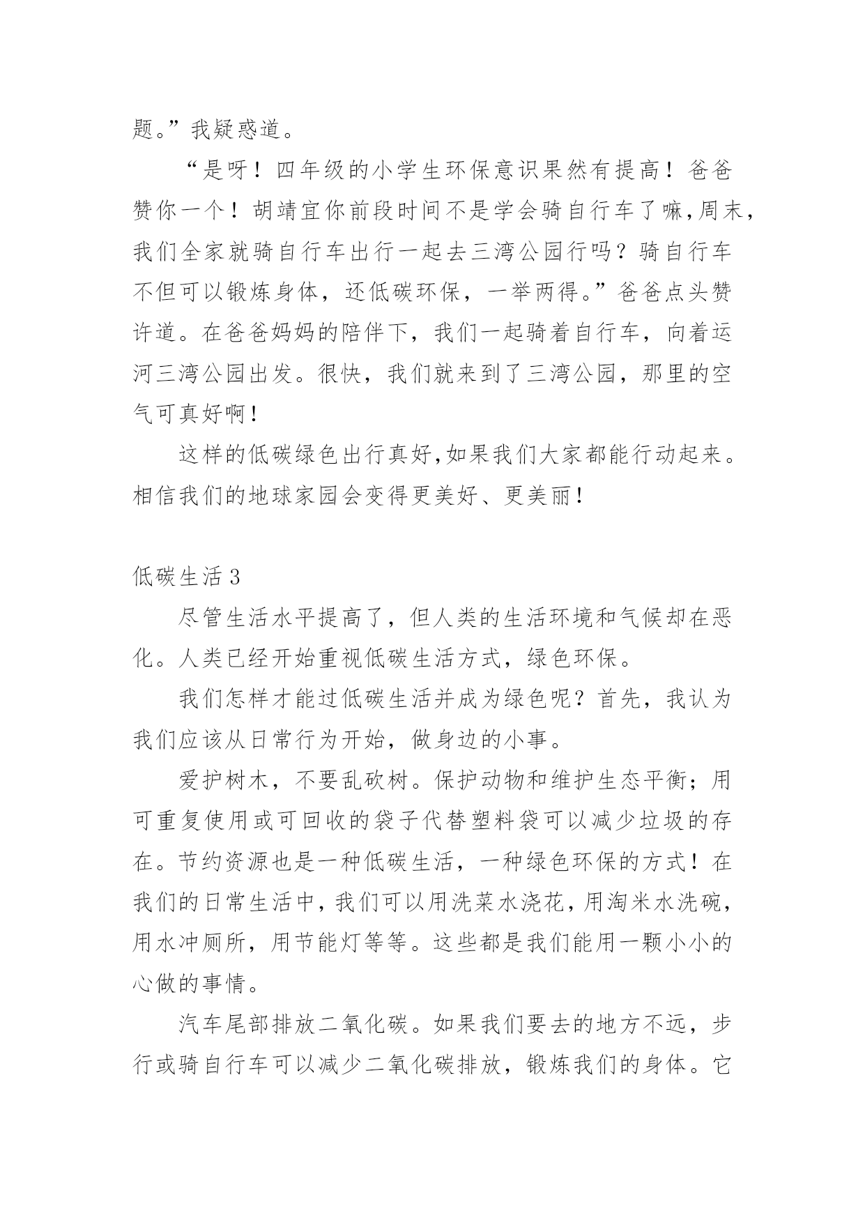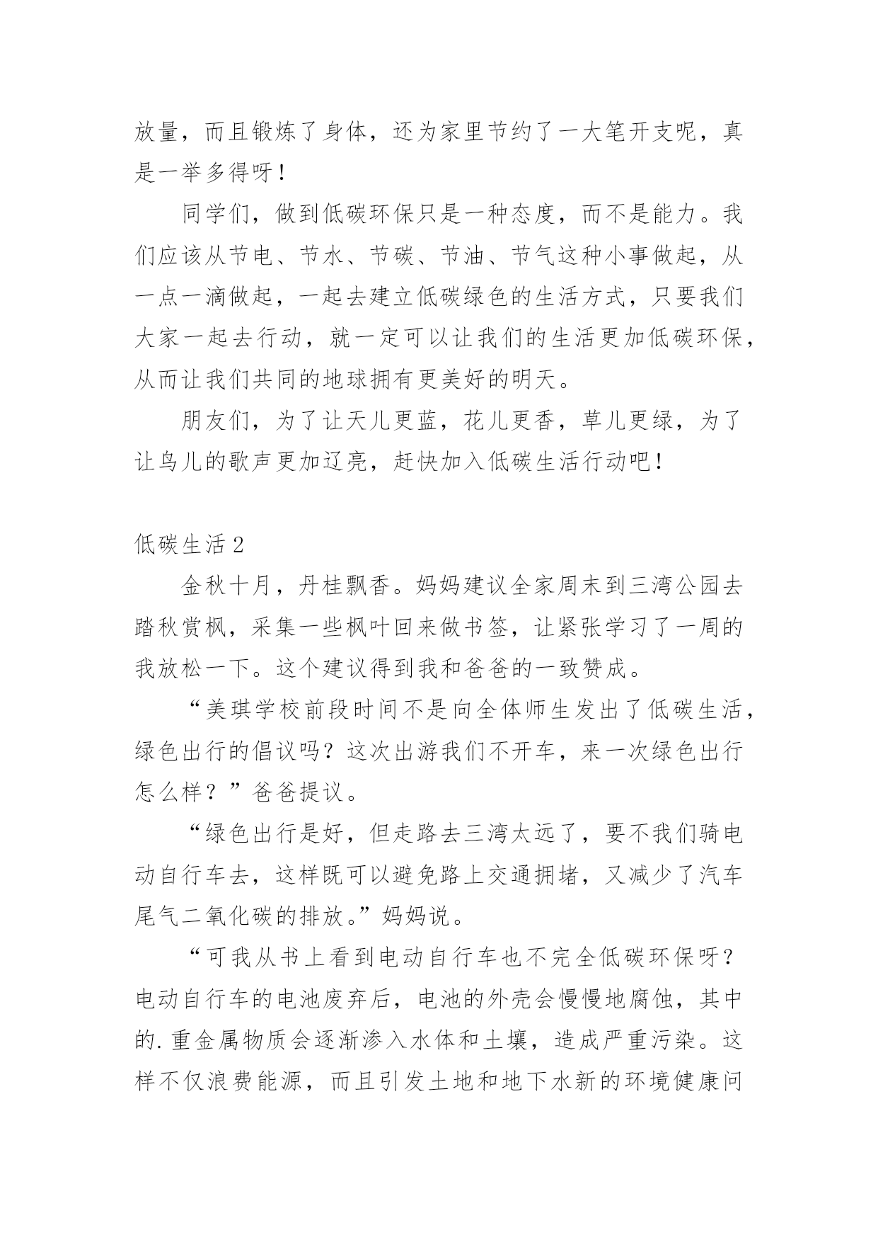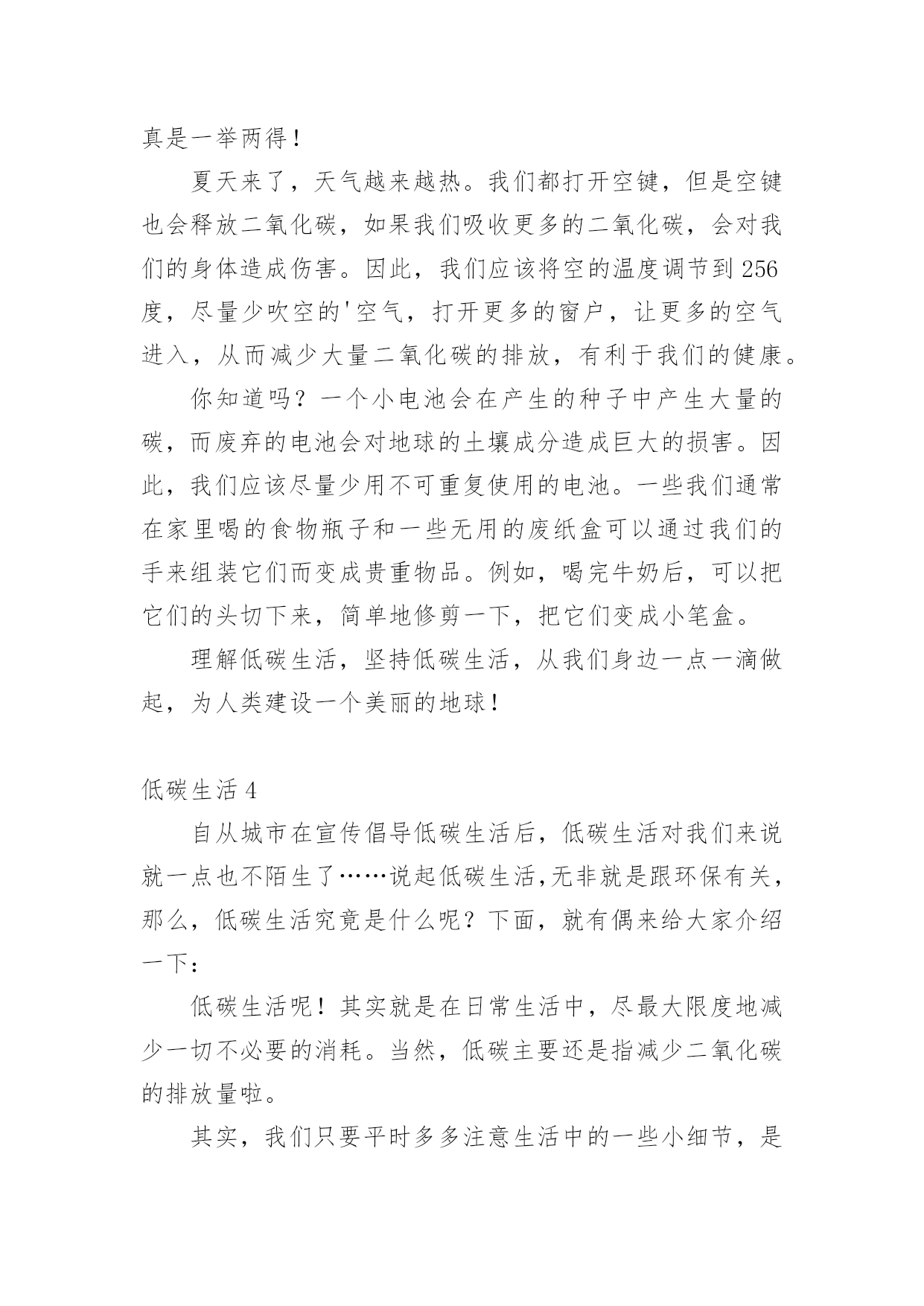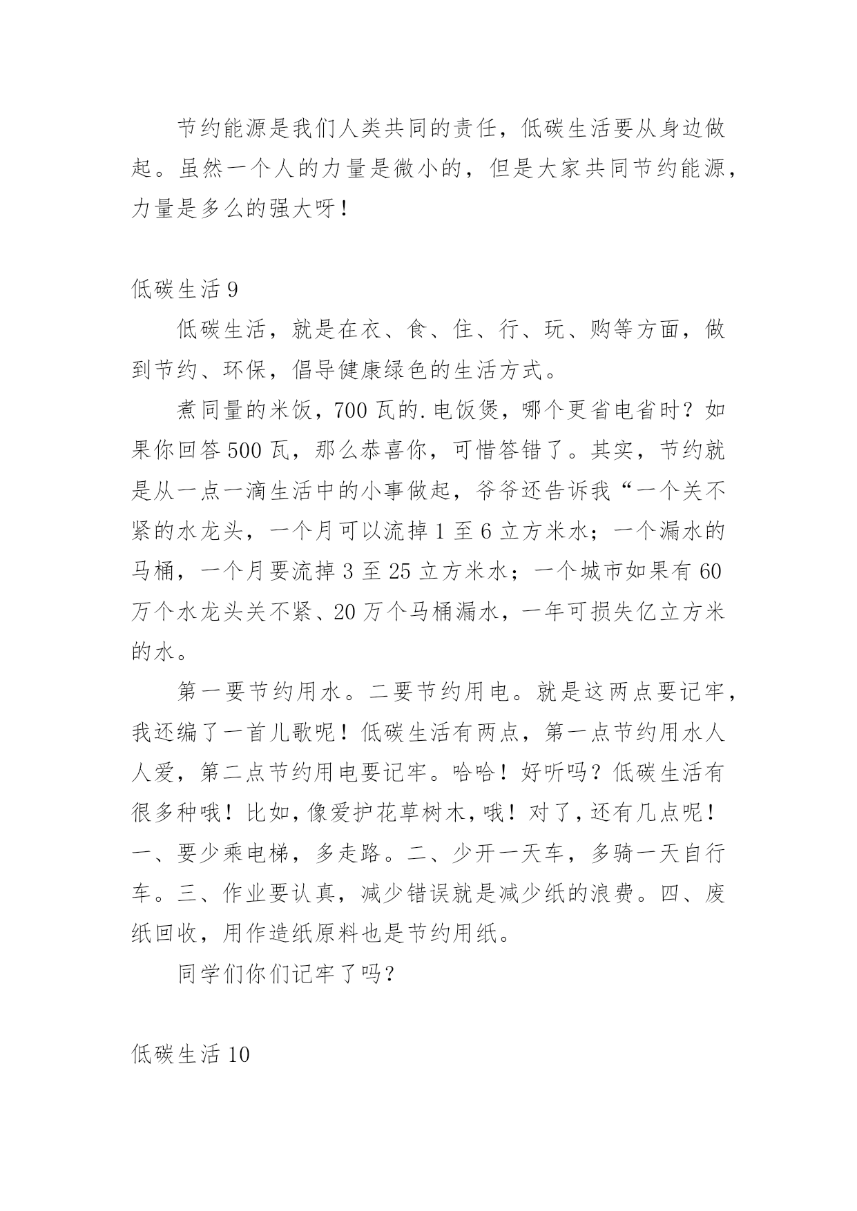 低碳生活(通用)低碳生活15篇低碳生活1我们居住在一个被大气所包围的蓝色星球,这就是地球。地球本来是一个美丽的星球,可是如今已经虚弱不堪。而这些正是因为我们的破坏,例如:白色污染,空气污染,工业污染,水污染……说都说不完了。人们也逐渐认识到了自己的过错,正在竭尽全力的弥补自己所犯下的过错。每个有良知的人都在行动。作为地球主人的`一份子,为更好地保护地球,为了人类的炎黄子孙,我和爸爸、妈妈也开展起了低碳生活。自从我们开始低碳生活以来,除非阴天下雨,才开私家车,爸爸妈妈上下班、我上下学再也不开私家车了。有一次,我们去较远的地方购物,我说:“不要用塑料袋,我们要用布袋。”妈妈挑选了少量的东西,正准备去付钱,爸爸连忙上前阻止,说:“购物太少不太好,尽可能地一次性购足,就少了几次购物,也就省了油耗,还节能环保,更减少了汽车尾气。”妈妈说:“这是个好办法。”于是,我们就尽量把所需的东西一次性买足,这真是既省时又省力。在日常生活中,我们还非常注意节约用水。听爸爸说,水现在已经是非常稀缺的资源了,节约用水也是低碳生活。这样坚持,一个月下来,我们不但减少了汽车尾气的排放量,而且锻炼了身体,还为家里节约了一大笔开支呢,真是一举多得呀!同学们,做到低碳环保只是一种态度,而不是能力。我们应该从节电、节水、节碳、节油、节气这种小事做起,从一点一滴做起,一起去建立低碳绿色的生活方式,只要我们大家一起去行动,就一定可以让我们的生活更加低碳环保,从而让我们共同的地球拥有更美好的明天。朋友们,为了让天儿更蓝,花儿更香,草儿更绿,为了让鸟儿的歌声更加辽亮,赶快加入低碳生活行动吧!低碳生活2金秋十月,丹桂飘香。妈妈建议全家周末到三湾公园去踏秋赏枫,采集一些枫叶回来做书签,让紧张学习了一周的我放松一下。这个建议得到我和爸爸的一致赞成。“美琪学校前段时间不是向全体师生发出了低碳生活,绿色出行的倡议吗?这次出游我们不开车,来一次绿色出行怎么样?”爸爸提议。“绿色出行是好,但走路去三湾太远了,要不我们骑电动自行车去,这样既可以避免路上交通拥堵,又减少了汽车尾气二氧化碳的排放。”妈妈说。“可我从书上看到电动自行车也不完全低碳环保呀?电动自行车的电池废弃后,电池的外壳会慢慢地腐蚀,其中的.重金属物质会逐渐渗入水体和土壤,造成严重污染。这样不仅浪费能源,而且引发土地和地下水新的环境健康问题。”我疑惑道。“是呀!四年级的小学生环保意识果然有提高!爸爸赞你一个!胡靖宜你前段时间不是学会骑自行车了嘛,周末,我们全家就骑自行车出行一起去三湾公园行吗?骑自行车不但可以锻炼身体,还低碳环保,一举两得。”爸爸点头赞许道。在爸爸妈妈的陪伴下,我们一起骑着自行车,向着运河三湾公园出发。很快,我们就来到了三湾公园,那里的空气可真好啊!这样的低碳绿色出行真好,如果我们大家都能行动起来。相信我们的地球家园会变得更美好、更美丽!低碳生活3尽管生活水平提高了,但人类的生活环境和气候却在恶化。人类已经开始重视低碳生活方式,绿色环保。我们怎样才能过低碳生活并成为绿色呢?首先,我认为我们应该从日常行为开始,做身边的小事。爱护树木,不要乱砍树。保护动物和维护生态平衡;用可重复使用或可回收的袋子代替塑料袋可以减少垃圾的存在。节约资源也是一种低碳生活,一种绿色环保的方式!在我们的日常生活中,我们可以用洗菜水浇花,用淘米水洗碗,用水冲厕所,用节能灯等等。这些都是我们能用一颗小小的心做的事情。汽车尾部排放二氧化碳。如果我们要去的地方不远,步行或骑自行车可以减少二氧化碳排放,锻炼我们的身体。它真是一举两得!夏天来了,天气越来越热。我们都打开空键,但是空键也会释放二氧化碳,如果我们吸收更多的二氧化碳,会对我们的身体造成伤害。因此,我们应该将空的温度调节到256度,尽量少吹空的'空气,打开更多的窗户,让更多的空气进入,从而减少大量二氧化碳的排放,有利于我们的健康。你知道吗?一个小电池会在产生的种子中产生大量的碳,而废弃的电池会对地球的土壤成分造成巨大的损害。因此,我们应该尽量少用不可重复使用的电池。一些我们通常在家里喝的食物瓶子和一些无用的废纸盒可以通过我们的手来组装它们而变成贵重物品。例如,喝完牛奶后,可以把它们的头切下来,简单地修剪一下,把它们变成小笔盒。理解低碳生活,坚持低碳生活,从我们身边一点一滴做起,为人类建设一个美丽的地球!低碳生活4自从城市在宣传倡导低碳生活后,低碳生活对我们来说就一点也不陌生了……说起低碳生活,无非就是跟环保有关,那么,低碳生活究竟是什么呢?下面,就有偶来给大家介绍一下:低碳生活呢!其实就是在日常生活中,尽最大限度地减少一切不必要的消耗。当然,低碳主要还是指减少二氧化碳的排放量啦。其实,我们只要平时多多注意生活中的一些小细节,是可以起到降低能量消耗的作用。生活中的一些低碳小窍门就是针对节水方
