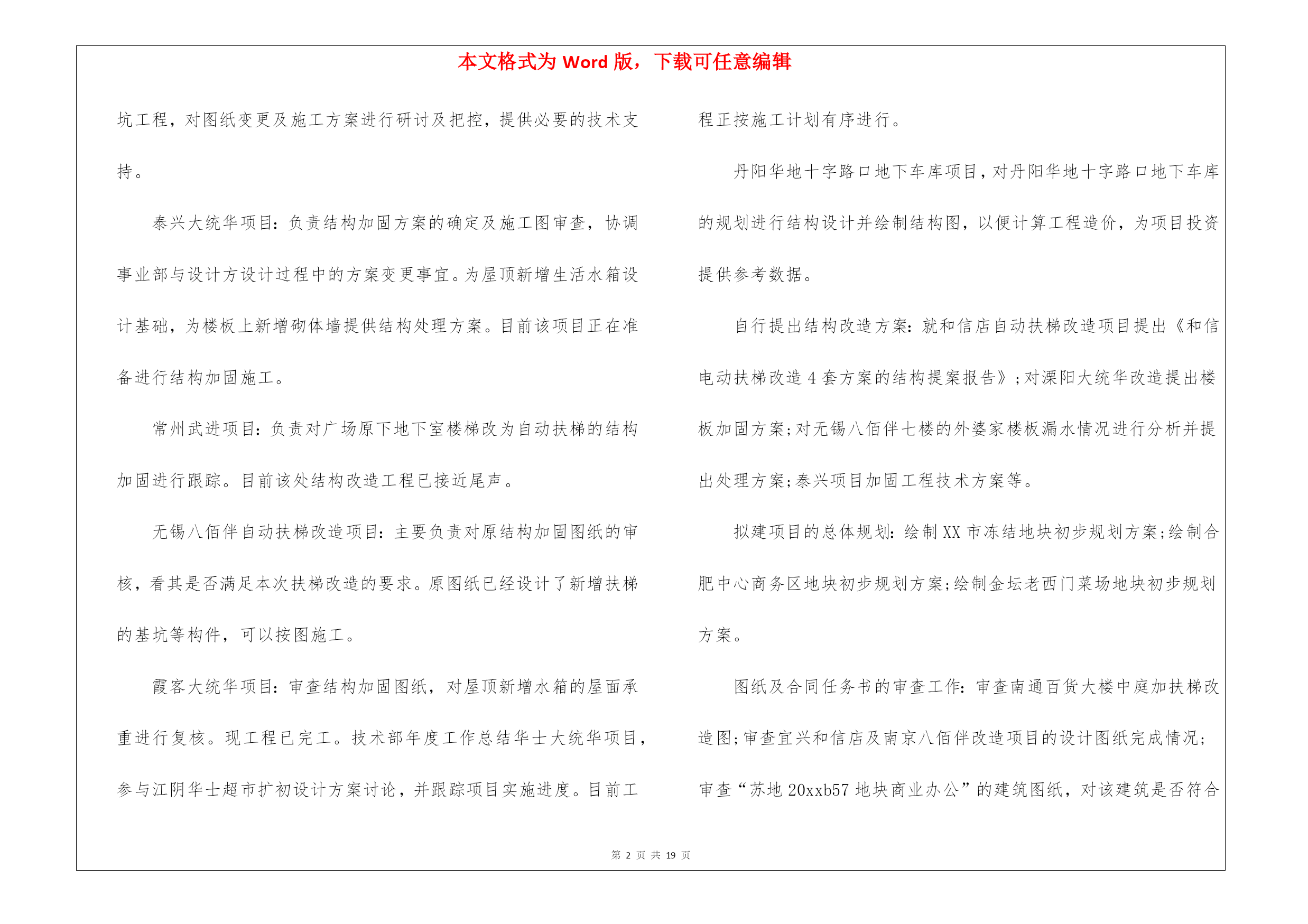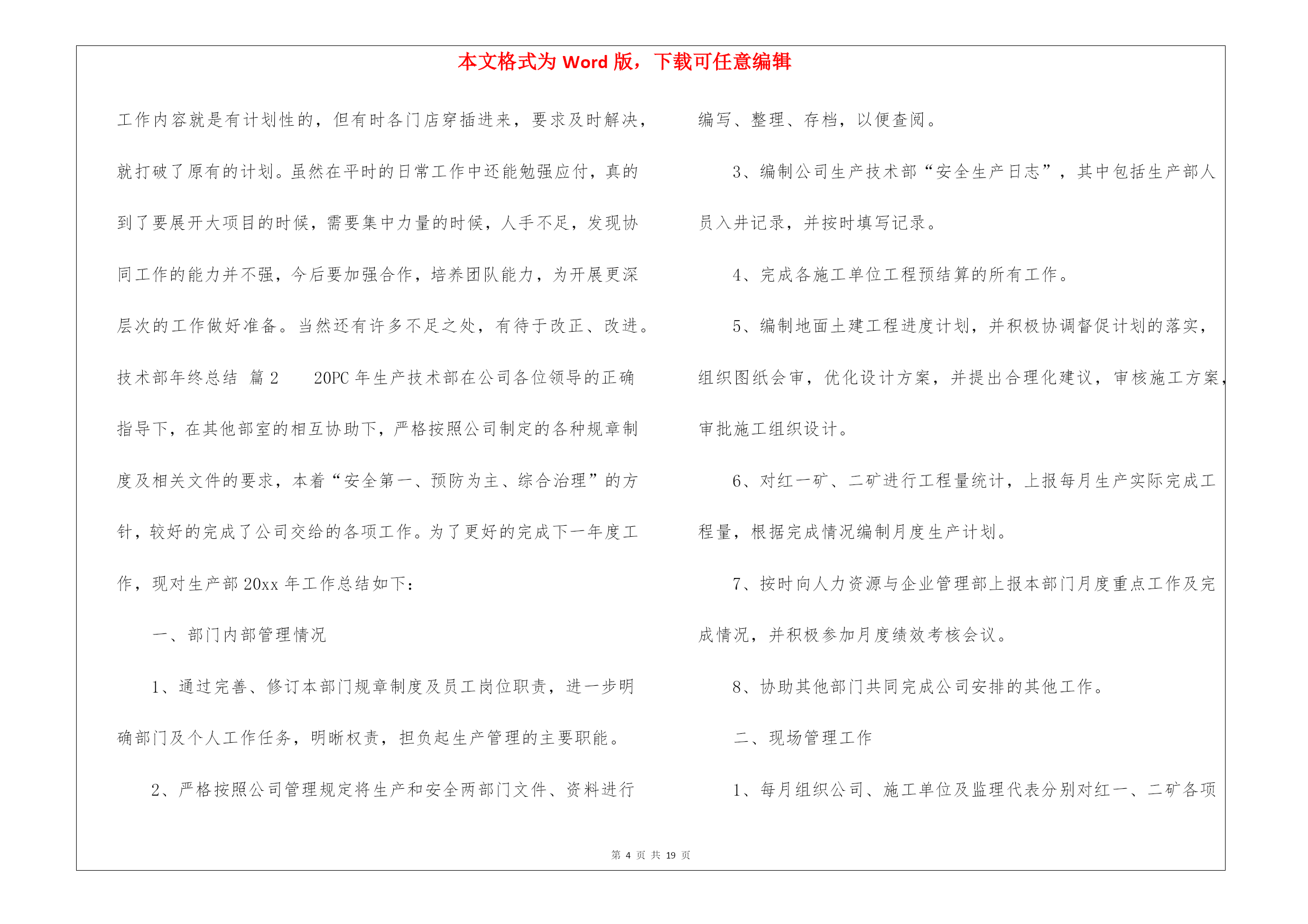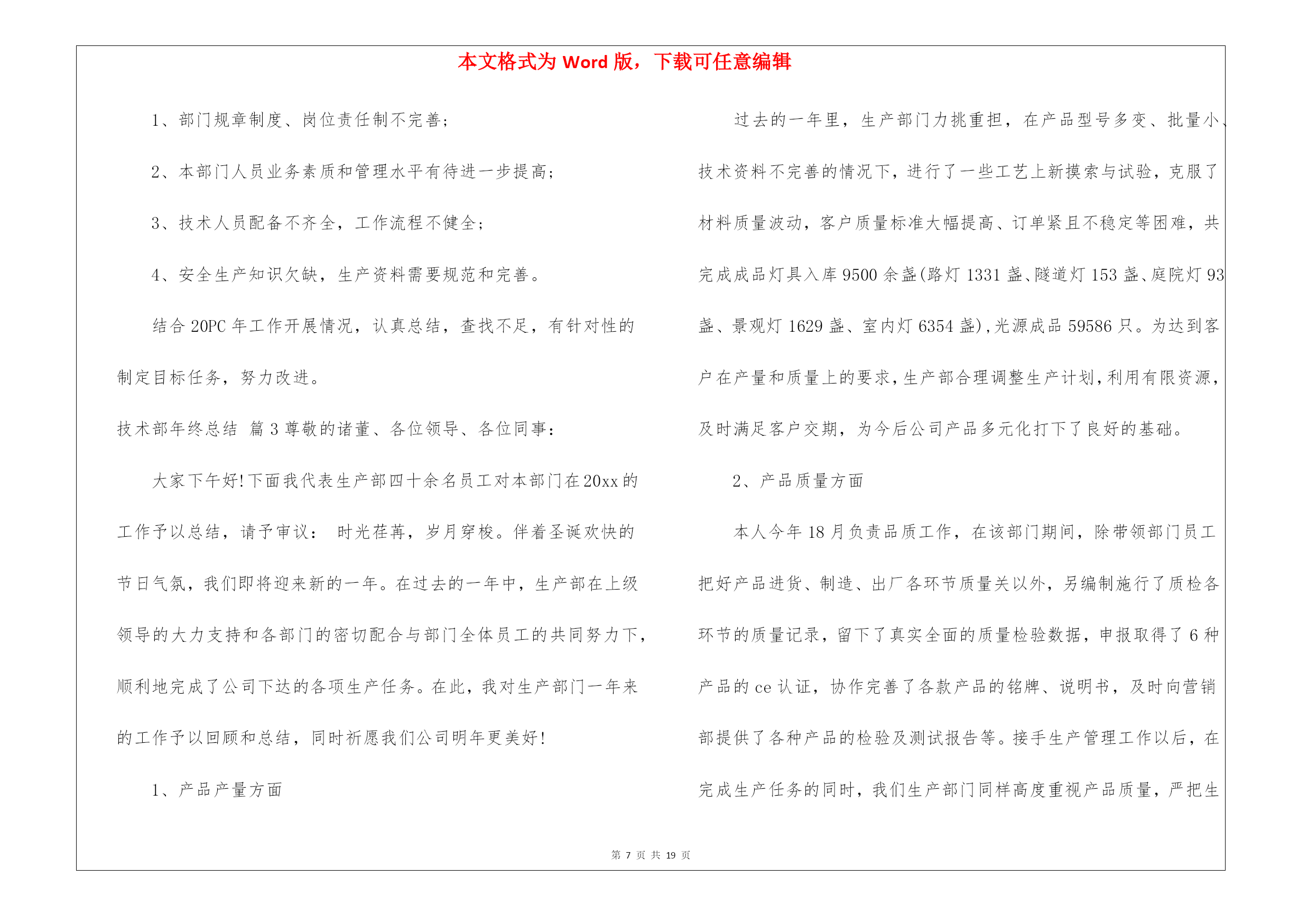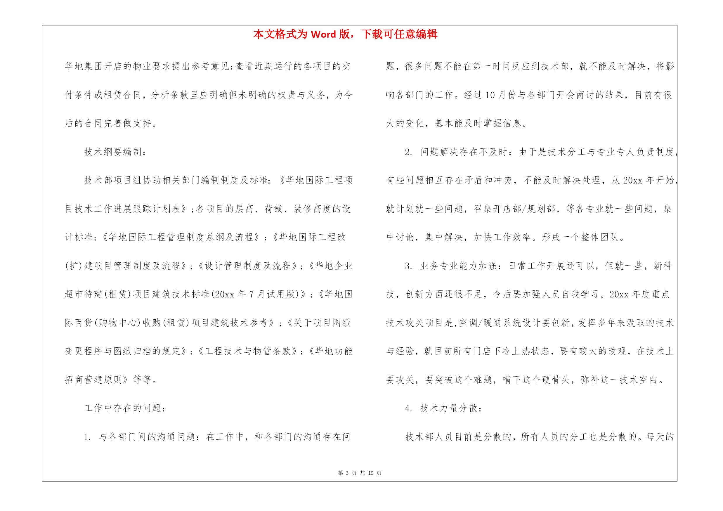 本文格式为Word版,下载可任意编辑第PAGE\*MERGEFORMAT19页共NUMPAGES\*MERGEFORMAT19页技术部年终总结合集6篇技术部年终总结合集6篇总结是指社会团体、企业单位和个人在自身的某一时期、某一项目或某些工作告一段落或者全部完成后进行回顾检查、分析评价,从而肯定成绩,得到经验,找出差距,得出教训和一些规律性认识的一种书面材料,它有助于我们寻找工作和事物发展的规律,从而掌握并运用这些规律,不妨坐下来好好写写总结吧。总结怎么写才不会流于形式呢?下面是我整理的技术部年终总结6篇,希望能够帮助到大家。技术部年终总结篇1在过去的20xx年里,技术部门所有人员在不断的学习中,逐渐熟悉公司新的管理模式和新的文件流程方式;本着对工作认真负责的态度,参加各种工程会议;,认真检查、跟踪落实各分项工程施工质量及进展情况;了解工程动态,对有可能出现问题的项目进行事前预控,将损失降到最小。维护公司利益,把公司的利益放在首位;尽忠于公司,把公司的事业与自身的发展融为一体;尽责于本职工作,均没有缺习早退现象,没有任何工程师受过任何处分;互相能妥善处理好同事之间的关系,积极发挥团队合作精神,基本能按时努力完成领导下达的各项指标任务,对工程提出理论性、经验性、实际性建议,促使工程顺利圆满。在过去一年中,技术部的工作任务是繁杂/繁琐的一年,回顾20xx年的工作,技术部工作总结如下:资源共享系统建设的完成:已经完成所有门店及新建项目已有的图纸电子归档集成系统,项目支持:技术项目组就长兴八佰伴项目、金坛西门新建项目,全程参与了项目的规划及实施,对各阶段方案进行技术分析及把控,对设计方出图进行综合审查并与其沟通审查意见。密切跟踪长兴项目现阶段的基坑工程,对图纸变更及施工方案进行研讨及把控,提供必要的技术支持。泰兴大统华项目:负责结构加固方案的确定及施工图审查,协调事业部与设计方设计过程中的方案变更事宜。为屋顶新增生活水箱设计基础,为楼板上新增砌体墙提供结构处理方案。目前该项目正在准备进行结构加固施工。常州武进项目:负责对广场原下地下室楼梯改为自动扶梯的结构加固进行跟踪。目前该处结构改造工程已接近尾声。无锡八佰伴自动扶梯改造项目:主要负责对原结构加固图纸的审核,看其是否满足本次扶梯改造的要求。原图纸已经设计了新增扶梯的基坑等构件,可以按图施工。霞客大统华项目:审查结构加固图纸,对屋顶新增水箱的屋面承重进行复核。现工程已完工。技术部年度工作总结华士大统华项目,参与江阴华士超市扩初设计方案讨论,并跟踪项目实施进度。目前工程正按施工计划有序进行。丹阳华地十字路口地下车库项目,对丹阳华地十字路口地下车库的规划进行结构设计并绘制结构图,以便计算工程造价,为项目投资提供参考数据。自行提出结构改造方案:就和信店自动扶梯改造项目提出《和信电动扶梯改造4套方案的结构提案报告》;对溧阳大统华改造提出楼板加固方案;对无锡八佰伴七楼的外婆家楼板漏水情况进行分析并提出处理方案;泰兴项目加固工程技术方案等。拟建项目的总体规划:绘制XX市冻结地块初步规划方案;绘制合肥中心商务区地块初步规划方案;绘制金坛老西门菜场地块初步规划方案。图纸及合同任务书的审查工作:审查南通百货大楼中庭加扶梯改造图;审查宜兴和信店及南京八佰伴改造项目的设计图纸完成情况;审查“苏地20xxb57地块商业办公”的建筑图纸,对该建筑是否符合华地集团开店的物业要求提出参考意见;查看近期运行的各项目的交付条件或租赁合同,分析条款里应明确但未明确的权责与义务,为今后的合同完善做支持。技术纲要编制:技术部项目组协助相关部门编制制度及标准:《华地国际工程项目技术工作进展跟踪计划表》;各项目的层高、荷载、装修高度的设计标准;《华地国际工程管理制度总纲及流程》;《华地国际工程改(扩)建项目管理制度及流程》;《设计管理制度及流程》;《华地企业超市待建(租赁)项目建筑技术标准(20xx年7月试用版)》;《华地国际百货(购物中心)收购(租赁)项目建筑技术参考》;《关于项目图纸变更程序与图纸归档的规定》;《工程技术与物管条款》;《华地功能招商营建原则》等等。工作中存在的问题:1.与各部门间的沟通问题:在工作中,和各部门的沟通存在问题,很多问题不能在第一时间反应到技术部,就不能及时解决,将影响各部门的工作。经过10月份与各部门开会商讨的结果,目前有很大的变化,基本能及时掌握信息。2.问题解决存在不及时:由于是技术分工与专业专人负责制度,有些问题相互存在矛盾和冲突,不能及时解决处理,从20xx年开始,就计划就一些问题,召集开店部/规划部,等各专业就一些问题,集中讨论,集中解决,加快工作效率。形成一个整体团队。3.业务专业能力加强:日常工作开展还可以,但就一些,新科技,创新方面还很不足,今后要加强人员自我学