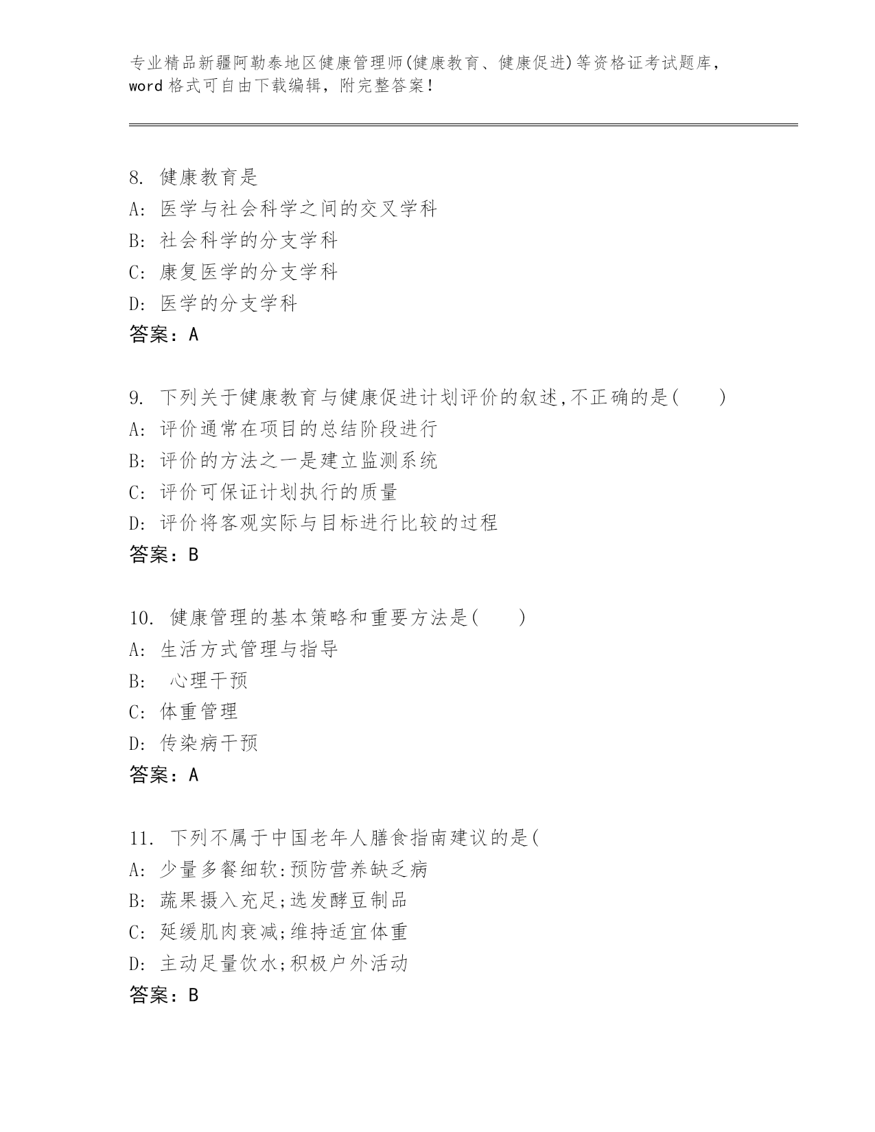 最新新疆阿勒泰地区健康管理师(健康教育、健康促进)等资格证考试内部题库【网校专用】.docx