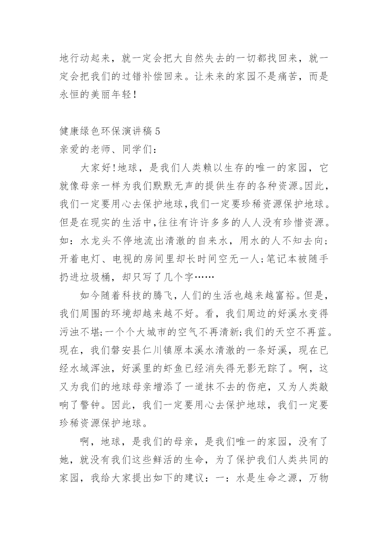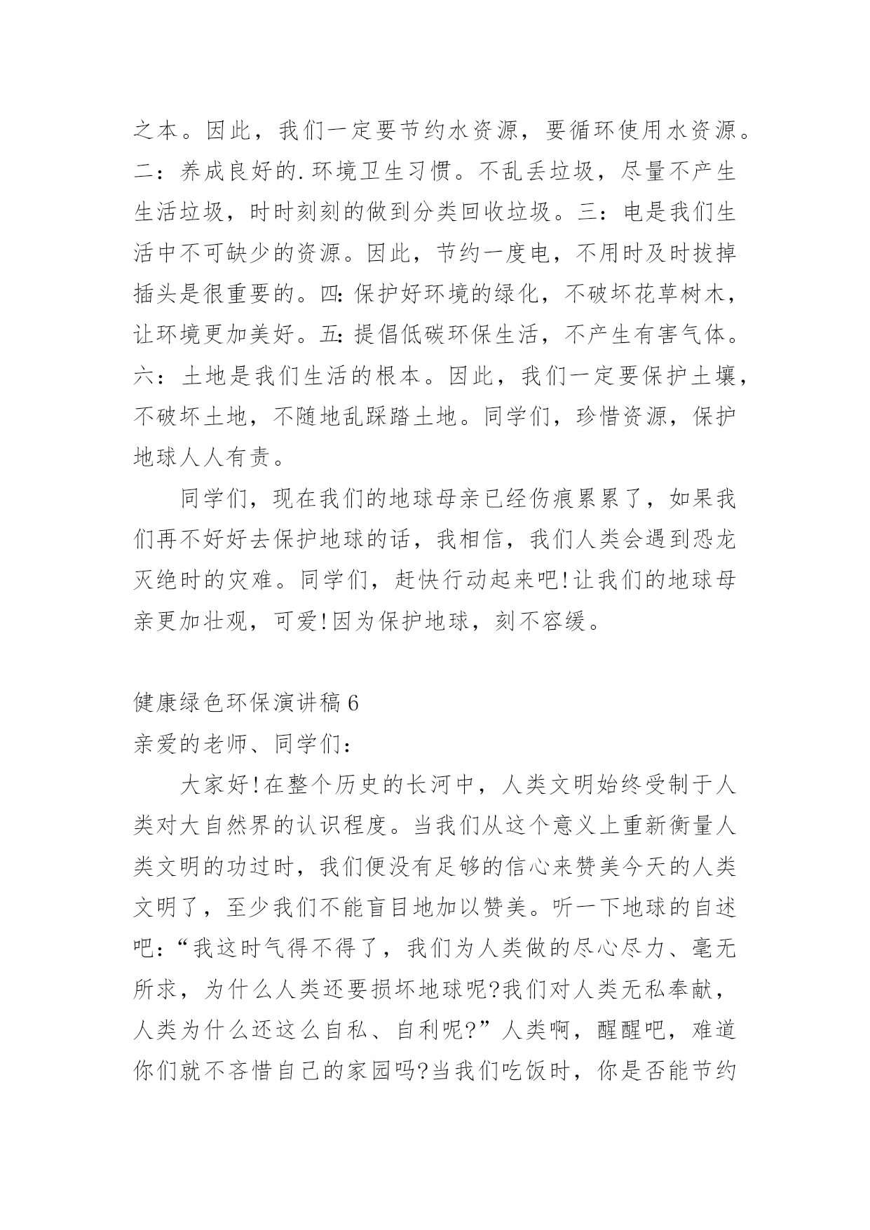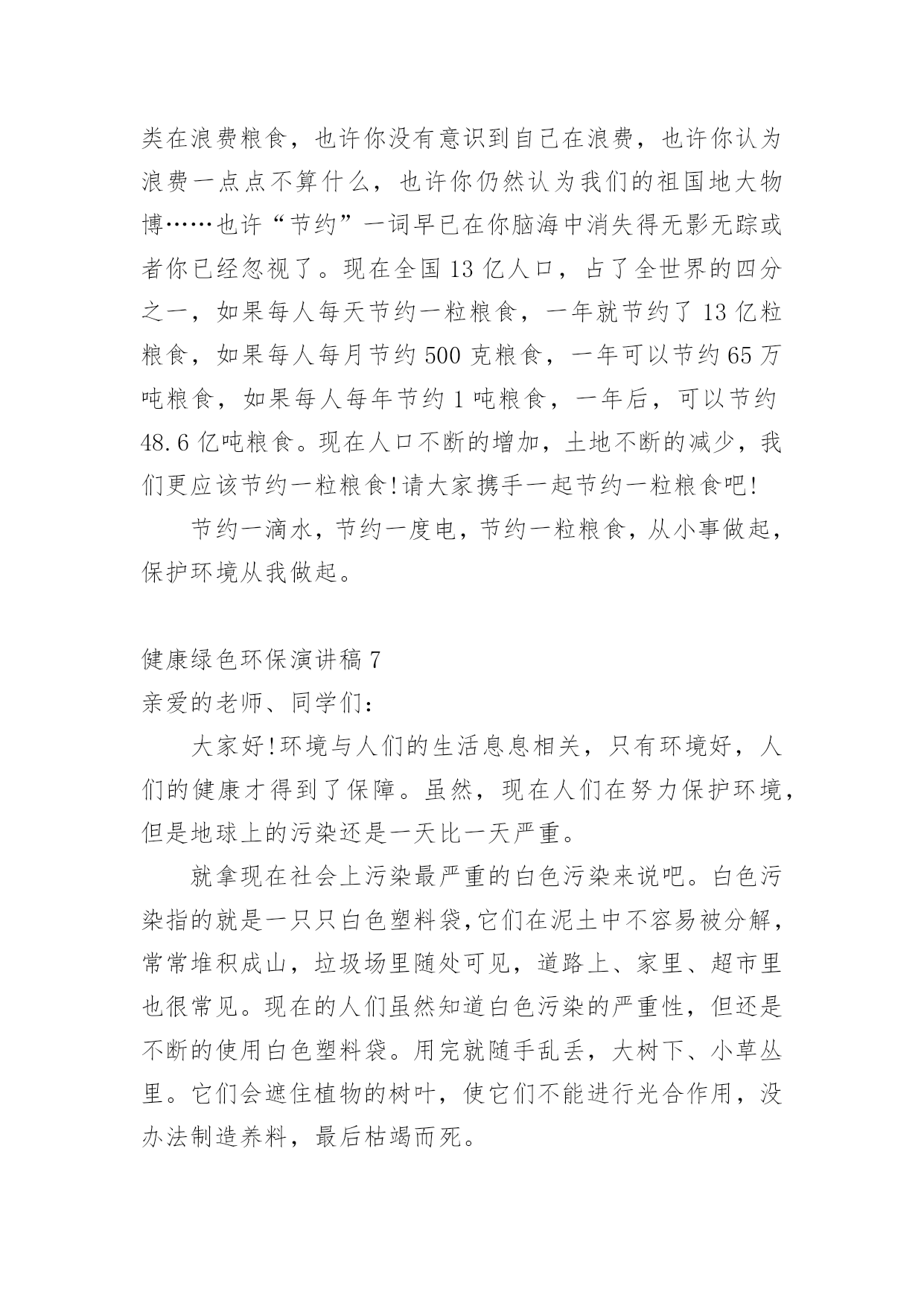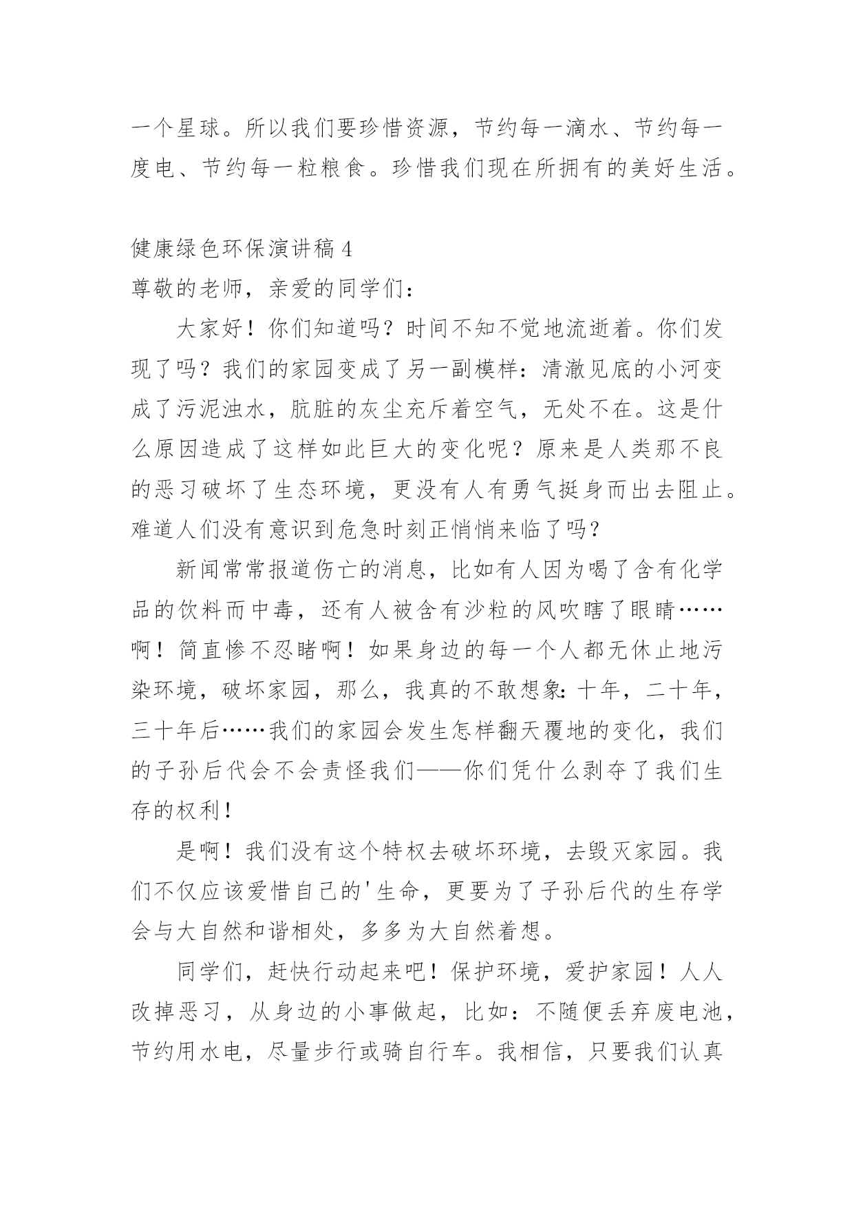健康绿色环保演讲稿演讲稿是在一定的场合,面对一定的听众,演讲人围绕着主题讲话的文稿。在社会一步步向前发展的今天,越来越多人会去使用演讲稿,你知道演讲稿怎样才能写的好吗?下面是小编整理的健康绿色环保演讲稿,仅供参考,欢迎大家阅读。健康绿色环保演讲稿1领导、老师、学生:大家好!我是07的曹静,今天演讲的题目是《还我们绿色空间》。我们知道,几千年前,人类征服了自然,利用自然界的一切事物作为人类文明的象征。几千年后的今天,人类是否通过尊重自然、释放自然、与自然和谐相处,将继续存在视为现代意识的象征记得有句话:‘两个黄鹂鸣翠柳,一行白鹭升天。’有人开玩笑说这样的意境只存在于都市人的梦里。环顾四周,摩天大楼高耸入云,覆盖了广阔的天空。在股票大厅里,在纵横交织的屏幕上,新鲜的'身影在工厂繁忙的机械声和路人急促的脚步声中跳跃。这就是所谓的‘都市节奏’吗?在这个盛世,很多人为了眼前的利益而忙碌,甚至不惜牺牲后代。健康绿色环保演讲稿2亲爱的老师、同学们:大家好,我是一年级三班的xxx,今天我演讲的题目是“爱护环境,从我做起”。春天来了,花儿绽开了笑脸,小草披上了绿装,校园里、大路上、到处生机勃勃,春天给大地穿上了五彩的.衣裳。同学们,你们可知道,这么清新优美的环境,会因为你我偶尔的不注意跟坏习惯而遭到破坏,变得不再美丽!上学的路上,我看到环卫叔叔阿姨们正在辛勤的打扫卫生,清理地上的垃圾,道路变得干净;放学时再看,路上又布满了垃圾。这时我想,作为少先队员的我们能做点什么呢?那就从我们身边的小事做起吧。当跟家人外出时,不但不自己乱扔垃圾,而且发现垃圾还能主动捡起来投到垃圾箱,那你就是一个爱护环境的好少年;在学校里看到水龙头没拧紧,主动上前把它拧紧,那你就是一个节约资源的好学生。亲爱的同学们,养成爱护环境,不乱丢乱扔的好习惯,不给别人添麻烦。从我做起,从点滴做起,从现在做起。做个优秀的少先队员!健康绿色环保演讲稿3亲爱的老师、同学们:大家好!地球,是我们人类的家园;地球,是我们赖以生存唯一的地方;地球,是生命的摇篮。地球本是一个绿草如茵、生机盎然、美丽壮观的球体。由于人们缺乏环保意识,任意毁坏自然资源,弄得地球水流花谢、遍体鳞伤。人们啊,醒醒吧,如果再不好好保护地球,地球将会支离破碎。人们啊,立刻行动起来吧,珍惜资源,保护地球,人人有责。随着科技的不断发展,人们的'生活水平不断的提高。因而工厂也越来越多,白色污染越来越严重,所以造成全球生态变化严重恶化。23%的耕地面积严重退化,50%的江河水流量减少或被严重污染,25%的哺乳动物、12%的鸟类濒临灭绝,1/4类所患疾病与环境恶化有关。土地面临沙漠化严重。80多个国家严重缺水,10亿人口受到荒漠化威胁,我国生态环境状况的几个数字:水土流失面积367万平方千米,约占全国面积的38%,全国平均每年新增水土流失1万平方千米。同学们,看了这些数据,你难道不感到人类即将面临严重的自然灾害吗?珍惜资源,保护地球,让我们从现在做起,从身边的小事做起,节约一滴水,节约每一寸土地,节约每一度电,节约每一张纸;爱护所有的小动物,爱护所有地球上的资源,爱树、爱花、爱草,让人类的母亲地球,变得越来越美丽。珍惜资源,保护地球,从小事做起。当你洗手时,你会不会把水龙头拧紧关掉呢?当你吃饭时,你会不会做到不浪费粮食呢?当你看完电视时,你会不会做到随手关掉电视机的开关呢?当你购物时,能不能不使用一次性塑料袋呢?我们只有一个地球,如果不好好保护地球,就会失去这美丽的家园。据科学家证明,以现在的科技,人类还无法移居到任何一个星球。所以我们要珍惜资源,节约每一滴水、节约每一度电、节约每一粒粮食。珍惜我们现在所拥有的美好生活。健康绿色环保演讲稿4尊敬的老师,亲爱的同学们:大家好!你们知道吗?时间不知不觉地流逝着。你们发现了吗?我们的家园变成了另一副模样:清澈见底的小河变成了污泥浊水,肮脏的灰尘充斥着空气,无处不在。这是什么原因造成了这样如此巨大的变化呢?原来是人类那不良的恶习破坏了生态环境,更没有人有勇气挺身而出去阻止。难道人们没有意识到危急时刻正悄悄来临了吗?新闻常常报道伤亡的消息,比如有人因为喝了含有化学品的饮料而中毒,还有人被含有沙粒的风吹瞎了眼睛……啊!简直惨不忍睹啊!如果身边的每一个人都无休止地污染环境,破坏家园,那么,我真的不敢想象:十年,二十年,三十年后……我们的家园会发生怎样翻天覆地的变化,我们的子孙后代会不会责怪我们——你们凭什么剥夺了我们生存的权利!是啊!我们没有这个特权去破坏环境,去毁灭家园。我们不仅应该爱惜自己的'生命,更要为了子孙后代的生存学会与大自然和谐相处,多多为大自然着想。同学们,赶快行动起来吧!保护环境,爱护家园!人人改掉恶习,从身边的小事做起,比如:不随便丢弃废电池,节约用水电,尽量步行或骑自行车。我相