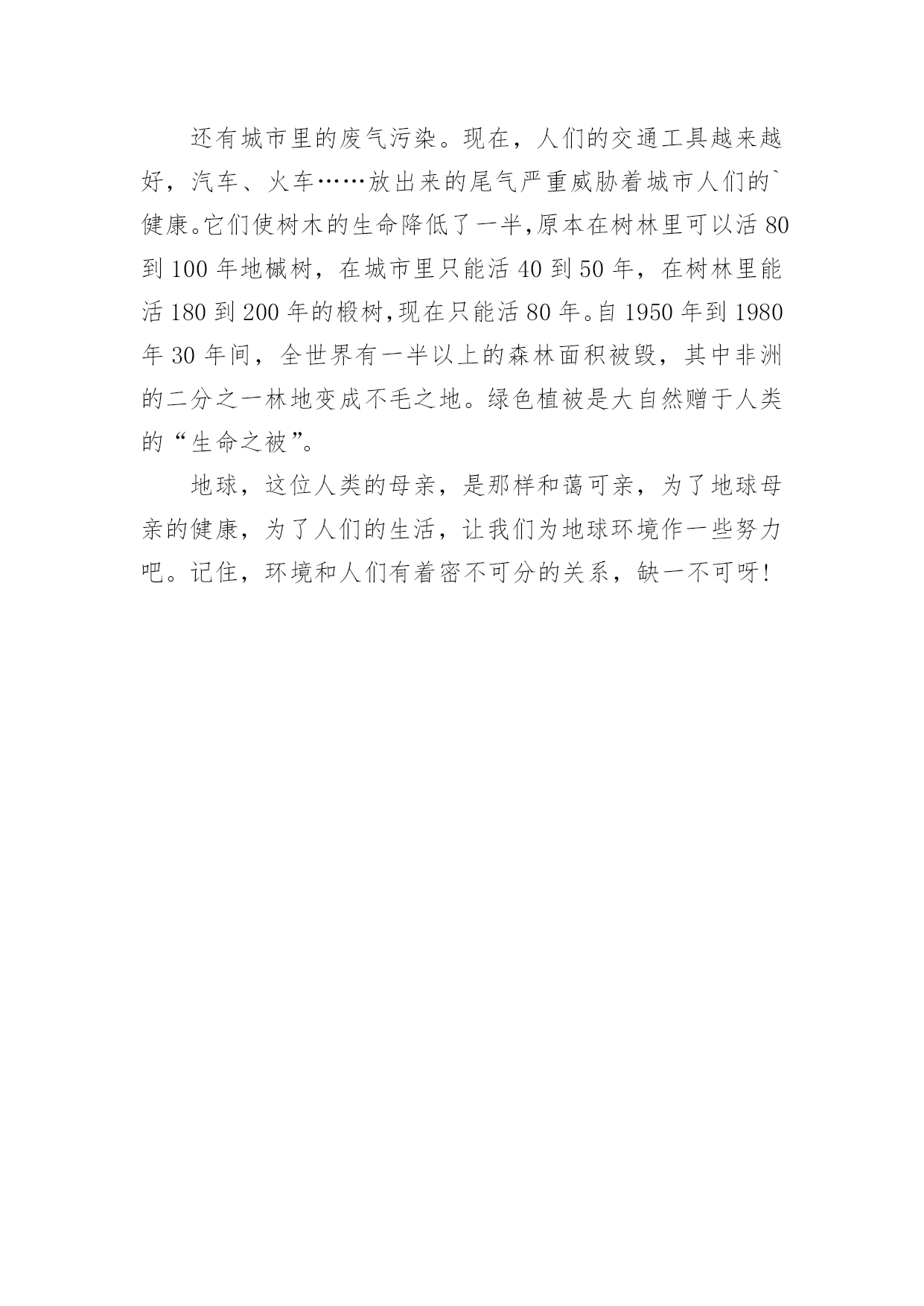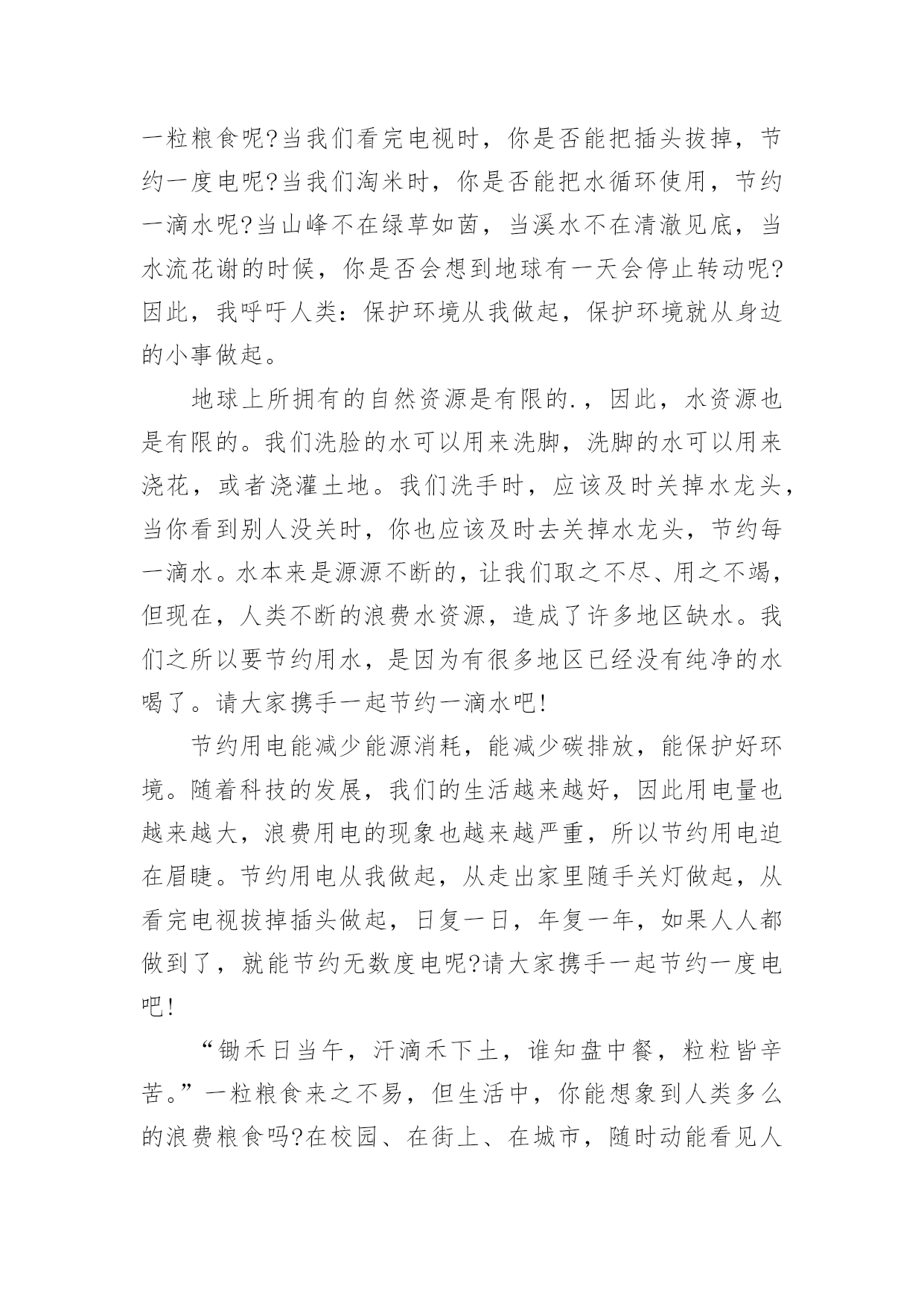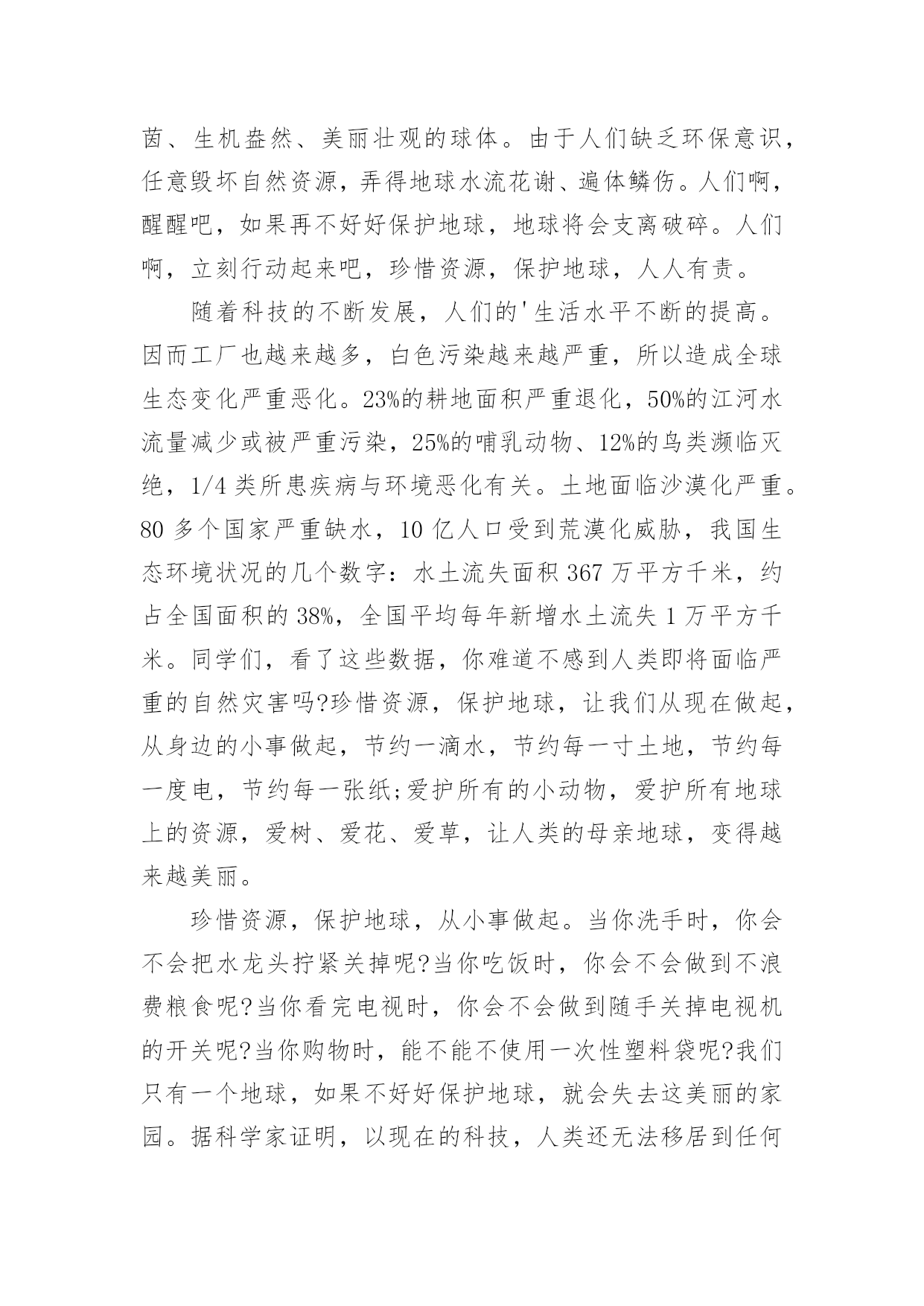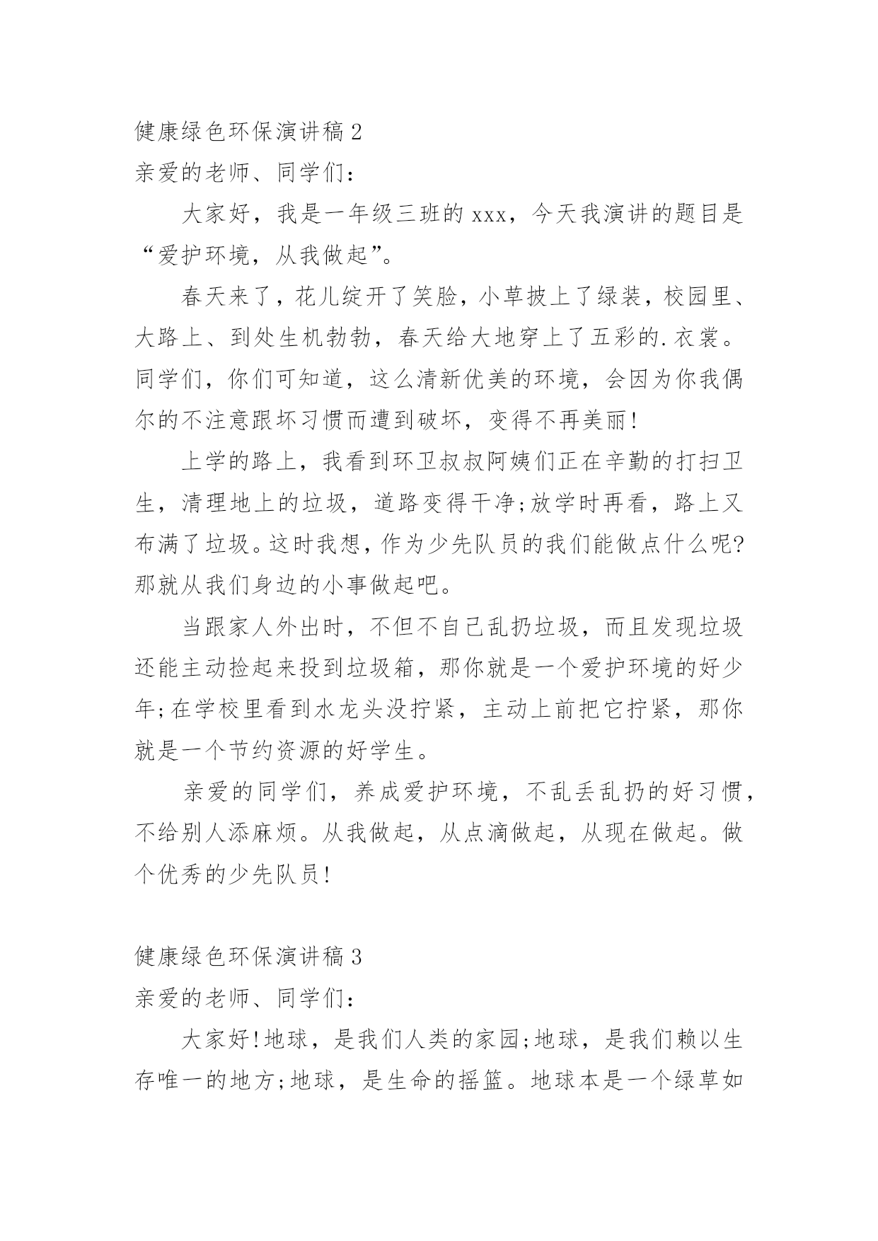 健康绿色环保演讲稿演讲稿是在一定的场合,面对一定的听众,演讲人围绕着主题讲话的文稿。在社会一步步向前发展的今天,越来越多人会去使用演讲稿,你知道演讲稿怎样才能写的好吗?下面是小编整理的健康绿色环保演讲稿,仅供参考,欢迎大家阅读。健康绿色环保演讲稿1领导、老师、学生:大家好!我是07的曹静,今天演讲的题目是《还我们绿色空间》。我们知道,几千年前,人类征服了自然,利用自然界的一切事物作为人类文明的象征。几千年后的今天,人类是否通过尊重自然、释放自然、与自然和谐相处,将继续存在视为现代意识的象征记得有句话:‘两个黄鹂鸣翠柳,一行白鹭升天。’有人开玩笑说这样的意境只存在于都市人的梦里。环顾四周,摩天大楼高耸入云,覆盖了广阔的天空。在股票大厅里,在纵横交织的屏幕上,新鲜的'身影在工厂繁忙的机械声和路人急促的脚步声中跳跃。这就是所谓的‘都市节奏’吗?在这个盛世,很多人为了眼前的利益而忙碌,甚至不惜牺牲后代。健康绿色环保演讲稿2亲爱的老师、同学们:大家好,我是一年级三班的xxx,今天我演讲的题目是“爱护环境,从我做起”。春天来了,花儿绽开了笑脸,小草披上了绿装,校园里、大路上、到处生机勃勃,春天给大地穿上了五彩的.衣裳。同学们,你们可知道,这么清新优美的环境,会因为你我偶尔的不注意跟坏习惯而遭到破坏,变得不再美丽!上学的路上,我看到环卫叔叔阿姨们正在辛勤的打扫卫生,清理地上的垃圾,道路变得干净;放学时再看,路上又布满了垃圾。这时我想,作为少先队员的我们能做点什么呢?那就从我们身边的小事做起吧。当跟家人外出时,不但不自己乱扔垃圾,而且发现垃圾还能主动捡起来投到垃圾箱,那你就是一个爱护环境的好少年;在学校里看到水龙头没拧紧,主动上前把它拧紧,那你就是一个节约资源的好学生。亲爱的同学们,养成爱护环境,不乱丢乱扔的好习惯,不给别人添麻烦。从我做起,从点滴做起,从现在做起。做个优秀的少先队员!健康绿色环保演讲稿3亲爱的老师、同学们:大家好!地球,是我们人类的家园;地球,是我们赖以生存唯一的地方;地球,是生命的摇篮。地球本是一个绿草如茵、生机盎然、美丽壮观的球体。由于人们缺乏环保意识,任意毁坏自然资源,弄得地球水流花谢、遍体鳞伤。人们啊,醒醒吧,如果再不好好保护地球,地球将会支离破碎。人们啊,立刻行动起来吧,珍惜资源,保护地球,人人有责。随着科技的不断发展,人们的'生活水平不断的提高。因而工厂也越来越多,白色污染越来越严重,所以造成全球生态变化严重恶化。23%的耕地面积严重退化,50%的江河水流量减少或被严重污染,25%的哺乳动物、12%的鸟类濒临灭绝,1/4类所患疾病与环境恶化有关。土地面临沙漠化严重。80多个国家严重缺水,10亿人口受到荒漠化威胁,我国生态环境状况的几个数字:水土流失面积367万平方千米,约占全国面积的38%,全国平均每年新增水土流失1万平方千米。同学们,看了这些数据,你难道不感到人类即将面临严重的自然灾害吗?珍惜资源,保护地球,让我们从现在做起,从身边的小事做起,节约一滴水,节约每一寸土地,节约每一度电,节约每一张纸;爱护所有的小动物,爱护所有地球上的资源,爱树、爱花、爱草,让人类的母亲地球,变得越来越美丽。珍惜资源,保护地球,从小事做起。当你洗手时,你会不会把水龙头拧紧关掉呢?当你吃饭时,你会不会做到不浪费粮食呢?当你看完电视时,你会不会做到随手关掉电视机的开关呢?当你购物时,能不能不使用一次性塑料袋呢?我们只有一个地球,如果不好好保护地球,就会失去这美丽的家园。据科学家证明,以现在的科技,人类还无法移居到任何一个星球。所以我们要珍惜资源,节约每一滴水、节约每一度电、节约每一粒粮食。珍惜我们现在所拥有的美好生活。健康绿色环保演讲稿4尊敬的老师,亲爱的同学们:大家好!你们知道吗?时间不知不觉地流逝着。你们发现了吗?我们的家园变成了另一副模样:清澈见底的小河变成了污泥浊水,肮脏的灰尘充斥着空气,无处不在。这是什么原因造成了这样如此巨大的变化呢?原来是人类那不良的恶习破坏了生态环境,更没有人有勇气挺身而出去阻止。难道人们没有意识到危急时刻正悄悄来临了吗?新闻常常报道伤亡的消息,比如有人因为喝了含有化学品的饮料而中毒,还有人被含有沙粒的风吹瞎了眼睛……啊!简直惨不忍睹啊!如果身边的每一个人都无休止地污染环境,破坏家园,那么,我真的不敢想象:十年,二十年,三十年后……我们的家园会发生怎样翻天覆地的变化,我们的子孙后代会不会责怪我们——你们凭什么剥夺了我们生存的权利!是啊!我们没有这个特权去破坏环境,去毁灭家园。我们不仅应该爱惜自己的'生命,更要为了子孙后代的生存学会与大自然和谐相处,多多为大自然着想。同学们,赶快行动起来吧!保护环境,爱护家园!人人改掉恶习,从身边的小事做起,比如:不随便丢弃废电池,节约用水电,尽量步行或骑自行车。我相