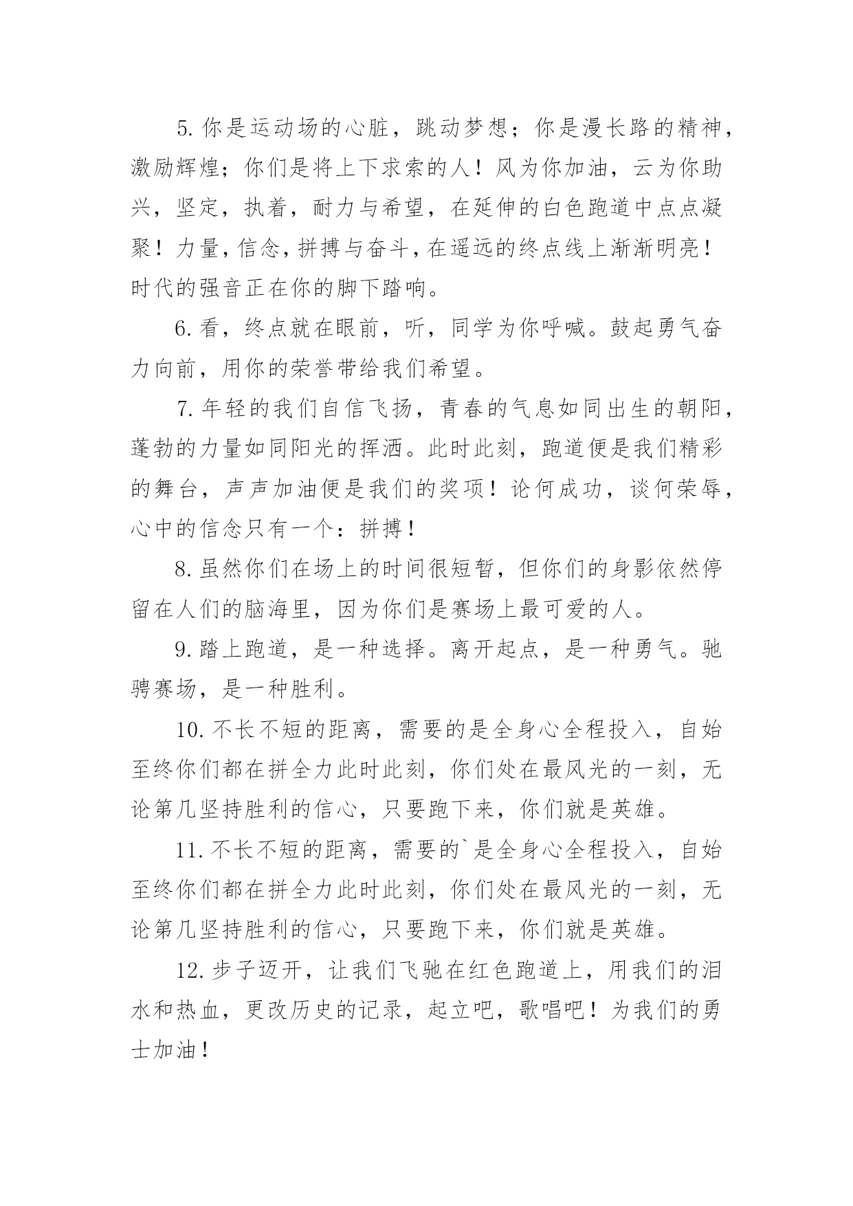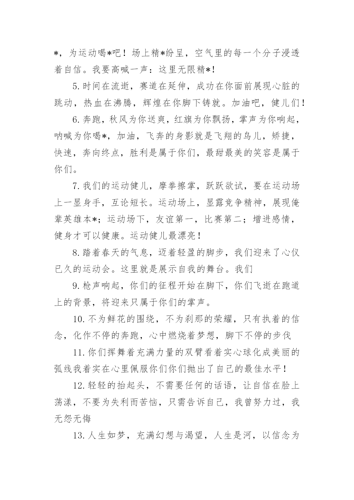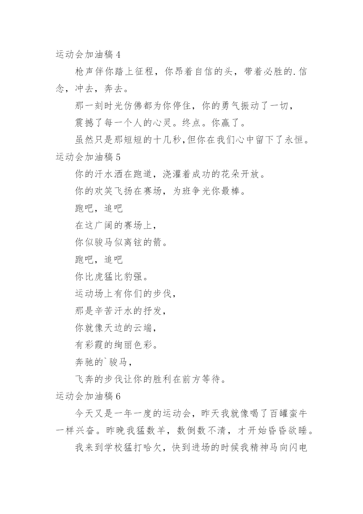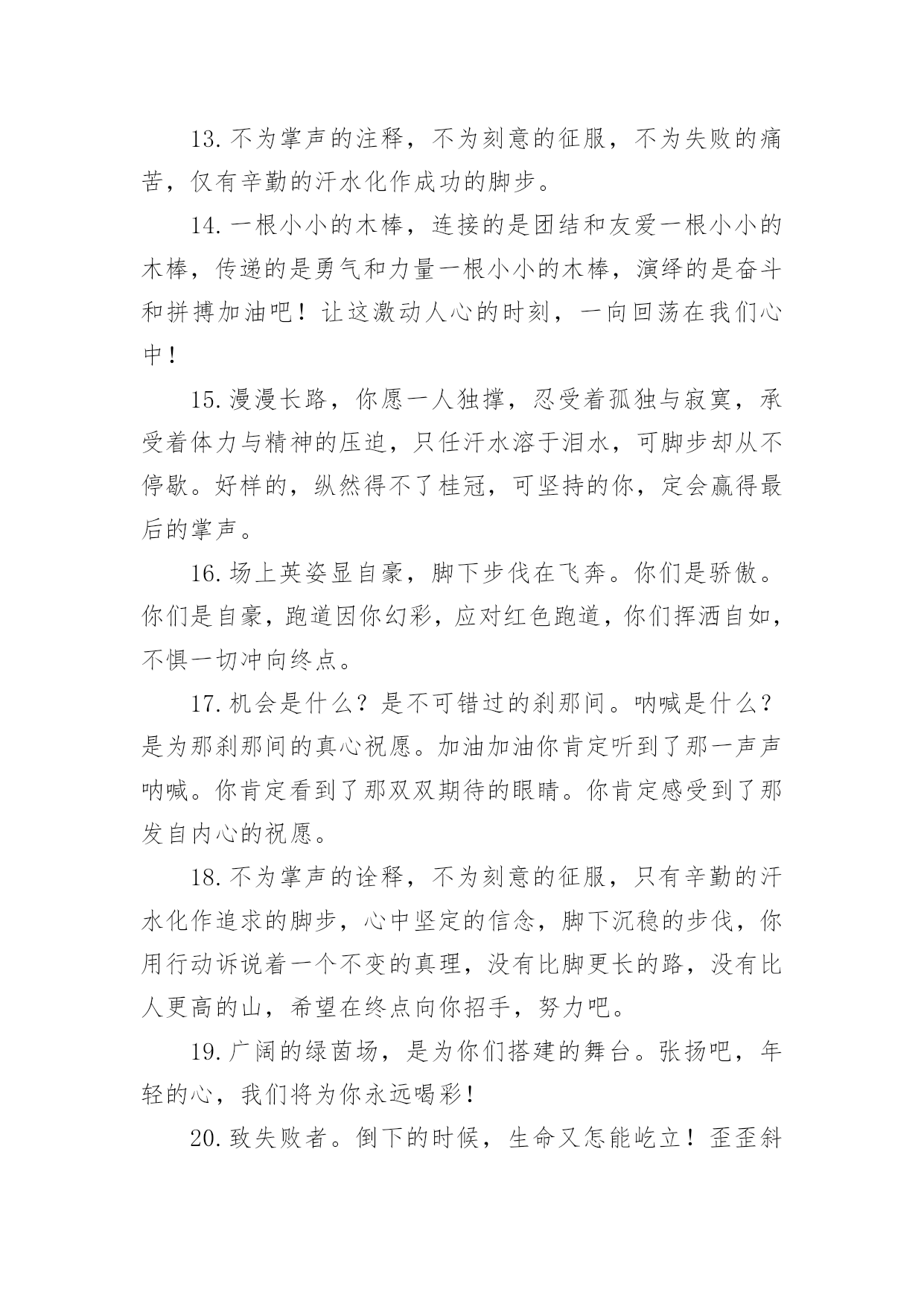 运动会加油稿运动会加油稿(精华)随着社会一步步向前发展,用到加油稿的地方越来越多,加油稿可以增添对方必胜的勇气和信心。如何写一份恰当的加油稿呢?下面是小编精心整理的运动会加油稿,供大家参考借鉴,希望可以帮助到有需要的朋友。运动会加油稿1也许你心里忐忑不安,我们的心里早已热血沸腾。昔日,长长的跑道上,留下了你深深的足迹。抹不去你渗出的汗水,拉不动你沉重的.双脚。你为了班级,不在乎自己疲惫,不在乎泪水和汗水,因为你心里有一种坚定的信念。为了班级,我能行。运动会加油稿2一根竹竿,决定了你的命运。是喜是悲,全在一瞬间。你矫健的`身躯,像一颗流星,划过寂静的黎明。柔软的铺垫,融入了你所有的快乐。所有的精彩都在你跳起的那一刻,我将永远铭记在心。弧线——致铅球运动员一道优美的弧线划过眼前,我不禁浮想联翩。这精彩的弧线啊,凝结着多少辛勤的汗水。运动会加油稿3在那一瞬间,你们像离了弦的箭似流星,如闪电。运动场上你们最坚韧,不懈地追求,无悔地跑运动场上你们最风采,你追我赶到终点随着一阵热烈的掌声,比赛胜负已分出。胜者继续加油,败者不要气馁互取长补短,相信你们都会收获,加油吧!运动会加油稿4枪声伴你踏上征程,你昂着自信的头,带着必胜的.信念,冲去,奔去。那一刻时光仿佛都为你停住,你的勇气振动了一切,震撼了每一个人的心灵。终点。你赢了。虽然只是那短短的十几秒,但你在我们心中留下了永恒。运动会加油稿5你的汗水洒在跑道,浇灌着成功的花朵开放。你的欢笑飞扬在赛场,为班争光你最棒。跑吧,追吧在这广阔的赛场上,你似骏马似离铉的箭。跑吧,追吧你比虎猛比豹强。运动场上有你们的步伐,那是辛苦汗水的抒发,你就像天边的云端,有彩霞的绚丽色彩。奔驰的`骏马,飞奔的步伐让你的胜利在前方等待。运动会加油稿6今天又是一年一度的运动会,昨天我就像喝了百罐蛮牛一样兴奋。昨晚我猛数羊,数倒数不清,才开始昏昏欲睡。我来到学校猛打哈欠,快到进场的时候我精神马向闪电般冲劲我的头脑瞬间精神百倍。运动会我听来宾致词,终于致词完毕,我已经睡觉了。我最有信心的市个人跑、团体接力。终于轮到我的`个人跑,原本遥遥领先的,结果被象野豹般的吴家贤给追过了。可是我一点也不灰心,因为我还有团体接力团体接力开始,我帮我们般的陈圣泓加油,到我跑的时候,妈妈用狮吼功的功夫来帮我加油。我在运动会背后的意义,就是胜不娇,败不馁。运动会加油稿71.树苗长大成大树,需要园丁的辛勤劳动,运动员们创下的佳绩需要后勤人员的支持,感谢所有后勤人员们,多谢你们对运动帮忙支持。2.坚定,执着,耐力与希望,在延伸的白色跑道中点点凝聚!力量,信念,拼搏与奋斗,在遥远的终点线上渐渐明亮!时代的强音正在你的脚下踏响。3.看!那一面面迎风飘舞的彩旗,是一朵朵盛开的鲜花;听!那一阵阵惊天动地的欢呼,是回响在耳边胜利的风声。运动场上的你们,是胜利的标志,运动场上的你们,是青春的赞叹。去吧!去迎接那伟大的挑战,去吧!去做一名追风的少年。4.人生的路,有坦途,也有坎坷,做过的岁月,有欢笑,也有苦涩,泪水告诉我一个跌倒的故事,汗水使我多了一份沉重,几多成熟。理想毕竟不一样于现实,失败是生活的一部分,谁也无法选择,无法抗拒,人生要自己去拼搏,去奋斗,在风雨中百折不饶勇往直前。5.你是运动场的心脏,跳动梦想;你是漫长路的精神,激励辉煌;你们是将上下求索的人!风为你加油,云为你助兴,坚定,执着,耐力与希望,在延伸的白色跑道中点点凝聚!力量,信念,拼搏与奋斗,在遥远的终点线上渐渐明亮!时代的强音正在你的脚下踏响。6.看,终点就在眼前,听,同学为你呼喊。鼓起勇气奋力向前,用你的荣誉带给我们希望。7.年轻的我们自信飞扬,青春的气息如同出生的朝阳,蓬勃的力量如同阳光的挥洒。此时此刻,跑道便是我们精彩的舞台,声声加油便是我们的奖项!论何成功,谈何荣辱,心中的信念只有一个:拼搏!8.虽然你们在场上的时间很短暂,但你们的身影依然停留在人们的脑海里,因为你们是赛场上最可爱的人。9.踏上跑道,是一种选择。离开起点,是一种勇气。驰骋赛场,是一种胜利。10.不长不短的距离,需要的是全身心全程投入,自始至终你们都在拼全力此时此刻,你们处在最风光的一刻,无论第几坚持胜利的信心,只要跑下来,你们就是英雄。11.不长不短的距离,需要的`是全身心全程投入,自始至终你们都在拼全力此时此刻,你们处在最风光的一刻,无论第几坚持胜利的信心,只要跑下来,你们就是英雄。12.步子迈开,让我们飞驰在红色跑道上,用我们的泪水和热血,更改历史的记录,起立吧,歌唱吧!为我们的勇士加油!13.不为掌声的注释,不为刻意的征服,不为失败的痛苦,仅有辛勤的汗水化作成功的脚步。14.一根小小的木棒,连接的是团结和友爱一根小小的木棒,传递的是勇气和力量一根小小的木棒,演绎的是奋斗和拼搏加油吧!让这激动人心的时刻,一向回