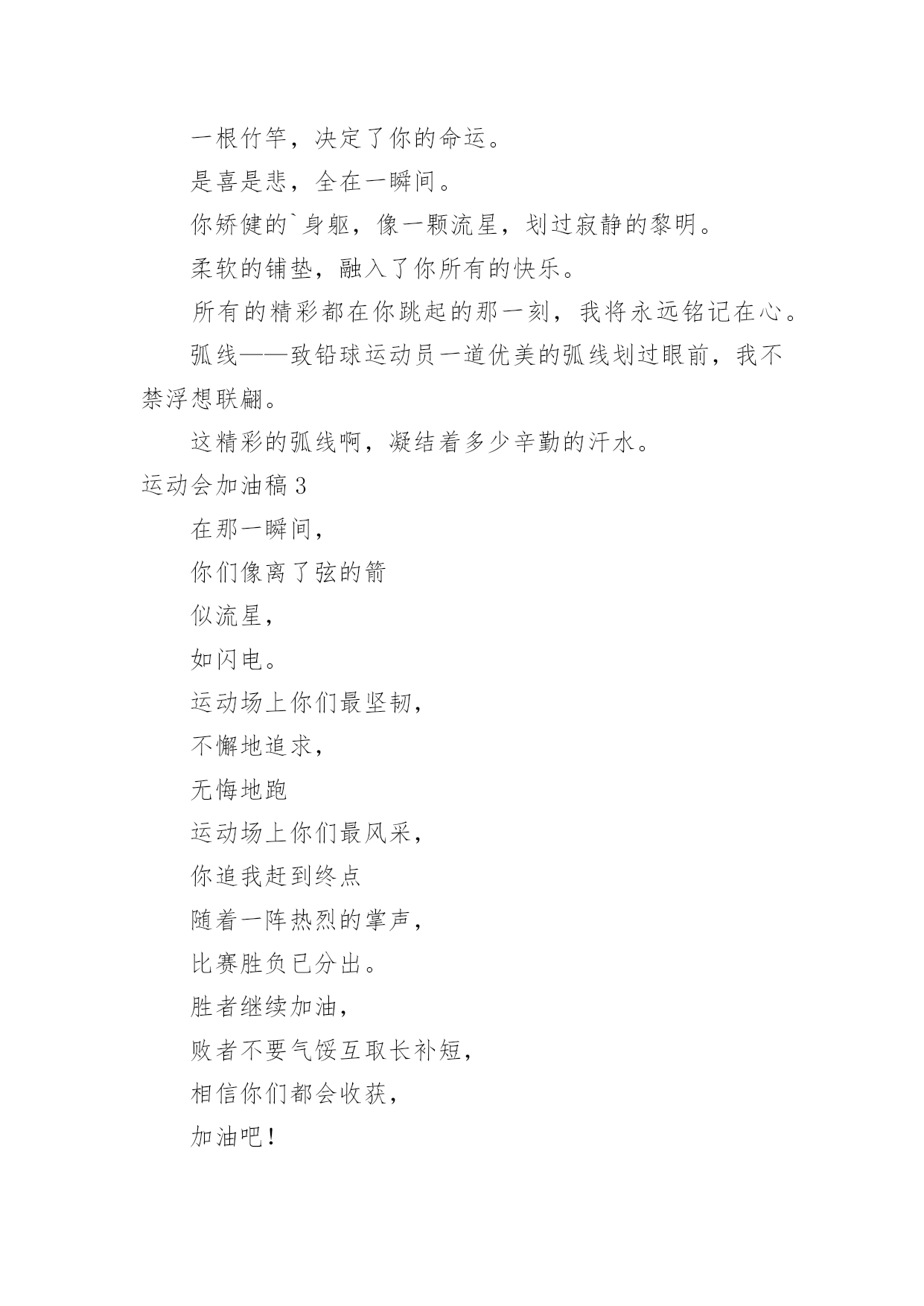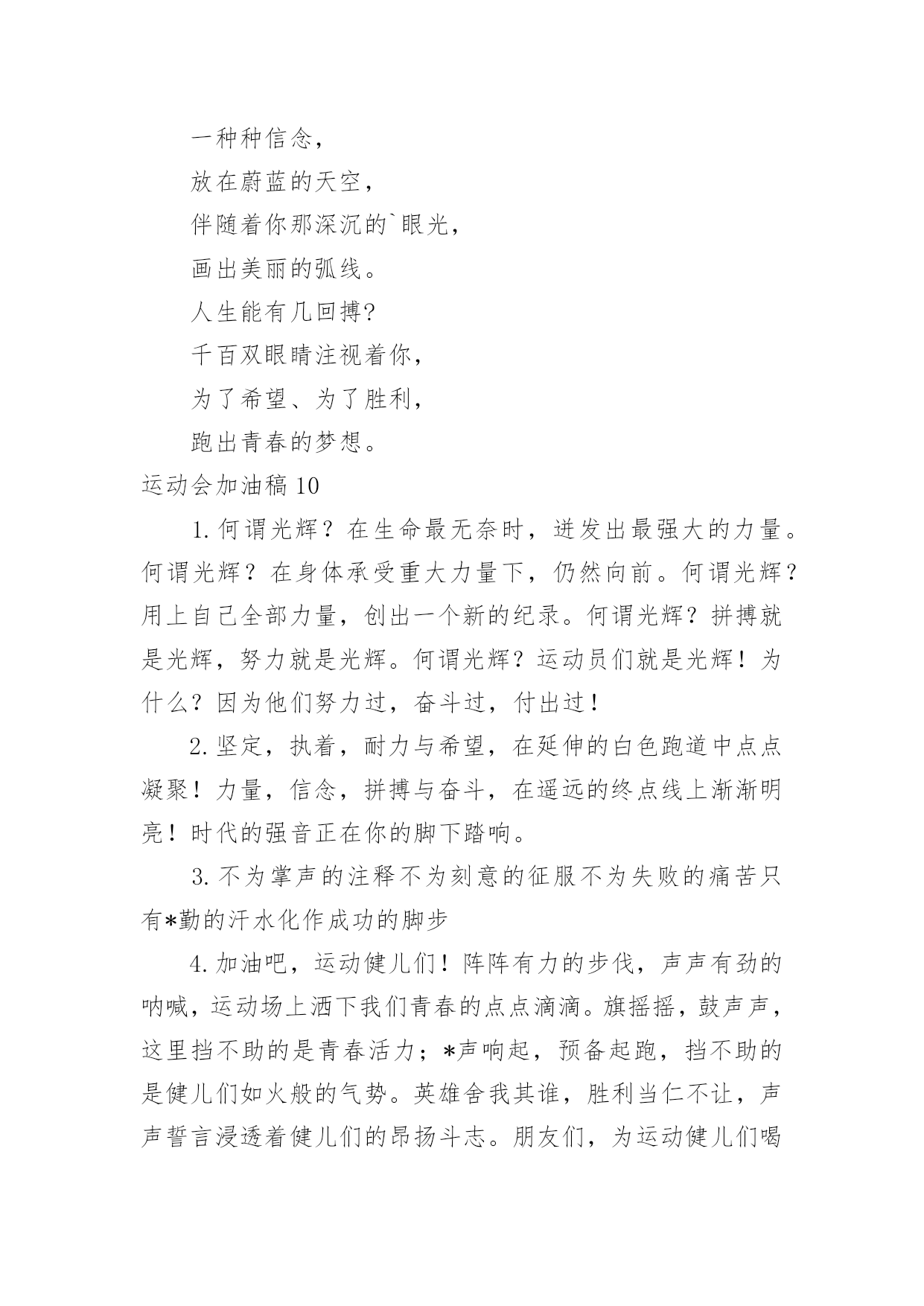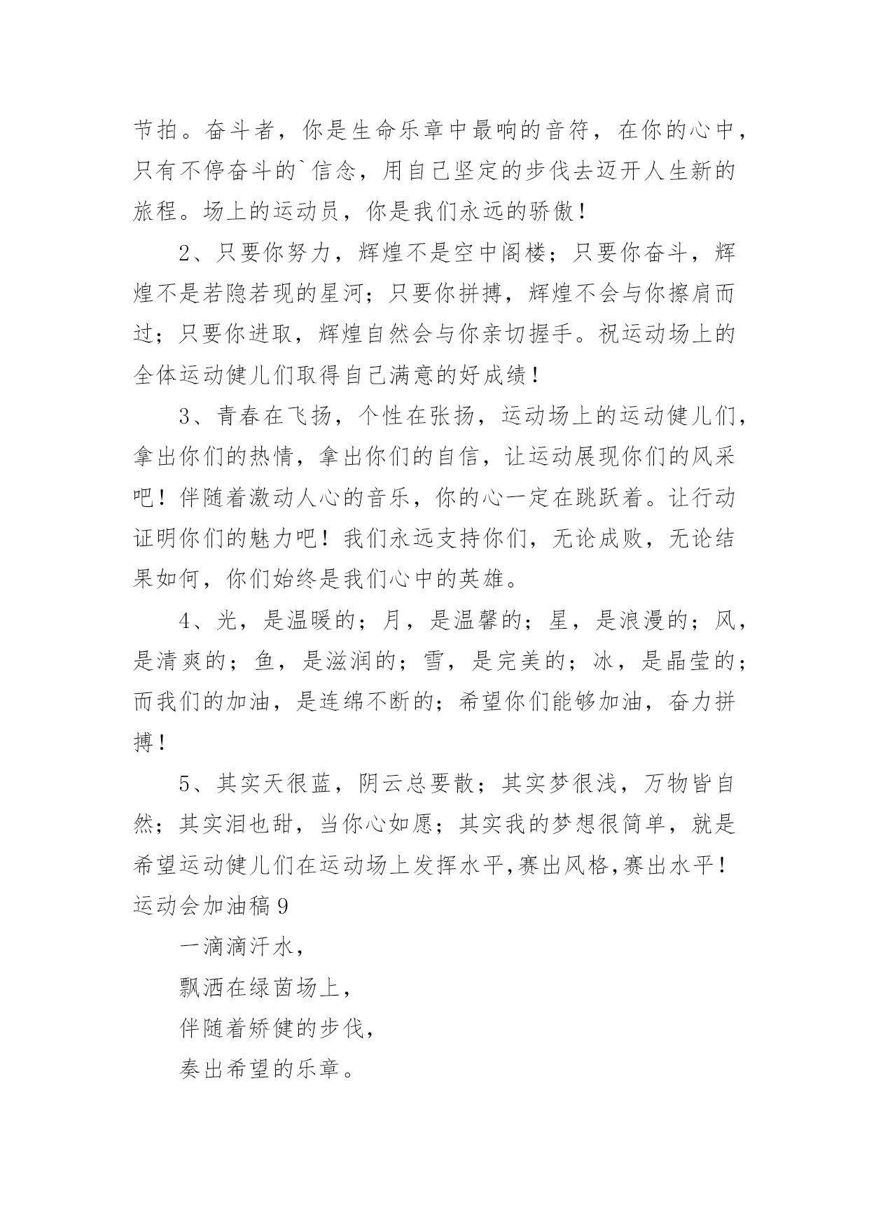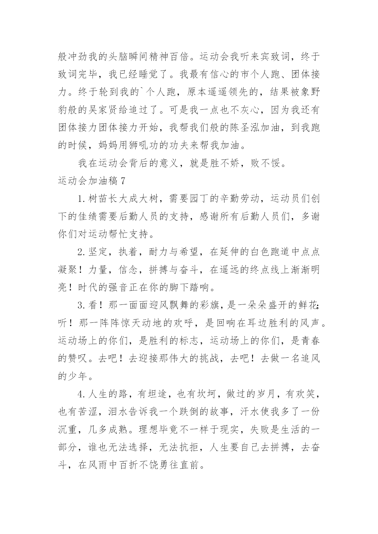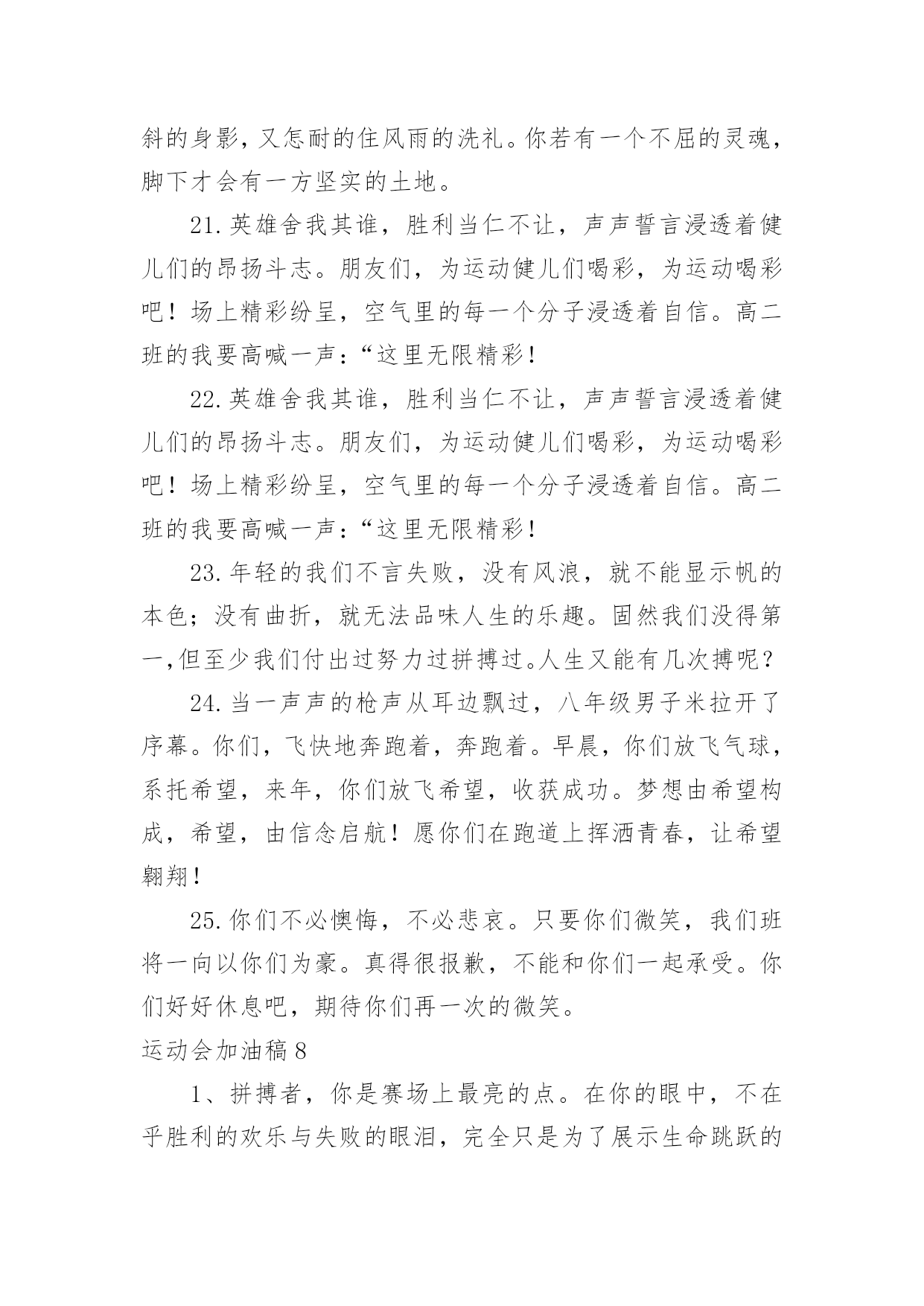运动会加油稿运动会加油稿(精华)随着社会一步步向前发展,用到加油稿的地方越来越多,加油稿可以增添对方必胜的勇气和信心。如何写一份恰当的加油稿呢?下面是小编精心整理的运动会加油稿,供大家参考借鉴,希望可以帮助到有需要的朋友。运动会加油稿1也许你心里忐忑不安,我们的心里早已热血沸腾。昔日,长长的跑道上,留下了你深深的足迹。抹不去你渗出的汗水,拉不动你沉重的.双脚。你为了班级,不在乎自己疲惫,不在乎泪水和汗水,因为你心里有一种坚定的信念。为了班级,我能行。运动会加油稿2一根竹竿,决定了你的命运。是喜是悲,全在一瞬间。你矫健的`身躯,像一颗流星,划过寂静的黎明。柔软的铺垫,融入了你所有的快乐。所有的精彩都在你跳起的那一刻,我将永远铭记在心。弧线——致铅球运动员一道优美的弧线划过眼前,我不禁浮想联翩。这精彩的弧线啊,凝结着多少辛勤的汗水。运动会加油稿3在那一瞬间,你们像离了弦的箭似流星,如闪电。运动场上你们最坚韧,不懈地追求,无悔地跑运动场上你们最风采,你追我赶到终点随着一阵热烈的掌声,比赛胜负已分出。胜者继续加油,败者不要气馁互取长补短,相信你们都会收获,加油吧!运动会加油稿4枪声伴你踏上征程,你昂着自信的头,带着必胜的.信念,冲去,奔去。那一刻时光仿佛都为你停住,你的勇气振动了一切,震撼了每一个人的心灵。终点。你赢了。虽然只是那短短的十几秒,但你在我们心中留下了永恒。运动会加油稿5你的汗水洒在跑道,浇灌着成功的花朵开放。你的欢笑飞扬在赛场,为班争光你最棒。跑吧,追吧在这广阔的赛场上,你似骏马似离铉的箭。跑吧,追吧你比虎猛比豹强。运动场上有你们的步伐,那是辛苦汗水的抒发,你就像天边的云端,有彩霞的绚丽色彩。奔驰的`骏马,飞奔的步伐让你的胜利在前方等待。运动会加油稿6今天又是一年一度的运动会,昨天我就像喝了百罐蛮牛一样兴奋。昨晚我猛数羊,数倒数不清,才开始昏昏欲睡。我来到学校猛打哈欠,快到进场的时候我精神马向闪电般冲劲我的头脑瞬间精神百倍。运动会我听来宾致词,终于致词完毕,我已经睡觉了。我最有信心的市个人跑、团体接力。终于轮到我的`个人跑,原本遥遥领先的,结果被象野豹般的吴家贤给追过了。可是我一点也不灰心,因为我还有团体接力团体接力开始,我帮我们般的陈圣泓加油,到我跑的时候,妈妈用狮吼功的功夫来帮我加油。我在运动会背后的意义,就是胜不娇,败不馁。运动会加油稿71.树苗长大成大树,需要园丁的辛勤劳动,运动员们创下的佳绩需要后勤人员的支持,感谢所有后勤人员们,多谢你们对运动帮忙支持。2.坚定,执着,耐力与希望,在延伸的白色跑道中点点凝聚!力量,信念,拼搏与奋斗,在遥远的终点线上渐渐明亮!时代的强音正在你的脚下踏响。3.看!那一面面迎风飘舞的彩旗,是一朵朵盛开的鲜花;听!那一阵阵惊天动地的欢呼,是回响在耳边胜利的风声。运动场上的你们,是胜利的标志,运动场上的你们,是青春的赞叹。去吧!去迎接那伟大的挑战,去吧!去做一名追风的少年。4.人生的路,有坦途,也有坎坷,做过的岁月,有欢笑,也有苦涩,泪水告诉我一个跌倒的故事,汗水使我多了一份沉重,几多成熟。理想毕竟不一样于现实,失败是生活的一部分,谁也无法选择,无法抗拒,人生要自己去拼搏,去奋斗,在风雨中百折不饶勇往直前。5.你是运动场的心脏,跳动梦想;你是漫长路的精神,激励辉煌;你们是将上下求索的人!风为你加油,云为你助兴,坚定,执着,耐力与希望,在延伸的白色跑道中点点凝聚!力量,信念,拼搏与奋斗,在遥远的终点线上渐渐明亮!时代的强音正在你的脚下踏响。6.看,终点就在眼前,听,同学为你呼喊。鼓起勇气奋力向前,用你的荣誉带给我们希望。7.年轻的我们自信飞扬,青春的气息如同出生的朝阳,蓬勃的力量如同阳光的挥洒。此时此刻,跑道便是我们精彩的舞台,声声加油便是我们的奖项!论何成功,谈何荣辱,心中的信念只有一个:拼搏!8.虽然你们在场上的时间很短暂,但你们的身影依然停留在人们的脑海里,因为你们是赛场上最可爱的人。9.踏上跑道,是一种选择。离开起点,是一种勇气。驰骋赛场,是一种胜利。10.不长不短的距离,需要的是全身心全程投入,自始至终你们都在拼全力此时此刻,你们处在最风光的一刻,无论第几坚持胜利的信心,只要跑下来,你们就是英雄。11.不长不短的距离,需要的`是全身心全程投入,自始至终你们都在拼全力此时此刻,你们处在最风光的一刻,无论第几坚持胜利的信心,只要跑下来,你们就是英雄。12.步子迈开,让我们飞驰在红色跑道上,用我们的泪水和热血,更改历史的记录,起立吧,歌唱吧!为我们的勇士加油!13.不为掌声的注释,不为刻意的征服,不为失败的痛苦,仅有辛勤的汗水化作成功的脚步。14.一根小小的木棒,连接的是团结和友爱一根小小的木棒,传递的是勇气和力量一根小小的木棒,演绎的是奋斗和拼搏加油吧!让这激动人心的时刻,一向回