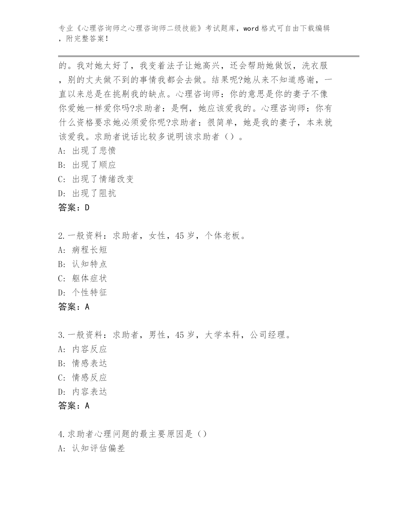 2024甘肃省徽县《心理咨询师之心理咨询师二级技能》考试必考200题真题题库含答案(培优A卷)