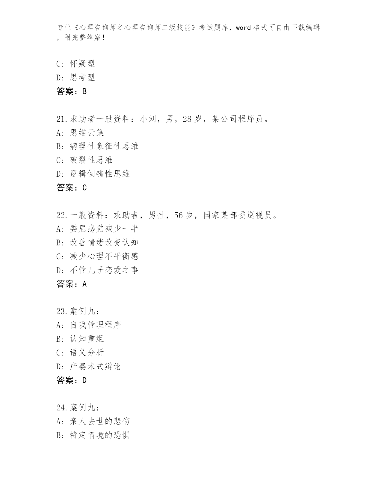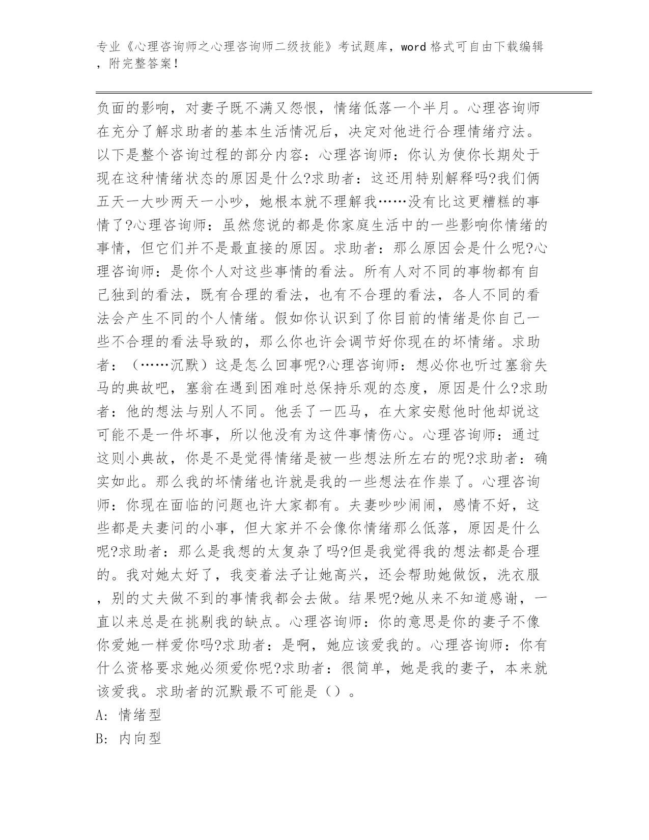 甘肃省西固区2024年《心理咨询师之心理咨询师二级技能》考试必刷200题内部题库附答案(考试直接用)