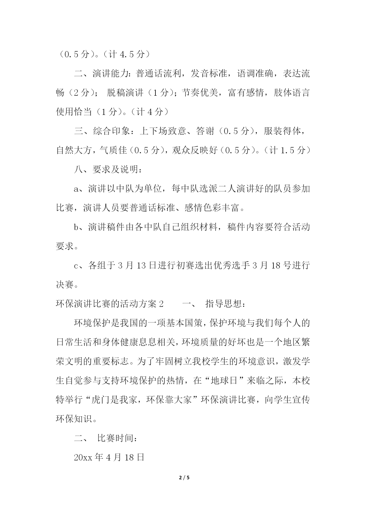 PAGE5/NUMPAGES5环保演讲比赛的活动方案环保演讲比赛的活动方案1为进一步加大环保宣传力度,增强少年儿童的环境保护意识,从而进一步推动全民环保意识的提高,为构建“和谐社会、和谐校园”,促进我校校园文化可持续发展作出积极贡献,少先队大队部决定开展“我们只有一个地球”演讲比赛。特制订如下活动方案:一、活动主题:我们只有一个地球二、参赛对象:五、六中队全体少先队员三、参赛要求:一、演讲内容健康向上,能够紧紧围绕主题。二、演讲题目自拟。三、每人演讲时间为35分钟左右,且使用普通话。四、参赛选手按顺序上台,演讲原则上要求脱稿。四、比赛时间:20xx年3月18日五、演讲地点:多媒体(2)室六、评分细则:比赛采用10分制,评委现场打分,去掉一个最高分和最低分,保留到小数点后两位取平均分。一、演讲内容:紧扣主题、充实生动(2分),语言流畅自然,有感召力(2分)演讲时间不少于4分钟、不超过8分钟(0.5分)。(计4.5分)二、演讲能力:普通话流利,发音标准,语调准确,表达流畅(2分);脱稿演讲(1分);节奏优美,富有感情,肢体语言使用恰当(1分)。(计4分)三、综合印象:上下场致意、答谢(0.5分),服装得体,自然大方,气质佳(0.5分),观众反映好(0.5分)。(计1.5分)八、要求及说明:a、演讲以中队为单位,每中队选派二人演讲好的队员参加比赛,演讲人员要普通话标准、感情色彩丰富。b、演讲稿件由各中队自己组织材料,稿件内容要符合活动要求。c、各组于3月13日进行初赛选出优秀选手3月18号进行决赛。环保演讲比赛的活动方案2一、指导思想:环境保护是我国的一项基本国策,保护环境与我们每个人的日常生活和身体健康息息相关,环境质量的好坏也是一个地区繁荣文明的重要标志。为了牢固树立我校学生的环境意识,激发学生自觉参与支持环境保护的热情,在“地球日”来临之际,本校特举行“虎门是我家,环保靠大家”环保演讲比赛,向学生宣传环保知识。二、比赛时间:20xx年4月18日三、演讲时间:每人34分钟四、比赛办法:中年级组、高年级组进行。以抽签方式排定参赛选手的.顺序。五、具体要求:1、为保证本次演讲比赛的质量,各班要认真进行选拔,推荐优秀选手参加比赛。2、本次演讲比赛的主题是“虎门是我家,环保靠大家”,各班要指导学生紧紧围绕“加强环境保护,建设美好家园”的主题写好演讲稿,避免出现过激言论。3、本次演讲比赛评分主要以主题内容、普通话准确程度、演讲技巧和感染力等方面进行。4、演讲要求在规定时间内完成,超过时间或不足时间都要扣分。六、表彰办法:各级组设立一等奖一名,二等奖二名,三等奖三名,优秀奖若干名。环保演讲比赛的活动方案3为进一步加大环保宣传力度,增强少年儿童的环境保护意识,从而进一步推动全民环保意识的提高,为构建“和谐社会、和谐校园”,促进我校校园文化可持续发展作出积极贡献,少先队大队部决定开展“我们只有一个地球”演讲比赛。特制订如下活动方案:一、活动主题:我们只有一个地球二、参赛对象:五、六中队全体少先队员三、参赛要求:1、演讲内容健康向上,能够紧紧围绕主题。2、演讲题目自拟。3、每人演讲时间为3—5分钟左右,且使用普通话。4、参赛选手按顺序上台,演讲原则上要求脱稿。四、比赛时间:20xx年3月18日五、演讲地点:多媒体(2)室六、评分细则:比赛采用10分制,评委现场打分,去掉一个最高分和最低分,保留到小数点后两位取平均分。1、演讲内容:紧扣主题、充实生动(2分),语言流畅自然,有感召力(2分)演讲时间不少于4分钟、不超过8分钟(0.5分)。(计4.5分)2、演讲能力:普通话流利,发音标准,语调准确,表达流畅(2分);脱稿演讲(1分);节奏优美,富有感情,肢体语言使用恰当(1分)。(计4分)3、综合印象:上下场致意、答谢(0.5分),服装得体,自然大方,气质佳(0.5分),观众反映好(0.5分)。(计1.5分)七、要求及说明:a、演讲以中队为单位,每中队选派二人演讲好的队员参加比赛,演讲人员要普通话标准、感情色彩丰富。b、演讲稿件由各中队自己组织材料,稿件内容要符合活动要求。c、各组于3月13日进行初赛选出优秀选手3月18号进行决赛。