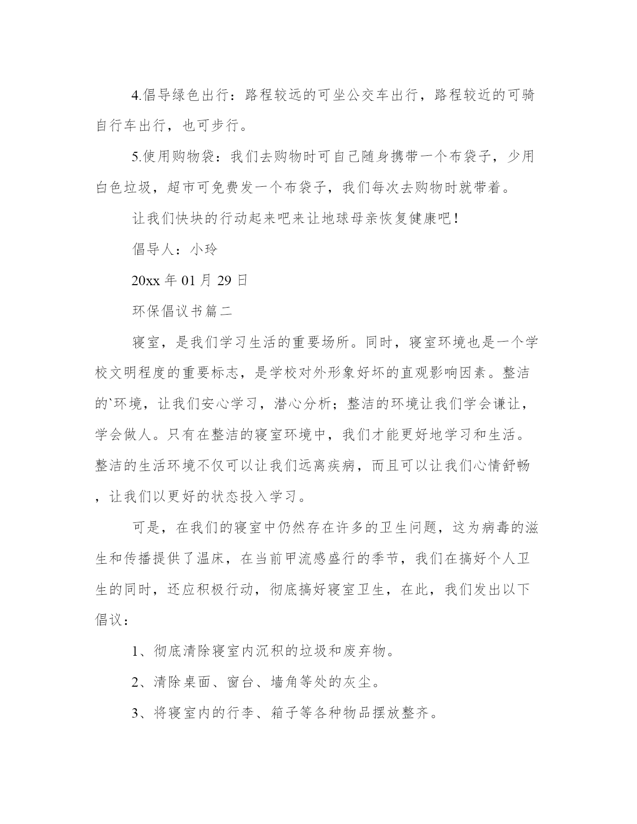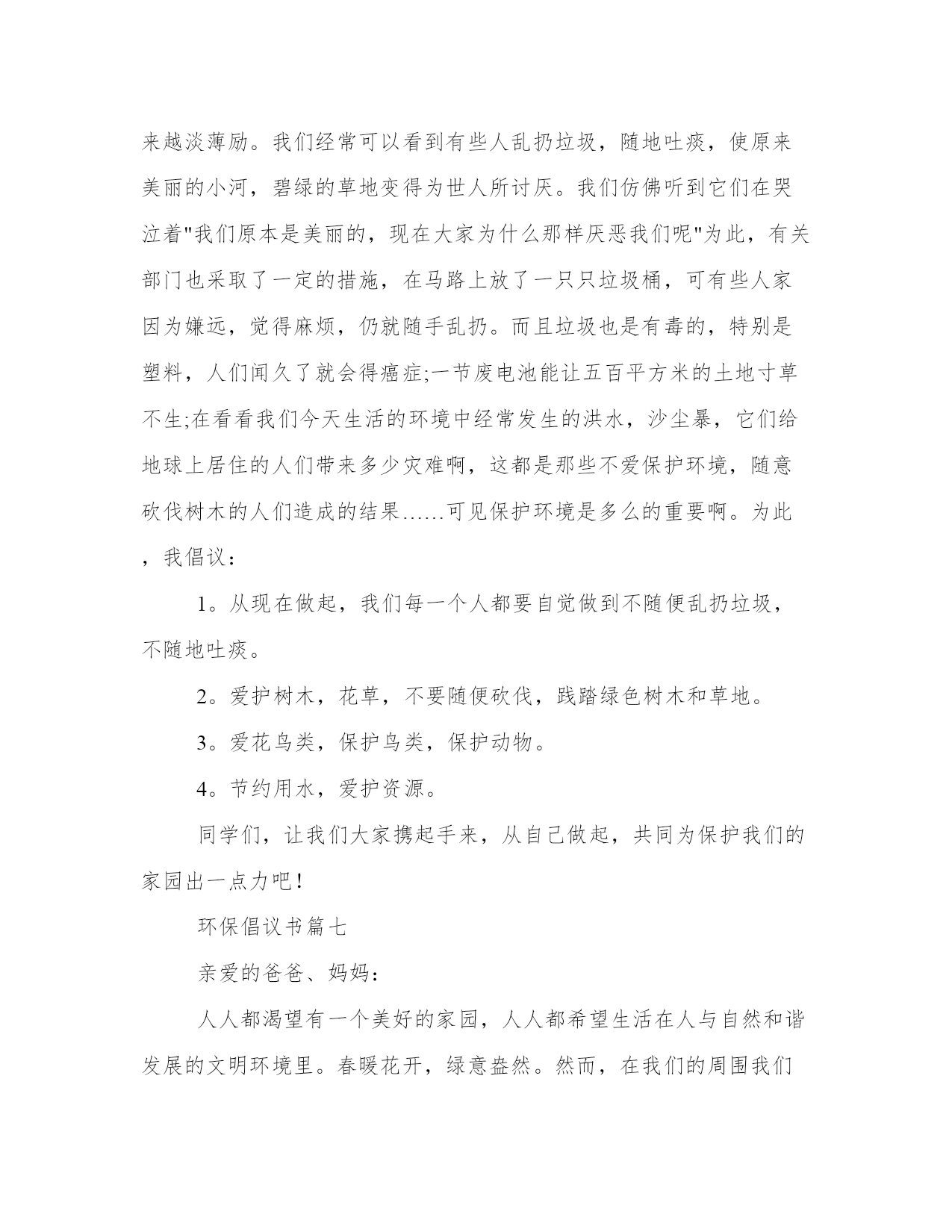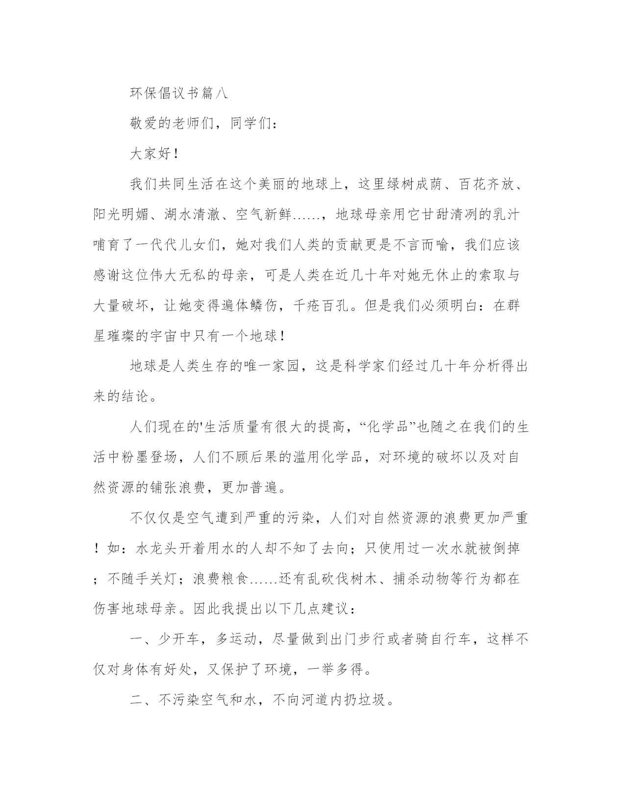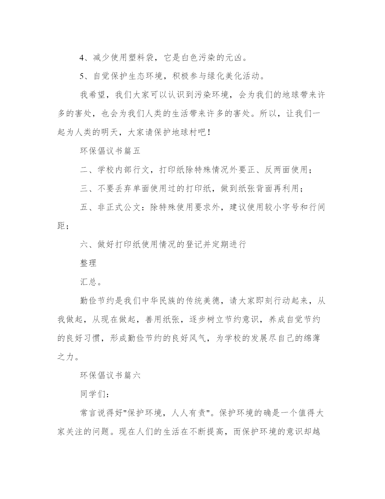 环保倡议书(实用9篇)无论是身处学校还是步入社会,大家都尝试过写作吧,借助写作也可以提高我们的语言组织能力。那么我们该如何写一篇较为完美的范文呢?下面是小编帮大家整理的优质范文,仅供参考,大家一起来看看吧。环保倡议书篇一我经常听妈妈和爸爸说起他们小时候的家里,草儿是翠绿的,树也是直直的,花儿也是争芳斗艳的开放。可现在连树也看不到几棵了,草儿也变得枯黄了,花儿也枯萎了。还听爸爸妈妈他们说那时候躺在草坪上望着天空,天是蓝蓝的,可现在天空是灰蒙蒙的。地球母亲正在受伤。所以我想让地球妈妈变得健康,所以我提出以下建议:1.我们要节约用水:洗完手后不要忘记关闭水龙头,淘完米的水可以来浇花、洗餐具,最好先用纸把餐具上的油污擦去,用热水洗一遍,最后才用较多的温水或冷水冲洗干净。2.我们要节约用纸:我们写过的本子可以反过来用,也可以当作草纸,我们看过的旧报纸旧书本可以拿去废品收货站,可以让它们回收二次利用。3.我们要节约用电:家用电器不要让它长时间处于待机状态,一来浪费电,二来会减短家用电器使用寿命,在不使用的时候就关掉。电脑不用时要关闭,要记得关掉显示器。4.倡导绿色出行:路程较远的可坐公交车出行,路程较近的可骑自行车出行,也可步行。5.使用购物袋:我们去购物时可自己随身携带一个布袋子,少用白色垃圾,超市可免费发一个布袋子,我们每次去购物时就带着。让我们快块的行动起来吧来让地球母亲恢复健康吧!倡导人:小玲20xx年01月29日环保倡议书篇二寝室,是我们学习生活的重要场所。同时,寝室环境也是一个学校文明程度的重要标志,是学校对外形象好坏的直观影响因素。整洁的`环境,让我们安心学习,潜心分析;整洁的环境让我们学会谦让,学会做人。只有在整洁的寝室环境中,我们才能更好地学习和生活。整洁的生活环境不仅可以让我们远离疾病,而且可以让我们心情舒畅,让我们以更好的状态投入学习。可是,在我们的寝室中仍然存在许多的卫生问题,这为病毒的滋生和传播提供了温床,在当前甲流感盛行的季节,我们在搞好个人卫生的同时,还应积极行动,彻底搞好寝室卫生,在此,我们发出以下倡议:1、彻底清除寝室内沉积的垃圾和废弃物。2、清除桌面、窗台、墙角等处的灰尘。3、将寝室内的行李、箱子等各种物品摆放整齐。4、清理寝室内的各种电源线、网线等,不乱牵电源线和网线。5、对寝室进行适当的装饰,努力营造舒适的寝室环境。6、自觉维护寝室的清洁卫生,寝室值日生做好每天寝室打扫工作。7、不在寝室墙壁、桌椅等室内设施乱画,发现桌椅等物品有污迹应主动檫除。8、建立环保观念,节约各项资源。做到适度消费,资源再生。同学们,创建卫生寝室,人人有责,人人受益。让我们积极行动起来,从点滴做起,自觉保持,互相监督,为防控甲流,创建文明卫生校园贡献出自己的一份力量,用你我的热情和真诚,塑造崭新的校园环境;努力学习,提高修养,早日实现人生价值的飞跃。攀枝花学院学生会生活部环保倡议书篇三敬爱的老师,亲爱的同学们:大家好!我是育英学校六(5)班的一名学生,我叫xxx。地球是人类的母亲,是生命的摇篮,像我们学过的课文一样,“地球所拥有的自然资源都是有限的。”我们不能指望把地球破坏了之后,再移居到别的星球去住。人类,改正这损人不利己的习惯吧!用行动保护地球!不要乱砍乱伐了!不要过度开采矿产了!不要随意排泄污水了!不要……无数个“不要”,字字句句体现出人类对地球愈来愈大的破坏啊!环保倡议书篇四各位同学,老师:大家好!我今天要演讲的题目就是保护地球,而保护地球的首要任务,就是保护环境。但是这样的意识,却不是我们每个人时刻都能意识到的。当我走在水泥路上,望着刺眼的太阳,再看地上的垃圾,我们人类终究还能还有多少个年月?春夏秋冬,四季都是片无生机。春天,我回老家,黄河两旁全是垃圾,牛奶盒、烟头、塑料袋、包装盒、袋、未吃完的食品等垃圾遍地都是,一眼望去犹如一个垃圾场。夏天,走路,一步一声响,满地都是雪糕袋。秋天,地上都是水果皮比如:橘子皮、香蕉皮、柿子皮……冬天大雪纷纷,地上全是小树们的“胳膊”和“手”,树上的雪全被弄得所剩无几了。看着,在此我向大家提几条倡议:1、爱护好自己身边的环境。2、为保护森林、矿产等自然资源,尽量购买使用再生材料制成的、可多次长期使用的商品;减少使用一次性纸杯、一次性木筷和餐盒等。3、不要乱扔垃圾,不随地吐痰。4、减少使用塑料袋,它是白色污染的元凶。5、自觉保护生态环境,积极参与绿化美化活动。我希望,我们大家可以认识到污染环境,会为我们的地球带来许多的害处,也会为我们人类的生活带来许多的害处。所以,让我们一起为人类的明天,大家请保护地球村吧!环保倡议书篇五二、学校内部行文,打印纸除特殊情况外要正、反两面使用;三、不要丢弃单面使用过的打印