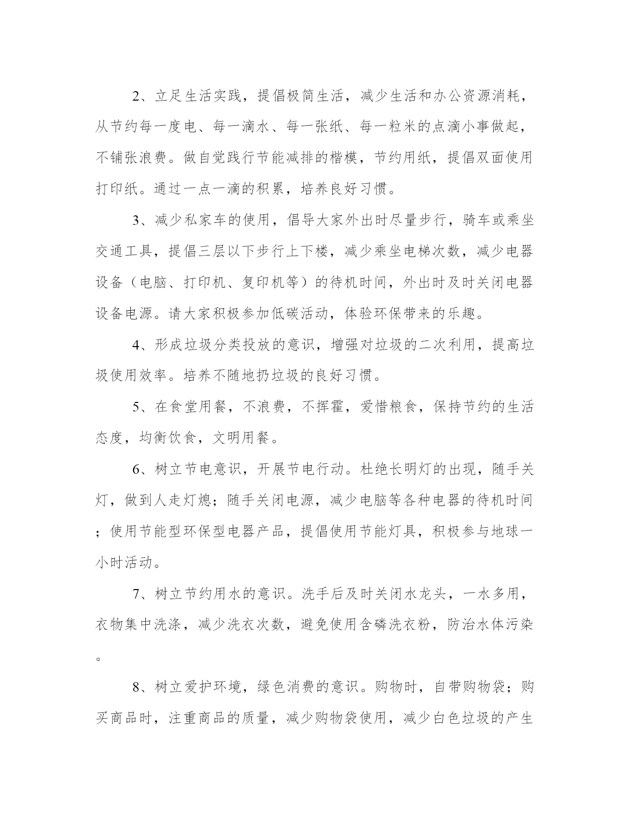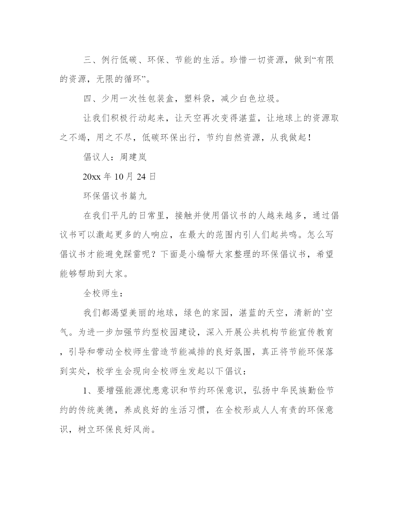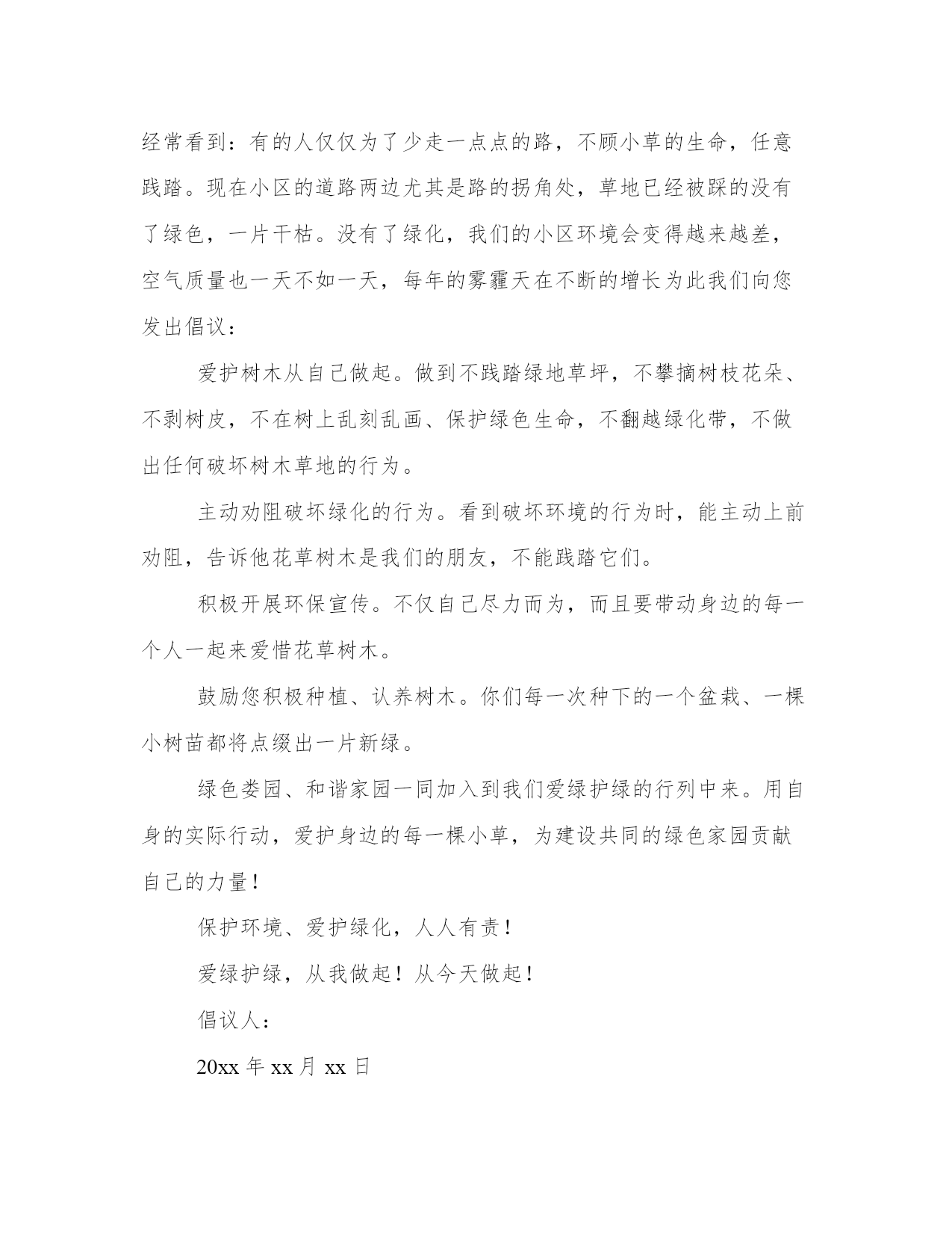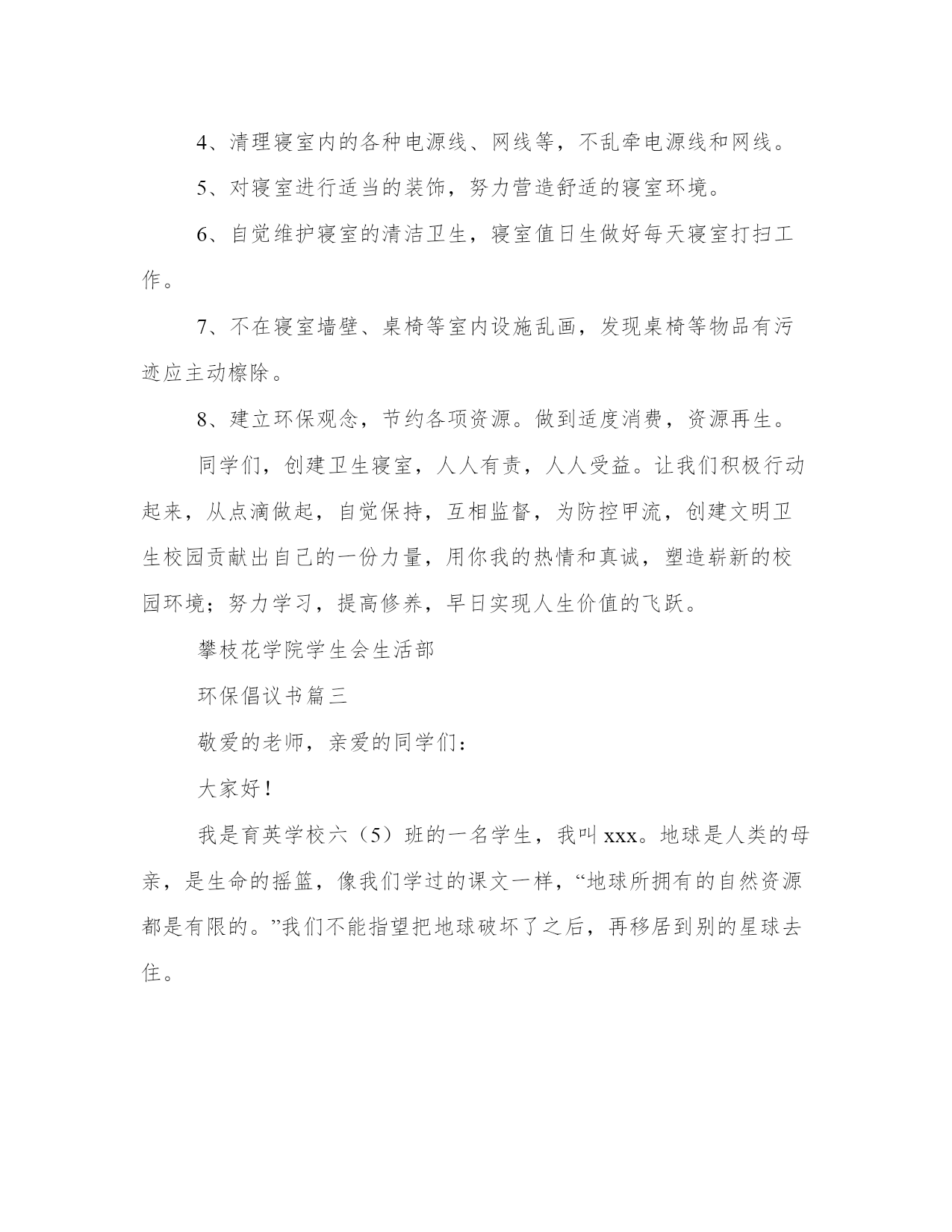 环保倡议书(实用9篇)无论是身处学校还是步入社会,大家都尝试过写作吧,借助写作也可以提高我们的语言组织能力。那么我们该如何写一篇较为完美的范文呢?下面是小编帮大家整理的优质范文,仅供参考,大家一起来看看吧。环保倡议书篇一我经常听妈妈和爸爸说起他们小时候的家里,草儿是翠绿的,树也是直直的,花儿也是争芳斗艳的开放。可现在连树也看不到几棵了,草儿也变得枯黄了,花儿也枯萎了。还听爸爸妈妈他们说那时候躺在草坪上望着天空,天是蓝蓝的,可现在天空是灰蒙蒙的。地球母亲正在受伤。所以我想让地球妈妈变得健康,所以我提出以下建议:1.我们要节约用水:洗完手后不要忘记关闭水龙头,淘完米的水可以来浇花、洗餐具,最好先用纸把餐具上的油污擦去,用热水洗一遍,最后才用较多的温水或冷水冲洗干净。2.我们要节约用纸:我们写过的本子可以反过来用,也可以当作草纸,我们看过的旧报纸旧书本可以拿去废品收货站,可以让它们回收二次利用。3.我们要节约用电:家用电器不要让它长时间处于待机状态,一来浪费电,二来会减短家用电器使用寿命,在不使用的时候就关掉。电脑不用时要关闭,要记得关掉显示器。4.倡导绿色出行:路程较远的可坐公交车出行,路程较近的可骑自行车出行,也可步行。5.使用购物袋:我们去购物时可自己随身携带一个布袋子,少用白色垃圾,超市可免费发一个布袋子,我们每次去购物时就带着。让我们快块的行动起来吧来让地球母亲恢复健康吧!倡导人:小玲20xx年01月29日环保倡议书篇二寝室,是我们学习生活的重要场所。同时,寝室环境也是一个学校文明程度的重要标志,是学校对外形象好坏的直观影响因素。整洁的`环境,让我们安心学习,潜心分析;整洁的环境让我们学会谦让,学会做人。只有在整洁的寝室环境中,我们才能更好地学习和生活。整洁的生活环境不仅可以让我们远离疾病,而且可以让我们心情舒畅,让我们以更好的状态投入学习。可是,在我们的寝室中仍然存在许多的卫生问题,这为病毒的滋生和传播提供了温床,在当前甲流感盛行的季节,我们在搞好个人卫生的同时,还应积极行动,彻底搞好寝室卫生,在此,我们发出以下倡议:1、彻底清除寝室内沉积的垃圾和废弃物。2、清除桌面、窗台、墙角等处的灰尘。3、将寝室内的行李、箱子等各种物品摆放整齐。4、清理寝室内的各种电源线、网线等,不乱牵电源线和网线。5、对寝室进行适当的装饰,努力营造舒适的寝室环境。6、自觉维护寝室的清洁卫生,寝室值日生做好每天寝室打扫工作。7、不在寝室墙壁、桌椅等室内设施乱画,发现桌椅等物品有污迹应主动檫除。8、建立环保观念,节约各项资源。做到适度消费,资源再生。同学们,创建卫生寝室,人人有责,人人受益。让我们积极行动起来,从点滴做起,自觉保持,互相监督,为防控甲流,创建文明卫生校园贡献出自己的一份力量,用你我的热情和真诚,塑造崭新的校园环境;努力学习,提高修养,早日实现人生价值的飞跃。攀枝花学院学生会生活部环保倡议书篇三敬爱的老师,亲爱的同学们:大家好!我是育英学校六(5)班的一名学生,我叫xxx。地球是人类的母亲,是生命的摇篮,像我们学过的课文一样,“地球所拥有的自然资源都是有限的。”我们不能指望把地球破坏了之后,再移居到别的星球去住。人类,改正这损人不利己的习惯吧!用行动保护地球!不要乱砍乱伐了!不要过度开采矿产了!不要随意排泄污水了!不要……无数个“不要”,字字句句体现出人类对地球愈来愈大的破坏啊!环保倡议书篇四各位同学,老师:大家好!我今天要演讲的题目就是保护地球,而保护地球的首要任务,就是保护环境。但是这样的意识,却不是我们每个人时刻都能意识到的。当我走在水泥路上,望着刺眼的太阳,再看地上的垃圾,我们人类终究还能还有多少个年月?春夏秋冬,四季都是片无生机。春天,我回老家,黄河两旁全是垃圾,牛奶盒、烟头、塑料袋、包装盒、袋、未吃完的食品等垃圾遍地都是,一眼望去犹如一个垃圾场。夏天,走路,一步一声响,满地都是雪糕袋。秋天,地上都是水果皮比如:橘子皮、香蕉皮、柿子皮……冬天大雪纷纷,地上全是小树们的“胳膊”和“手”,树上的雪全被弄得所剩无几了。看着,在此我向大家提几条倡议:1、爱护好自己身边的环境。2、为保护森林、矿产等自然资源,尽量购买使用再生材料制成的、可多次长期使用的商品;减少使用一次性纸杯、一次性木筷和餐盒等。3、不要乱扔垃圾,不随地吐痰。4、减少使用塑料袋,它是白色污染的元凶。5、自觉保护生态环境,积极参与绿化美化活动。我希望,我们大家可以认识到污染环境,会为我们的地球带来许多的害处,也会为我们人类的生活带来许多的害处。所以,让我们一起为人类的明天,大家请保护地球村吧!环保倡议书篇五二、学校内部行文,打印纸除特殊情况外要正、反两面使用;三、不要丢弃单面使用过的打印
