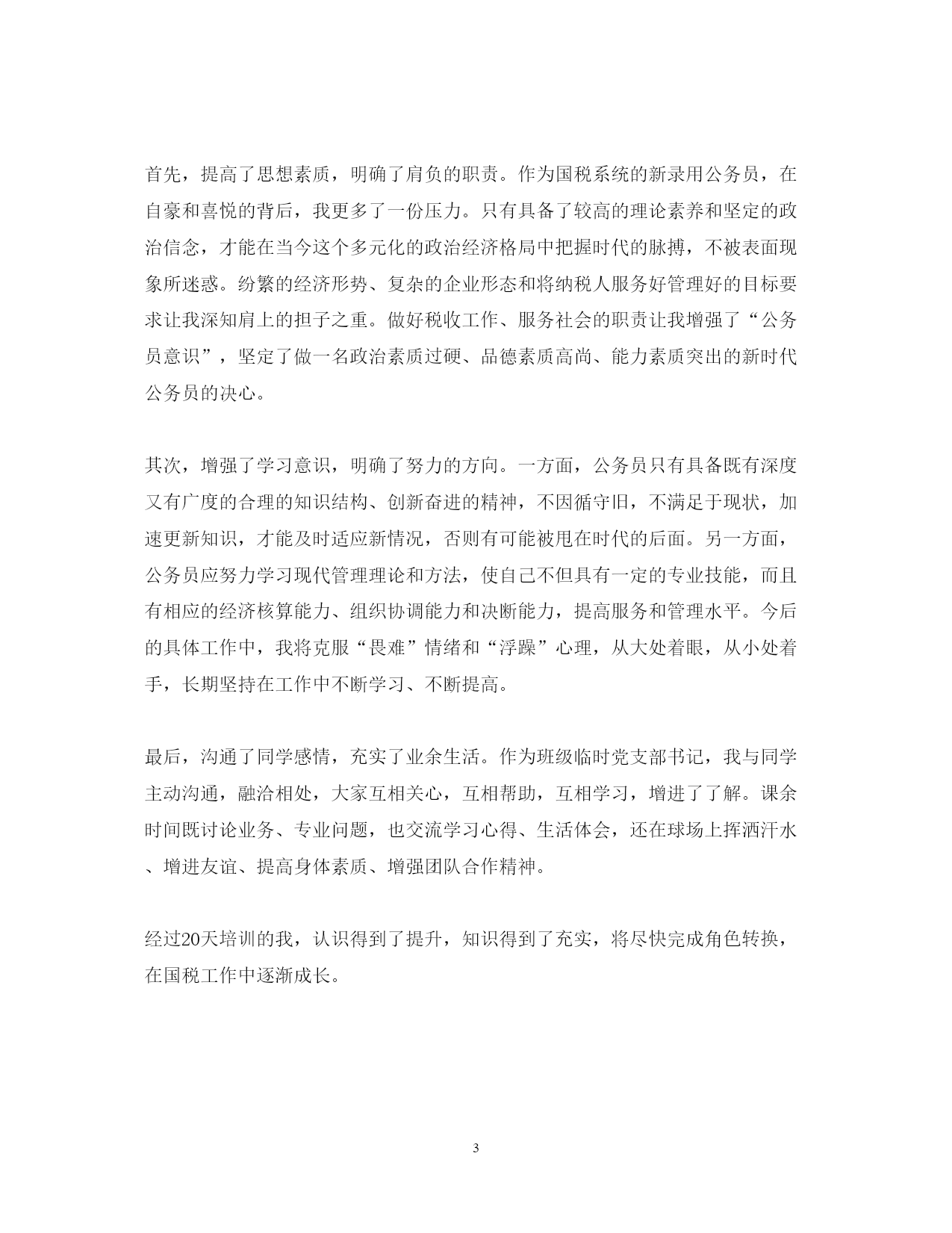 此资料由网络收集而来,如有侵权请告知上传者立即删除。资料共分享,我们负责传递知识。PAGEPAGE3公务员培训总结个人小结一名合格的公务员必须要有较强的学习能力和强劲的动力,下面由小编为大家收集的公务员培训总结,欢迎大家阅读!【公务员培训总结一】10月25日,我有幸参加了我市人社局和市委党校联合举办的20××年新录用公务员初任培训班。在这一周的时间里,我们认真听取了我市组织部、党校、文化、司法、发改委等部门领导专家的讲座,深入浅出地学习了xx届六中全会精神、兴化历史文化、公文写作、组织建设、公务员法制行为规范、xx规划等方面知识。在这紧张而充实的培训中,我始终以高昂的热情、严谨的态度全身心地投入到学习当中去,感觉收获很大。第一、进一步明确了自我定位,统一了思想认识通过初任培训,我深刻认识到作为一名公务员为人民服务并不是一件简单的事情,不仅要有主观上的热情和干劲,还要求有扎实的业务知识和必须具备的能力,才能达到为人民服务的要求。今后我将把理想信念融入到平凡的工作,重要的是行动和实干。首先,要有从我做起、从点滴做起的求实精神,珍惜岗位,踏实工作;其次,要有实事求是和高度负责的科学精神,加强实践,敢于尝试,勇于创新,善于创造性地开展工作,从而在实践锻炼中提高工作本领,并增强对不同类型重大变化的应变能力。第三,要有克服困难和挫折的进取精神,立足本职岗位,服务广大群众,服务大局,创造性地解决各类难题,积极投身我市各项中心工作。第二、进一步增长了素养和知识,提高了工作技能本次初任培训的主办方在紧锣密鼓的课程中科学安排了学习内容,理论与实践相结合,知识与技能同步提升,取得了显著的培训实效。通过学习xx届六中全会精神,我们提高了对社会主义核心价值体系重要性的认识,增强了致力于社会主义文化事业大发展、大繁荣的信心,进一步坚定了积极投身我市创建省级文明城市工作的决心。通过学习历史文化和xx规划主要内容,我们增进了对我市基本情况的了解,唤起了大家建设家乡、服务群众的工作热情。公文写作与处理是公务员的必修课,在学习过程中大家仔细聆听,初步掌握了一些公文写作方法和技巧在学习之余,大家认真整理笔记、交流学习心得、巩固学习成果。通过培训,我丰富了知识,开拓了视野,提高了能力和素质,在短时间内最大限度地充实自己,感觉收获颇丰、受益非浅。第三、学员之间增进了了解,建立了深厚的友谊我们70多名学员们来自天南海北,面对来之不易的工作岗位,大家有缘相聚一堂,这次培训是难得的沟通交流机会。在这些天里,我们互相关心,互相帮助,互相学习,大家增进了了解,建立了深厚的友谊,为今后在各自岗位上积极有效地开展各项配合协作创造了和谐的人际关系基础。培训的时间虽然短暂,但是我们学到的知识将受益终生,大家建立的友谊将地久天长。我一定会以这次培训为契机,找出自身差距,尽快实现角色转变,切实加强学习,努力提高自身素质,解放思想,开拓创新,与时俱进,时刻牢记党的宗旨,尽职履责,做一名让党和政府放心、人民群众满意的合格公仆,为建设“富庶、生态、文化、和谐、幸福”而努力奋斗。【公务员培训总结二】匆匆地,我走过了江苏××系统20××年新录用公务员培训的短短20天。从开学典礼上的廉政教育第一课到破冰活动,从会计基础知识到各种税收专业知识,从公文写作到税收征管系统的应用,短短二十天的培训时光紧张而充实。首先,提高了思想素质,明确了肩负的职责。作为国税系统的新录用公务员,在自豪和喜悦的背后,我更多了一份压力。只有具备了较高的理论素养和坚定的政治信念,才能在当今这个多元化的政治经济格局中把握时代的脉搏,不被表面现象所迷惑。纷繁的经济形势、复杂的企业形态和将纳税人服务好管理好的目标要求让我深知肩上的担子之重。做好税收工作、服务社会的职责让我增强了“公务员意识”,坚定了做一名政治素质过硬、品德素质高尚、能力素质突出的新时代公务员的决心。其次,增强了学习意识,明确了努力的方向。一方面,公务员只有具备既有深度又有广度的合理的知识结构、创新奋进的精神,不因循守旧,不满足于现状,加速更新知识,才能及时适应新情况,否则有可能被甩在时代的后面。另一方面,公务员应努力学习现代管理理论和方法,使自己不但具有一定的专业技能,而且有相应的经济核算能力、组织协调能力和决断能力,提高服务和管理水平。今后的具体工作中,我将克服“畏难”情绪和“浮躁”心理,从大处着眼,从小处着手,长期坚持在工作中不断学习、不断提高。最后,沟通了同学感情,充实了业余生活。作为班级临时党支部书记,我与同学主动沟通,融洽相处,大家互相关心,互相帮助,互相学习,增进了了解。课余时间既讨论业务、专业问题,也交流学习心得、生活体会,还在球场上挥洒汗水、增进友谊、提高身体素质、增强团队合作精神。经过20天培训的