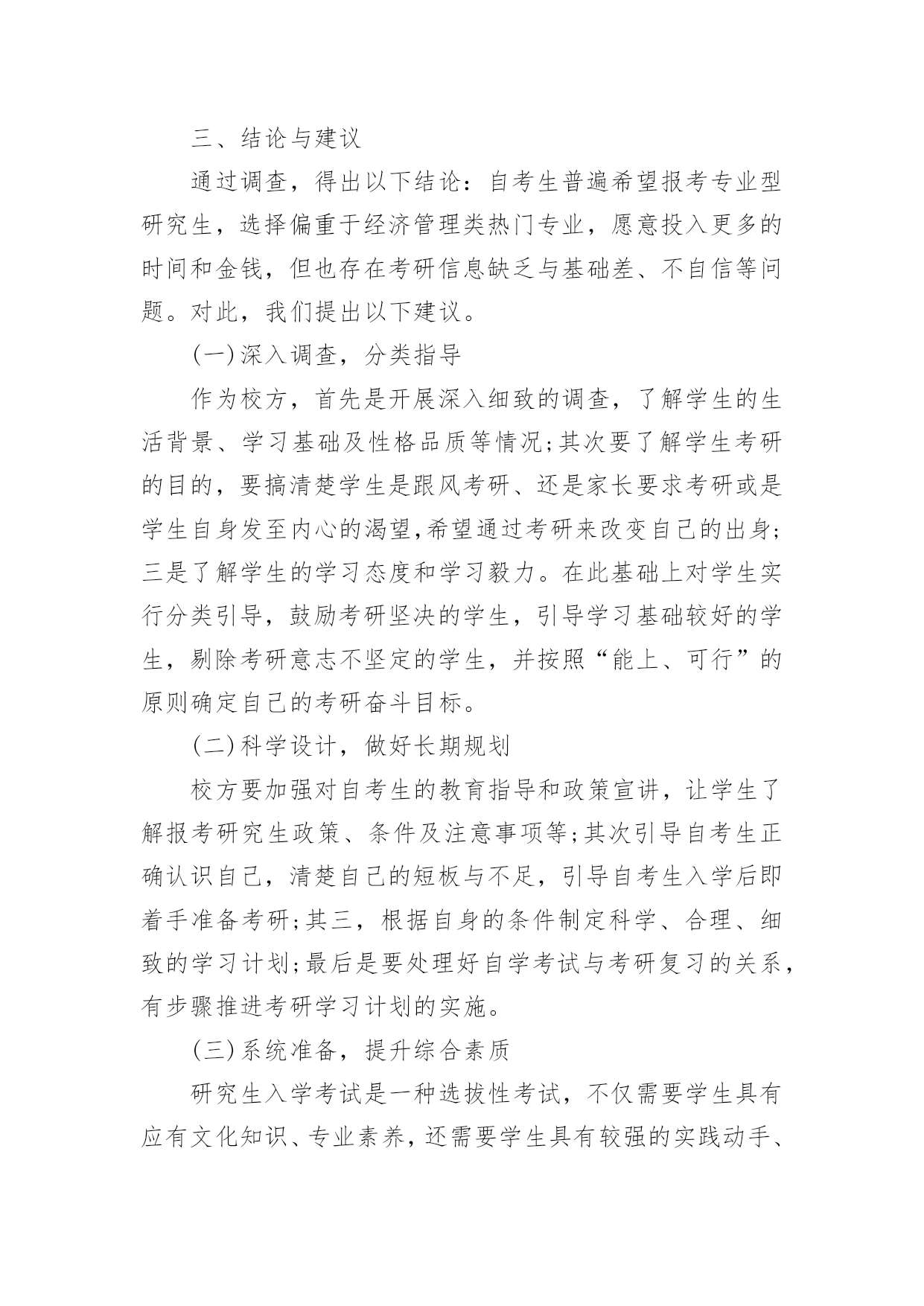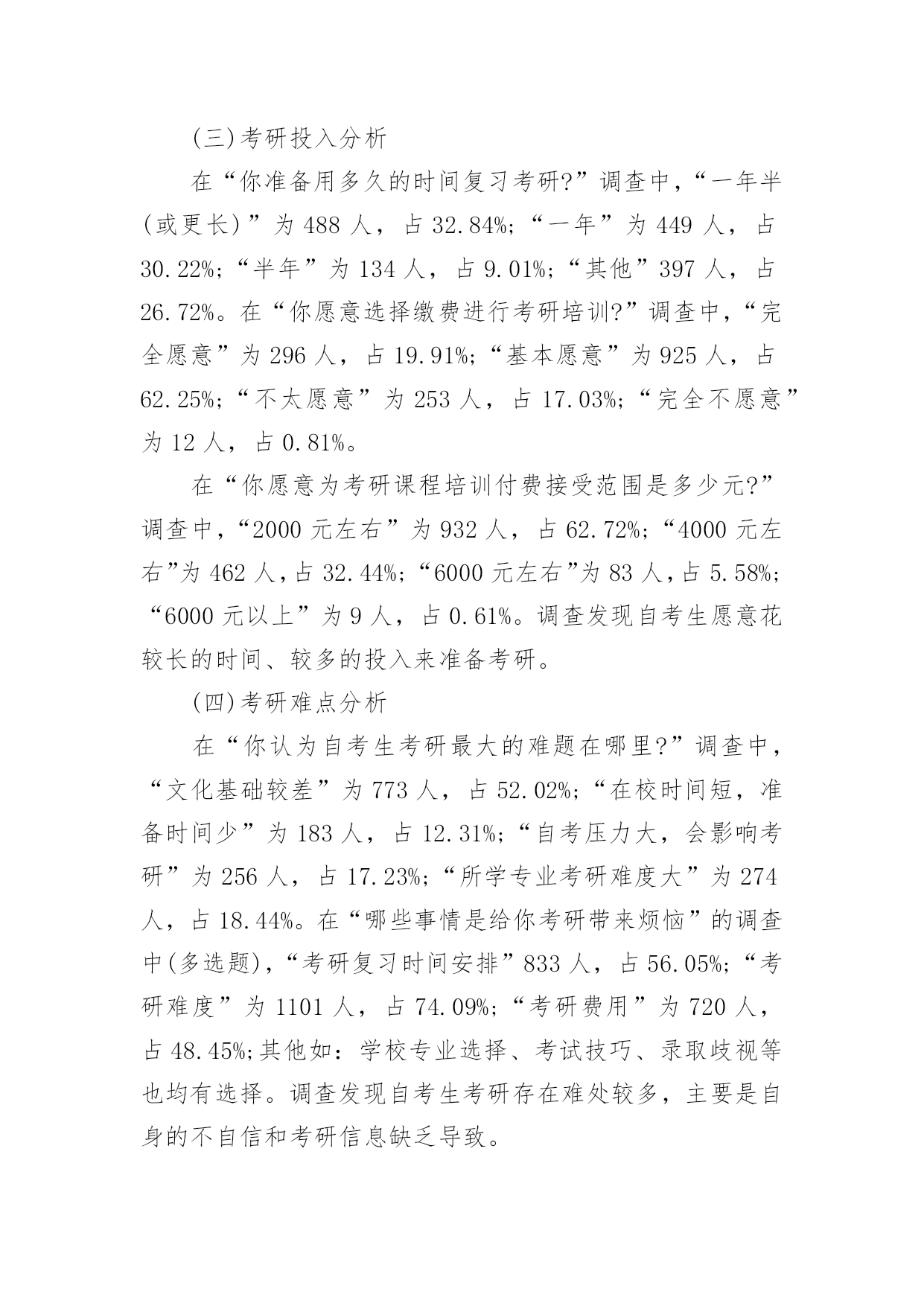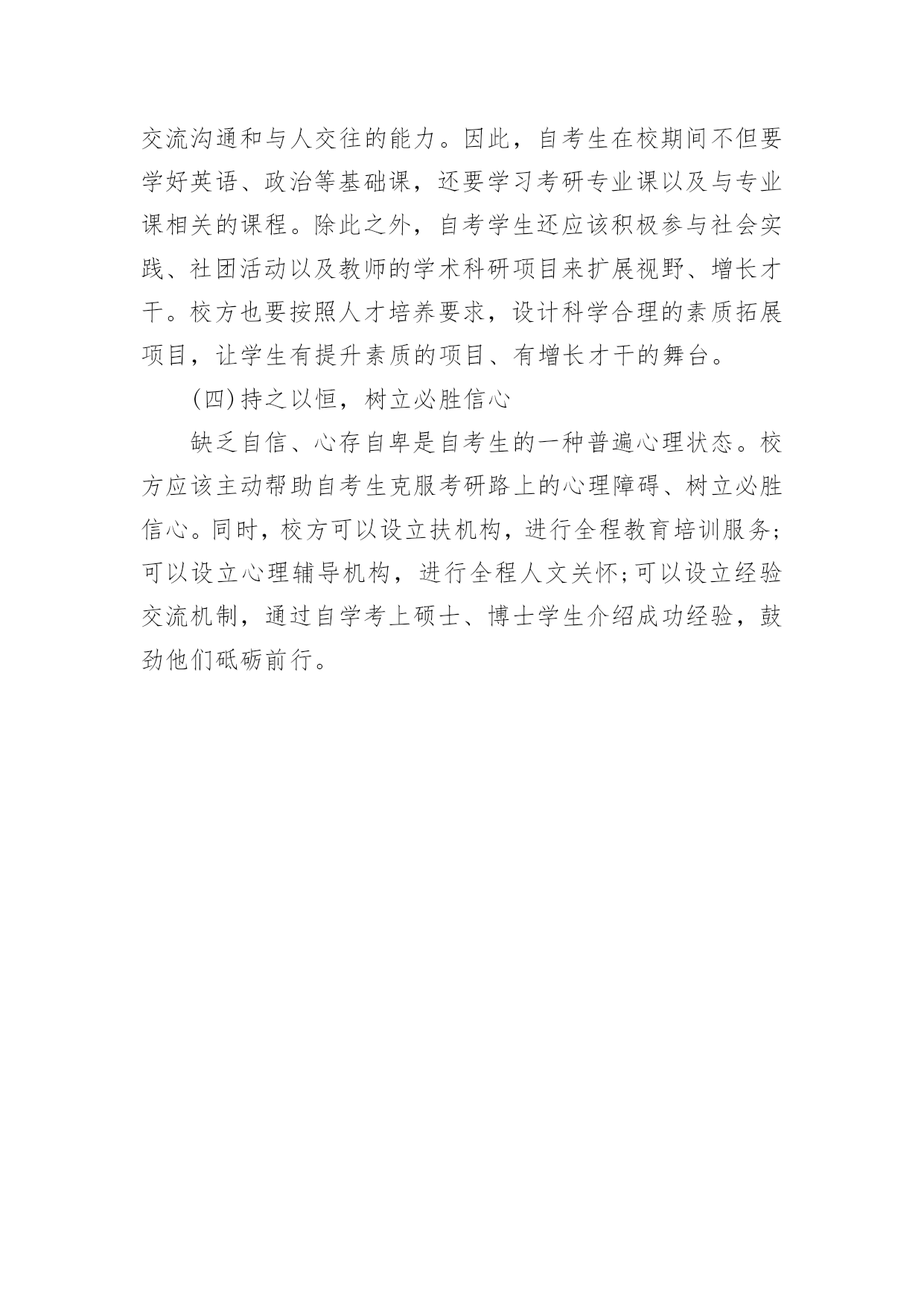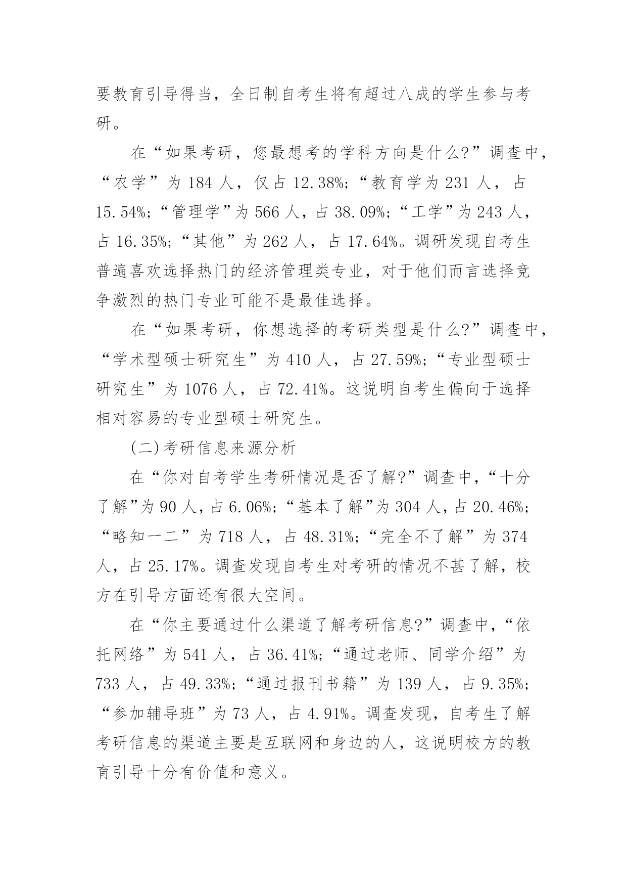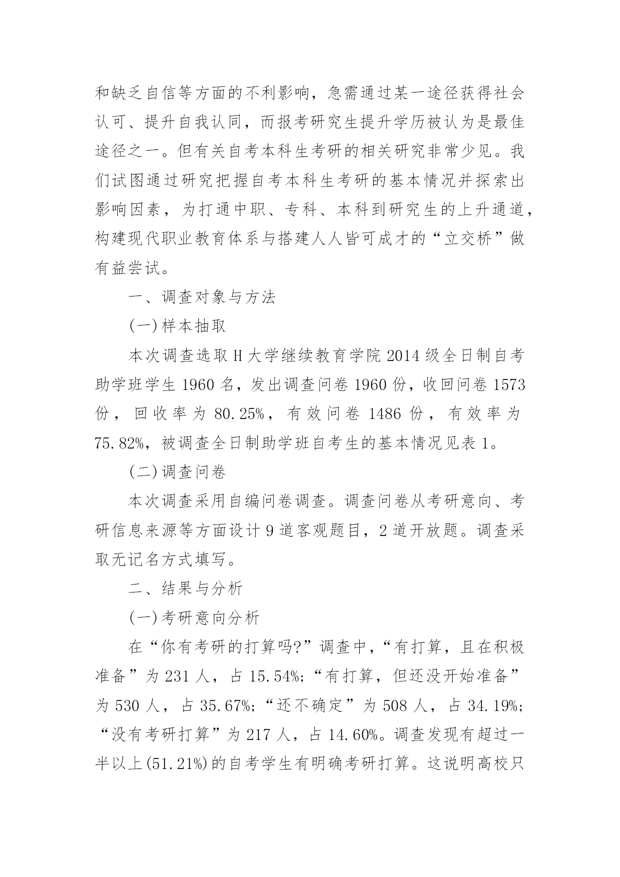 构建自考本科到研究生上升通道的思考论文构建自考本科到研究生上升通道的思考论文为了解全日制自考生考研意向、考研投入和考研难点,采取全面调查的方式对H大学继续教育学院2014级1486名全日制自考生进行问卷调查。结果发现:自考生普遍具有考研意向,报考研究生的类型为专业型,偏重于经济管理类等热门专业,有投入更多的时间和金钱意愿,但也存在考研信息缺乏与基础差、不自信等问题。据此提出深入调查、分类指导,科学设计、做好长期规划,系统准备、提升综合素质,持之以恒、树立必胜信心等对策建议,以期为自考生成长搭建“立交桥”。根据发布的《全国研究生招生数据调查报告(2014年)》显示:近20年内,考研报名人数继2008年后,2014年出现第二次下降,这只说明2014年硕士研究生报考热度有所趋缓,但报考研究生依然是青年人高考过后的“第二次考试浪潮”。考研是学生个人、学校和社会的事情,它直接关系大学教育目标的实现和青年素质的提升,因此有必要针对考研进行理性分析和透视了解。全日制自考助学班是利用主考高校资源,全日制授课,规范化管理的办学形式。全日制自考助学班学生在获取高校优质教学资源的同时,也面临学历社会认可度低、内心挣扎和缺乏自信等方面的不利影响,急需通过某一途径获得社会认可、提升自我认同,而报考研究生提升学历被认为是最佳途径之一。但有关自考本科生考研的相关研究非常少见。我们试图通过研究把握自考本科生考研的基本情况并探索出影响因素,为打通中职、专科、本科到研究生的上升通道,构建现代职业教育体系与搭建人人皆可成才的“立交桥”做有益尝试。一、调查对象与方法(一)样本抽取本次调查选取H大学继续教育学院2014级全日制自考助学班学生1960名,发出调查问卷1960份,收回问卷1573份,回收率为80.25%,有效问卷1486份,有效率为75.82%,被调查全日制助学班自考生的基本情况见表1。(二)调查问卷本次调查采用自编问卷调查。调查问卷从考研意向、考研信息来源等方面设计9道客观题目,2道开放题。调查采取无记名方式填写。二、结果与分析(一)考研意向分析在“你有考研的打算吗?”调查中,“有打算,且在积极准备”为231人,占15.54%;“有打算,但还没开始准备”为530人,占35.67%;“还不确定”为508人,占34.19%;“没有考研打算”为217人,占14.60%。调查发现有超过一半以上(51.21%)的自考学生有明确考研打算。这说明高校只要教育引导得当,全日制自考生将有超过八成的学生参与考研。在“如果考研,您最想考的学科方向是什么?”调查中,“农学”为184人,仅占12.38%;“教育学为231人,占15.54%;“管理学”为566人,占38.09%;“工学”为243人,占16.35%;“其他”为262人,占17.64%。调研发现自考生普遍喜欢选择热门的经济管理类专业,对于他们而言选择竞争激烈的热门专业可能不是最佳选择。在“如果考研,你想选择的考研类型是什么?”调查中,“学术型硕士研究生”为410人,占27.59%;“专业型硕士研究生”为1076人,占72.41%。这说明自考生偏向于选择相对容易的专业型硕士研究生。(二)考研信息来源分析在“你对自考学生考研情况是否了解?”调查中,“十分了解”为90人,占6.06%;“基本了解”为304人,占20.46%;“略知一二”为718人,占48.31%;“完全不了解”为374人,占25.17%。调查发现自考生对考研的情况不甚了解,校方在引导方面还有很大空间。在“你主要通过什么渠道了解考研信息?”调查中,“依托网络”为541人,占36.41%;“通过老师、同学介绍”为733人,占49.33%;“通过报刊书籍”为139人,占9.35%;“参加辅导班”为73人,占4.91%。调查发现,自考生了解考研信息的渠道主要是互联网和身边的人,这说明校方的教育引导十分有价值和意义。(三)考研投入分析在“你准备用多久的时间复习考研?”调查中,“一年半(或更长)”为488人,占32.84%;“一年”为449人,占30.22%;“半年”为134人,占9.01%;“其他”397人,占26.72%。在“你愿意选择缴费进行考研培训?”调查中,“完全愿意”为296人,占19.91%;“基本愿意”为925人,占62.25%;“不太愿意”为253人,占17.03%;“完全不愿意”为12人,占0.81%。在“你愿意为考研课程培训付费接受范围是多少元?”调查中,“2000元左右”为932人,占62.72%;“4000元左右”为462人,占32.44%;“6000元左右”为83人,占5.58%;“6000元以上”为9人,占0.61%。调查发现自考生愿意花较长的时间、较多的投入来准备考研。(四)考研难点分析在“你认为自考生考研最大的难题在哪里?”调查中,