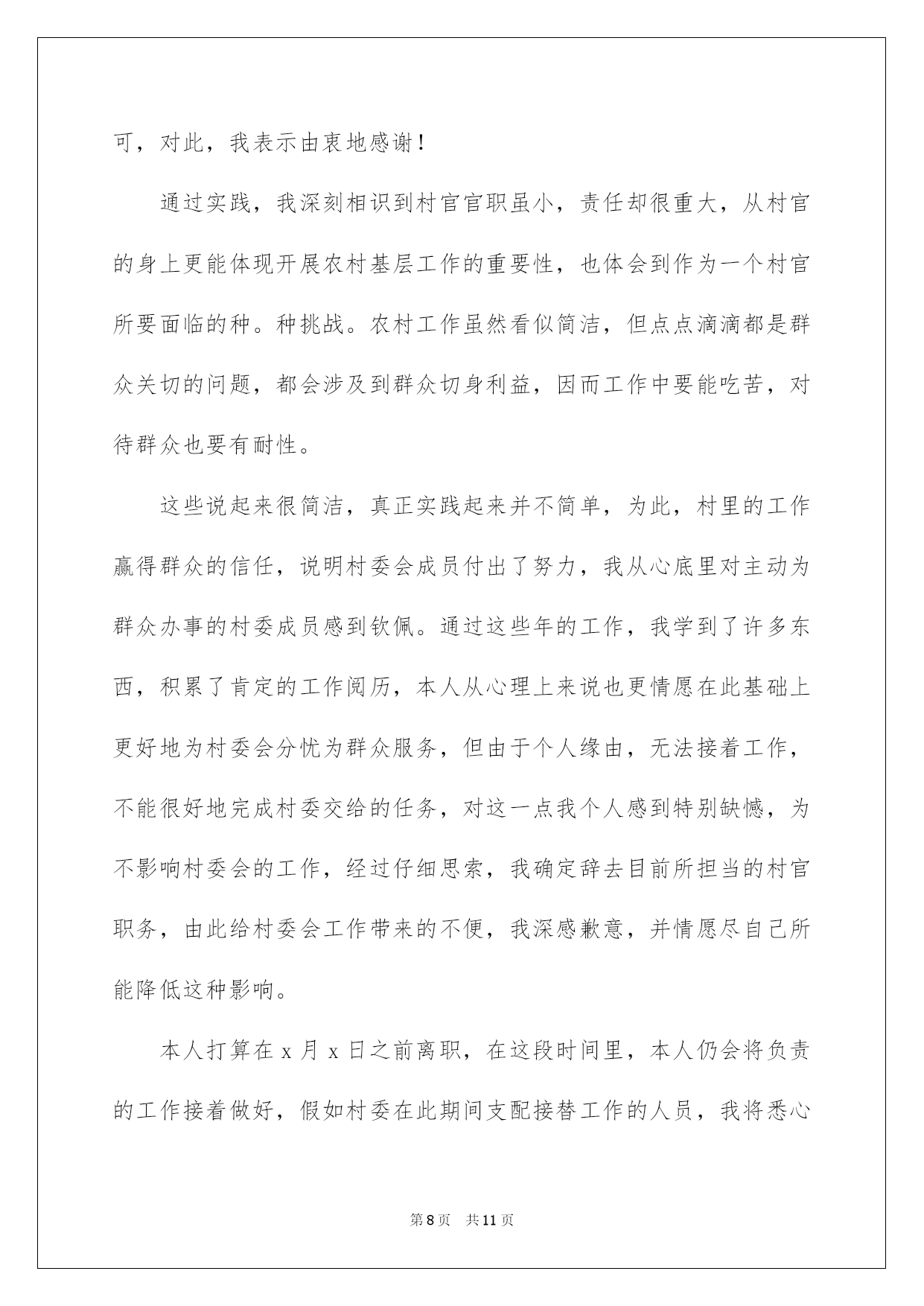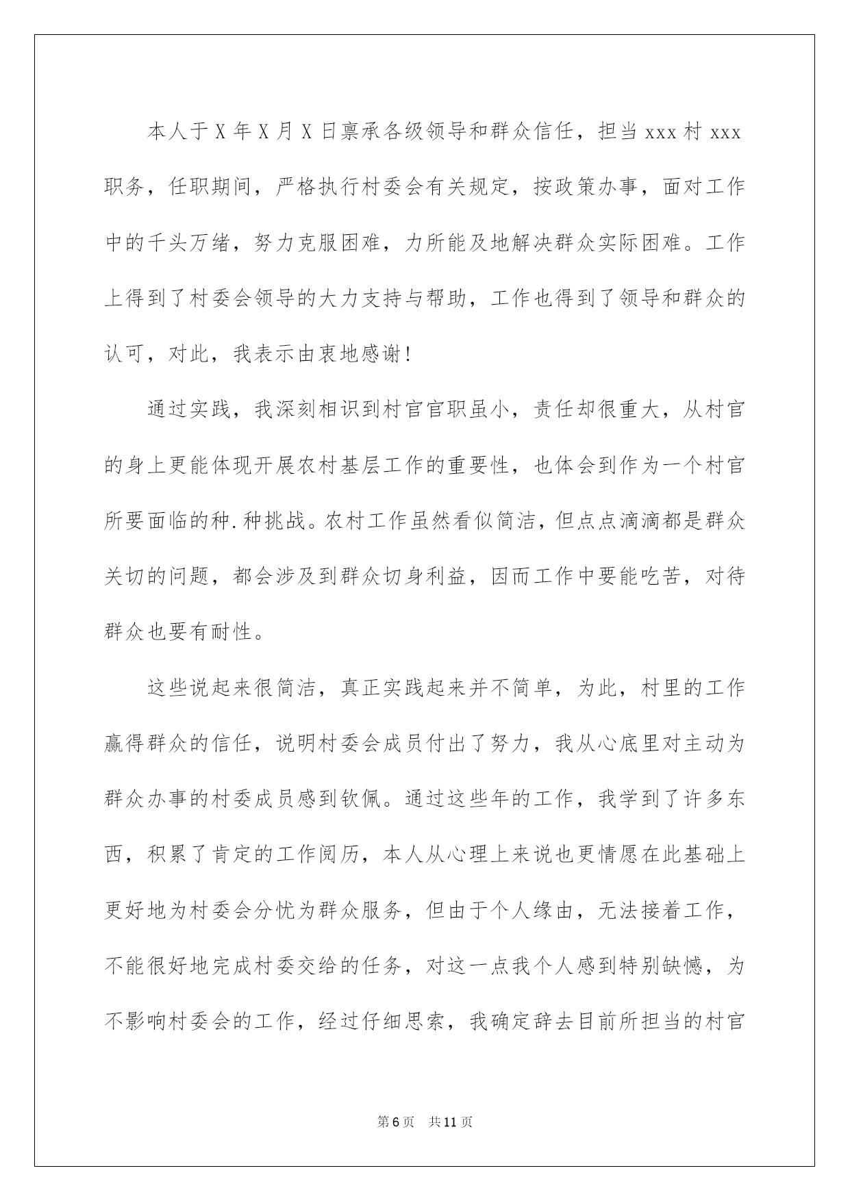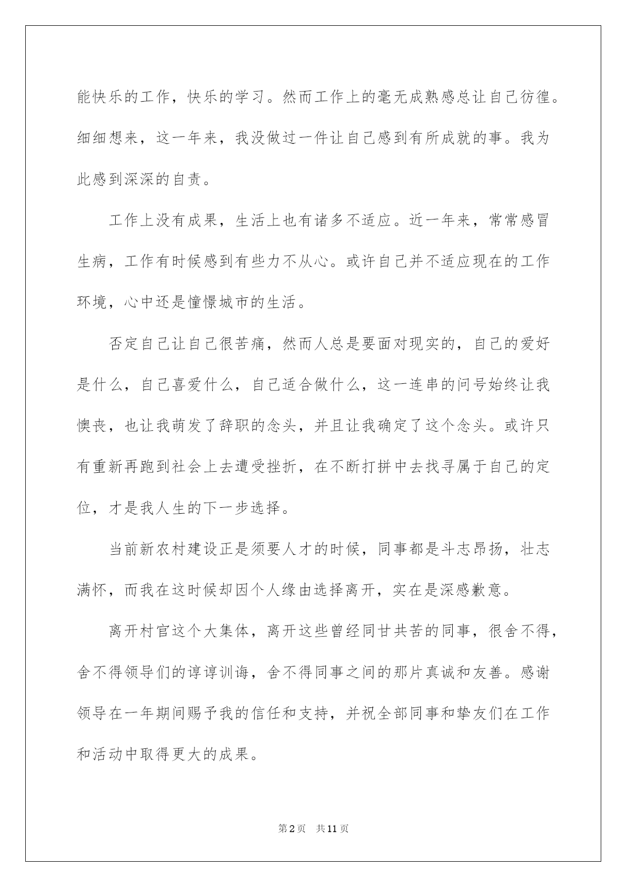 第PAGE\*Arabic\*MERGEFORMAT11页共NUMPAGES\*Arabic\*MERGEFORMAT11页第PAGE\*MERGEFORMAT11页共NUMPAGES\*MERGEFORMAT11页第PAGE\*MERGEFORMAT11页共NUMPAGES\*MERGEFORMAT11页第PAGE\*MERGEFORMAT11页共NUMPAGES\*MERGEFORMAT11页第PAGE\*MERGEFORMAT11页共NUMPAGES\*MERGEFORMAT11页第PAGE\*MERGEFORMAT11页共NUMPAGES\*MERGEFORMAT11页第PAGE\*MERGEFORMAT11页共NUMPAGES\*MERGEFORMAT11页第PAGE\*MERGEFORMAT11页共NUMPAGES\*MERGEFORMAT11页第PAGE\*MERGEFORMAT11页共NUMPAGES\*MERGEFORMAT11页第PAGE\*MERGEFORMAT11页共NUMPAGES\*MERGEFORMAT11页第PAGE\*MERGEFORMAT11页共NUMPAGES\*MERGEFORMAT11页2022基层村干部辞职报告基层村干部辞职报告在人们素养不断提高的今日,报告的运用成为日常生活的常态,我们在写报告的时候要避开篇幅过长。那么,报告究竟怎么写才合适呢?下面是我为大家整理的基层村干部辞职报告,仅供参考,欢迎大家阅读。基层村干部辞职报告1xx村委会首先,感谢党组织一年来对我的培育,也很荣幸自己能成为洪泽村官中的一员。在基层将近一年的工作中,领导给了我许多的培育和关爱,让我学到了很多,也进步了很多。但是出于个人缘由,我选择辞职。在递交这份辞呈时,我的心情非常沉重。来到基层工作也快一年了,正是在这里我起先踏上了社会,完成了自己从一个学生到社会人的转变。有过欢乐,有过收获,也有过泪水和苦痛。领导同等的人际关系和开明的工作作风,一度让我有着找到了依靠的感觉,在这里我能快乐的工作,快乐的学习。然而工作上的毫无成熟感总让自己彷徨。细细想来,这一年来,我没做过一件让自己感到有所成就的事。我为此感到深深的自责。工作上没有成果,生活上也有诸多不适应。近一年来,常常感冒生病,工作有时候感到有些力不从心。或许自己并不适应现在的工作环境,心中还是憧憬城市的生活。否定自己让自己很苦痛,然而人总是要面对现实的,自己的爱好是什么,自己喜爱什么,自己适合做什么,这一连串的问号始终让我懊丧,也让我萌发了辞职的念头,并且让我确定了这个念头。或许只有重新再跑到社会上去遭受挫折,在不断打拼中去找寻属于自己的定位,才是我人生的下一步选择。当前新农村建设正是须要人才的时候,同事都是斗志昂扬,壮志满怀,而我在这时候却因个人缘由选择离开,实在是深感歉意。离开村官这个大集体,离开这些曾经同甘共苦的同事,很舍不得,舍不得领导们的谆谆训诲,舍不得同事之间的那片真诚和友善。感谢领导在一年期间赐予我的信任和支持,并祝全部同事和挚友们在工作和活动中取得更大的成果。xxx20xx年4月26日基层村干部辞职报告2xx乡党委:我是Xx村的党支部书记,现在我慎重递交辞职报告。本人于20xx年2月份考录为村官被乡政府安排到Xx村担当书记助理。20xx年xx月,经过村党支部换届选举,本人被推选为新一届党支部书记。20xx年xx月3日,本人参与Xx市事业单位招录考试,后经过面试、体检、政审等程序,已经到Xx镇人民政府报到上班。依据组织部、所在单位要求及本人综合考虑,现要求辞去中共Xx乡Xx村党支部书记职务,望上级党委予以批准。辞职人:xxx时间:基层村干部辞职报告3敬重的领导:首先,我向各位领导提出辞职的恳求表示深深的歉意。从xx年xx月份到xxx乡政府工作以来,至今已xx年多时间,在这xxx年多的工作当中,有过面对困难时的彷徨和苦累,也有过胜利后的甘甜,是单位把我从一个刚迈出高校校门、不谙世事的学生培育成为一名综合素养较强的机关工作人员。在乡政府工作的xxxx年多来,我得到了各位领导无微不至的关怀和同事的热忱帮助,度过了一段开心、充溢的时间。xx年多以来,由于自己所学专业的局限性,我在工作中深深感到自己相关学问的缺乏,虽然工作得到领导的认可和同事的好评,但仍旧感觉自己在工作上始终处于一个比较被动的局面,而作为我本身来讲,我始终不干平凡,自己创业做自己喜爱的事业始终是我的幻想。时间荏苒,岁月如梭。转瞬之间,我已经到了而立之年。在这个重要的人生转折点,突然从狂想的梦中醒来,回到现实中,发觉青春一去不复返。年龄告知