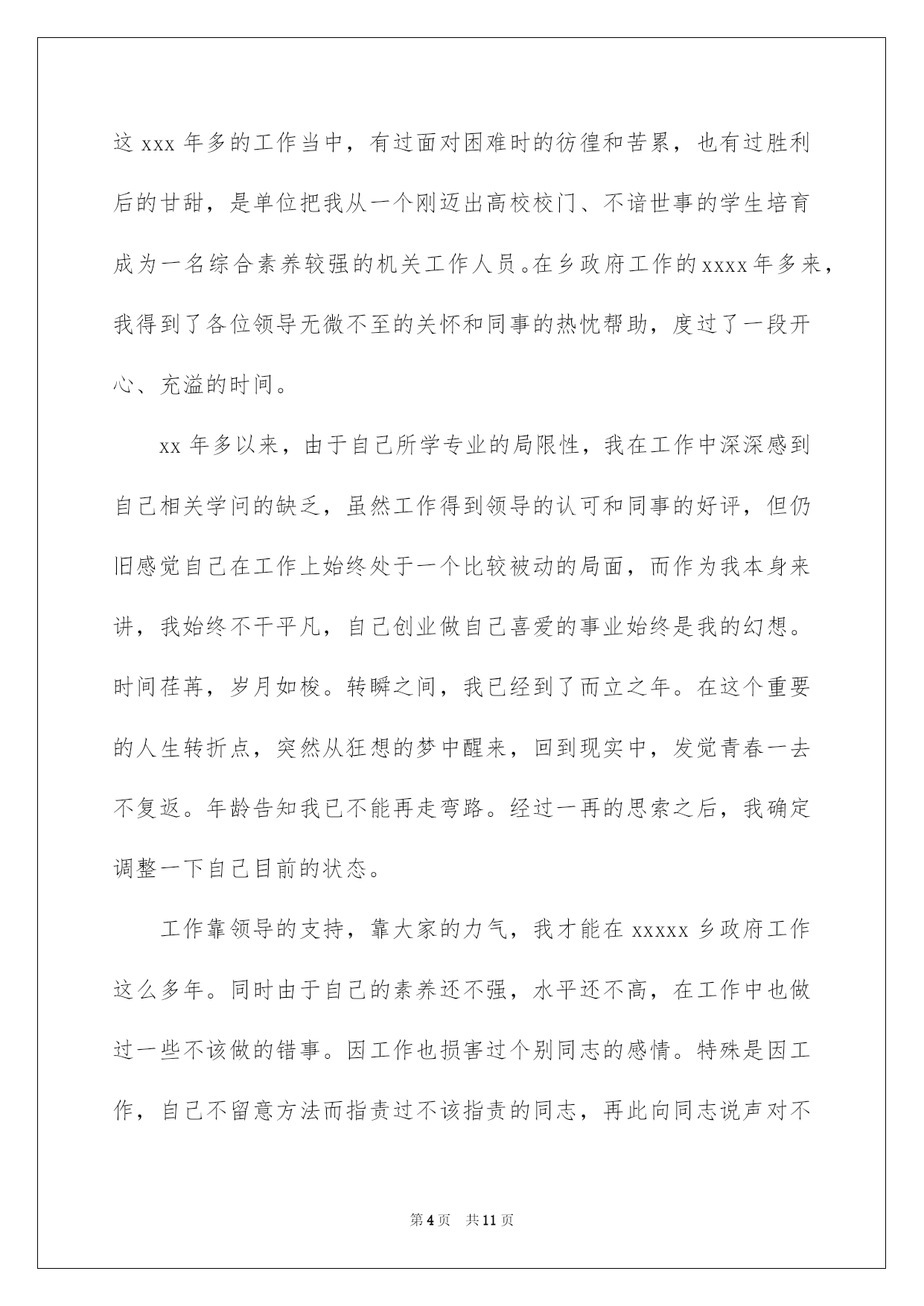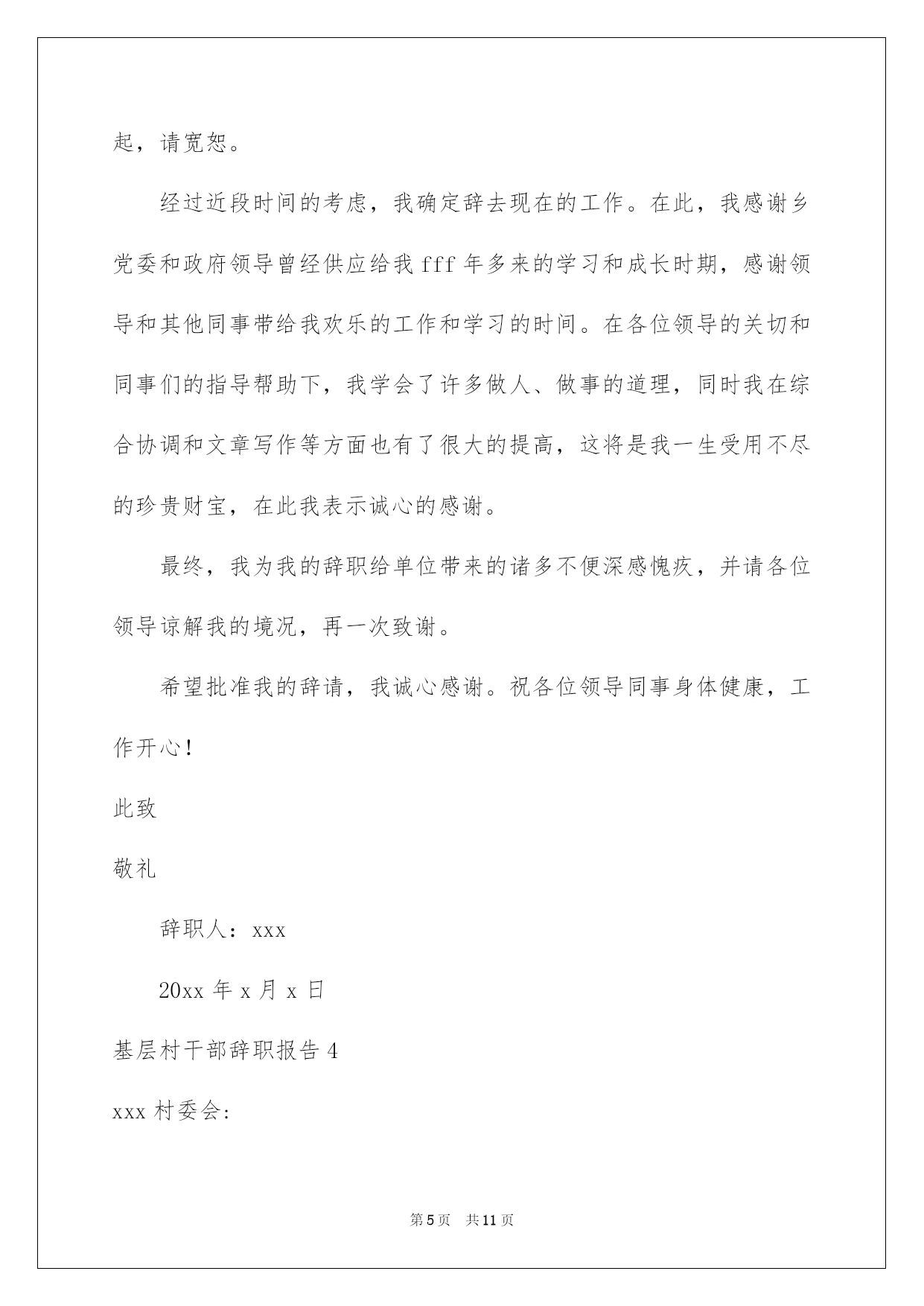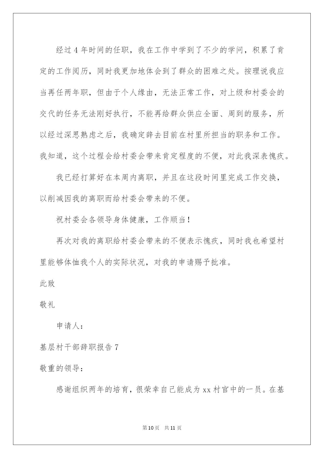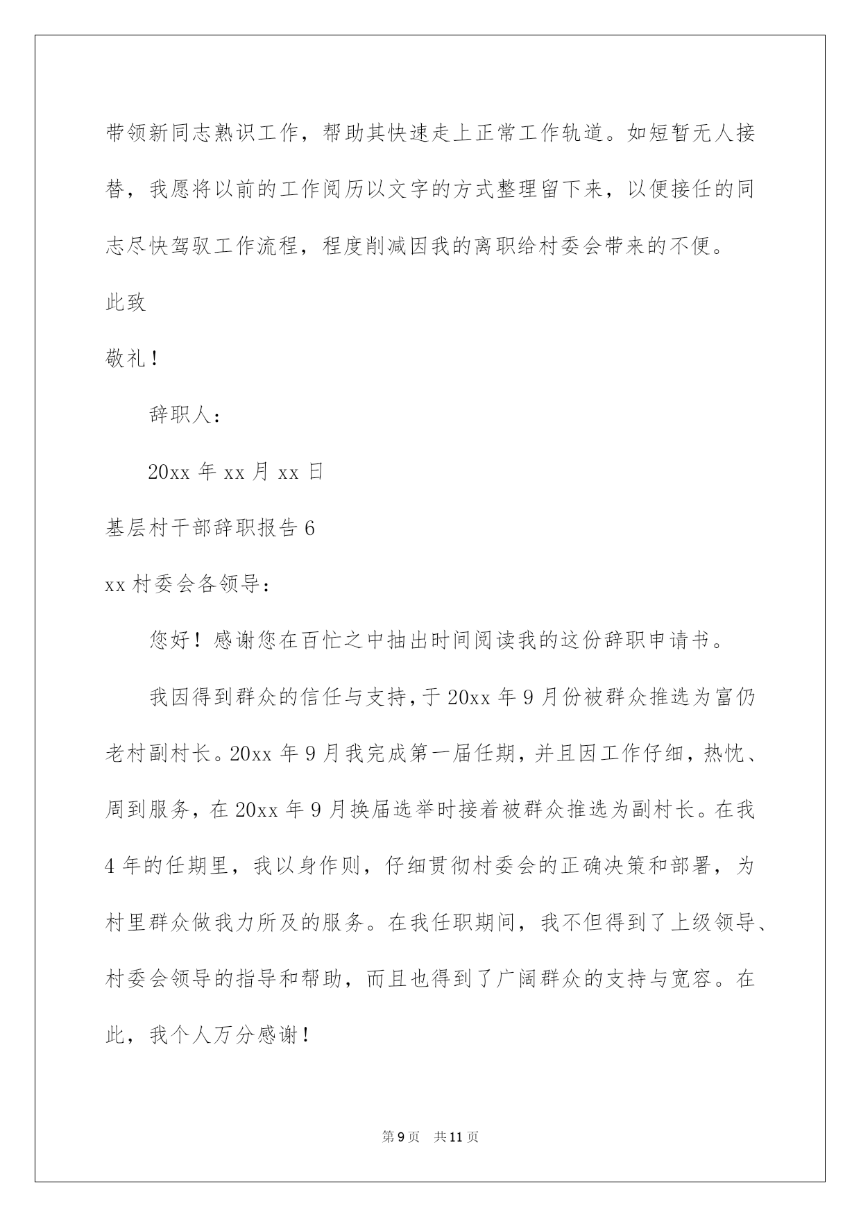 第PAGE\*Arabic\*MERGEFORMAT11页共NUMPAGES\*Arabic\*MERGEFORMAT11页第PAGE\*MERGEFORMAT11页共NUMPAGES\*MERGEFORMAT11页第PAGE\*MERGEFORMAT11页共NUMPAGES\*MERGEFORMAT11页第PAGE\*MERGEFORMAT11页共NUMPAGES\*MERGEFORMAT11页第PAGE\*MERGEFORMAT11页共NUMPAGES\*MERGEFORMAT11页第PAGE\*MERGEFORMAT11页共NUMPAGES\*MERGEFORMAT11页第PAGE\*MERGEFORMAT11页共NUMPAGES\*MERGEFORMAT11页第PAGE\*MERGEFORMAT11页共NUMPAGES\*MERGEFORMAT11页第PAGE\*MERGEFORMAT11页共NUMPAGES\*MERGEFORMAT11页第PAGE\*MERGEFORMAT11页共NUMPAGES\*MERGEFORMAT11页第PAGE\*MERGEFORMAT11页共NUMPAGES\*MERGEFORMAT11页2022基层村干部辞职报告基层村干部辞职报告在人们素养不断提高的今日,报告的运用成为日常生活的常态,我们在写报告的时候要避开篇幅过长。那么,报告究竟怎么写才合适呢?下面是我为大家整理的基层村干部辞职报告,仅供参考,欢迎大家阅读。基层村干部辞职报告1xx村委会首先,感谢党组织一年来对我的培育,也很荣幸自己能成为洪泽村官中的一员。在基层将近一年的工作中,领导给了我许多的培育和关爱,让我学到了很多,也进步了很多。但是出于个人缘由,我选择辞职。在递交这份辞呈时,我的心情非常沉重。来到基层工作也快一年了,正是在这里我起先踏上了社会,完成了自己从一个学生到社会人的转变。有过欢乐,有过收获,也有过泪水和苦痛。领导同等的人际关系和开明的工作作风,一度让我有着找到了依靠的感觉,在这里我能快乐的工作,快乐的学习。然而工作上的毫无成熟感总让自己彷徨。细细想来,这一年来,我没做过一件让自己感到有所成就的事。我为此感到深深的自责。工作上没有成果,生活上也有诸多不适应。近一年来,常常感冒生病,工作有时候感到有些力不从心。或许自己并不适应现在的工作环境,心中还是憧憬城市的生活。否定自己让自己很苦痛,然而人总是要面对现实的,自己的爱好是什么,自己喜爱什么,自己适合做什么,这一连串的问号始终让我懊丧,也让我萌发了辞职的念头,并且让我确定了这个念头。或许只有重新再跑到社会上去遭受挫折,在不断打拼中去找寻属于自己的定位,才是我人生的下一步选择。当前新农村建设正是须要人才的时候,同事都是斗志昂扬,壮志满怀,而我在这时候却因个人缘由选择离开,实在是深感歉意。离开村官这个大集体,离开这些曾经同甘共苦的同事,很舍不得,舍不得领导们的谆谆训诲,舍不得同事之间的那片真诚和友善。感谢领导在一年期间赐予我的信任和支持,并祝全部同事和挚友们在工作和活动中取得更大的成果。xxx20xx年4月26日基层村干部辞职报告2xx乡党委:我是Xx村的党支部书记,现在我慎重递交辞职报告。本人于20xx年2月份考录为村官被乡政府安排到Xx村担当书记助理。20xx年xx月,经过村党支部换届选举,本人被推选为新一届党支部书记。20xx年xx月3日,本人参与Xx市事业单位招录考试,后经过面试、体检、政审等程序,已经到Xx镇人民政府报到上班。依据组织部、所在单位要求及本人综合考虑,现要求辞去中共Xx乡Xx村党支部书记职务,望上级党委予以批准。辞职人:xxx时间:基层村干部辞职报告3敬重的领导:首先,我向各位领导提出辞职的恳求表示深深的歉意。从xx年xx月份到xxx乡政府工作以来,至今已xx年多时间,在这xxx年多的工作当中,有过面对困难时的彷徨和苦累,也有过胜利后的甘甜,是单位把我从一个刚迈出高校校门、不谙世事的学生培育成为一名综合素养较强的机关工作人员。在乡政府工作的xxxx年多来,我得到了各位领导无微不至的关怀和同事的热忱帮助,度过了一段开心、充溢的时间。xx年多以来,由于自己所学专业的局限性,我在工作中深深感到自己相关学问的缺乏,虽然工作得到领导的认可和同事的好评,但仍旧感觉自己在工作上始终处于一个比较被动的局面,而作为我本身来讲,我始终不干平凡,自己创业做自己喜爱的事业始终是我的幻想。时间荏苒,岁月如梭。转瞬之间,我已经到了而立之年。在这个重要的人生转折点,突然从狂想的梦中醒来,回到现实中,发觉青春一去不复返。年龄告知