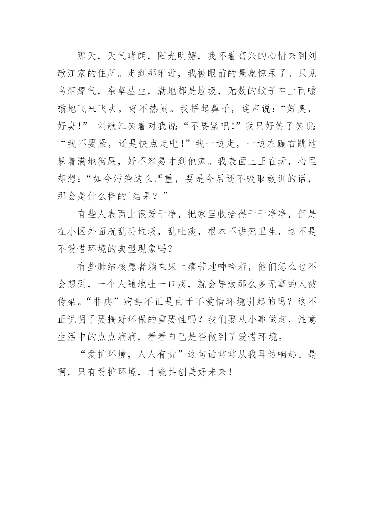 环保的作文300字环保的作文300字精华3篇在学习、工作或生活中,许多人都写过作文吧,作文是一种言语活动,具有高度的综合性和创造性。怎么写作文才能避免踩雷呢?以下是小编为大家收集的环保的作文300字4篇,欢迎阅读,希望大家能够喜欢。环保的作文300字篇1地球是我们赖以生存的家园。地球上的资源是有限的,可是随着我们人类社会的发展,地球上的资源越来越少,人类社会活动对地球环境的破坏也越来越大,比如:全球气温升高,冰川加速融化,水土流失严重,江河水质恶化,空气污染加剧……如果我们再不做好节能环保工作,地球必将严厉惩罚我们,人类社会不可能持续发展下去。其实节能环保我们每个人都可以从身边的小事做起。我们可以少开空调,开空调时可以把温度调高一点;我们可以把家里的.灯都换成节能型的并养成随手关灯的习惯;我们洗手时可以把水龙头开小一点;我们还可以出门时多乘公共汽车,少开私家车;出去旅游时我们要把自己制造的垃圾及时带走。我们不但要自己做好这些事,还要向周围的人宣传节能环保的重要性,促进大家从小事做起,从身边的事做起,善待我们赖以生存的地球,共同节约宝贵的资源,改善我们的生存环境。令人欣慰的是,全社会越来越重视节能环保工作,许多高耗能、高污染的工厂被强制关闭,取而代之的是使用新能源,新工艺的环保型工厂,尾气超标的汽车受到越来越多的限制,电视上、马路边经常能看到关于节能环保的公益广告。在我们全社会的共同努力下,我们的家园一定会越来越美丽!环保的作文300字篇2我们知道,现在生活的环境已经受到严重的破坏,许多河水也已经受到了污染。所以我们在家庭用物中,得尽量不用那些污染环境、变化空气的物品。今天,我就来想几个不让环境遭受危害的办法吧!让人类加强环保意识。如果在我们每年的节日里再加上一个环保节,到了那天,所有的电视没有另外节目,只有关于环保的新闻节目,让我们人类更加重视环保行动,也尽快采取行动。不止只有创建环保节这个办法,还可以采取社区总体开会,并还让所有的社区小学生来开一个环保活动,拿好一根长一点的木棒,来到河边打捞污染水的垃圾,还去拔除多余的杂草,让刚长出来的一批草长的更精神,更秀气。在我们现在的'生活过程中,有时我们看到街旁或其它的地方有垃圾,就要及时把它捡起来,扔到周围的垃圾筒里。但在自己的行为当中也要主义。不要随地吐痰,不随地小便等。如果要使周围的环境更好,空气更加清新,那么,就让我们一起来美化环境,让地球换上一套更加干净的时装吧!环保的作文300字篇3有一次,我到503班的刘欹江家去玩。那天,天气晴朗,阳光明媚,我怀着高兴的心情来到刘欹江家的住所。走到那附近,我被眼前的景象惊呆了。只见乌烟瘴气,杂草丛生,满地都是垃圾,无数的蚊子在上面嗡嗡地飞来飞去,好不热闹。我捂起鼻子,连声说:“好臭,好臭!”刘欹江笑着对我说:“不要紧吧!”我只好笑了笑说:“我不要紧,还是快点走吧!”我一边走,一边左蹦右跳地躲着满地狗屎,好不容易才到他家。我表面上正在玩,心里却想:“如今污染这么严重,要是今后还不吸取教训的话,那会是什么样的'结果?”有些人表面上很爱干净,把家里收拾得干干净净,但是在小区外面就乱丢垃圾,乱吐痰,根本不讲究卫生,这不是不爱惜环境的典型现象吗?有些肺结核患者躺在床上痛苦地呻吟着,他们怎么也不会想到,一个人随地吐一口痰,就会导致那么多无辜的人被传染。“非典”病毒不正是由于不爱惜环境引起的吗?这不正说明了要搞好环保的重要性吗?我们要从小事做起,注意生活中的点点滴滴,看看自己是否做到了爱惜环境。“爱护环境,人人有责”这句话常常从我耳边响起。是啊,只有爱护环境,才能共创美好未来!